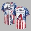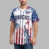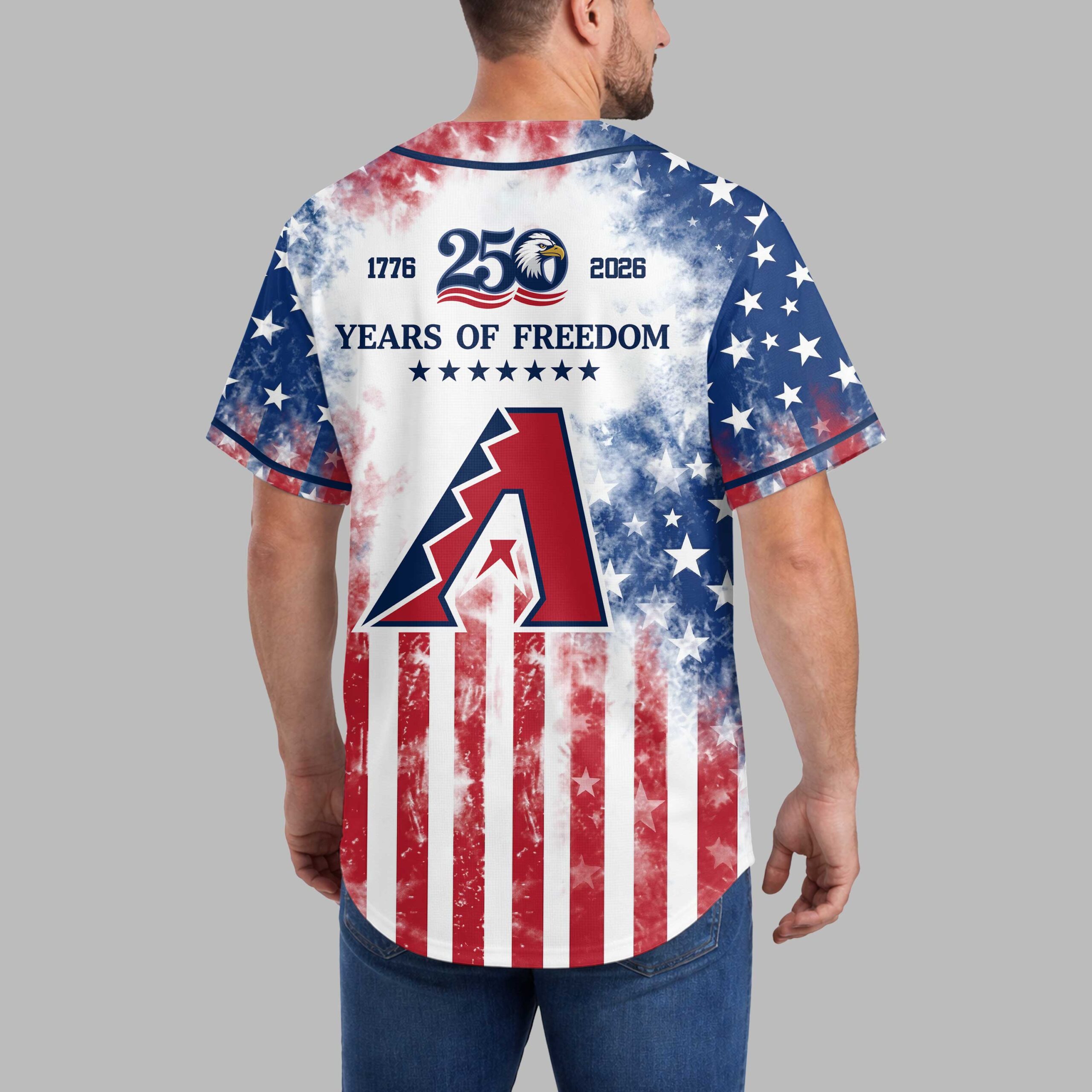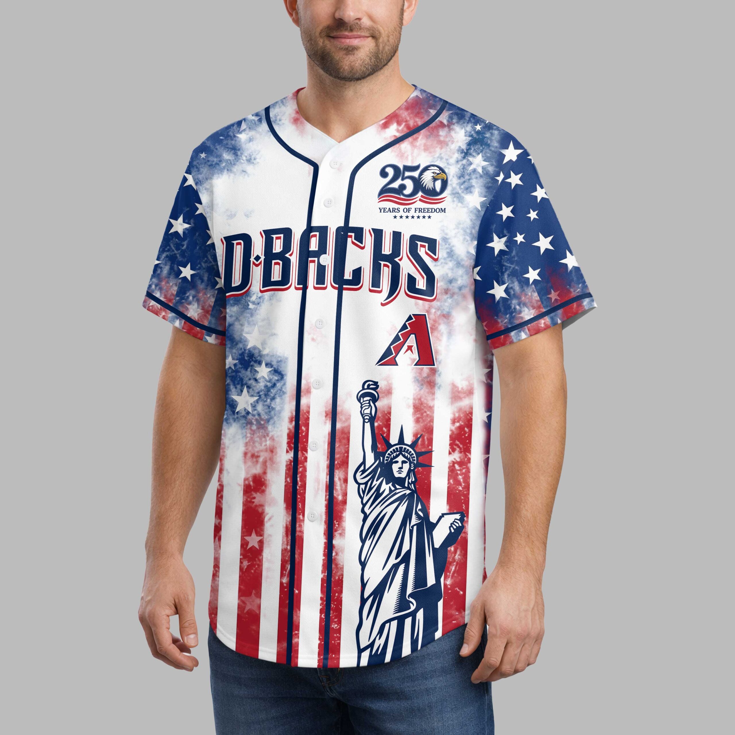 Show your Arizona Diamondbacks pride and American heritage with this patriotic baseball jersey! Celebrating 250 Years of Freedom, this design blends team spirit with a vibrant tribute to the nation. It’s the perfect statement for fans at the ballpark or any festive gathering. The front features a dynamic American flag-inspired backdrop: distressed red stripes and star-spangled blue. DBACKS text, the Diamondbacks A logo, and the Statue of Liberty are prominently displayed. A 250 Years of Freedom emblem with an eagle marks the anniversary. The back showcases 1776 250 2026 YEARS OF FREEDOM and a larger Diamondbacks A logo against a similar flag design. Ideal for cheering on your team, celebrating the Fourth of July, or simply showcasing your American spirit, this jersey is perfect for game days, parades, or any event where you proudly display your passion.