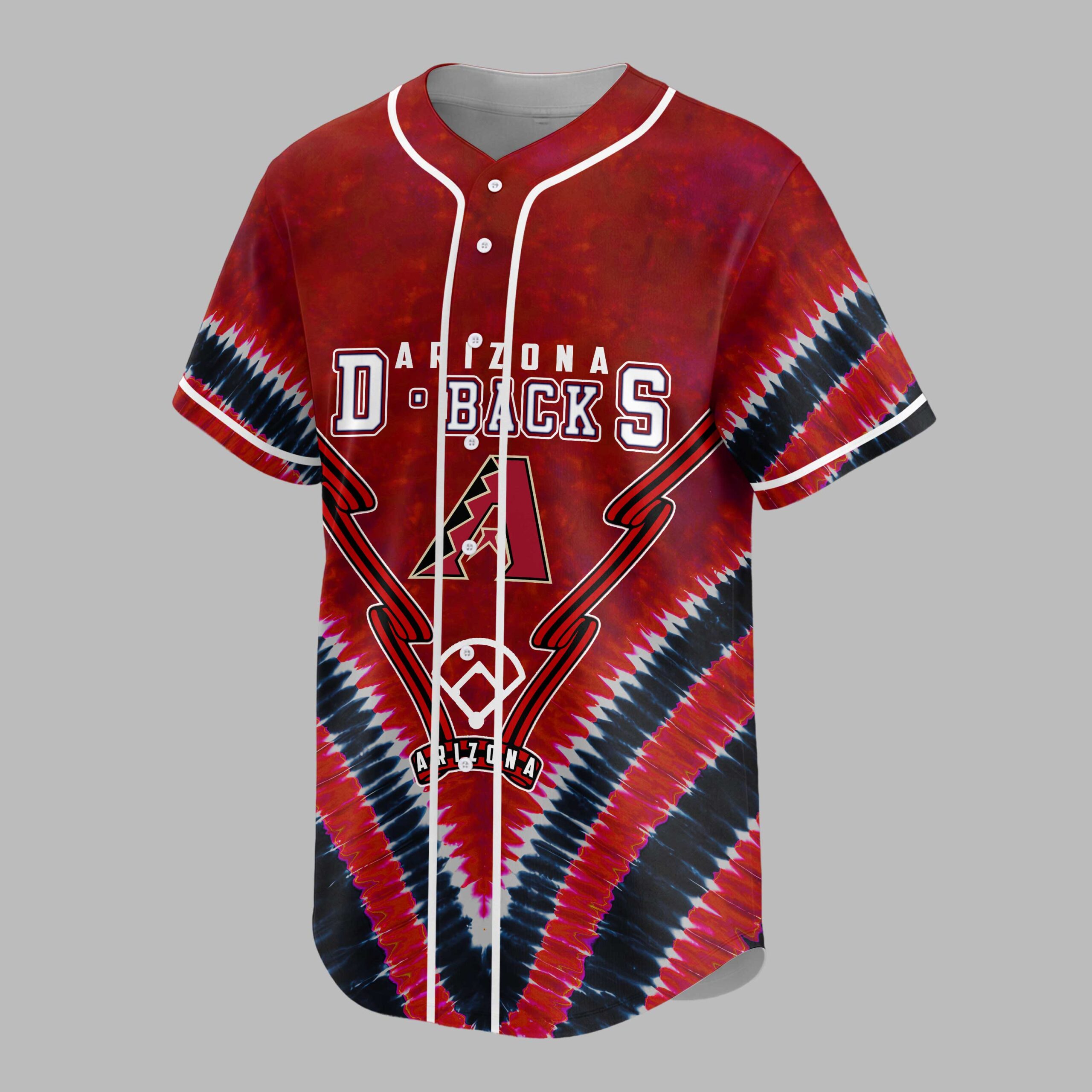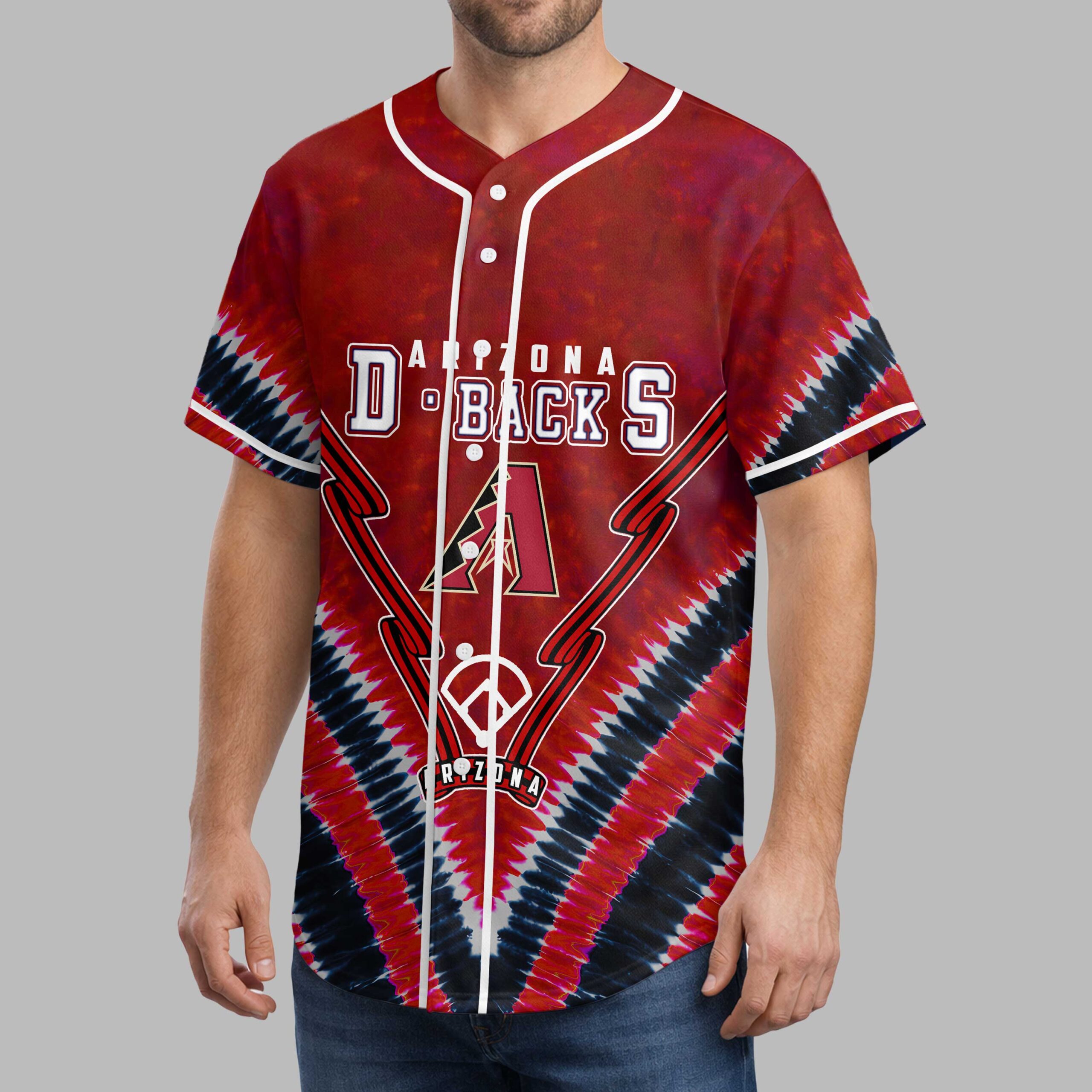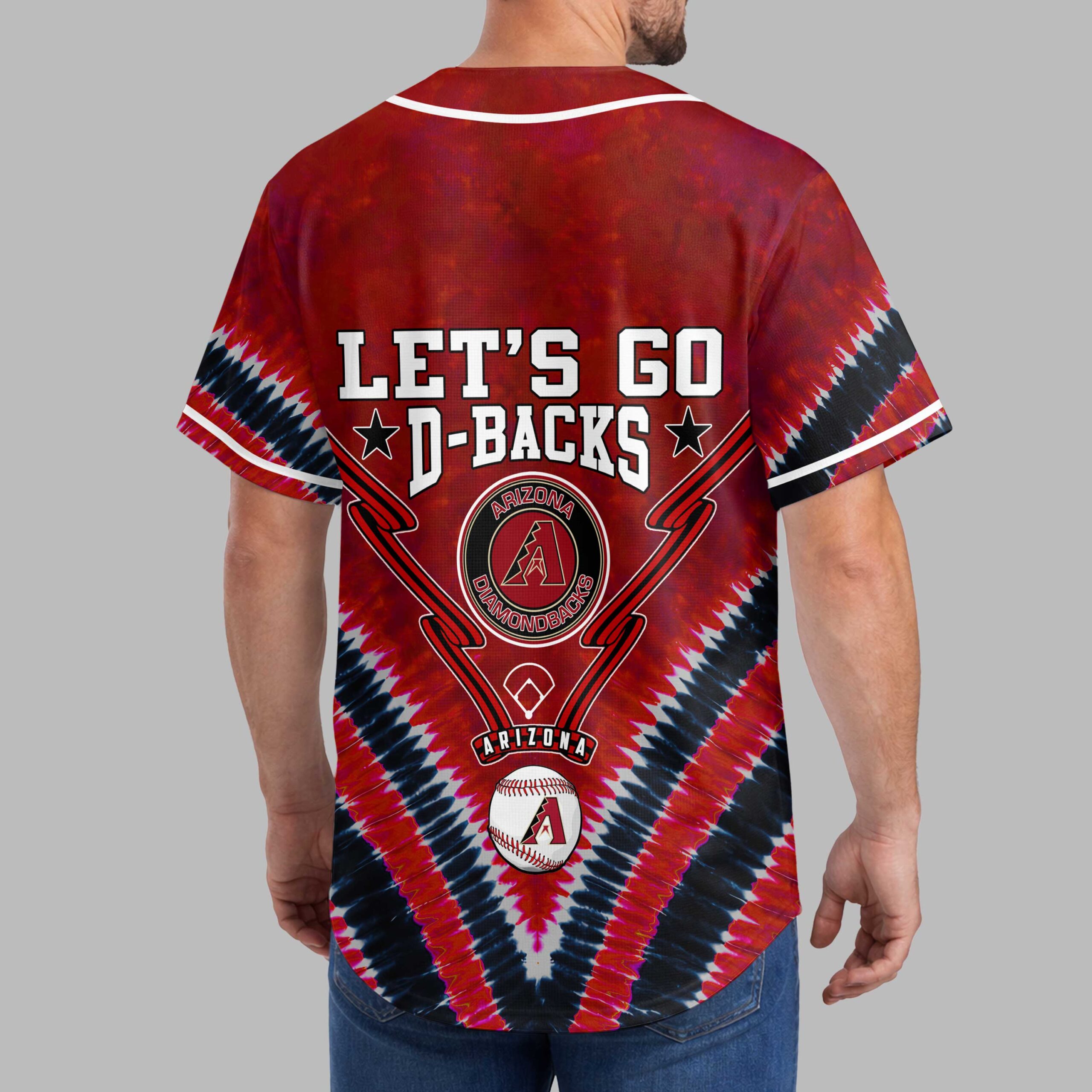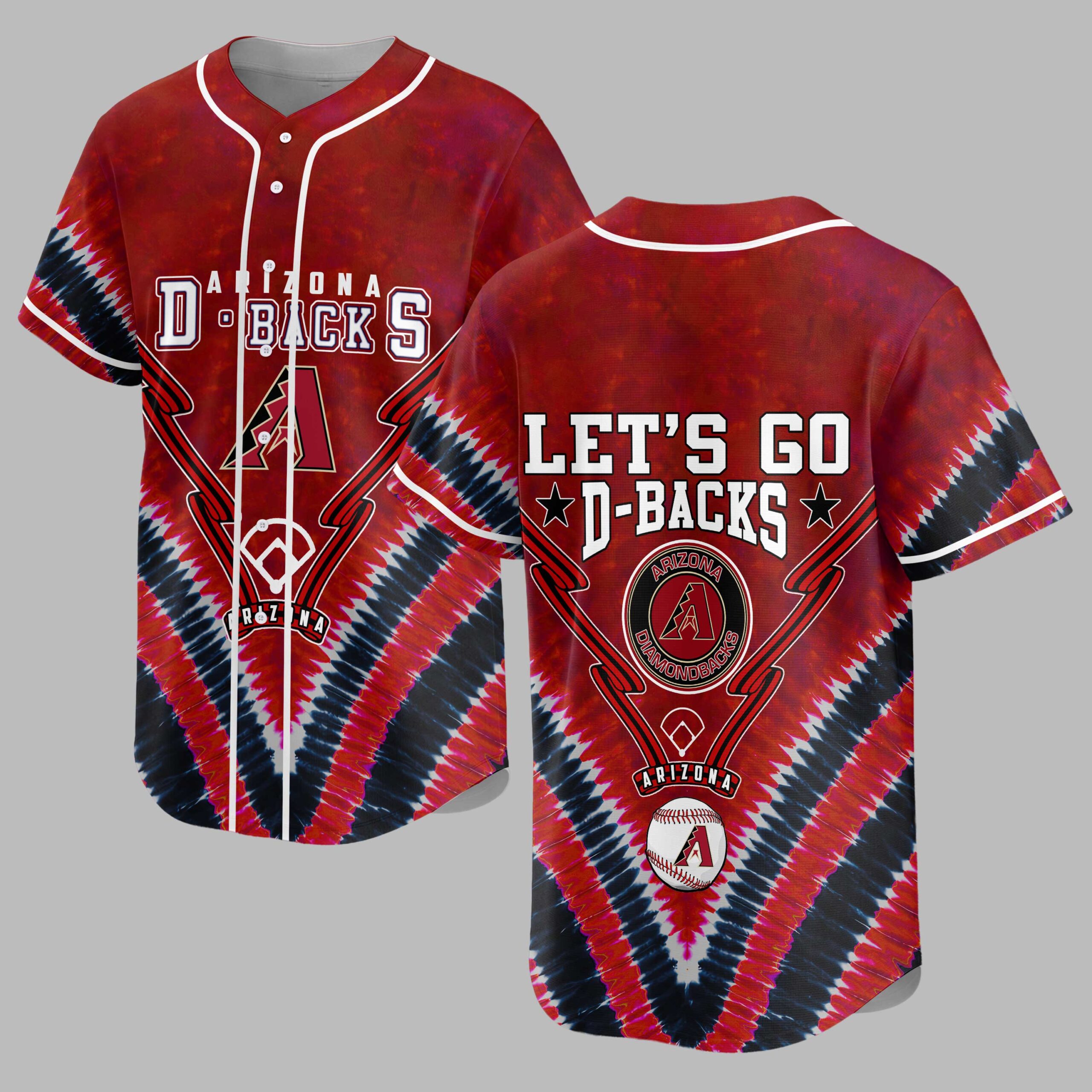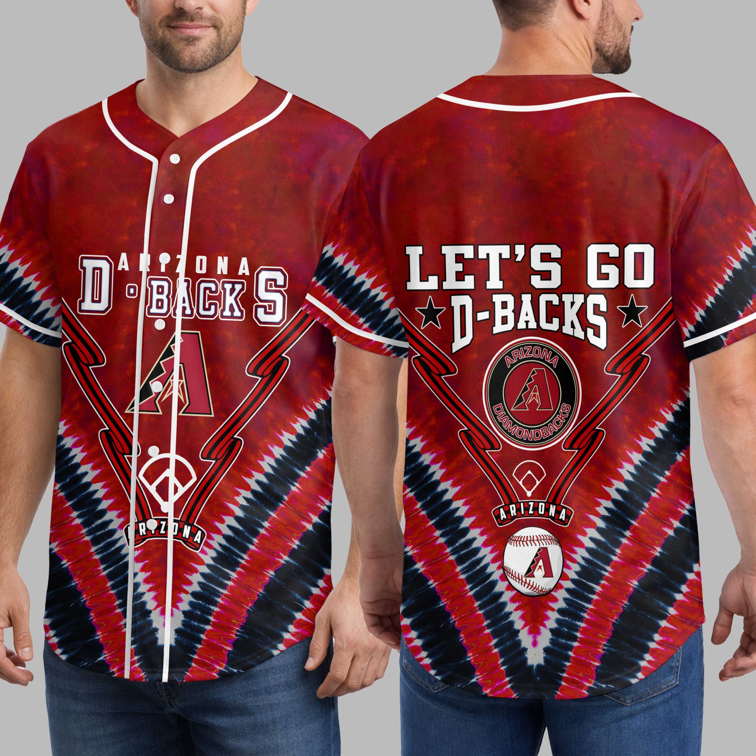 Show your fierce D-Backs pride with this vibrant tie-dye baseball jersey! This eye-catching design is the ultimate way to stand out from the crowd while passionately cheering on the Arizona Diamondbacks. The front of the jersey proudly displays ARIZONA D-BACKS alongside the team’s iconic A logo, all set against a dynamic backdrop of red, black, and white tie-dye. Turn around to reveal the rallying cry LET’S GO D-BACKS accented with stars, a classic baseball graphic featuring the A logo, and the official circular ARIZONA DIAMONDBACKS emblem. Perfect for game days at Chase Field, tailgating with friends, or simply showcasing your team spirit around town, this jersey is a must-have for any devoted Arizona fan. It’s an energetic expression of your loyalty, ready for any occasion.