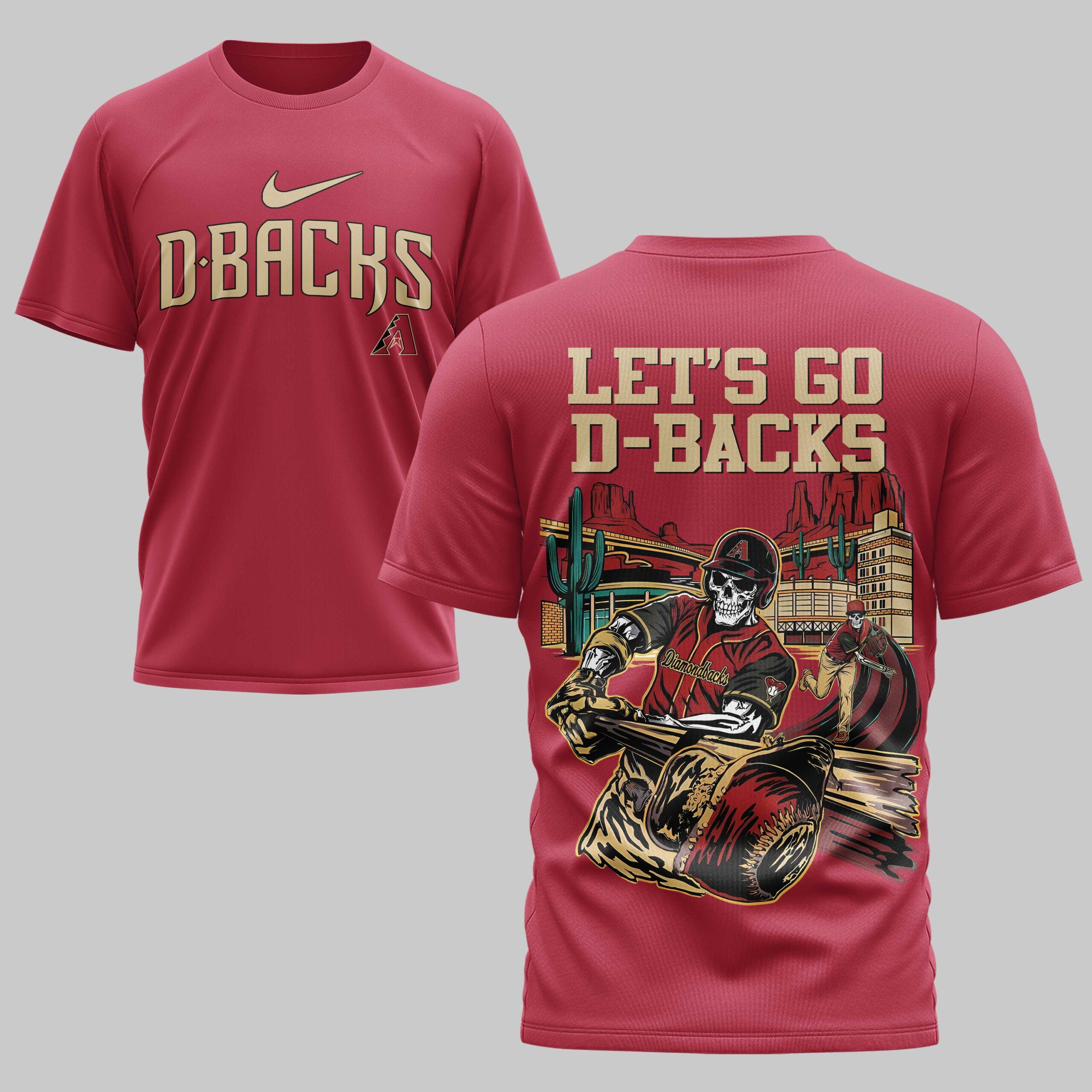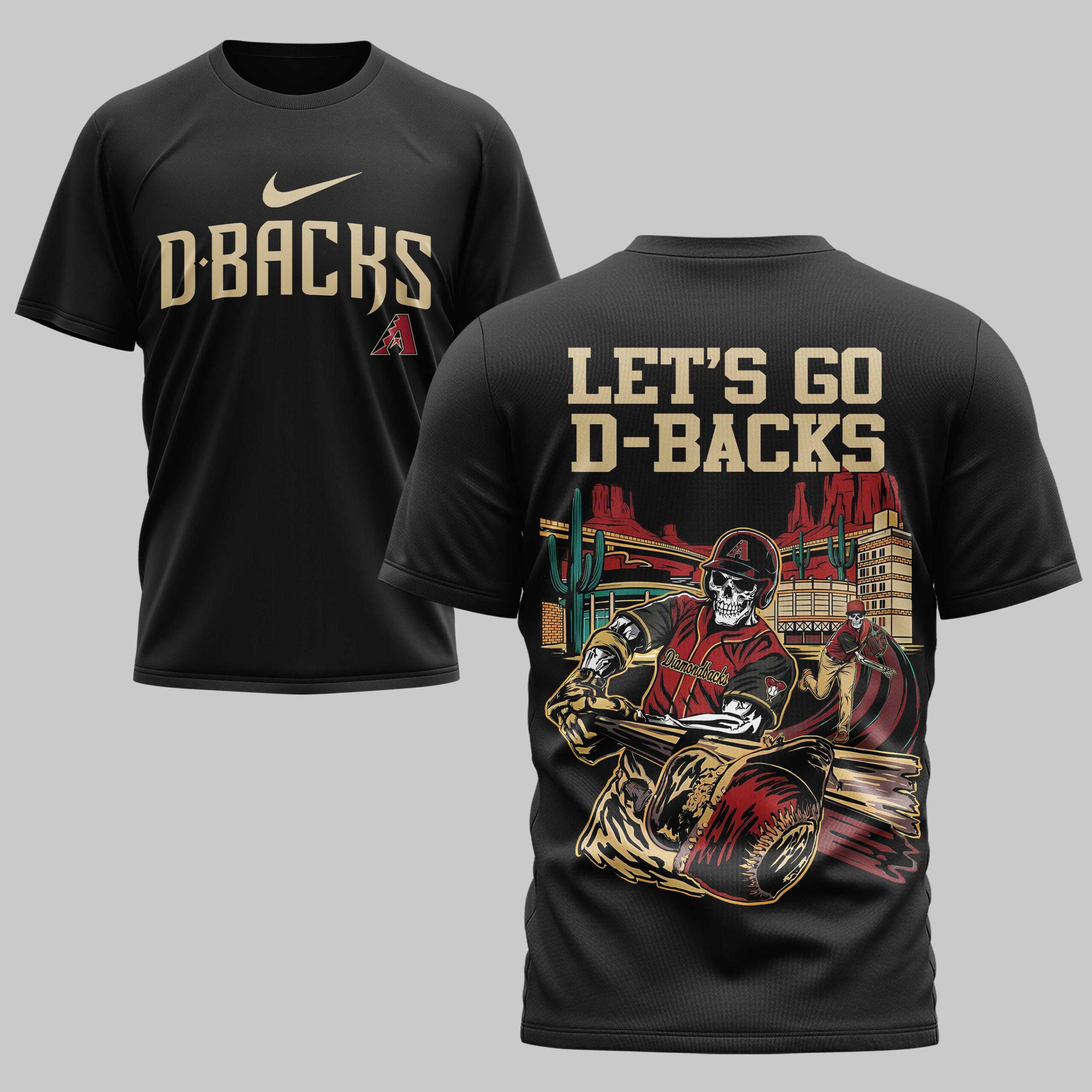 Ignite your D-Backs spirit with this captivating tee, perfect for every Arizona Diamondbacks fanatic. It’s more than just a shirt; it’s a powerful declaration of your loyalty, blending fierce team pride with a unique desert-inspired baseball aesthetic. The front proudly displays ‘D-BACKS’ in a bold, vintage-style font, complemented by the iconic team logo. Turn heads with the back’s electrifying artwork: ‘LET’S GO D-BACKS’ towers over a dramatic scene. A skeleton batter, clad in team colors, delivers a powerful swing against a backdrop of a bustling stadium, towering saguaros, and majestic desert mountains. Another skeleton pitcher completes this spirited gameday tableau. This shirt is engineered for the ultimate fan experience. Wear it loud and proud at Chase Field, during lively watch parties with friends, or simply as a statement piece in your everyday wardrobe. It’s the perfect way to showcase your unwavering support for the Diamondbacks, making every day feel like game day.
