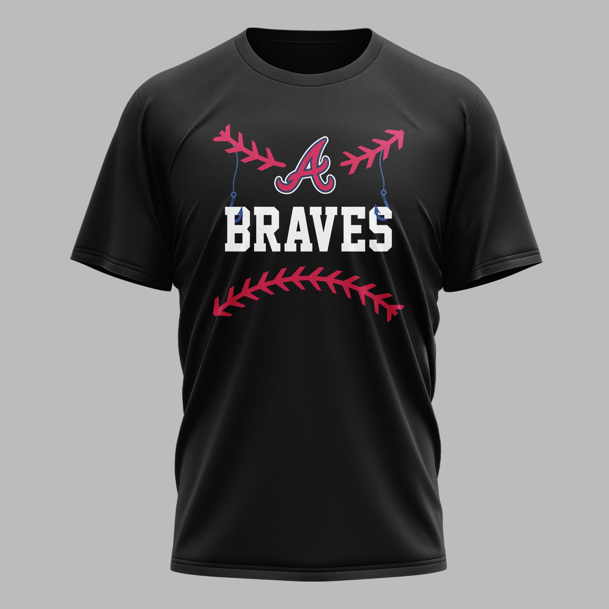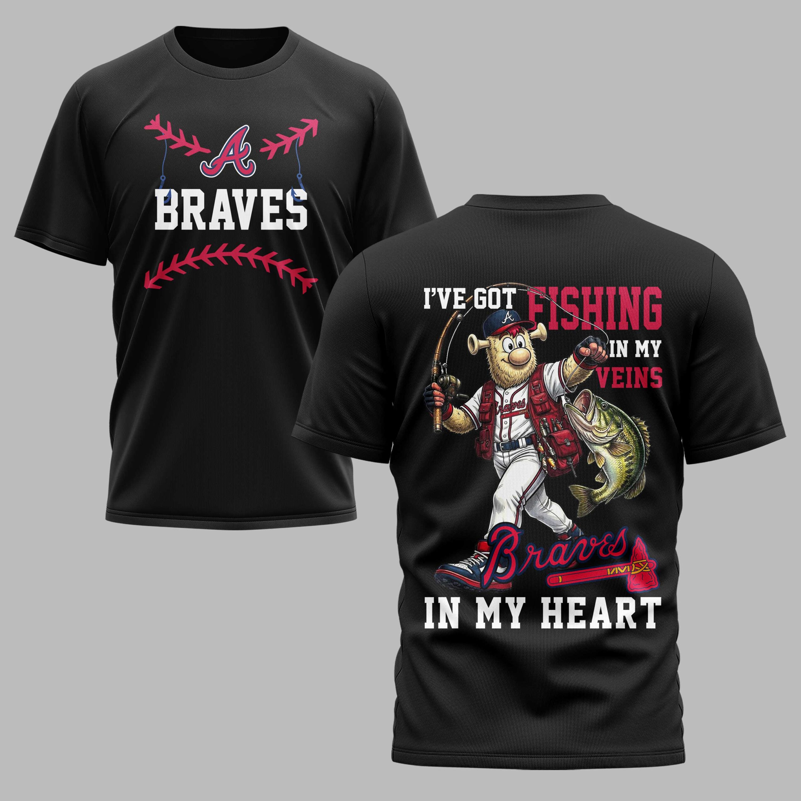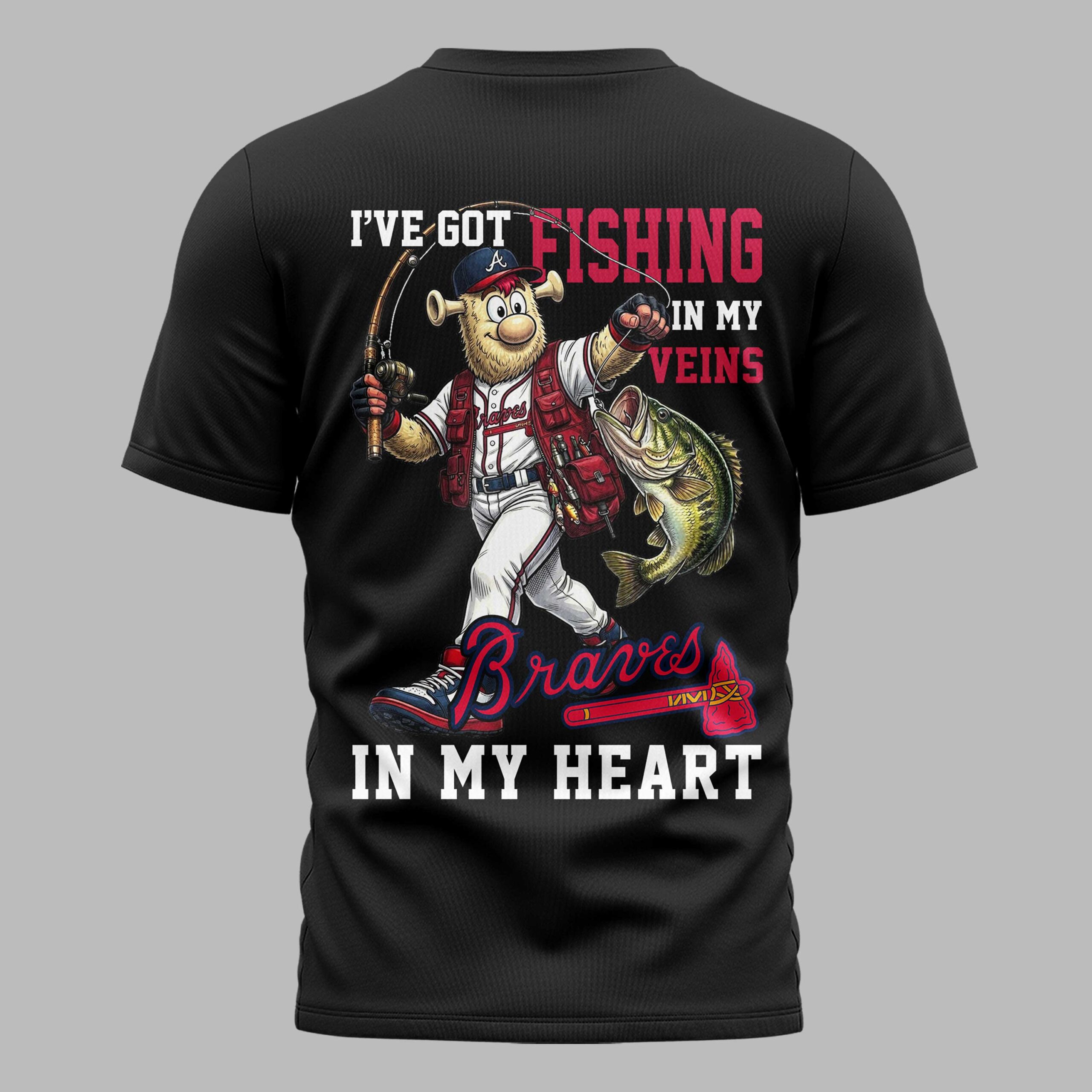 Unite your passions with this unique Atlanta Braves T-shirt, perfectly blending the thrill of baseball with the joy of fishing. Designed for every true enthusiast, it captures the excitement of game day and the peace of the open water in one spirited design. The front proudly features the iconic red and blue Braves A logo, accented with classic baseball stitching, making your team allegiance clear. The back showcases a lively Braves fan character, geared up in a team hat and uniform, ready with a fishing rod and a fresh bass. Bold text declares, I’VE GOT FISHING IN MY VEINS and Braves IN MY HEART, perfectly expressing your devotion. Whether cheering at the ballpark, casting a line on the lake, or simply enjoying a casual day, this shirt lets you showcase your Braves pride and angling adventures wherever you go. It’s a fantastic way to honor both your team and cherished hobby.