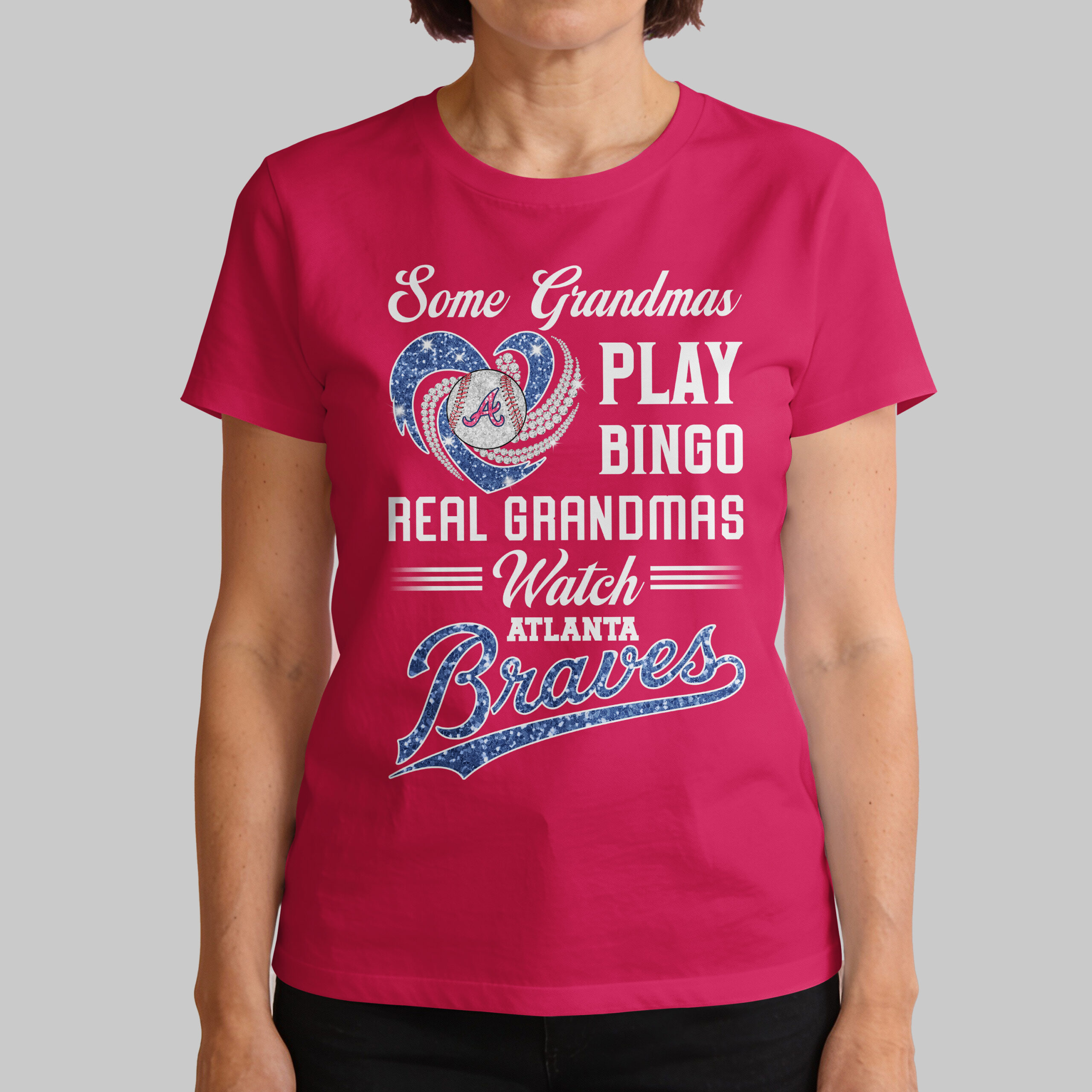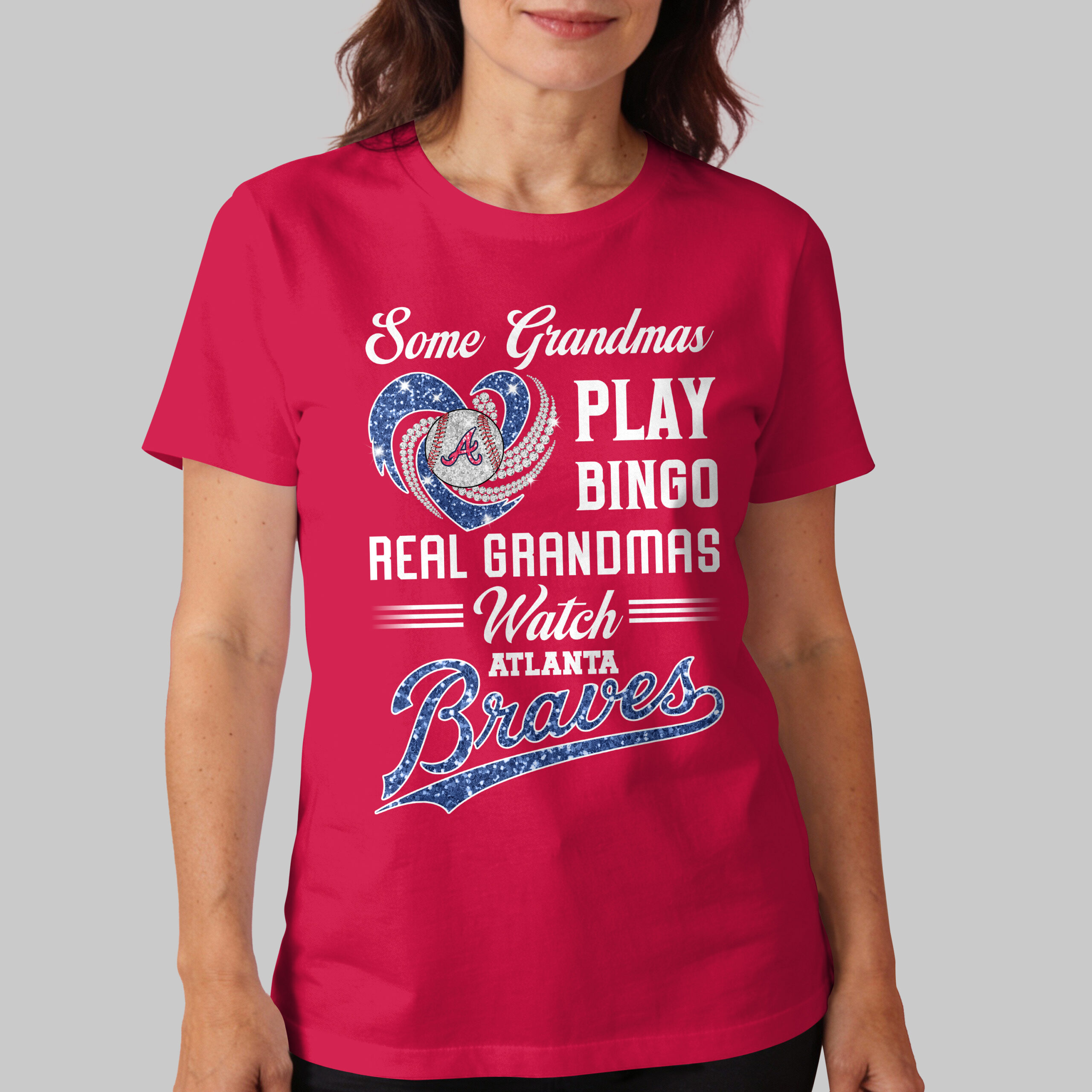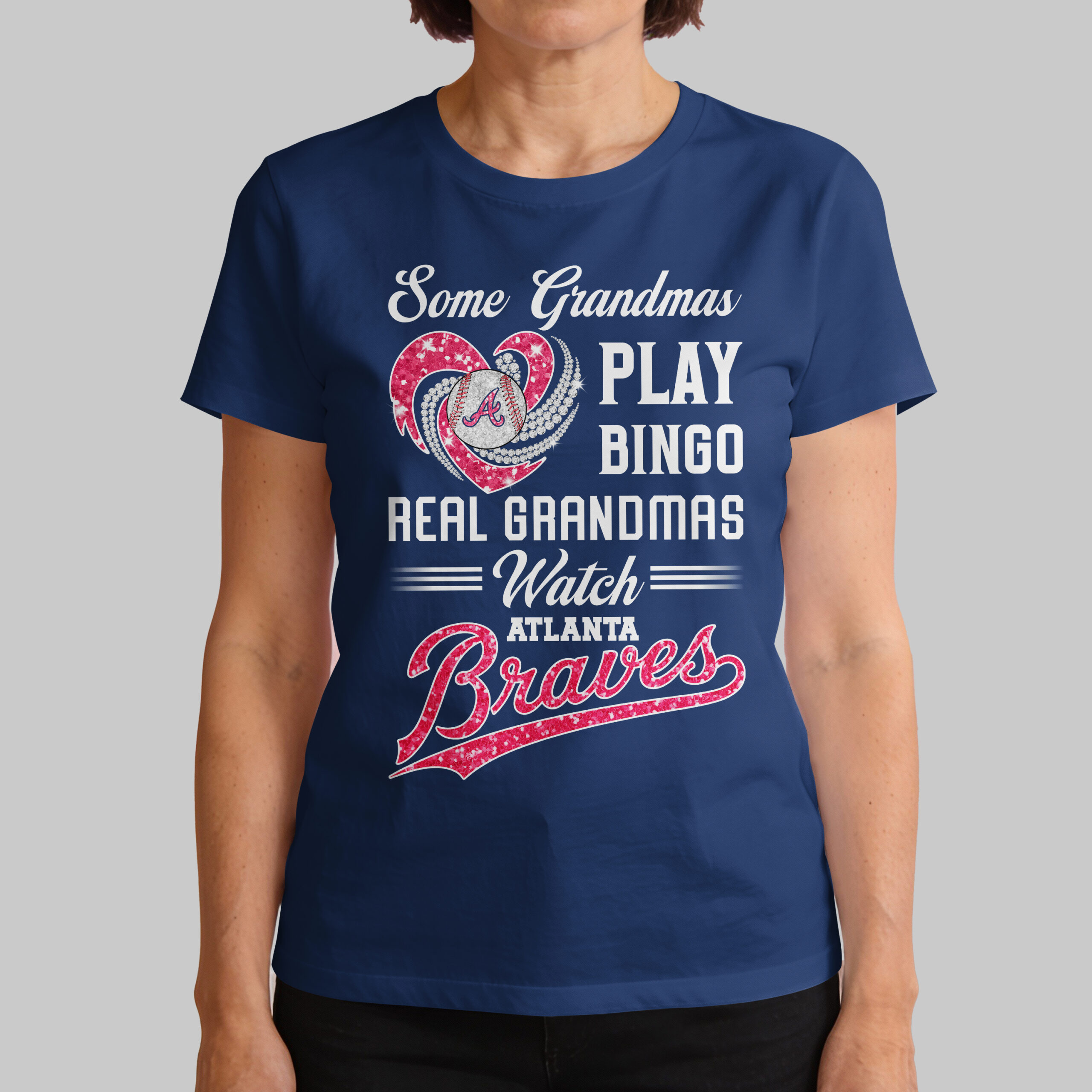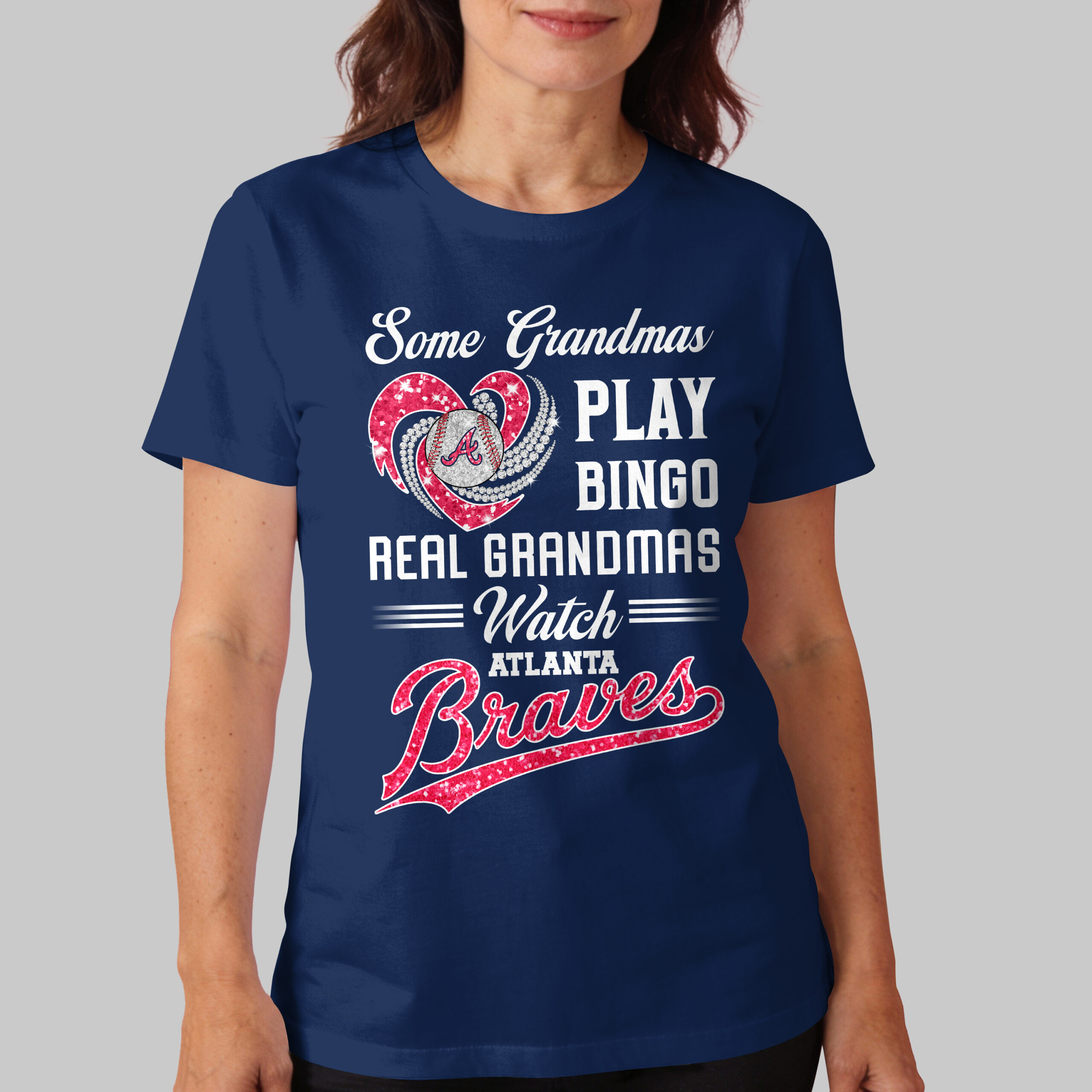 Celebrate your ultimate Atlanta Braves devotion with this spirited tee, perfect for baseball-loving grandmas! This fun shirt boldly declares your true passion: your eyes are on the field, not bingo. Show off your unwavering team pride with a smile. The front design features a glittering blue heart embracing a baseball with the iconic Atlanta Braves A logo, enhanced by sparkling white accents. Bold white lettering reads, Some Grandmas PLAY BINGO REAL GRANDMAS = Watch = ATLANTA Braves, with Braves shining in matching blue glitter. This eye-catching graphic truly pops! Perfect for cheering from the stands, hosting watch parties, or casual wear, this tee is your ideal game-day companion. Showcase your Braves support at family gatherings or any occasion. Wear it proudly and let your team spirit shine!