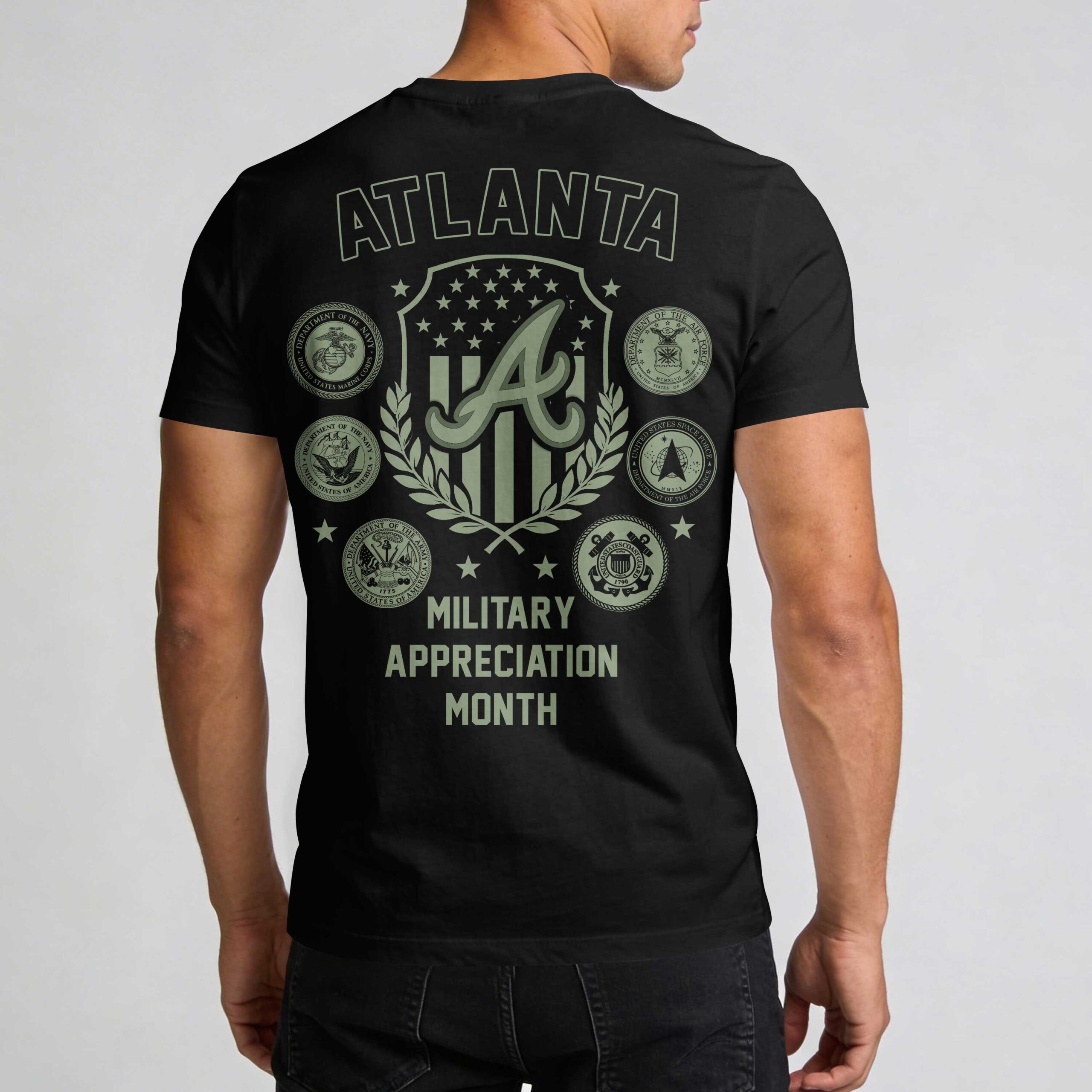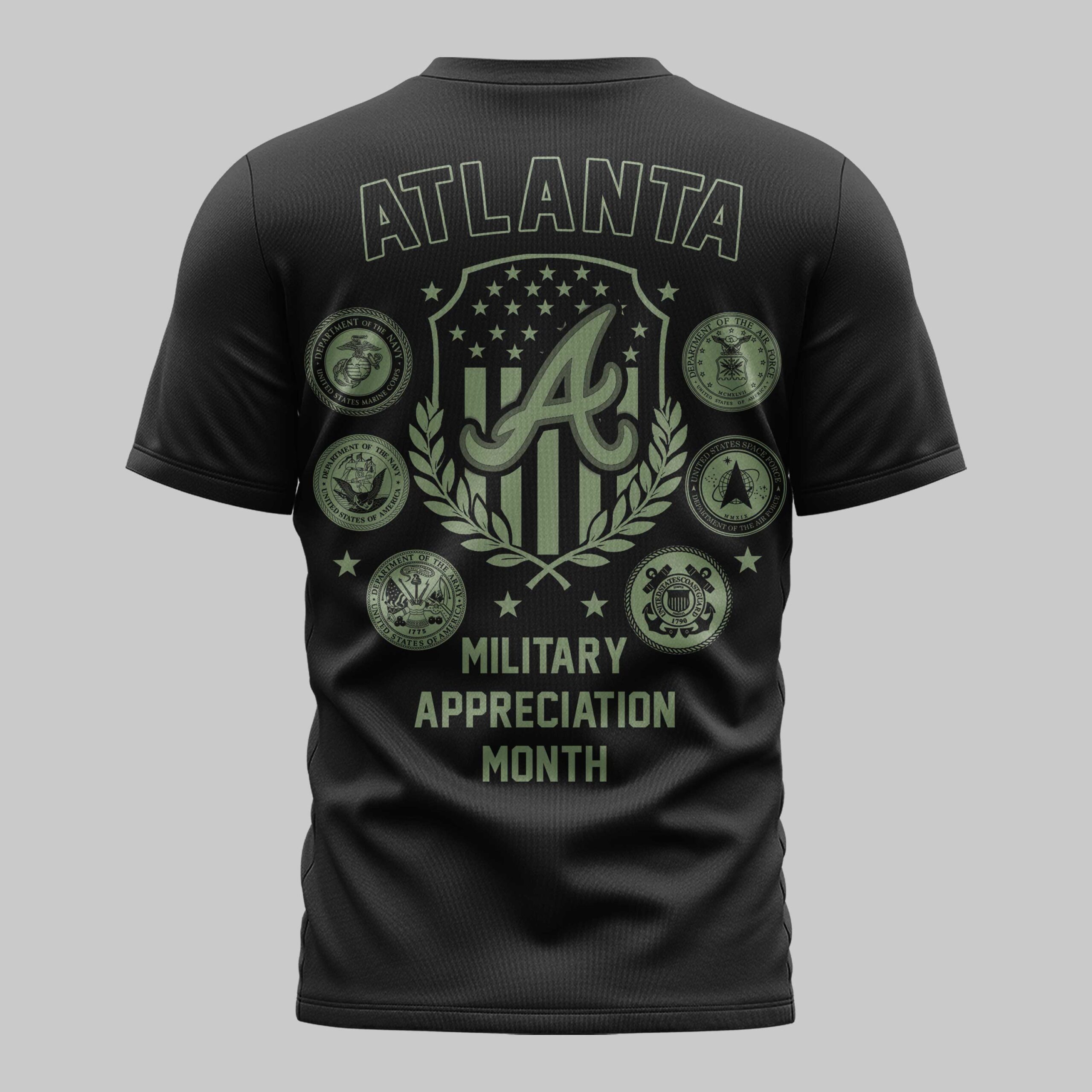 Show your unwavering loyalty to the Atlanta Braves with this striking military-inspired fan t-shirt. This design is perfect for those who want to combine their love for the game with a deep respect for our nation’s heroes, standing as a powerful patriotic tribute as we celebrate the enduring American spirit. The front features the iconic Braves script and the classic A logo in a tactical olive green. The back showcases a bold ATLANTA graphic above a patriotic shield, surrounded by the official seals of the U.S. military branches. With Military Appreciation Month prominently displayed, it’s a detailed design that honors our country’s protectors through a unique team lens. Whether you’re heading to the ballpark, attending an Independence Day celebration, or representing your city, this shirt is built for the dedicated fan. Wear it with pride on game days to show everyone exactly where your loyalty lies.