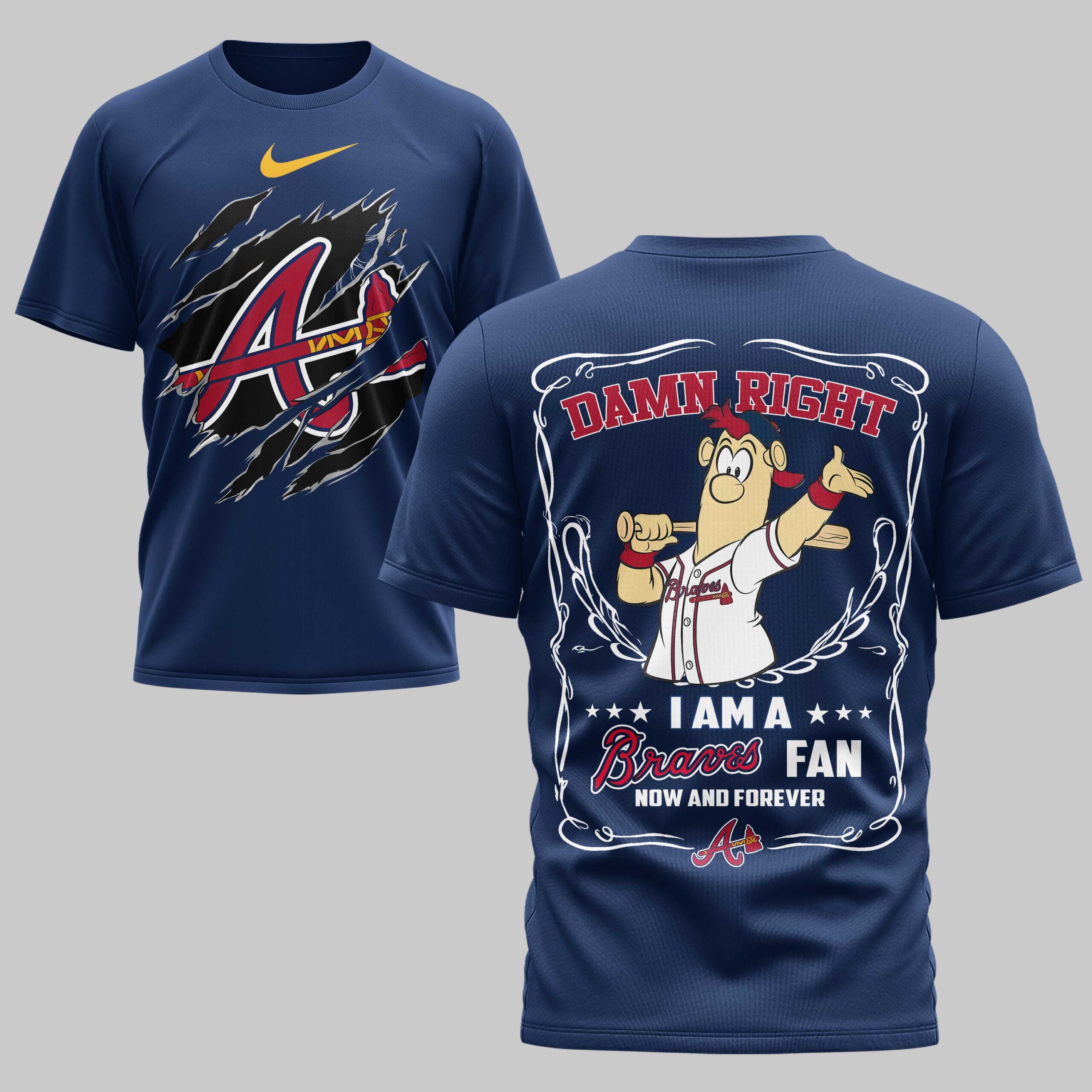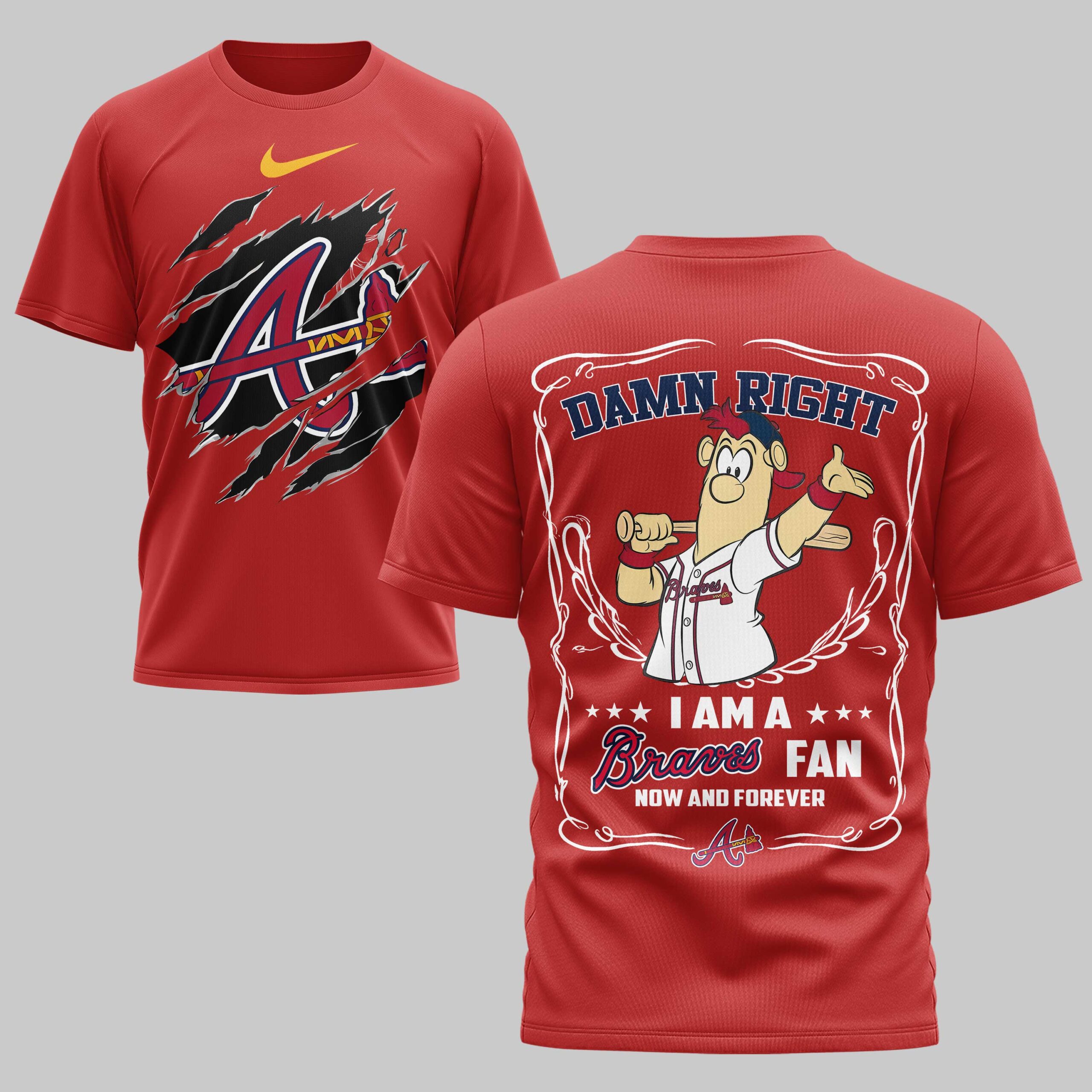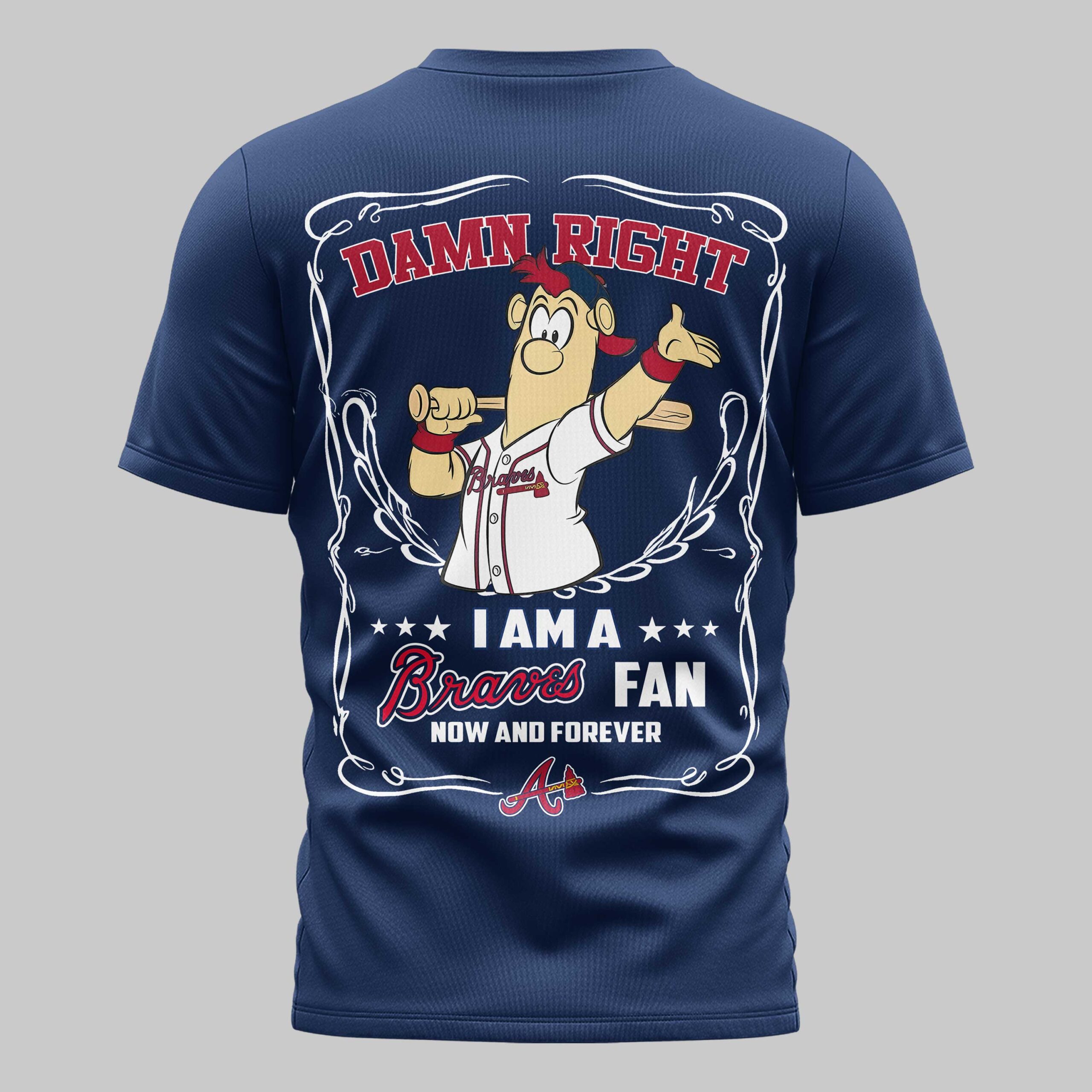 Show unwavering loyalty to the Atlanta Braves with this spirited baseball tee! Perfect for the dedicated fan, it’s the ultimate way to declare your team allegiance and passion, ideal for game day or an outing. The front features a torn-effect design, revealing the iconic Braves A logo with a bat. The back boldly states DAMN RIGHT above a lively cartoon fan in a Braves uniform. I AM A Braves FAN NOW AND FOREVER solidifies your devotion, framed by scrollwork. Wear it proudly from the stadium, to a watch party, or daily. This tee amplifies fandom, celebrating victories, baseball season, or as a gift for any proud Braves supporter.