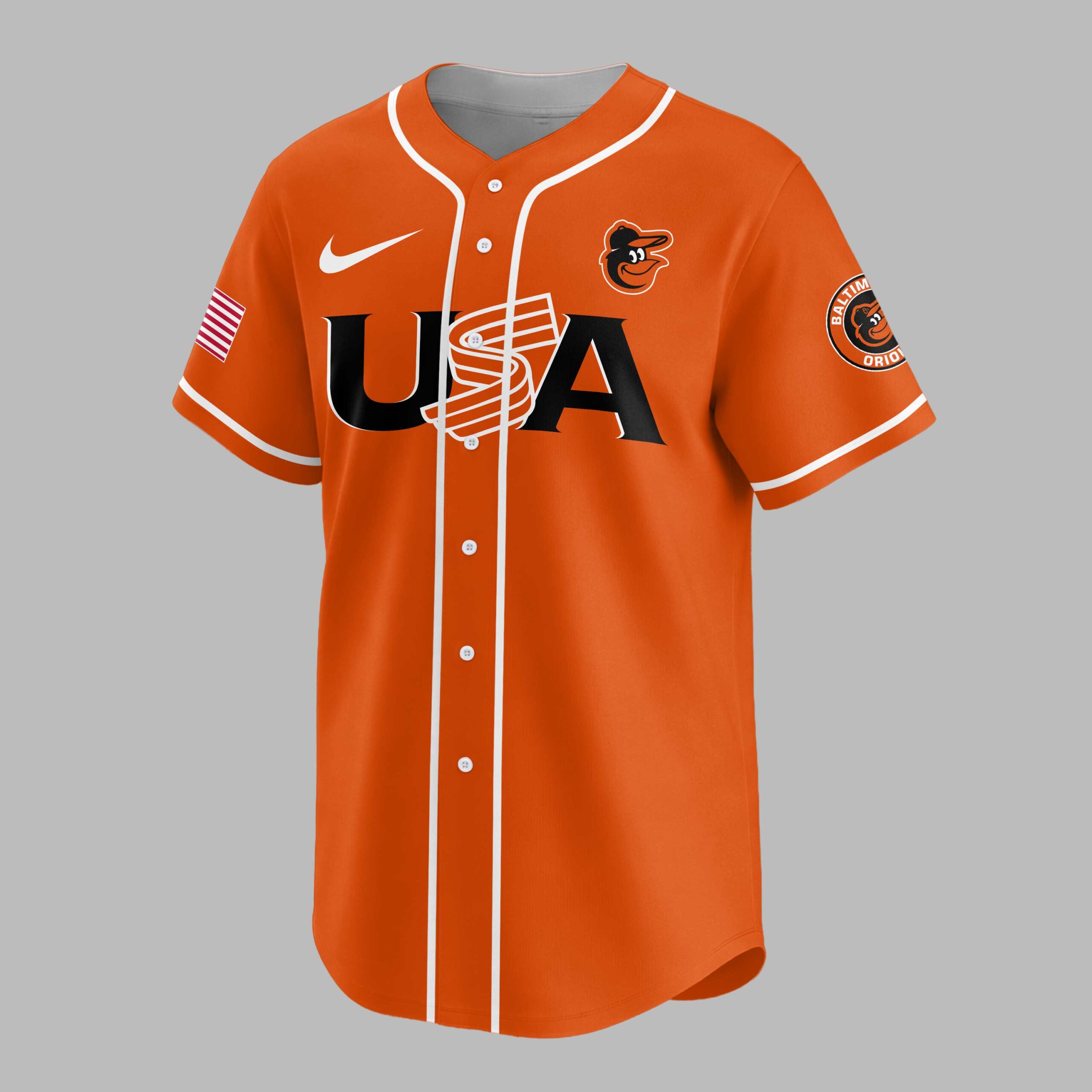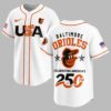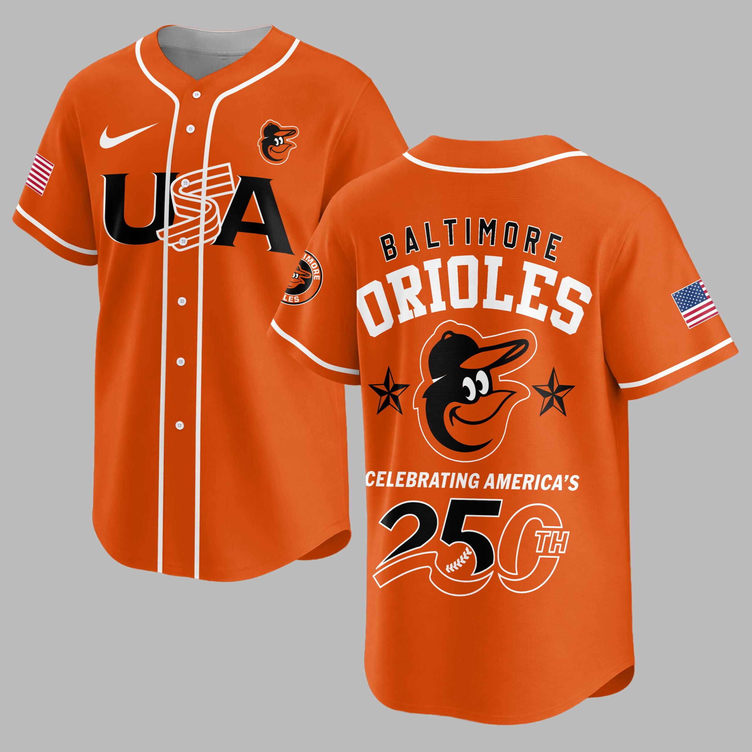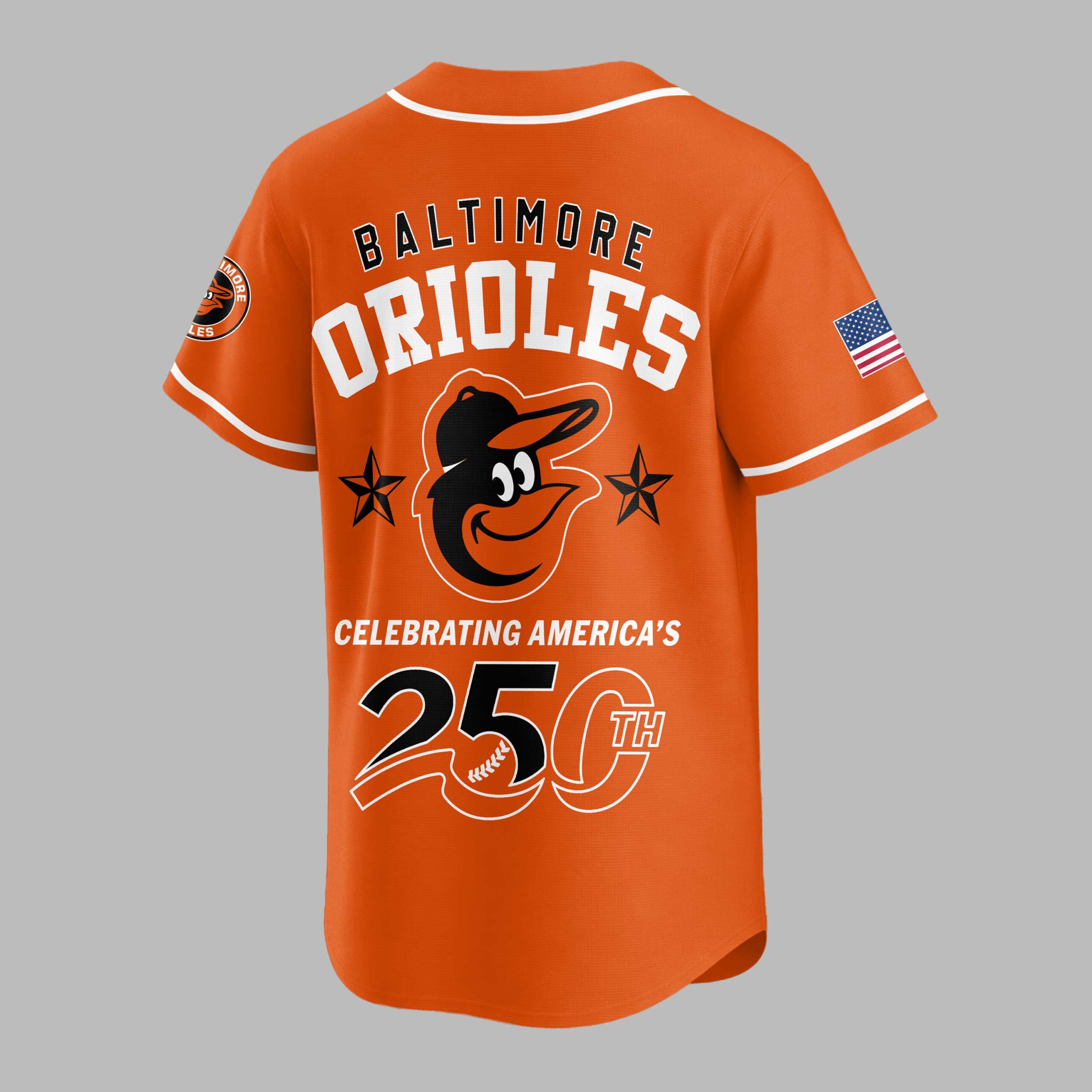Showcase your unwavering team spirit and American pride with this special Baltimore Orioles 250th Anniversary jersey! This vibrant piece beautifully blends your love for the Orioles with a powerful patriotic statement, commemorating a significant milestone in American history. It’s the perfect way to celebrate your favorite team and your country all at once. The front proudly displays USA in bold white letters, with classic American flag stripes cleverly integrated into the design. An American flag patch adorns one sleeve, while the iconic Baltimore Orioles bird head logo graces the other. The back is a true standout, featuring BALTIMORE ORIOLES prominently, complemented by the large bird logo flanked by two stars. Below, CELEBRATING AMERICA’S 250TH is emblazoned, with the 250TH creatively designed to include a baseball graphic. Whether you’re catching a game at the ballpark, hosting a Fourth of July barbecue, or simply want to display your allegiance daily, this jersey is designed for memorable occasions. It’s ideal for patriotic holidays, fan gatherings, or any day you want to proudly represent your team and nation in style.