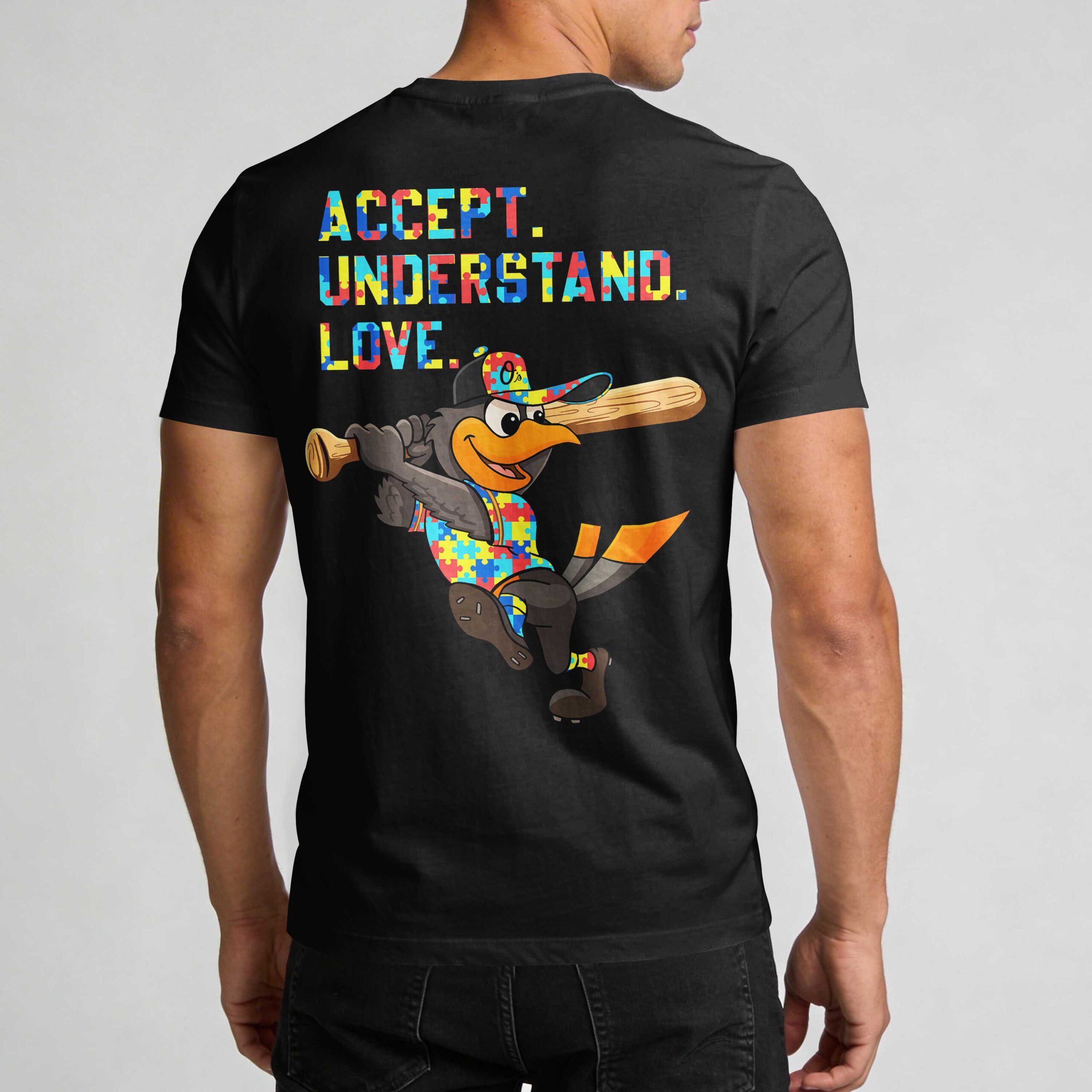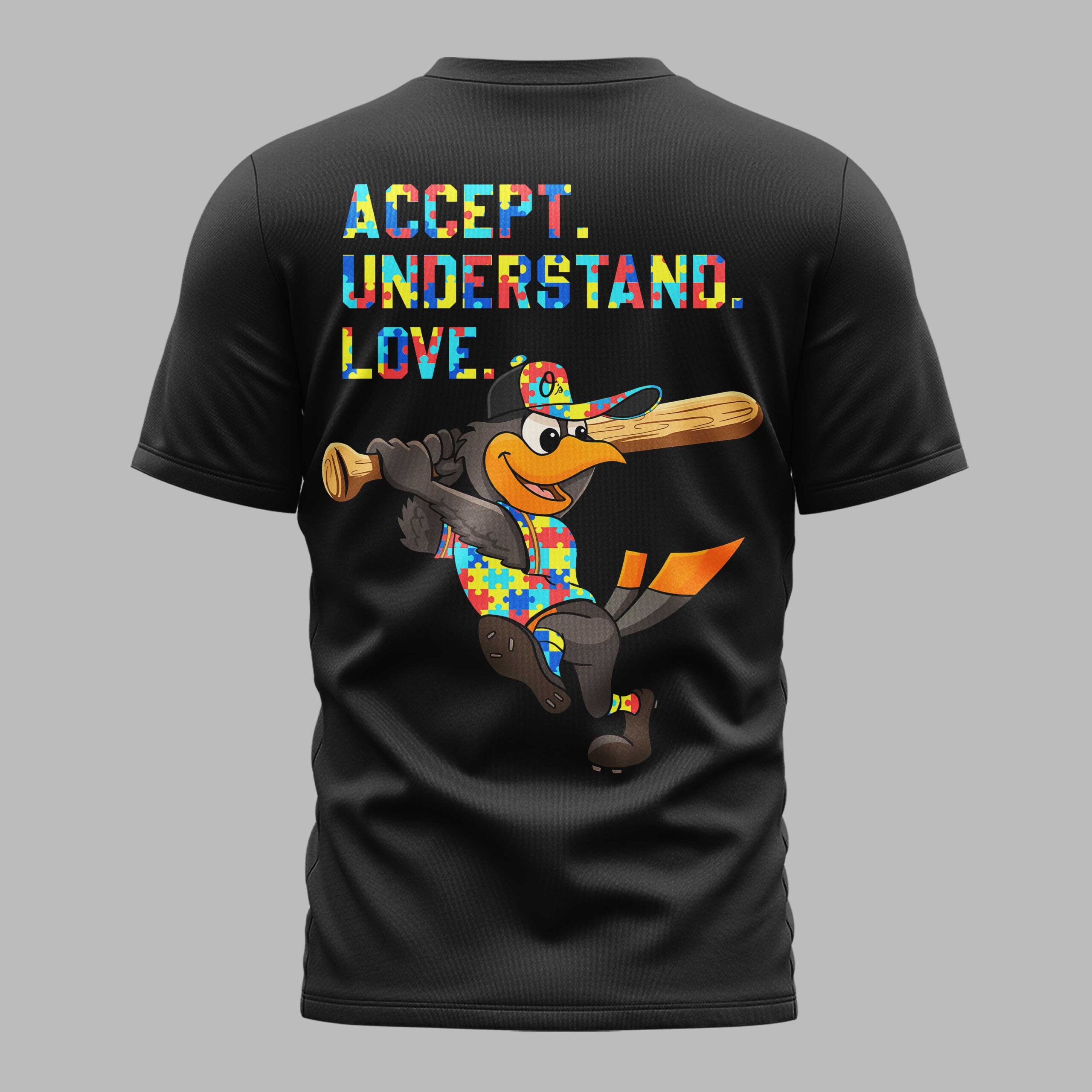 Show your unwavering support for the Baltimore Orioles and advocate for a vital cause with this unique fan tee. This shirt beautifully blends team spirit with a powerful message of autism awareness, making it a meaningful addition to any fan’s wardrobe. The front proudly displays BALTIMORE ORIOLES in a vibrant, colorful puzzle piece pattern, complemented by the iconic O’s bird logo and a rainbow infinity symbol, all embracing the autism awareness theme. Turn around, and the back features a dynamic Orioles bird mascot, also adorned with the puzzle piece design, beneath the impactful words ACCEPT. UNDERSTAND. LOVE. in matching puzzle-piece typography. Perfect for game days at Camden Yards, community autism awareness events, or simply everyday wear to express your dual passions. It’s an ideal way to cheer on your favorite team while promoting acceptance and understanding within your community.