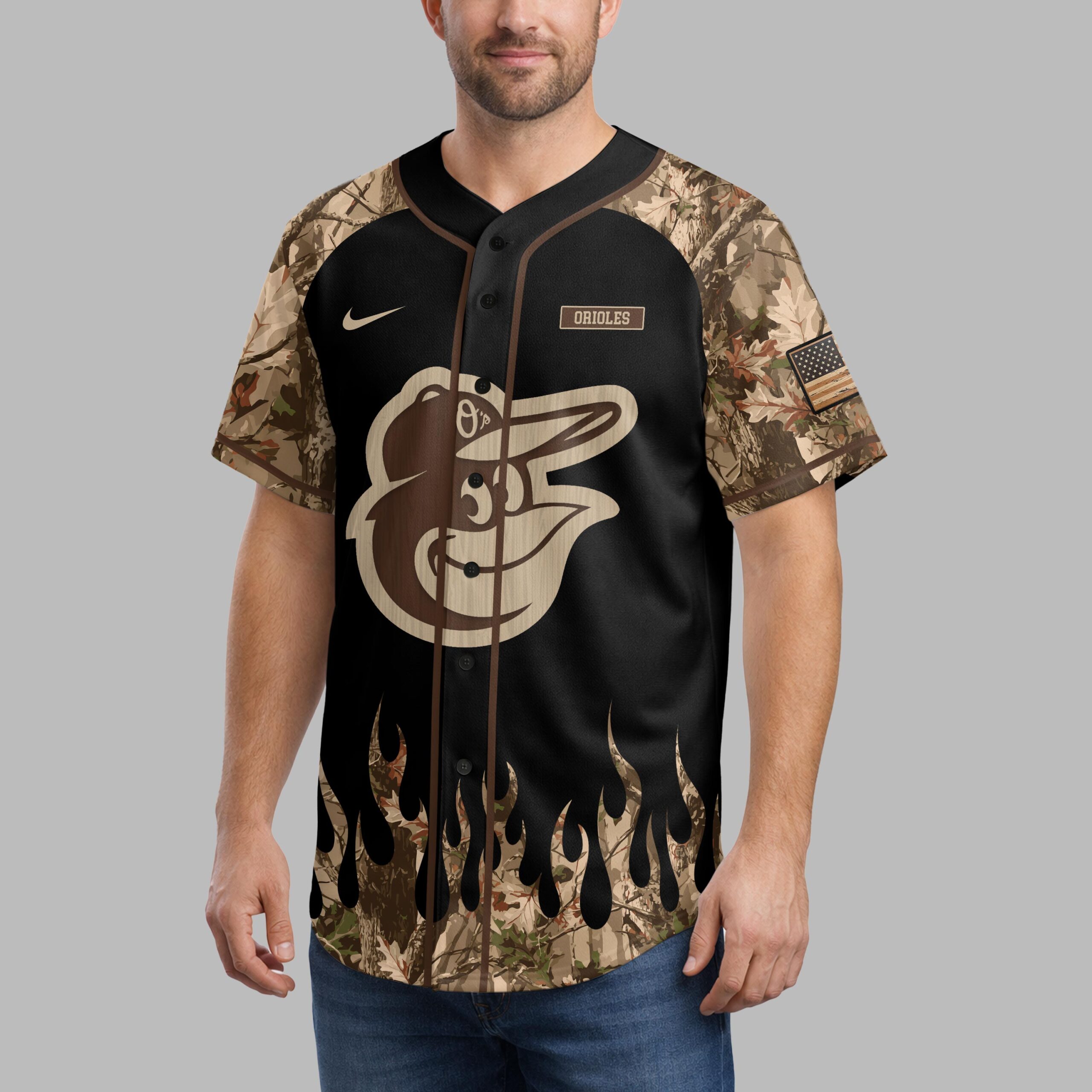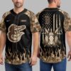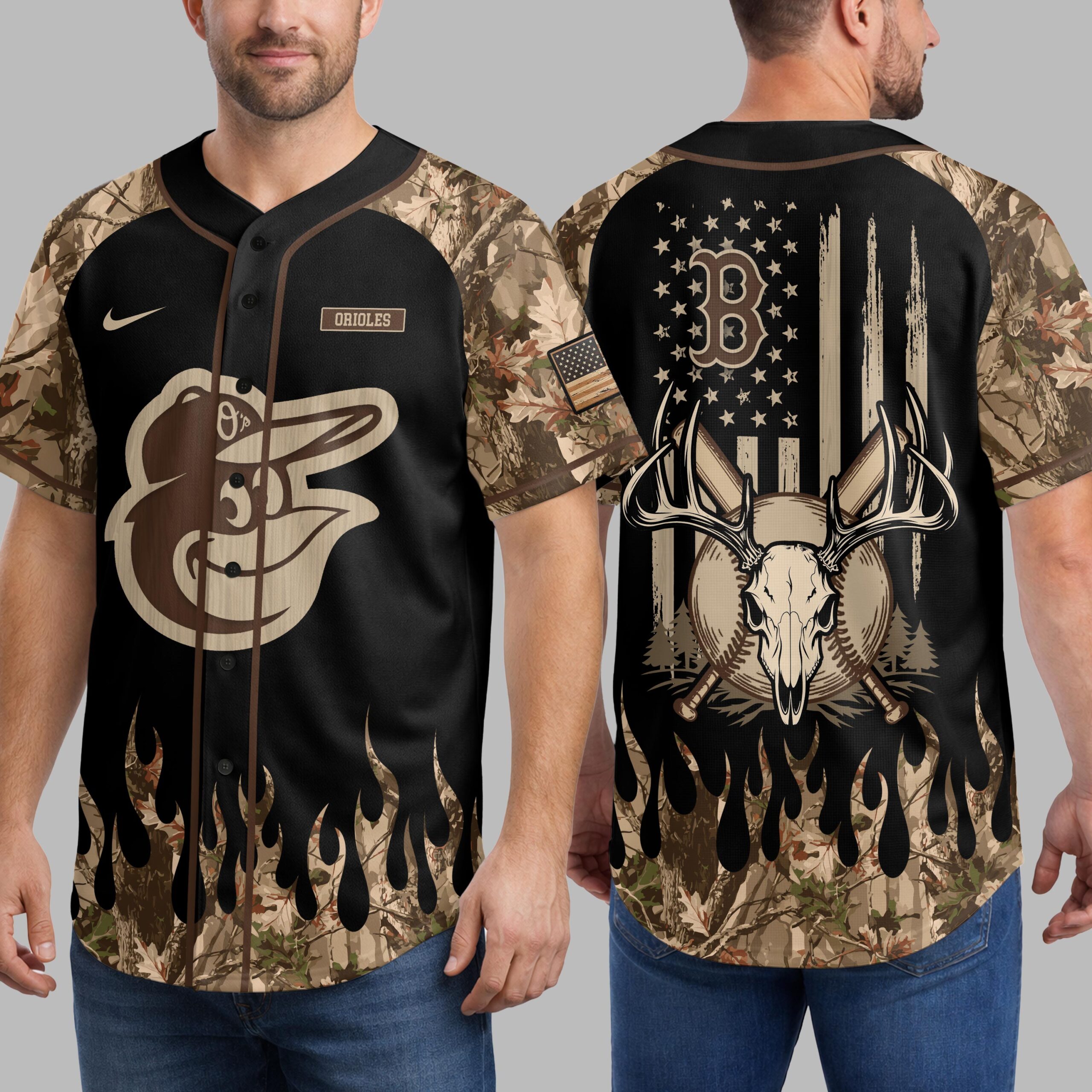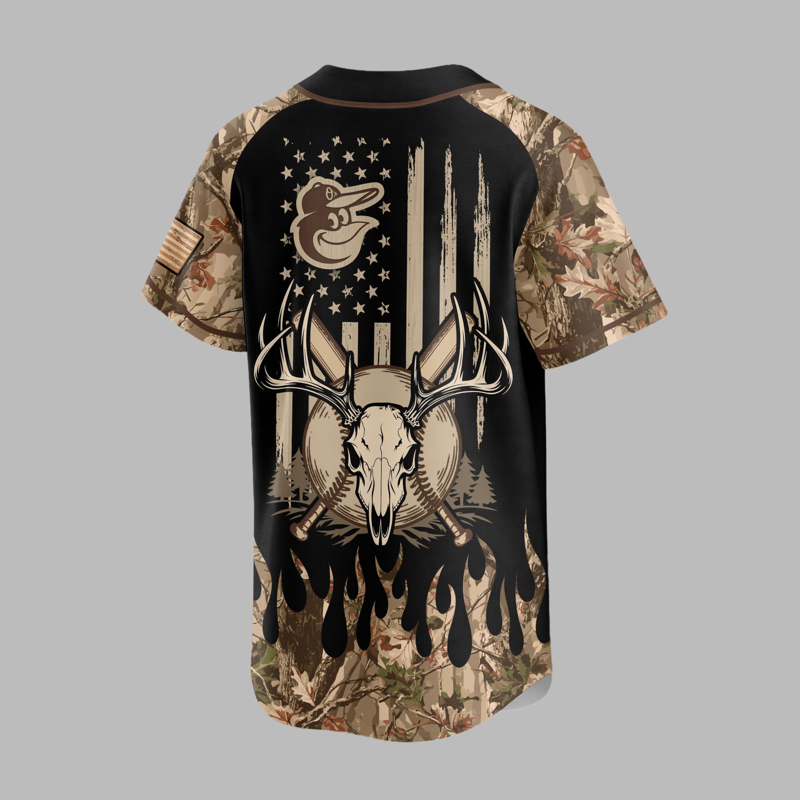 Unleash your dual passion for baseball and the great outdoors with this striking Orioles-themed jersey. This unique design perfectly merges your love for the Baltimore Orioles with your rugged hunting spirit and American pride, making it the ultimate statement piece for any dedicated fan who lives for game day and the wilderness. The front of the jersey features a bold, wood-grain textured Baltimore Orioles bird logo, making your team allegiance undeniable. Black panels are dramatically accented by vibrant camouflage flames on the sleeves and lower sides, creating an eye-catching design. Turn heads with the back, showcasing a distressed American flag motif, a majestic deer skull with antlers, and crossed baseball bats, all set against a backdrop of pine trees. The upper left sleeve also sports a smaller Orioles logo. Perfect for cheering on the Orioles at the ballpark, casting a line, or enjoying a campfire under the stars, this jersey transitions seamlessly from game day excitement to outdoor adventures. It’s ideal for casual wear, tailgates, hunting trips, or simply showing off your diverse passions with patriotic flair.