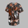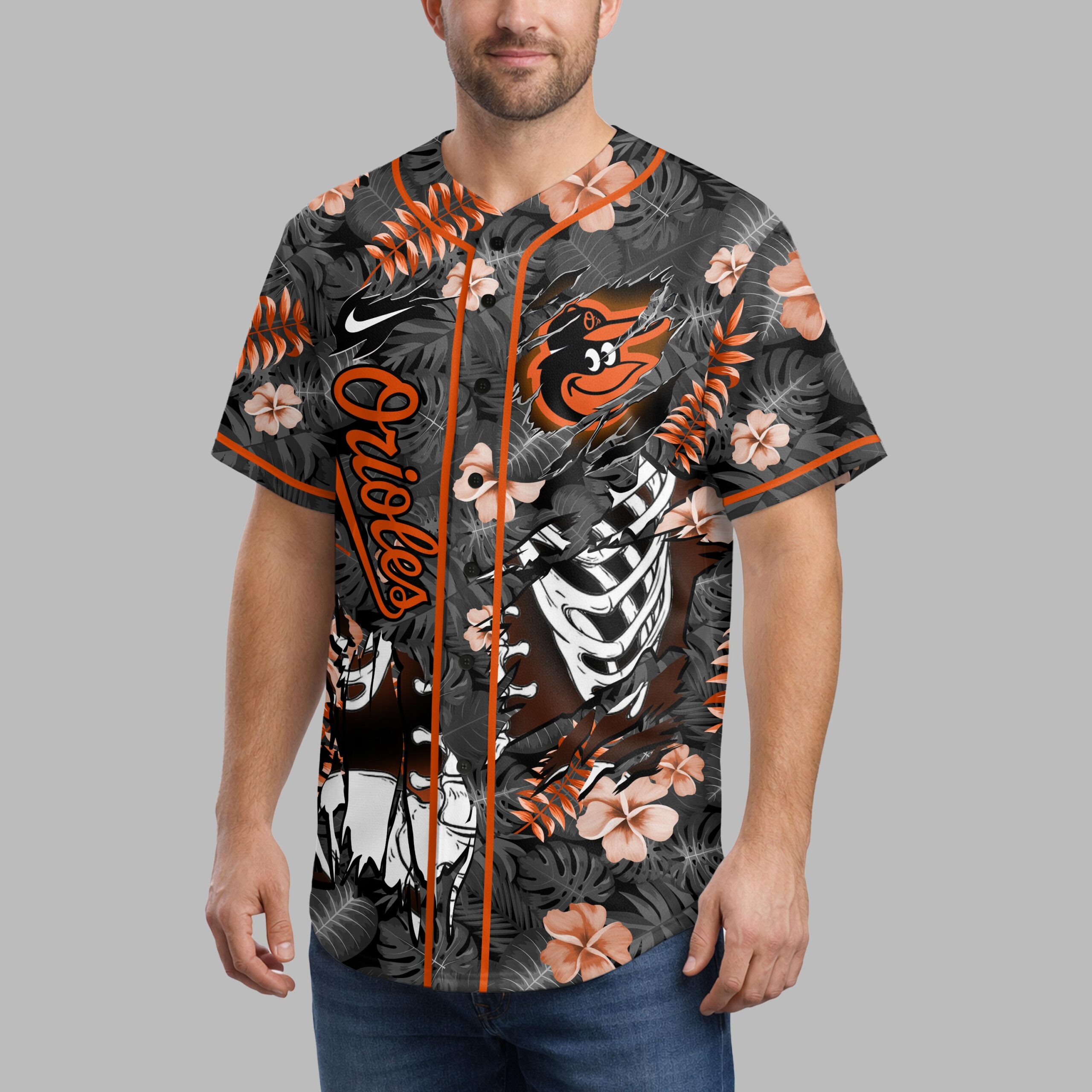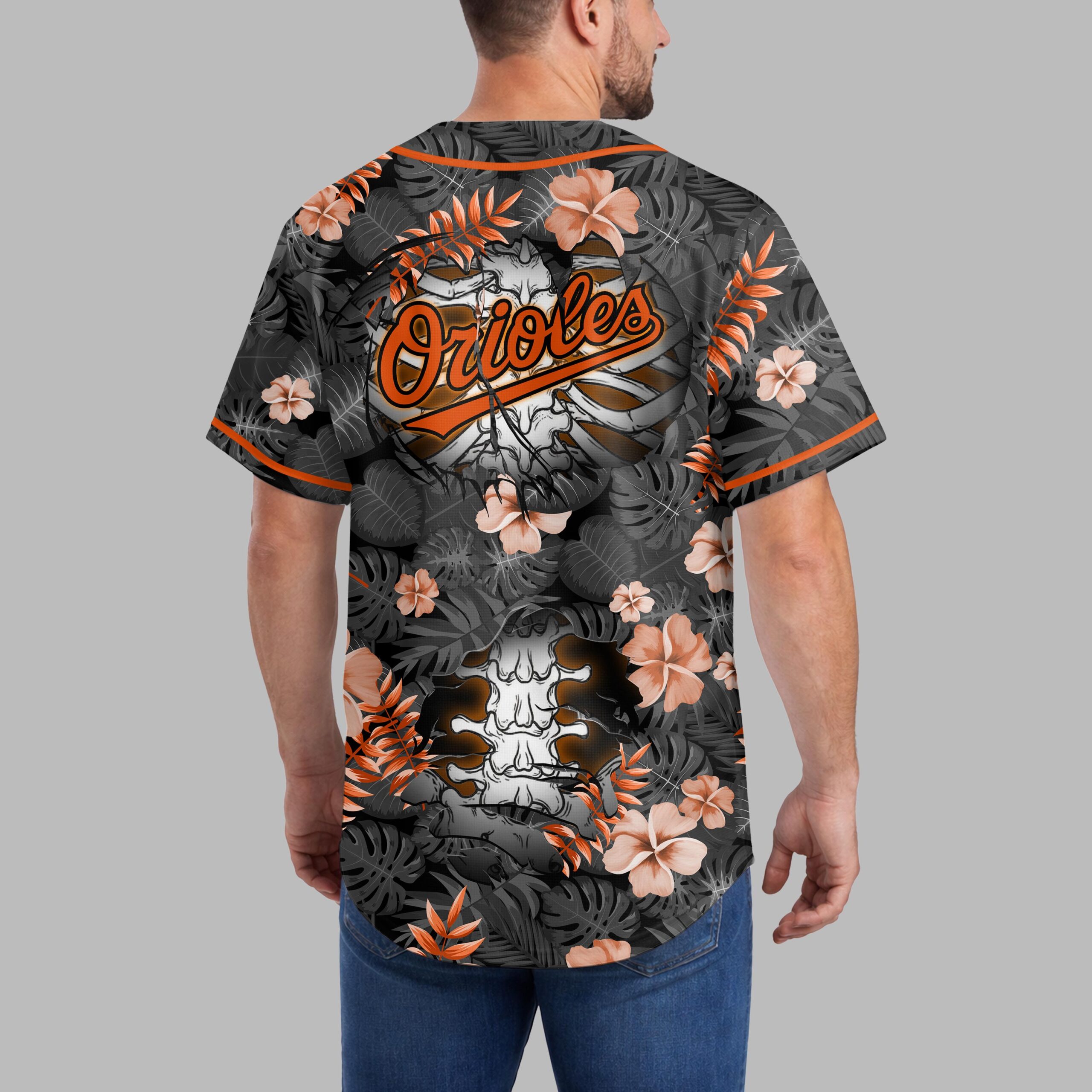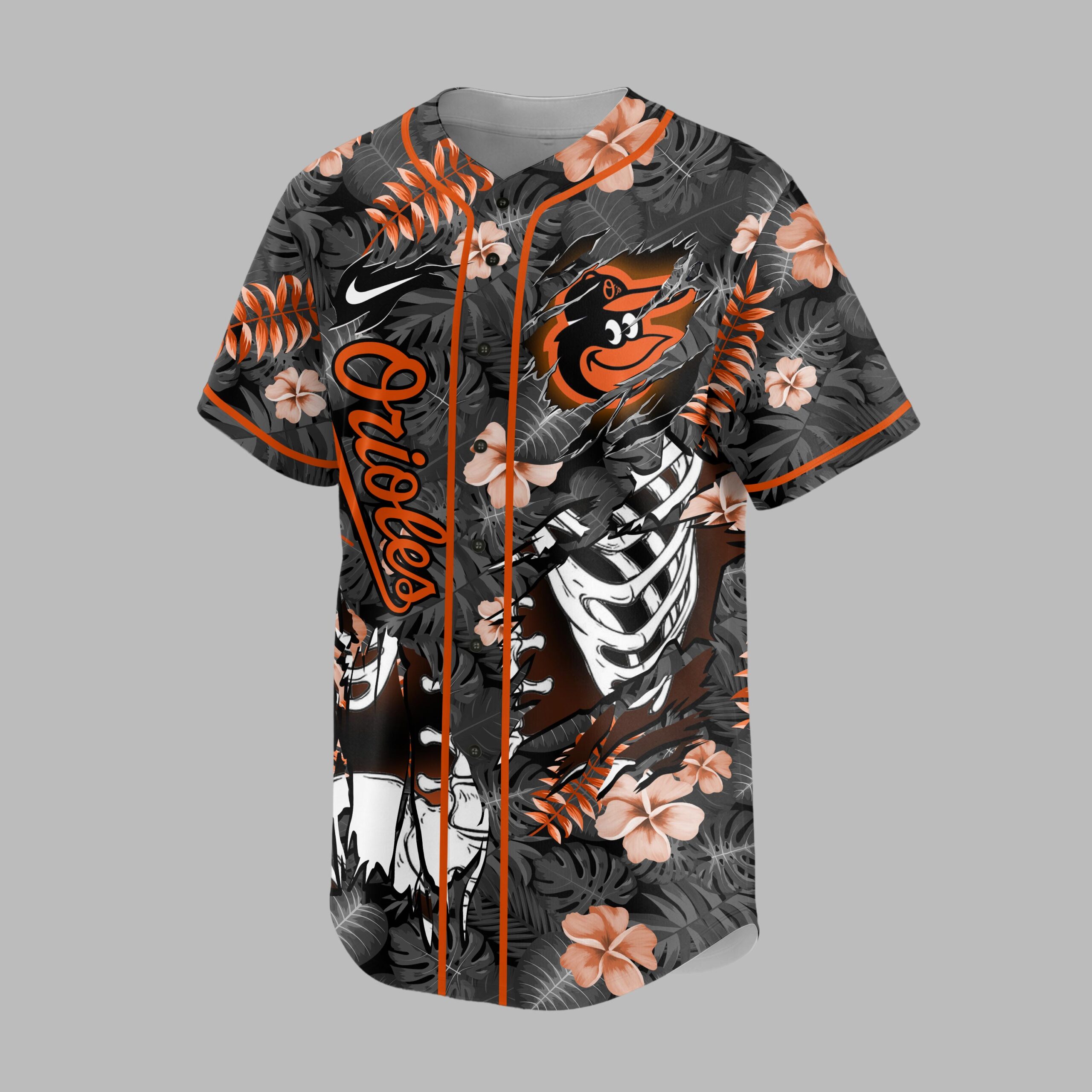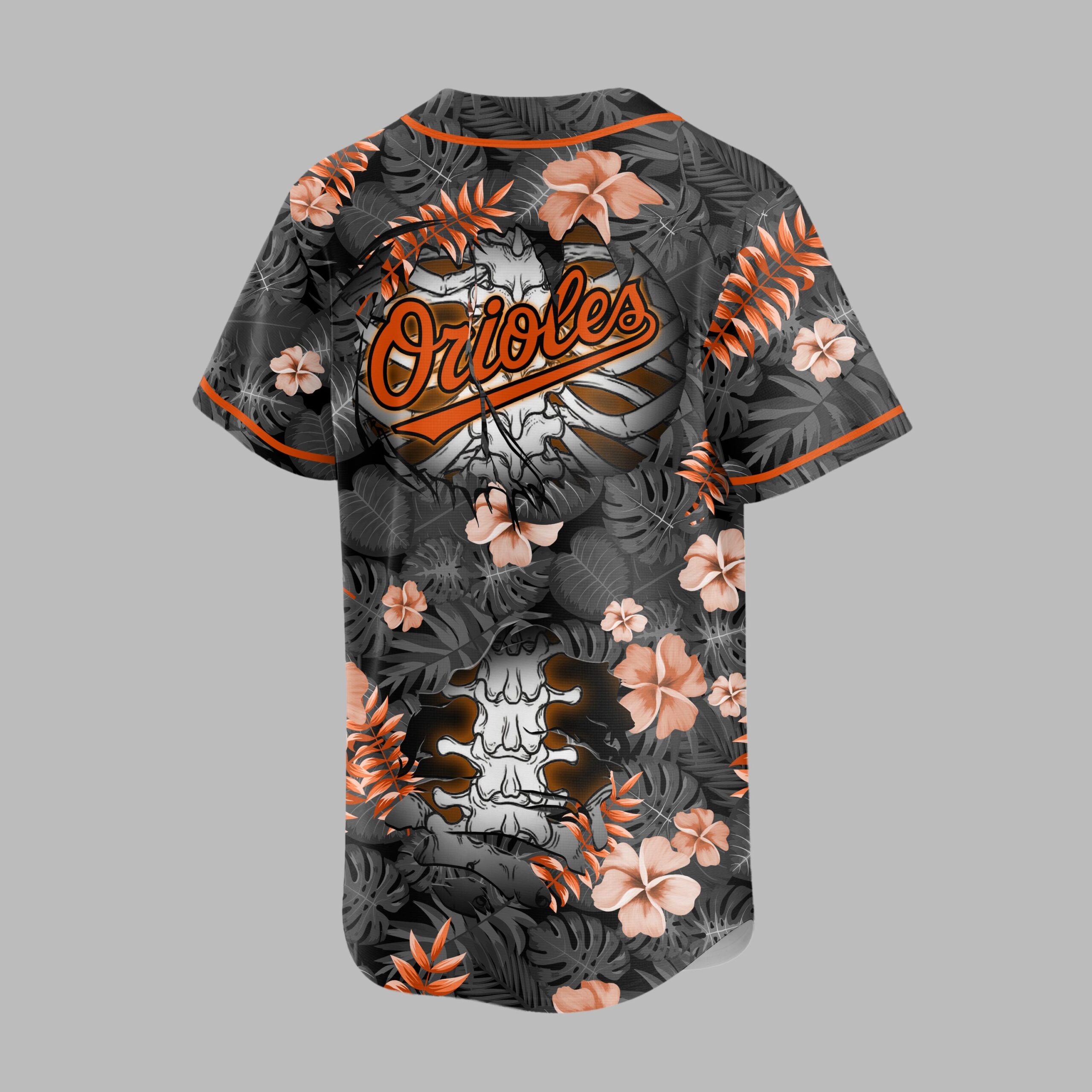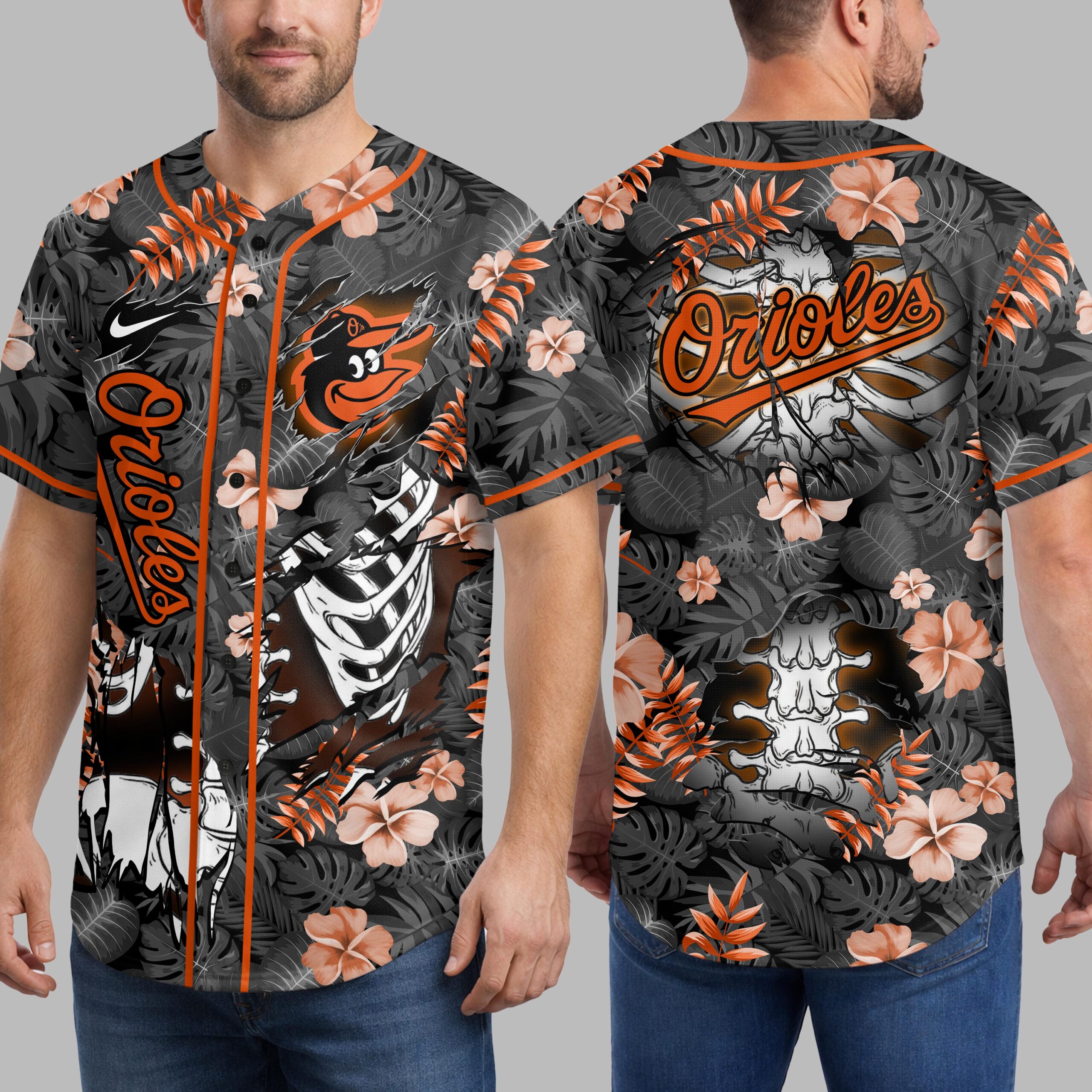 Unleash your Orioles spirit with this distinctive tropical baseball jersey! Merging classic team pride with a vibrant, island-inspired design, it’s perfect for fans who love to stand out. Bring exciting energy to game days and beyond with this uniquely spirited top. The front boldly features the Orioles script and the team’s bird logo, complemented by a skeleton torso with baseball stitching. A lush pattern of grey tropical leaves and vibrant orange hibiscus flowers adorns the jersey, accented by orange piping. The back mirrors this theme, showcasing Orioles above a stylized skeleton spine against the tropical backdrop. Ideal for the ballpark, summer gatherings, or elevating everyday style, this jersey is a home run. Perfect for sunny game days, vacations, or any event where you want to express Orioles loyalty with a fun, eye-catching look.
