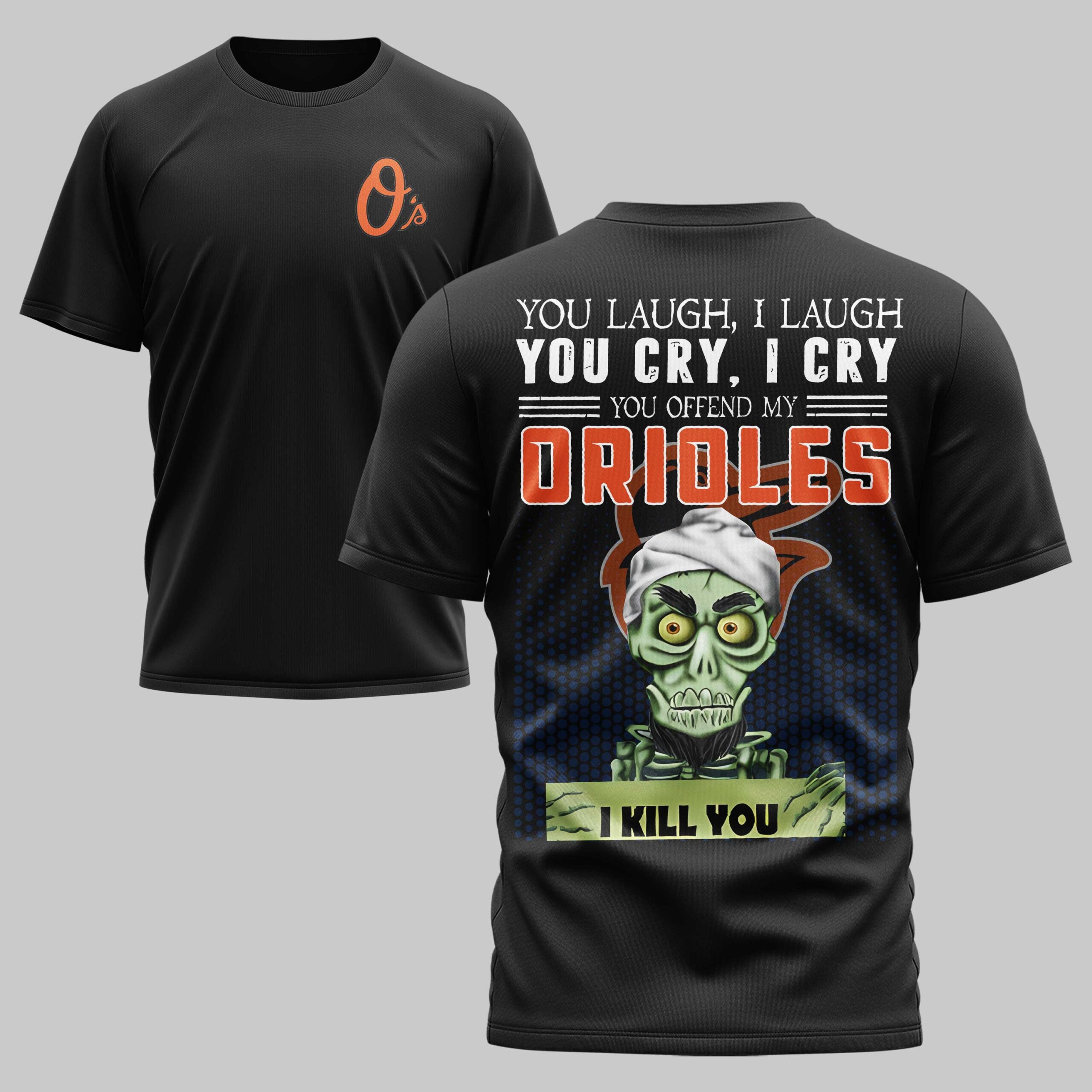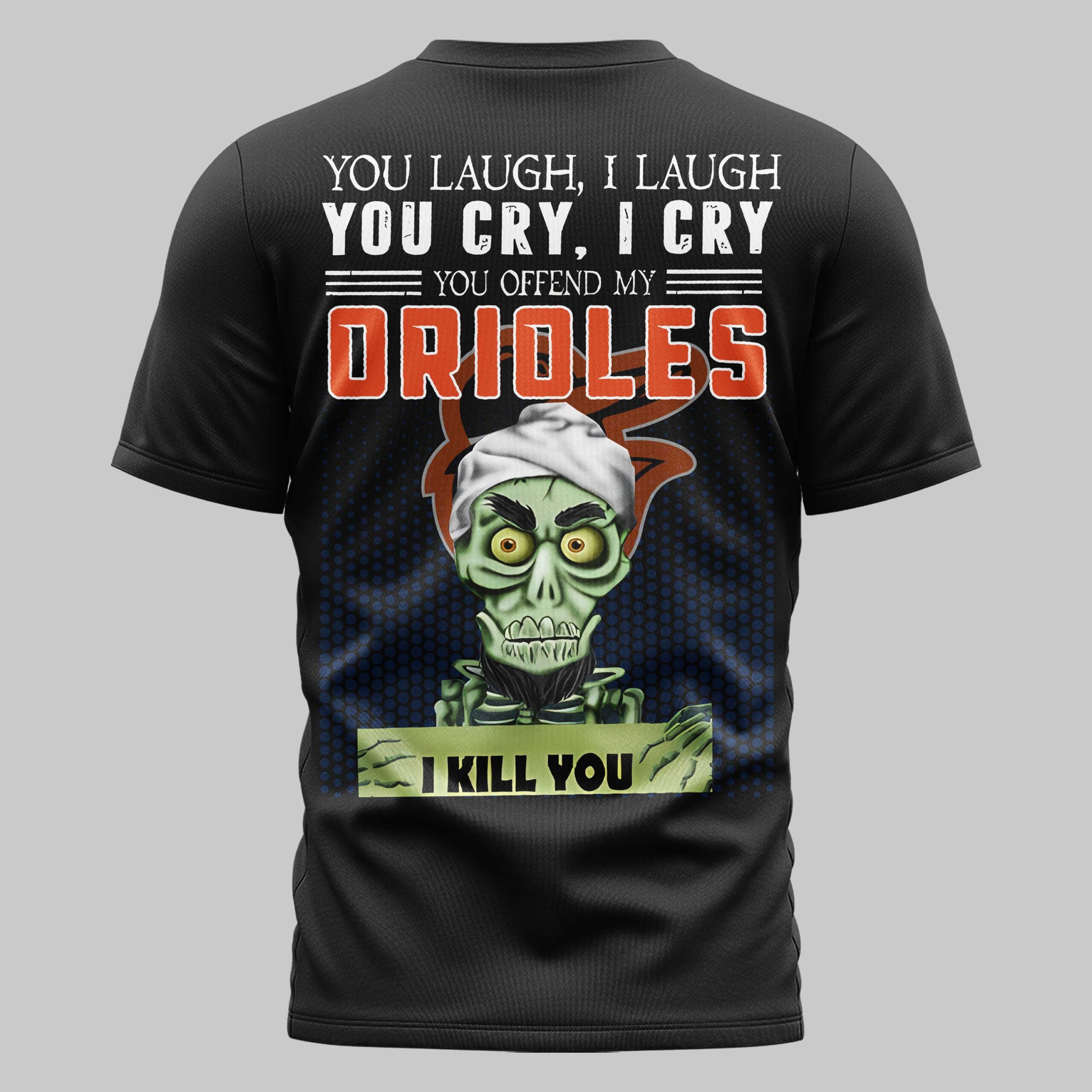 Showcase your unwavering loyalty to Baltimore with a shirt that speaks as loud as the crowd at Camden Yards. This design perfectly captures the fierce spirit of an Orioles fan, blending intense team pride with a bold theme that stands out during any patriotic gathering or national holiday celebration. The front displays a sharp O’s logo in classic orange on the chest. The back makes a powerful statement with a humorous graphic featuring an iconic skeleton character. Accompanied by the text You offend my Orioles, I kill you and the team name in vibrant block letters, your dedication to the team is unmistakable. Perfect for cheering at the ballpark, attending Independence Day festivities, or hanging out with fellow fans, this shirt is a must-have. It’s a fun, high-energy way to represent the Birds while showing off your unique sense of humor and love for Baltimore baseball every day.
