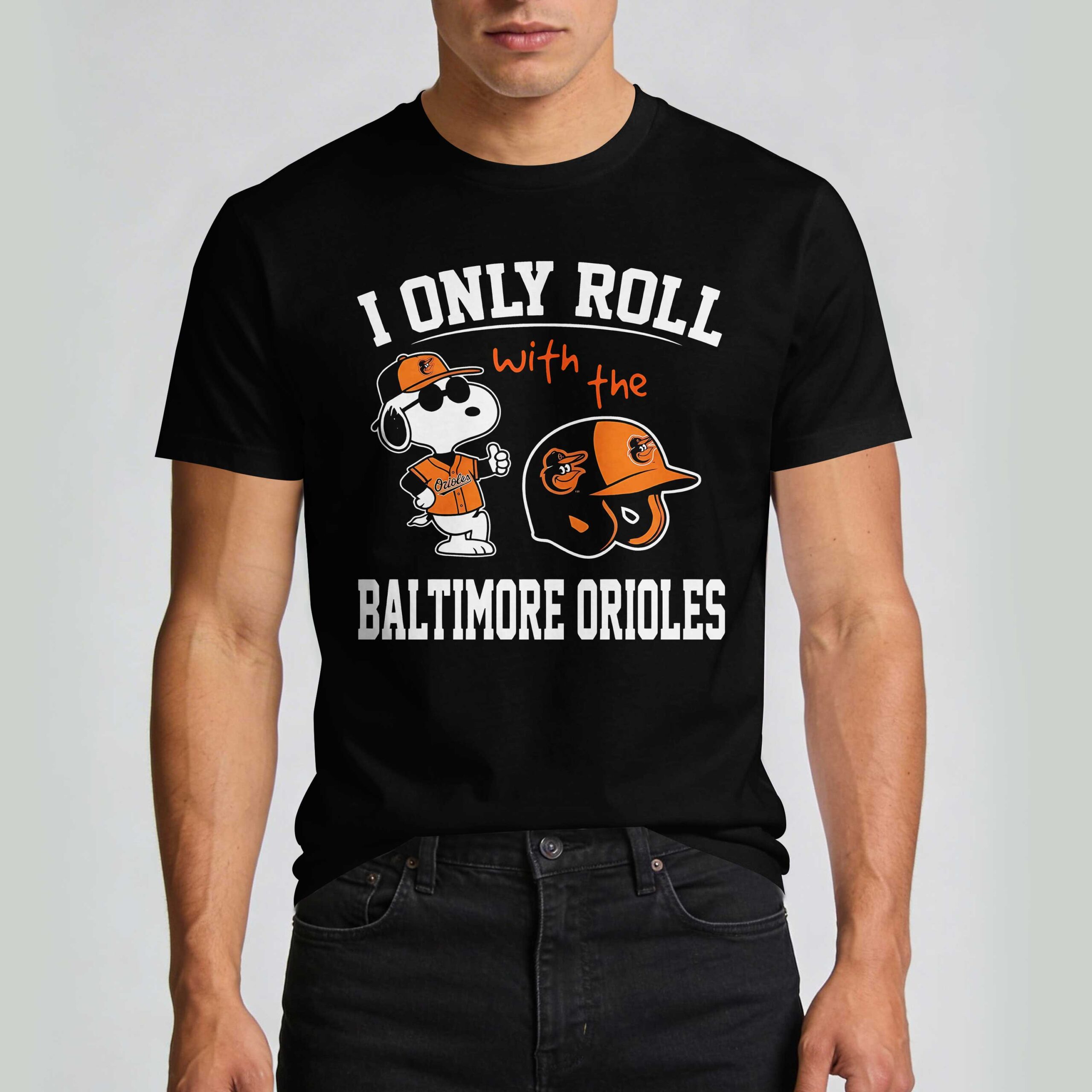 Show your Baltimore Orioles pride with a touch of classic charm! This fun tee is perfect for dedicated fans eager to cheer on their favorite baseball team. It’s an awesome way to express your loyalty and enthusiasm for the Orioles in a unique, playful style. The front features Snoopy looking cool in sunglasses, an orange Orioles cap, and an authentic jersey, giving a confident thumbs-up. Alongside him rests a Baltimore Orioles helmet, completing the spirited design. Bold text reads, I ONLY ROLL with the BALTIMORE ORIOLES, making your team allegiance perfectly clear. Wear this shirt to the ballpark, game-day parties, or any casual outing. It’s an instant conversation starter for proudly representing your beloved Baltimore Orioles and showing off your winning spirit.