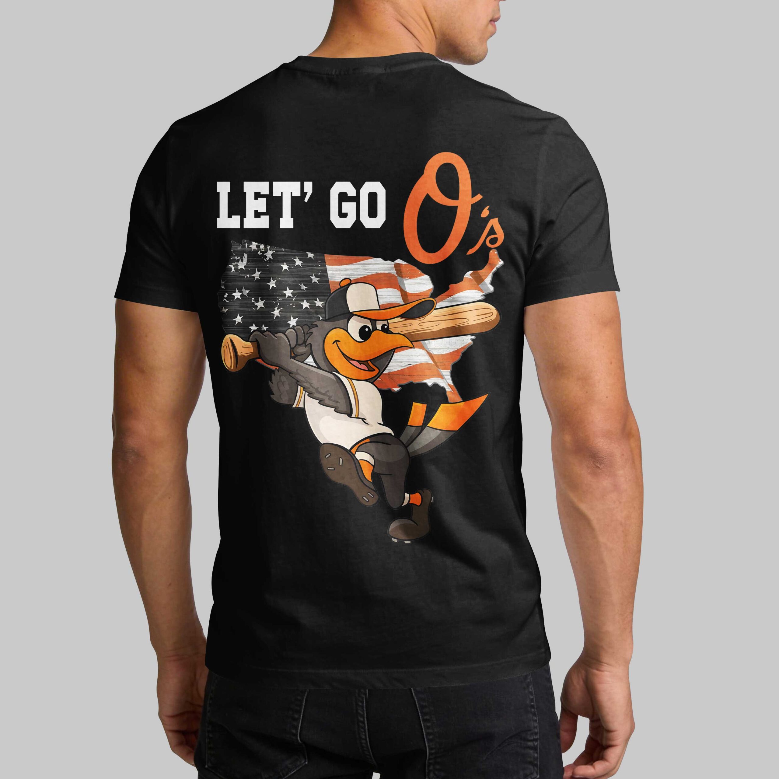 Elevate your game day wardrobe with a shirt that blends Baltimore baseball pride with an unmistakable spirit of American patriotism. This unique design is perfect for dedicated O’s fans who want to represent their favorite team while celebrating the nation’s heritage in bold style. The front features a large, orange USA graphic paired with the iconic cartoon bird logo, making a strong statement from the first pitch. On the back, the energy ramps up with the rallying cry LET’ GO O’s set above a striking American flag graphic shaped like the map of the United States. A spirited mascot swinging a bat completes the look, capturing the dynamic energy of the diamond. Whether you are cheering from the stands at the ballpark, attending an Independence Day celebration, or just hitting the streets of the city, this shirt is the ultimate choice. It’s the perfect gear for showing your loyalty all season long.