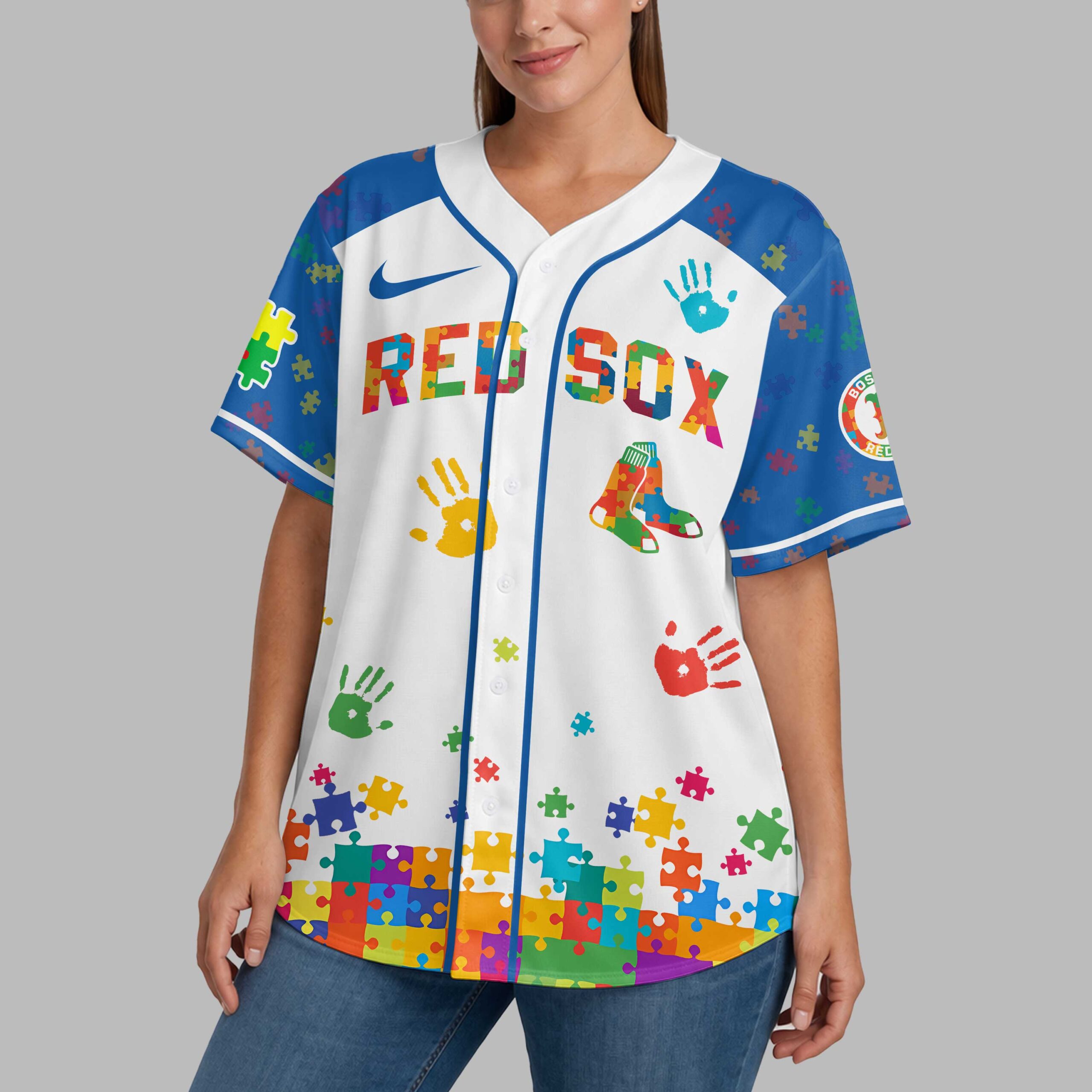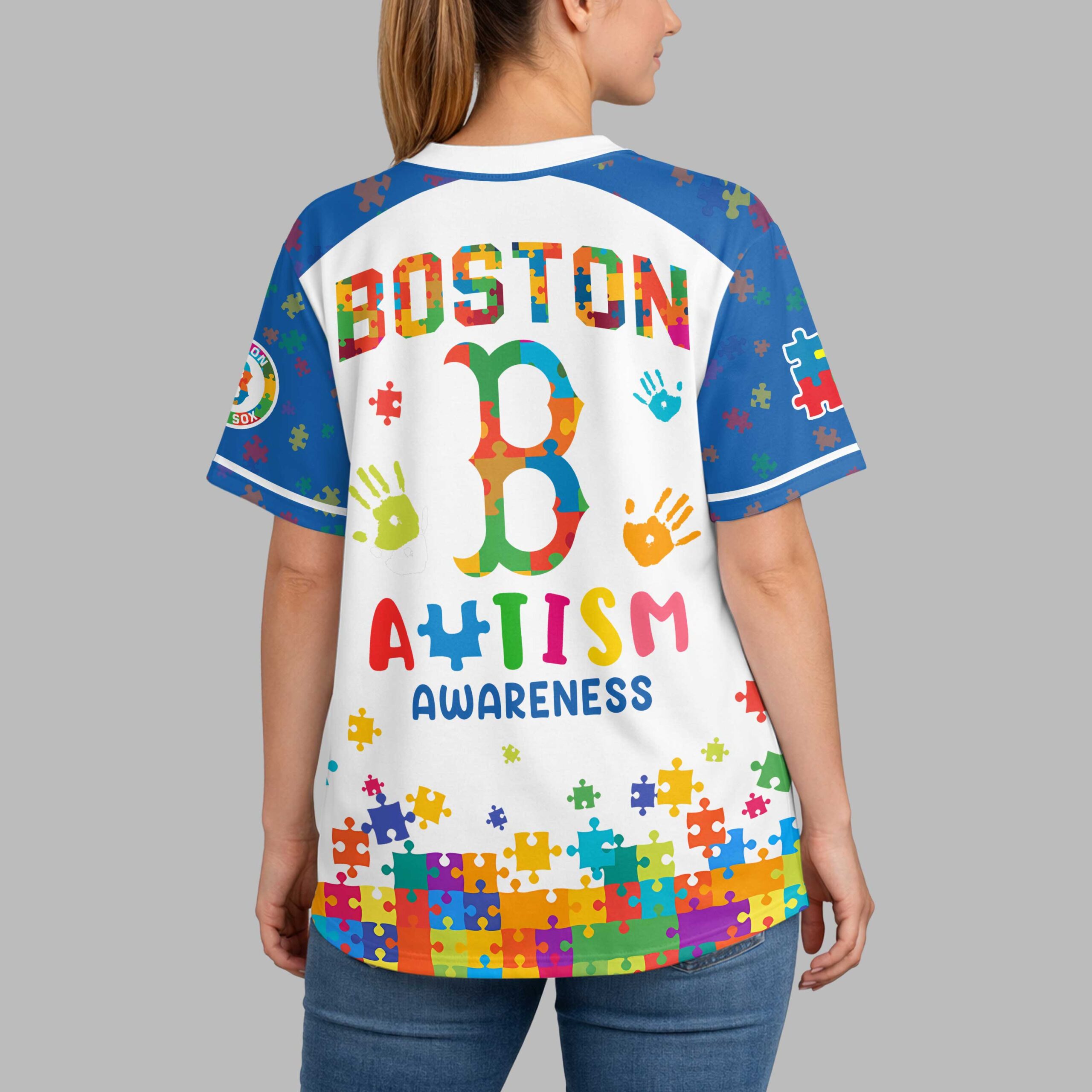 Show your unwavering support for both the Boston Red Sox and the Autism Awareness movement with this uniquely vibrant baseball jersey! This eye-catching design beautifully blends your love for Boston baseball with a powerful message of unity and understanding, making it the perfect way to stand out in the stands and in your community. The jersey features the iconic RED SOX and BOSTON lettering, along with the classic B logo, all artfully crafted from colorful puzzle pieces – a widely recognized symbol of autism awareness. Scattered handprints and puzzle pieces across the design add an extra touch of warmth and inclusivity. The back proudly displays AUTISM AWARENESS below the team branding, ensuring your message is seen. Whether you’re heading to Fenway Park, participating in an Autism Awareness walk, or simply enjoying a casual day out, this jersey is a fantastic choice. It’s ideal for showing solidarity, sparking conversations, and celebrating the diversity within both the Red Sox nation and the broader community.