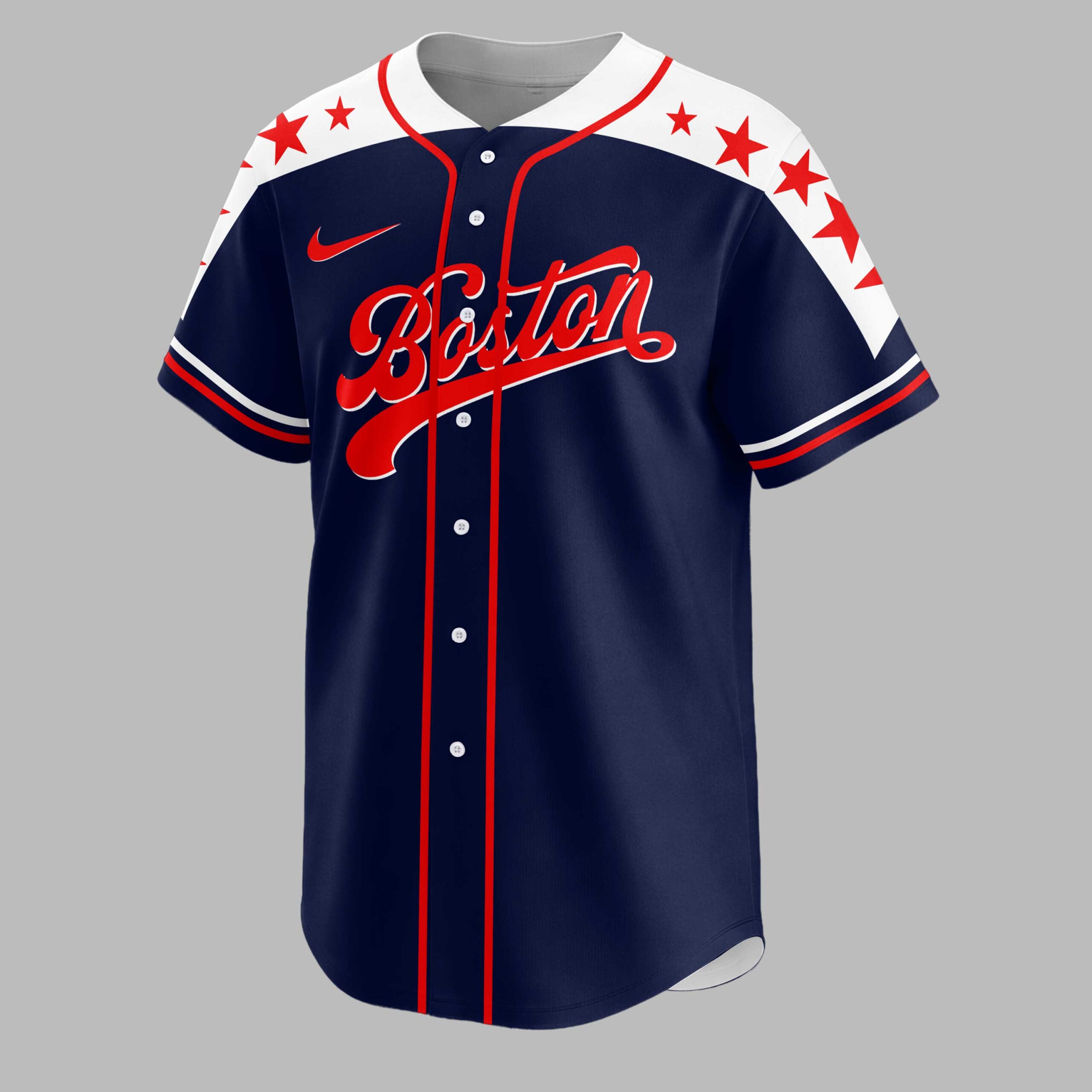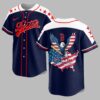 Show your Boston baseball pride and American spirit with this patriotic jersey! Designed for devoted fans, it perfectly blends your passion for the game with national identity. It’s a bold declaration of loyalty to Boston and love for the USA. The navy blue front features Boston in classic red script, accented by white piping and shoulders with striking red stars. The back boasts an impressive graphic: a majestic bald eagle with flag-patterned wings grips a bat and ball, soaring over a rustic American flag map of the USA. The iconic B logo sits above BOSTON COUNTRY. Ideal for game days, national holidays, or any occasion, this jersey lets you proudly display your Boston and American heritage. Perfect for stadium cheers, summer gatherings, or simply expressing your spirit in style.