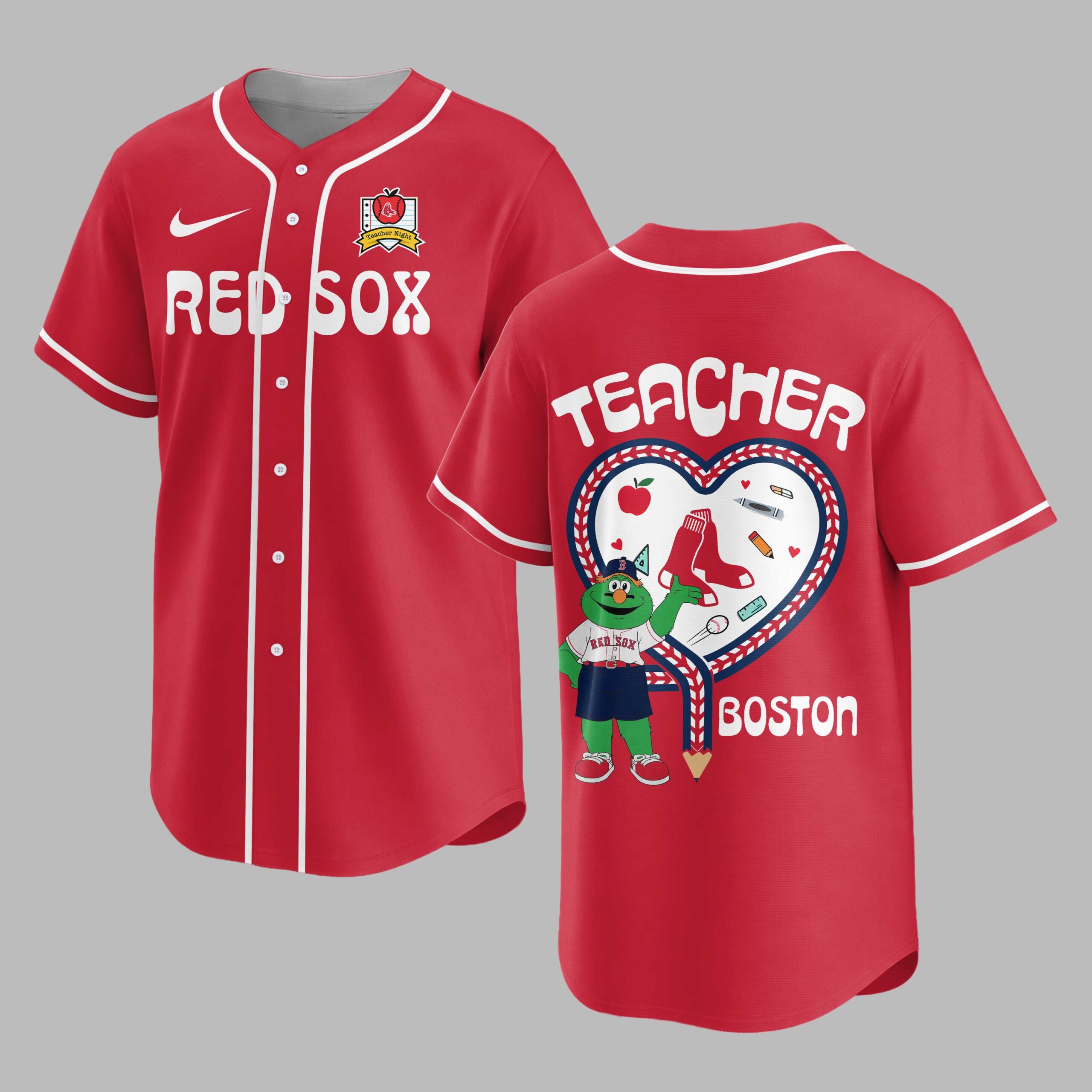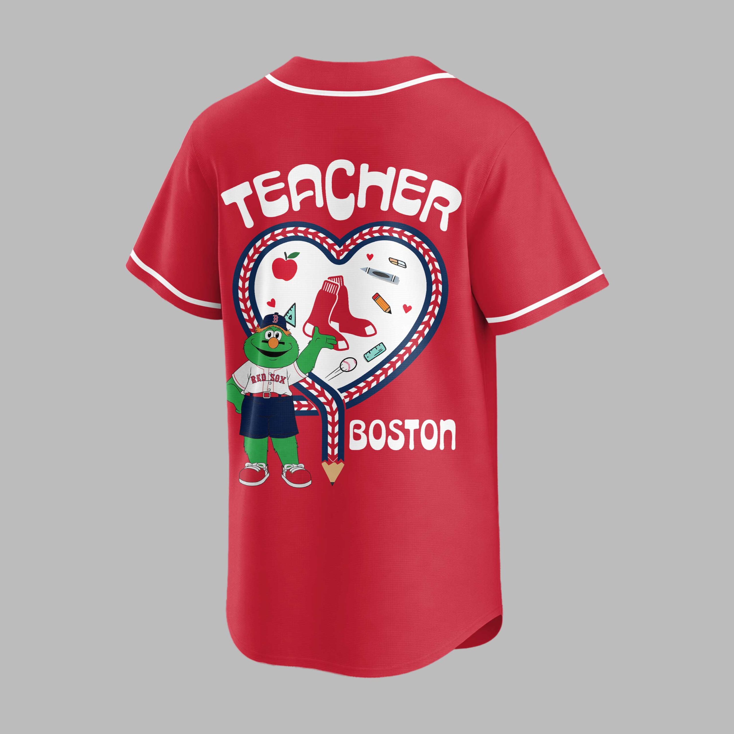 Celebrate your love for Boston baseball and dedication to education with this unique Red Sox Teacher Night jersey! Perfect for educators who bleed red and white, this shirt proudly displays your team spirit and appreciation for the teaching profession. The front features the classic RED SOX lettering, accented by a special Teacher Night emblem that cleverly combines an apple with the iconic B logo. Turn heads with the vibrant back design, showcasing a large heart outlined with baseball stitching, filled with charming teacher essentials like an apple, crayons, and Red Sox socks. Wally the Green Monster, proudly sporting his uniform, stands beside a pencil pointing to BOSTON and a bold TEACHER title above. This jersey is ideal for cheering on the Red Sox at Fenway Park, celebrating Teacher Appreciation Week, or simply showing off your dual passions in the classroom or around town. It’s a fantastic way to honor the educators who make a difference every day while representing your favorite Boston team.
