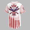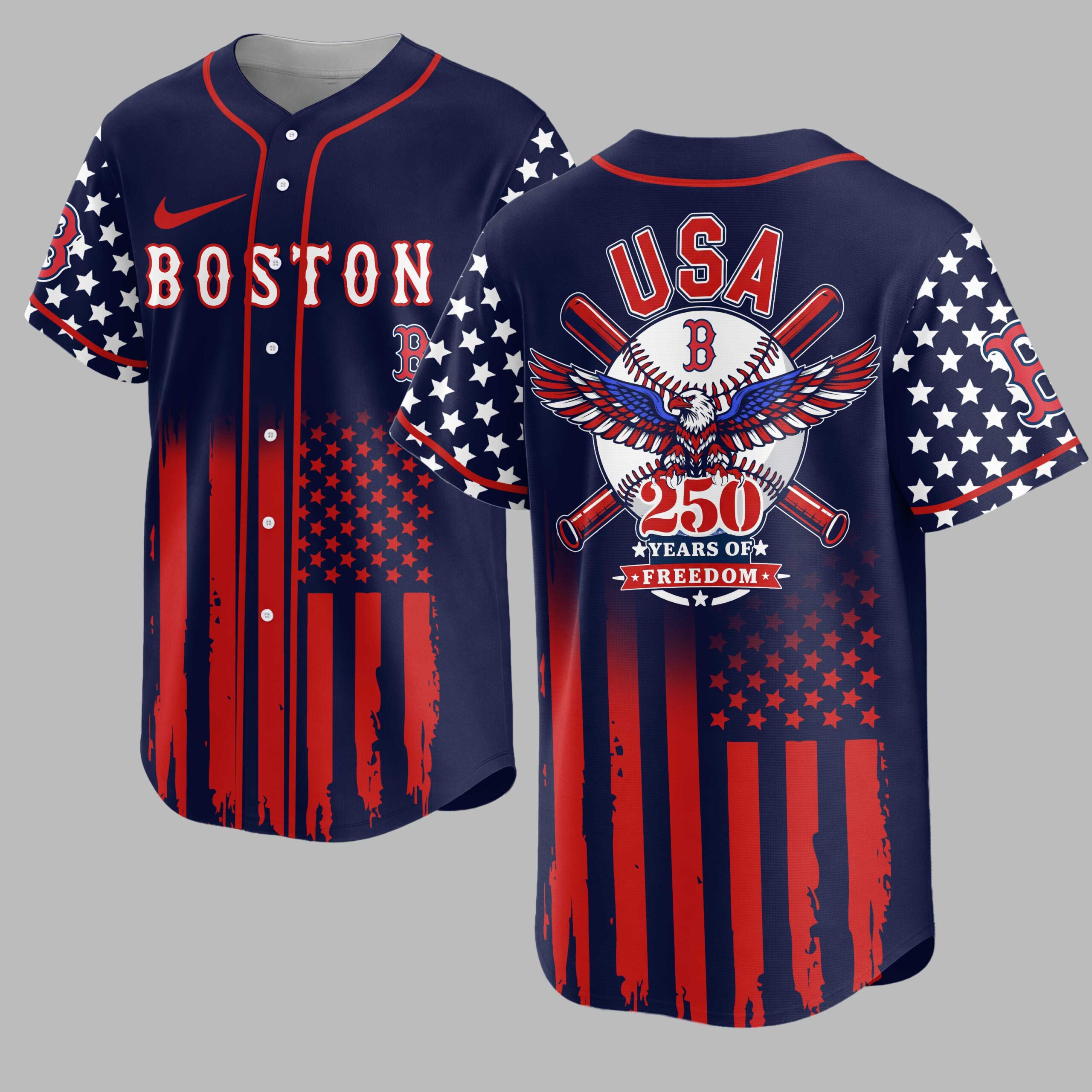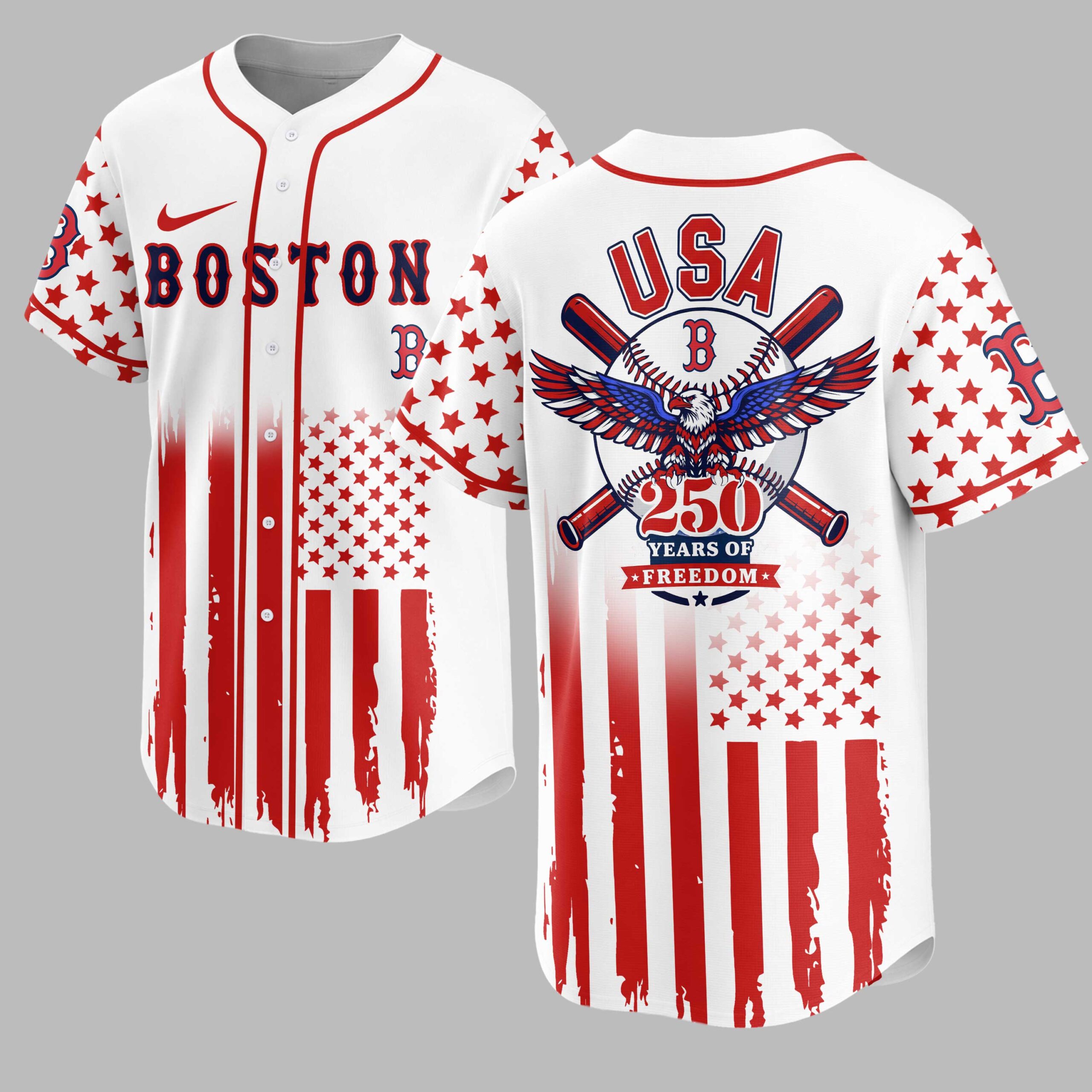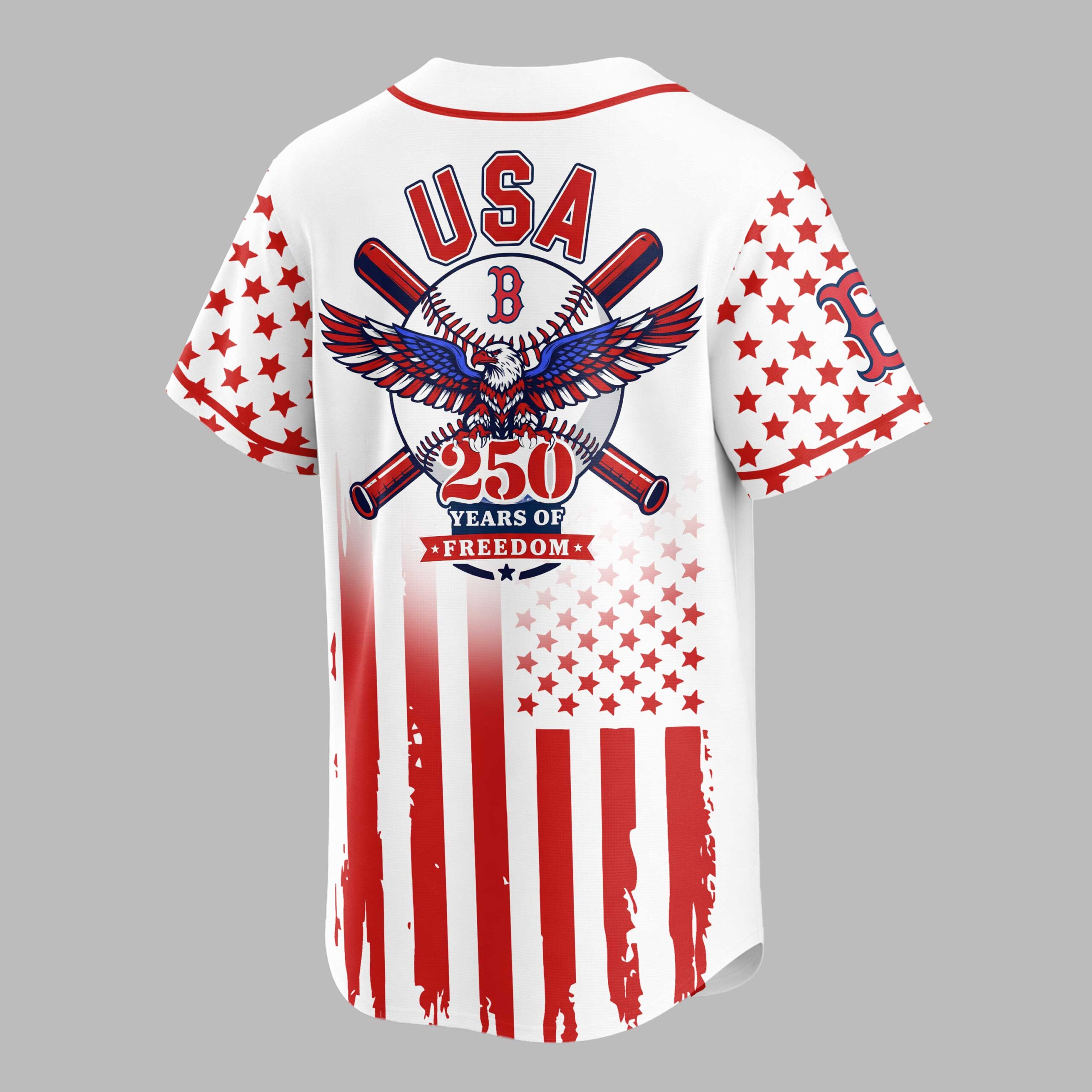 Celebrate your American spirit and Boston Red Sox pride with this commemorative baseball jersey! Honoring 250 years of American freedom, this shirt boldly blends your love for the game with a powerful patriotic statement. The front features BOSTON and the iconic Red Sox B logo over distressed red stripes, evoking the American flag, with star-adorned sleeves. The back proudly displays USA above a striking graphic of a baseball, crossed bats, and a majestic bald eagle with patriotic wings, underscoring 250 YEARS OF FREEDOM. Perfect for game days, Fourth of July, Memorial Day, or any event where you want to showcase your patriotism and team loyalty. Wear it to parades, community gatherings, or simply out and about.