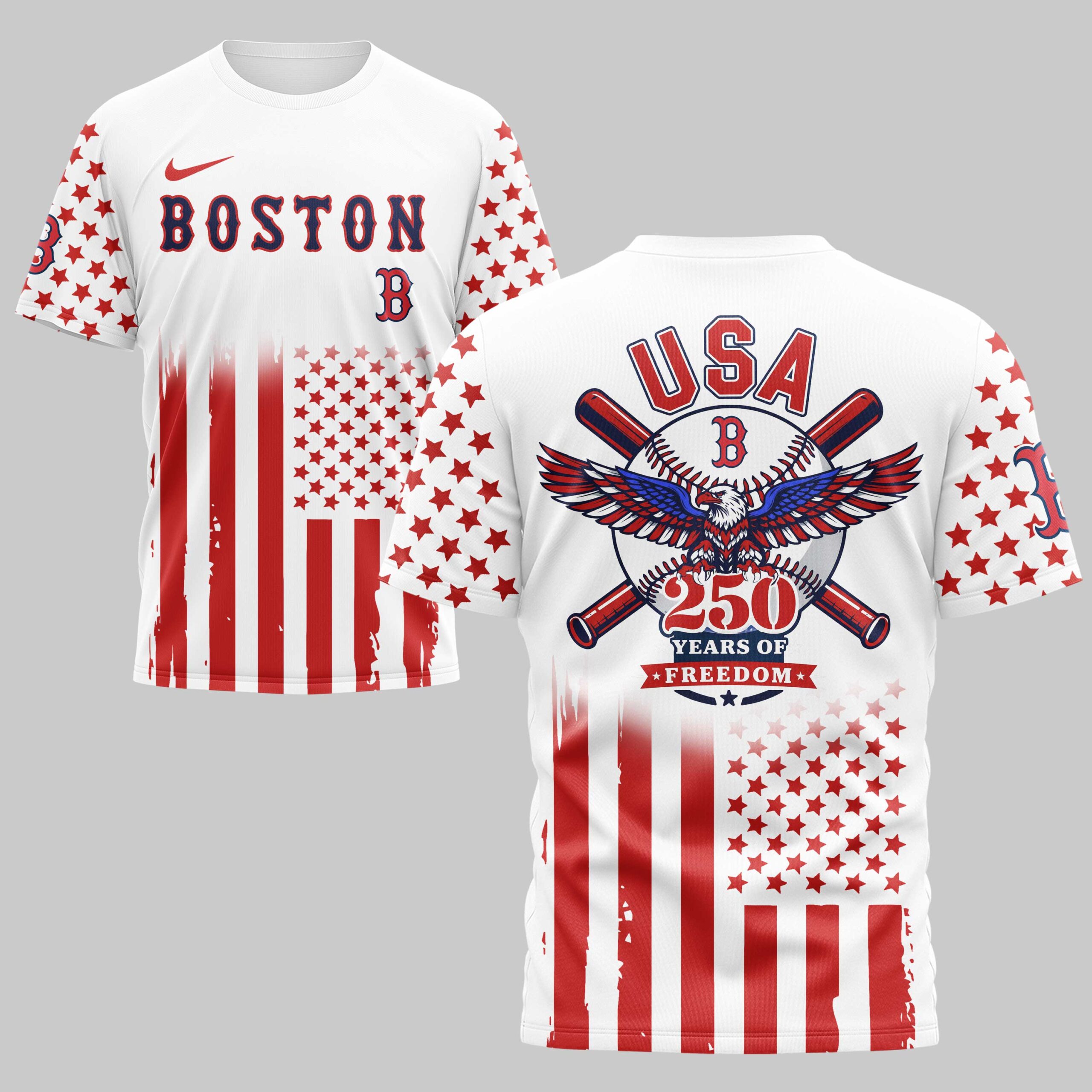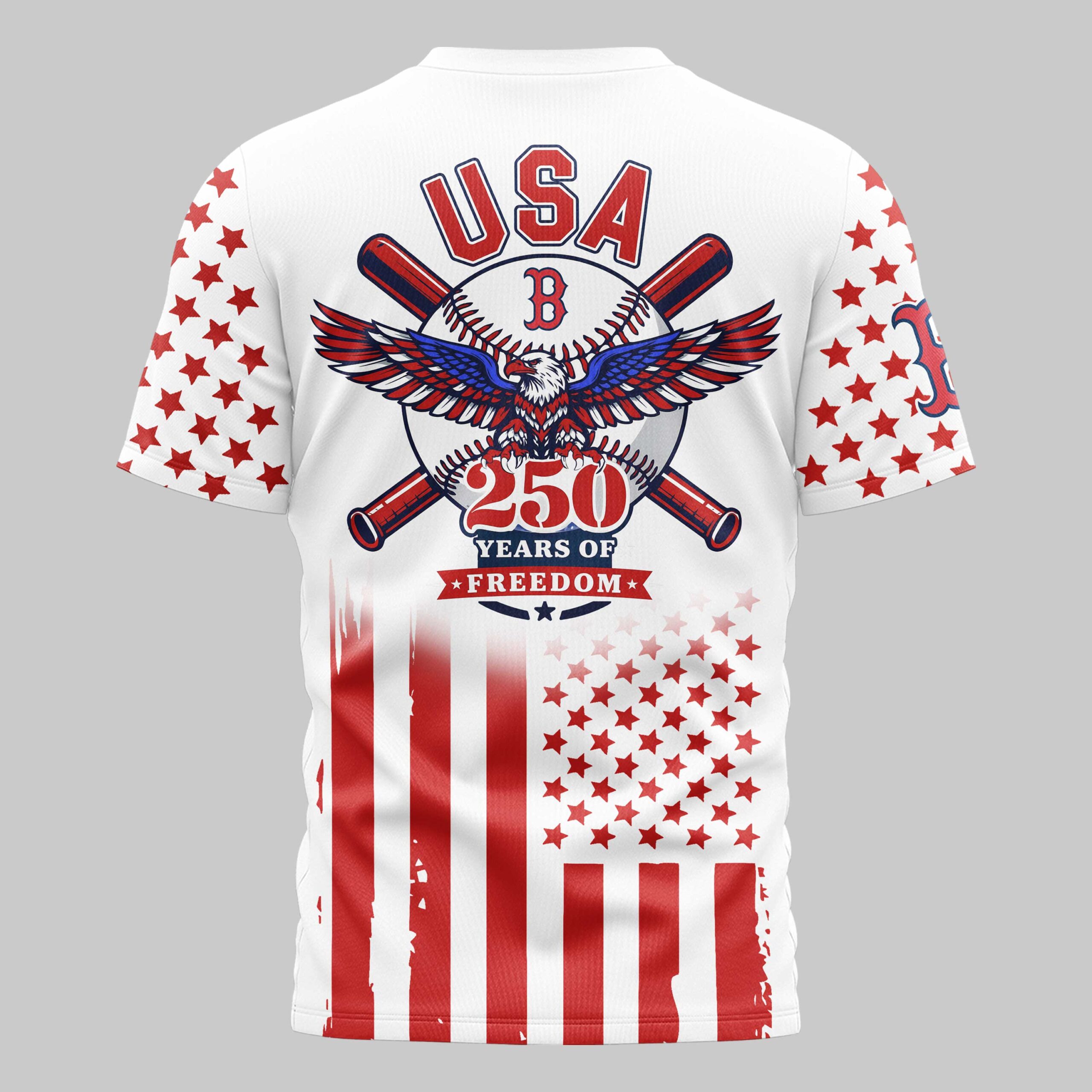 Boston USA 250 Independence Baseball Fan T-Shirt Show your loyalty to Boston with this striking USA 250 Independence Baseball Fan T-Shirt. Designed for fans who combine their love for the game with national pride, this shirt celebrates a historic American milestone. It’s a bold tribute to the team’s legacy and the enduring spirit of freedom that defines the nation. The front features BOSTON in classic lettering and the team logo set against a vibrant stars-and-stripes backdrop. The back showcases a majestic bald eagle over a baseball and crossed bats, framed by the USA 250 Years of Freedom banner. With star-patterned sleeves and a flag-inspired gradient, every detail is built to stand out in a crowd. Perfect for ballpark nights, Independence Day celebrations, or everyday fan wear, this shirt is the ultimate way to represent your team and your country. Wear it with pride as you cheer for a victory.