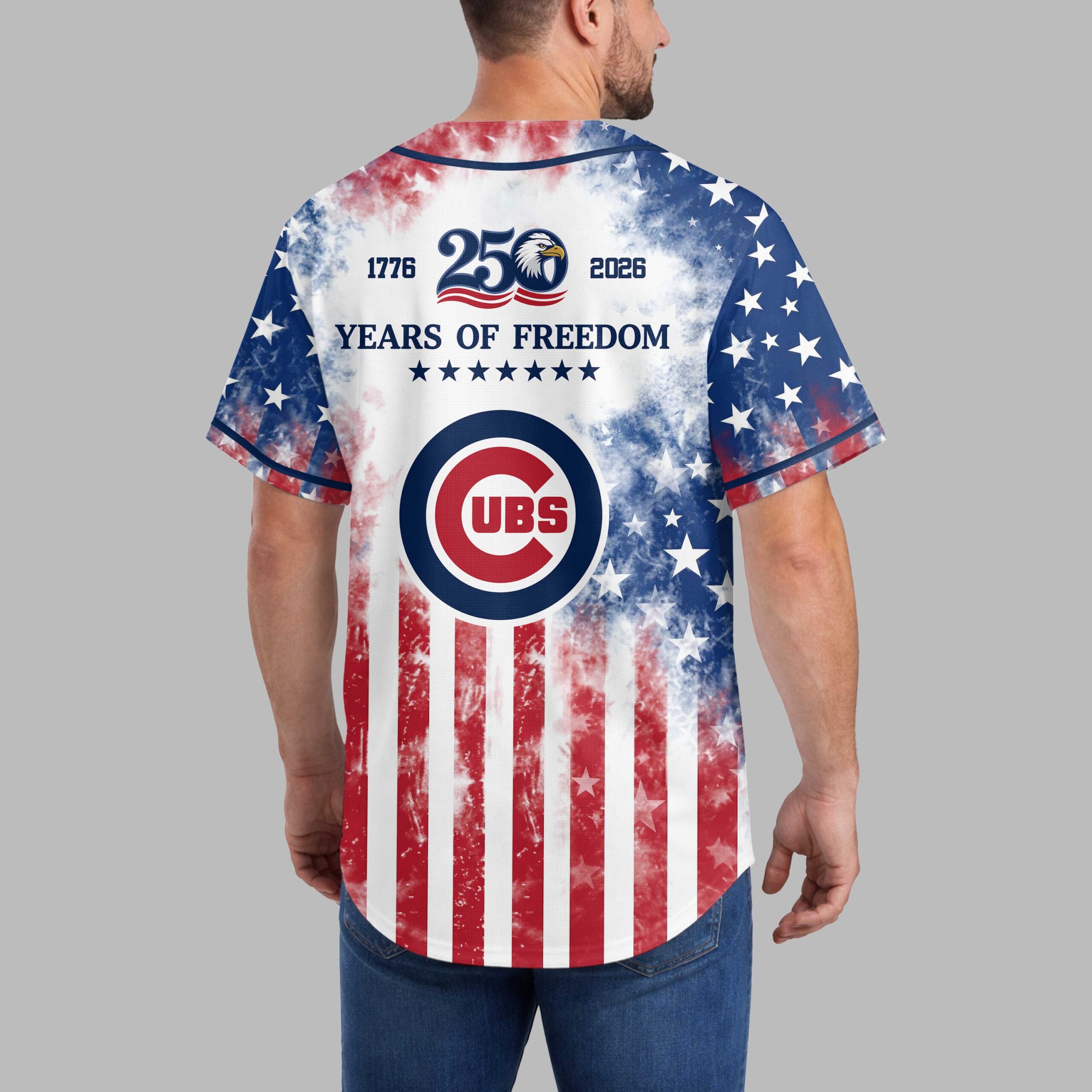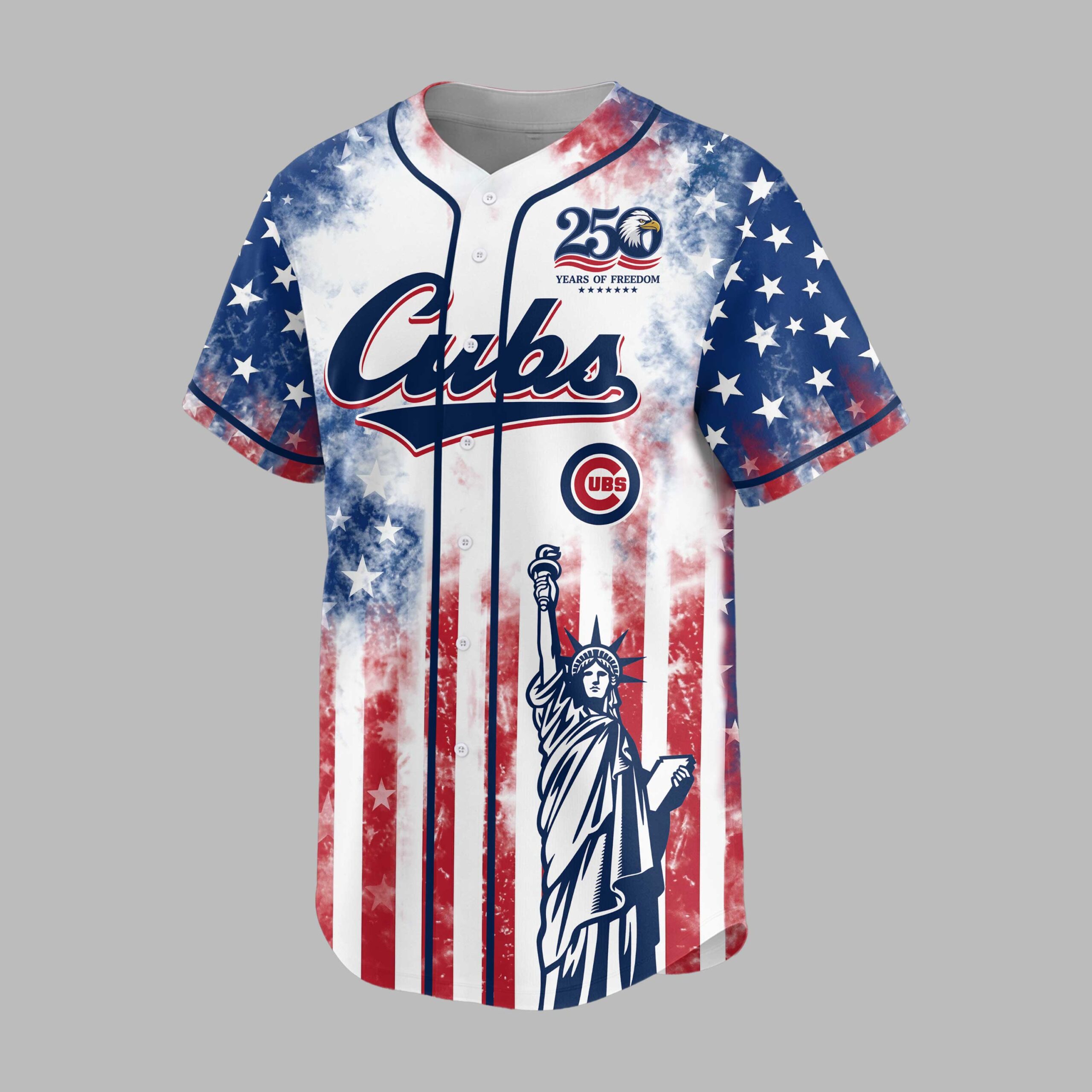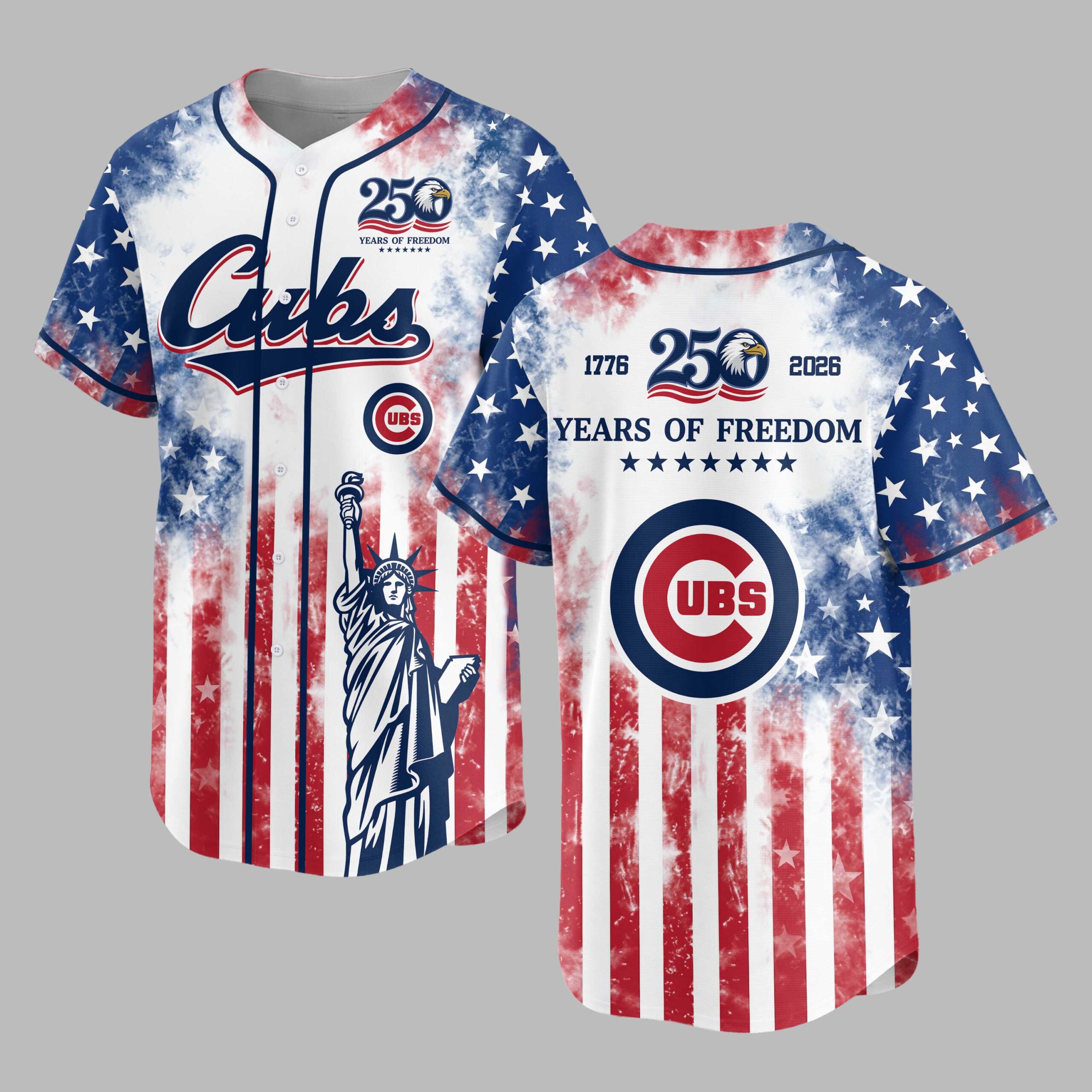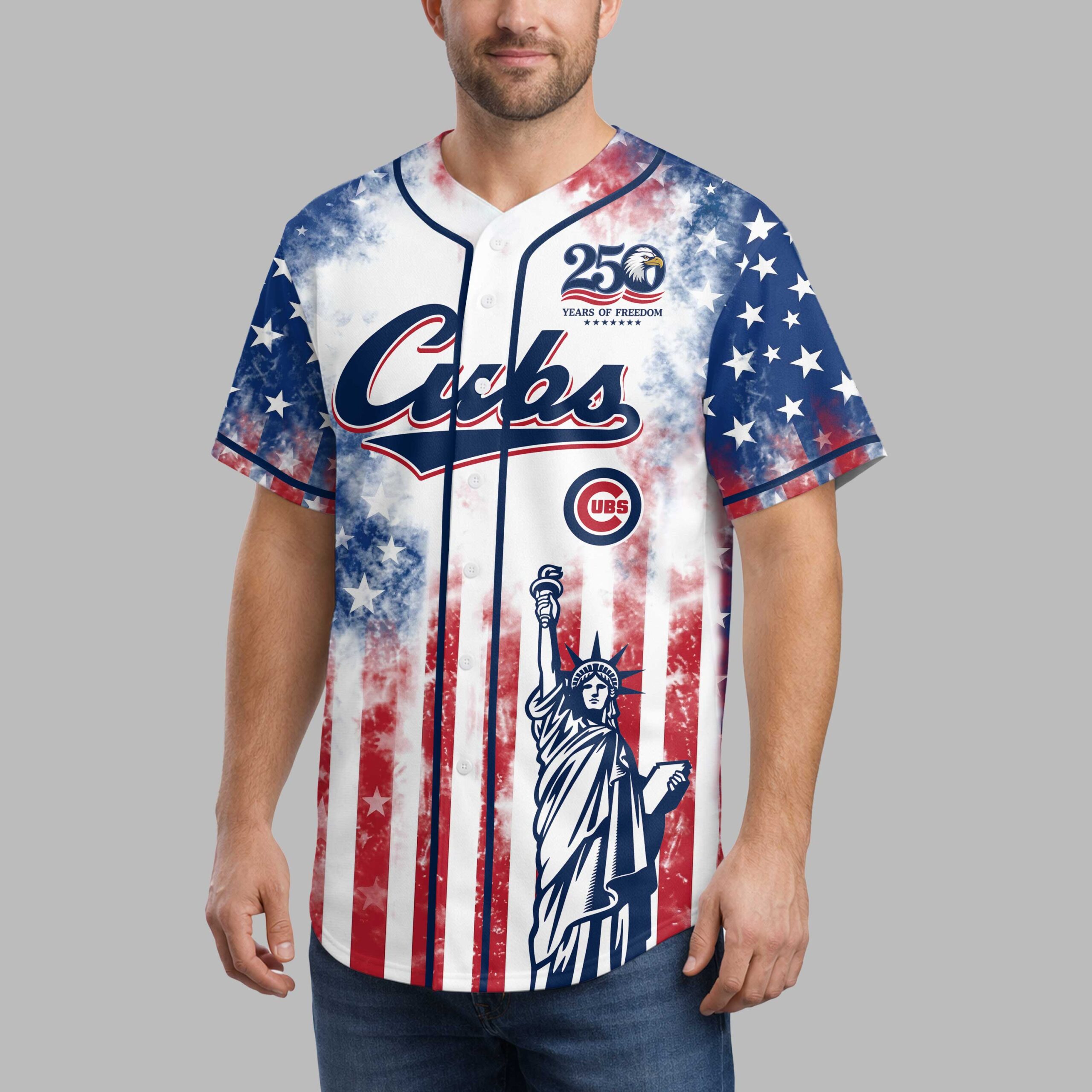 Show your unwavering pride for both the Chicago Cubs and the spirit of American freedom with this commemorative baseball jersey. Celebrating 250 years of liberty, this unique shirt perfectly blends your passion for baseball with patriotism, making it essential for any devoted fan. The front displays the iconic ‘Cubs’ script logo and Statue of Liberty, set against a vibrant, distressed backdrop of red and white stripes and a field of stars. Both sides feature a ‘250 Years of Freedom’ emblem with an eagle, marking the milestone from 1776 to 2026. The back also proudly showcases the circular ‘UBS’ logo. Perfect for cheering on your team at Wrigleyville, celebrating Independence Day, or any patriotic occasion, this jersey lets you display your allegiances with bold style. It’s an ideal choice for baseball enthusiasts and proud Americans honoring two great traditions.