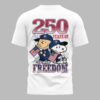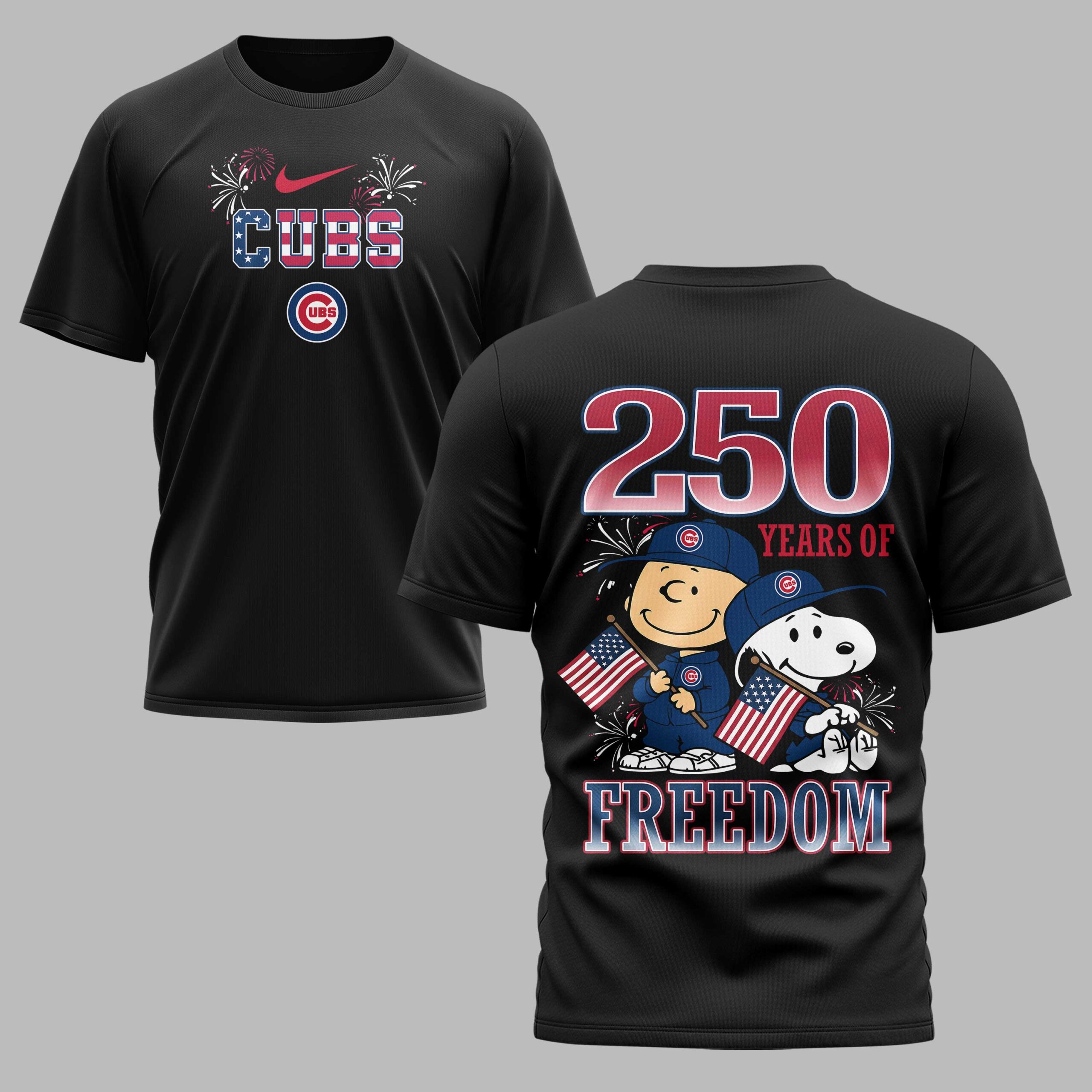 Show your unwavering Chicago Cubs pride and patriotic spirit with this unique fan tee, celebrating ‘250 Years of Freedom’ alongside everyone’s favorite Peanuts characters. It’s the perfect way to combine your love for baseball and country in one vibrant, memorable design. The front proudly displays ‘CUBS’ in a striking stars-and-stripes pattern, accented by festive fireworks and the classic team logo. Turn heads with the back design featuring an iconic duo: Charlie Brown and Snoopy, both sporting Cubs caps and waving American flags. Above them, bold ‘250 YEARS OF’ text leads into ‘FREEDOM’ in a matching patriotic motif, all framed by bursting fireworks. This spirited shirt is ideal for game days at Wrigley Field, Fourth of July celebrations, or any event where you want to showcase your Cubs loyalty and American pride. Wear it to a backyard BBQ, a parade, or simply while enjoying a summer day, making a joyful statement wherever you go.