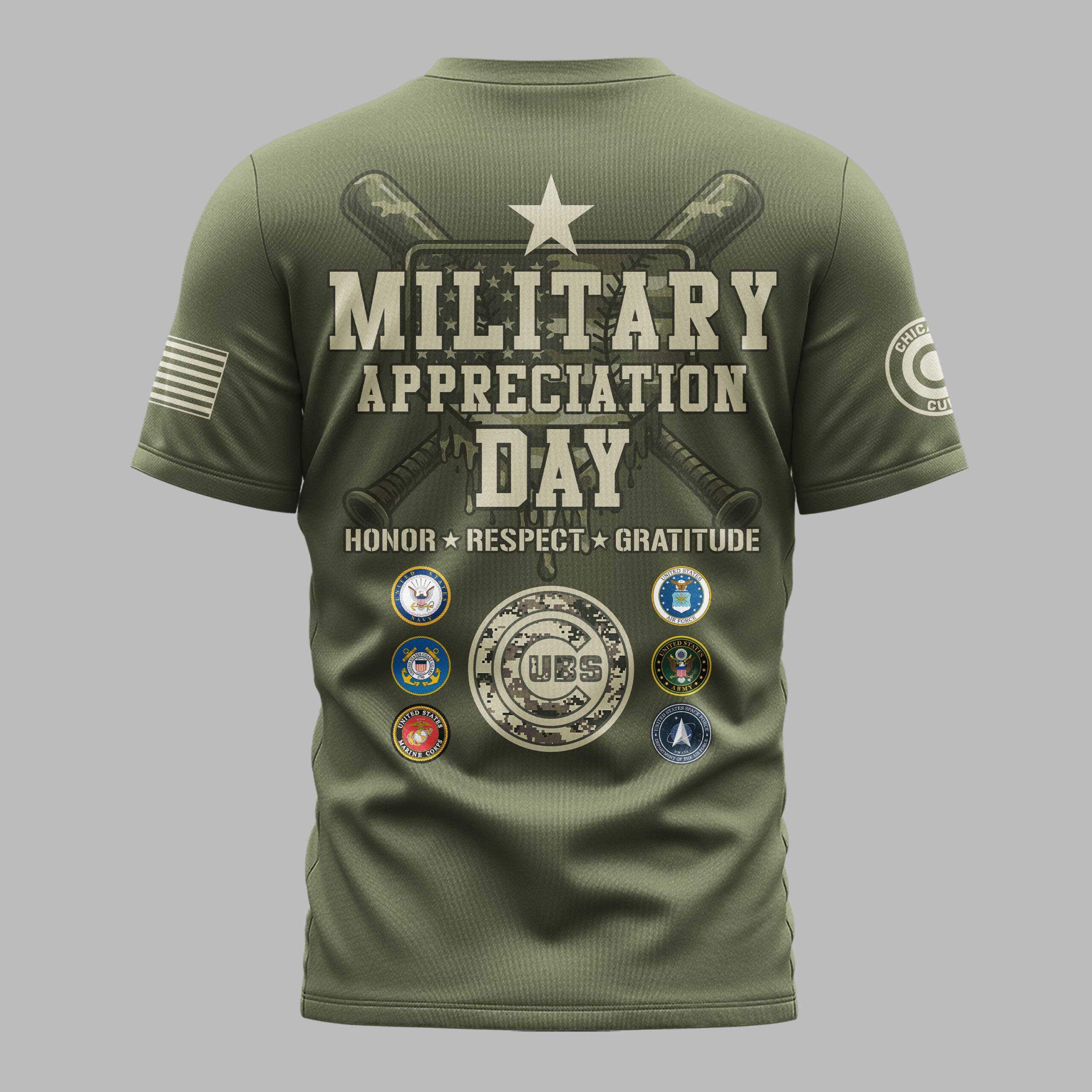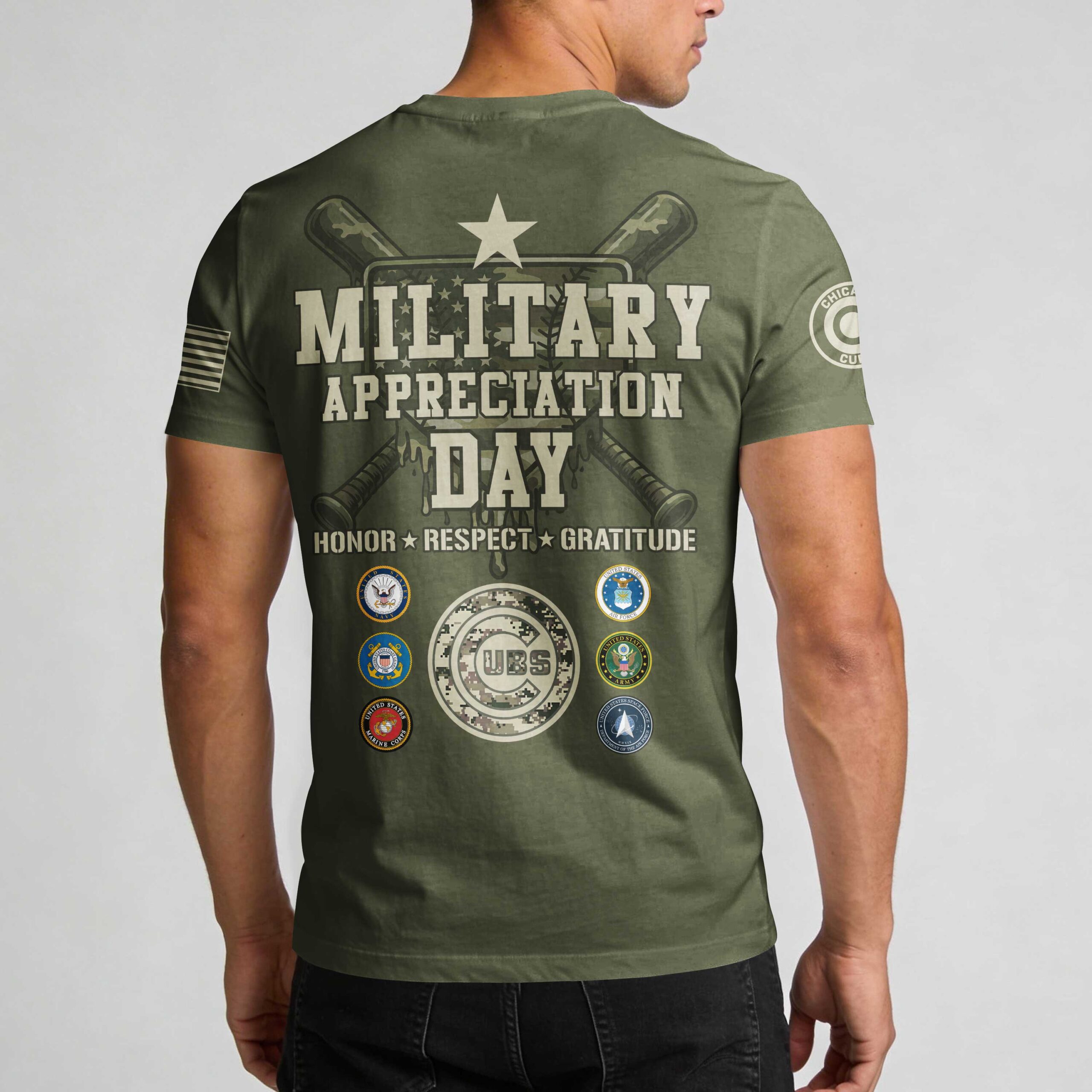 Show your unwavering loyalty to both the Chicago Cubs and our nation’s heroes with this distinctive Military Appreciation Day tee. This shirt powerfully blends the excitement of baseball with heartfelt gratitude for the brave men and women of the U.S. Armed Forces, making it a must-have for any proud fan. The front proudly displays CHICAGO CUBS in a striking camouflage pattern, complemented by an American flag patch on the sleeve and the iconic Cubs logo. The back is a true tribute, featuring MILITARY APPRECIATION DAY prominently, flanked by crossed baseball bats and a proud star. Below, HONOR * RESPECT * GRATITUDE is encircled by the emblems of all six military branches and a special Cubs camouflage emblem. Perfect for game days at Wrigley Field, patriotic holidays, or simply everyday wear to express your combined passion for baseball and country. Wear it with pride to show your support for the Cubs and honor the sacrifices of our service members.