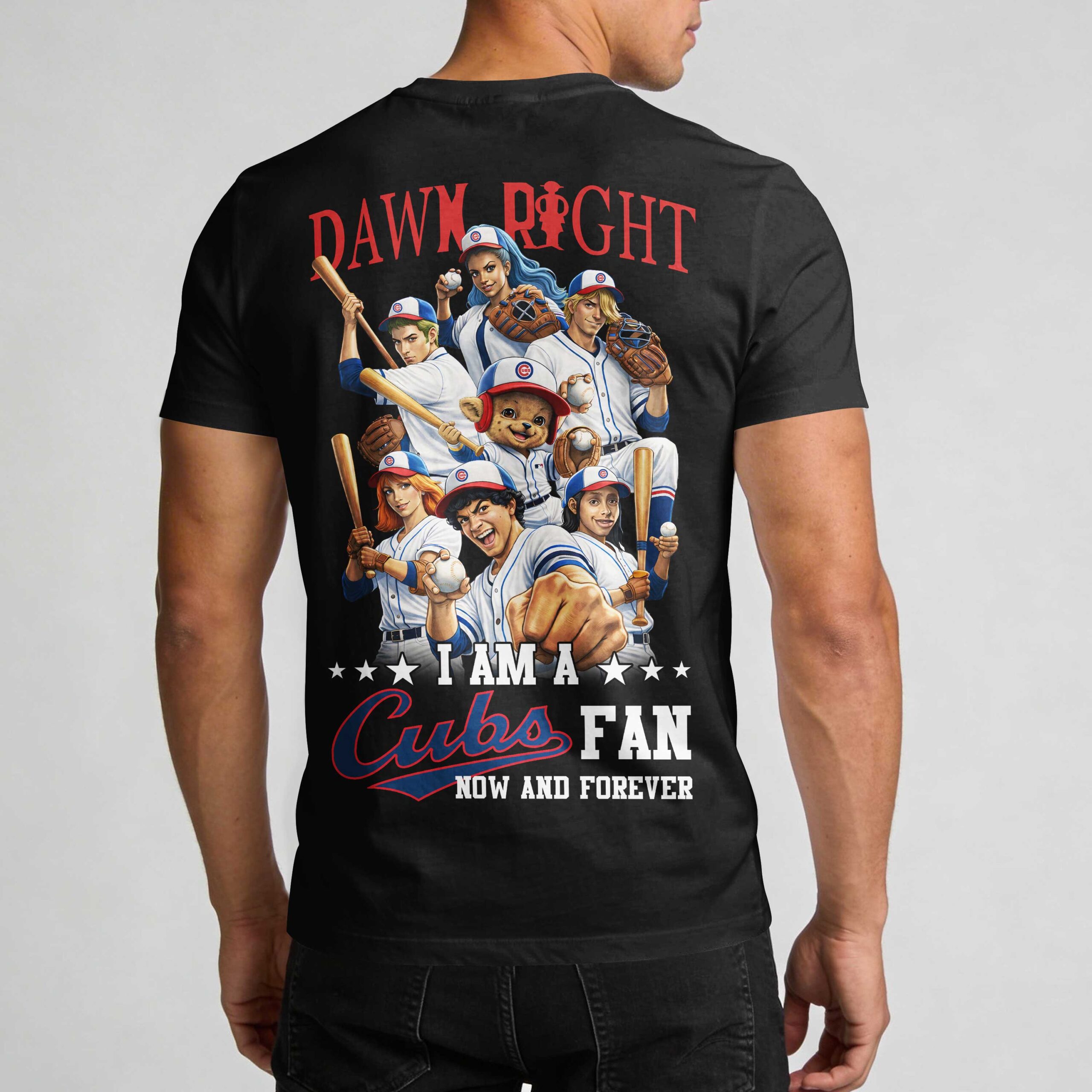Show your unwavering loyalty with this spirited Chicago Cubs fan shirt! Ideal for game days or watching from home, this tee boldly captures the essence of a devoted Cubbies supporter, making a clear statement about your lasting team pride. The front displays CHICAGO CUBS in red and white, alongside a skull and crossbones graphic with a Cubs-themed cap. The back features a detailed illustration of diverse fans and players in classic Cubs gear. Above them, DAWN RIGHT (or DAMN RIGHT) in red leads to I AM A ⭐⭐⭐ CUBS FAN NOW AND FOREVER, proclaiming your dedication. Perfect for cheering at Wrigley Field, watch parties, or casual wear. This shirt is a badge of honor for anyone who lives and breathes Chicago Cubs baseball. Grab yours and let your team spirit shine!