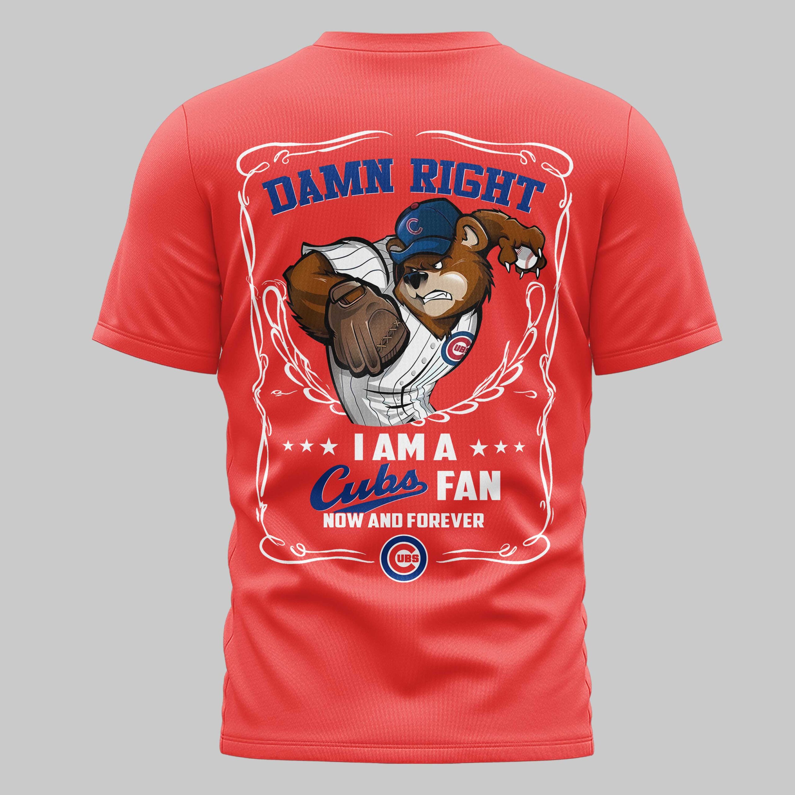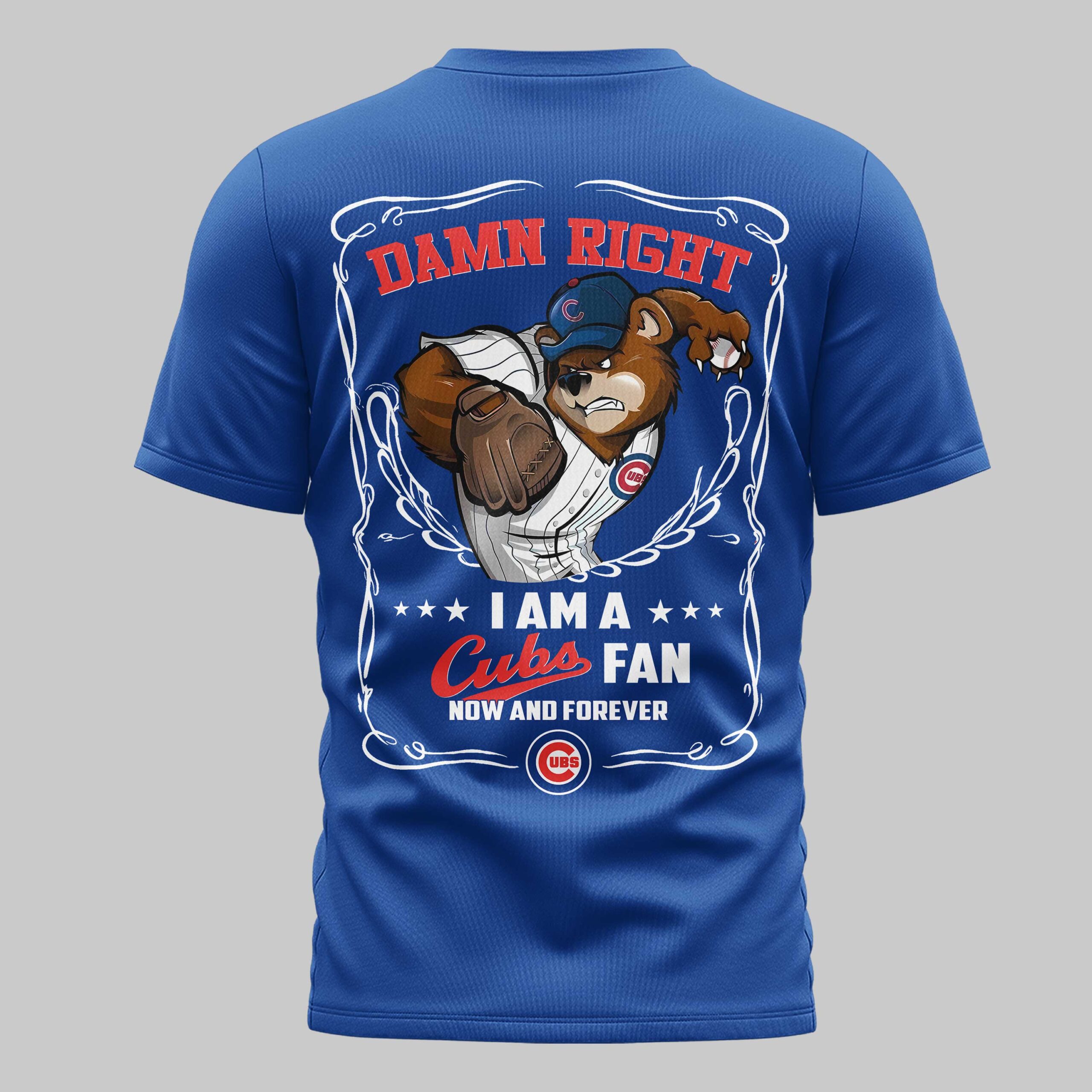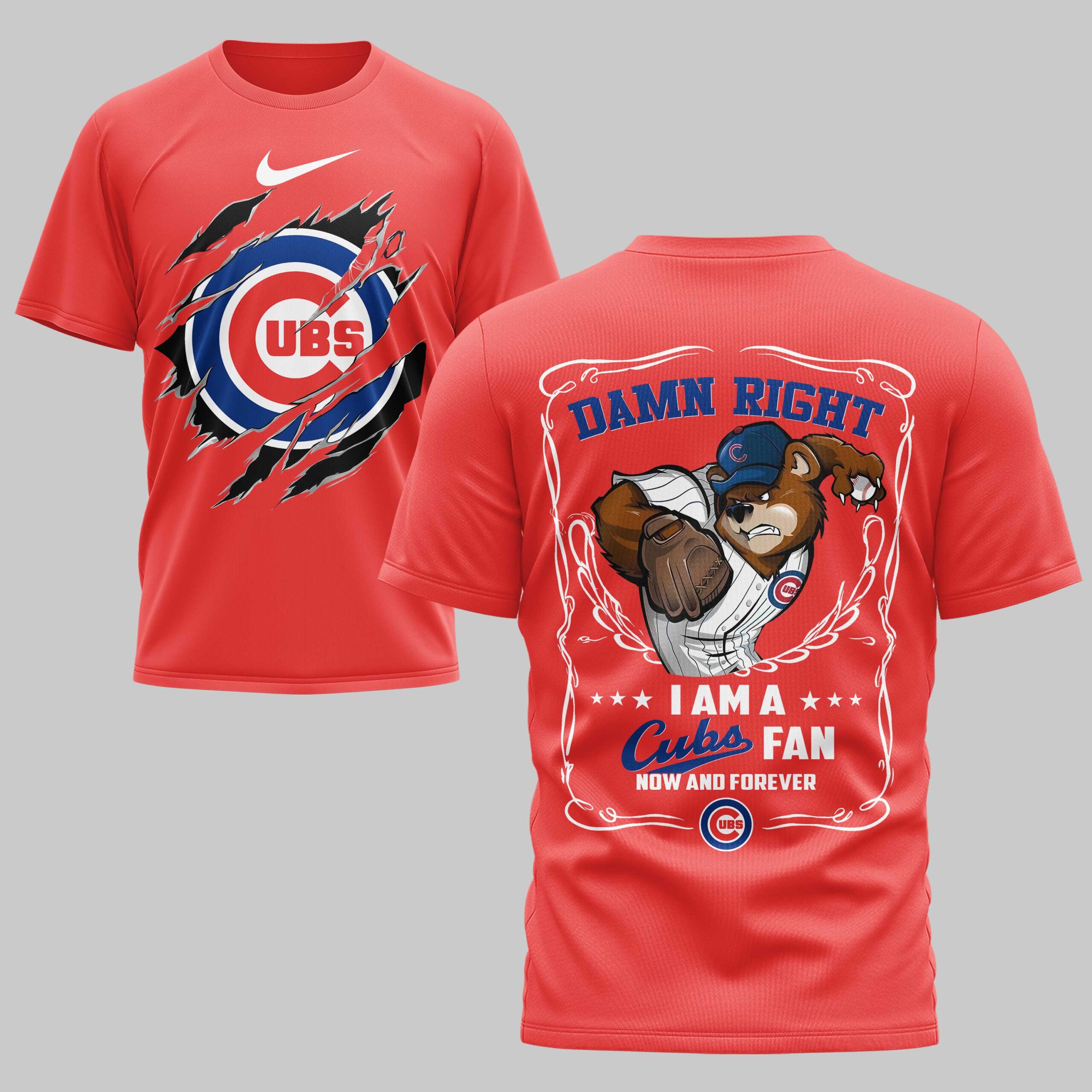 Unleash your unwavering passion for the Chicago Cubs with this electrifying fan tee. It’s more than just apparel; it’s a declaration of your lifelong loyalty to the team that runs deep in your veins. The front features a fierce ripped effect, tearing through the blue to reveal the classic red and white Chicago Cubs UBS logo. On the back, an assertive bear mascot in a Cubs cap and mitt clutches a ball under the emphatic DAMN RIGHT declaration. Framed by a stylish border, the message continues: I AM A ★★★ Cubs FAN NOW AND FOREVER, with an additional Cubs logo, leaving no doubt about your allegiance. Perfect for chanting from the stands at Wrigley, gathering with fellow fans, or carrying your team spirit into everyday life, this shirt is your ultimate game day gear. Stand out, roar proud, and let everyone know where your heart lies!