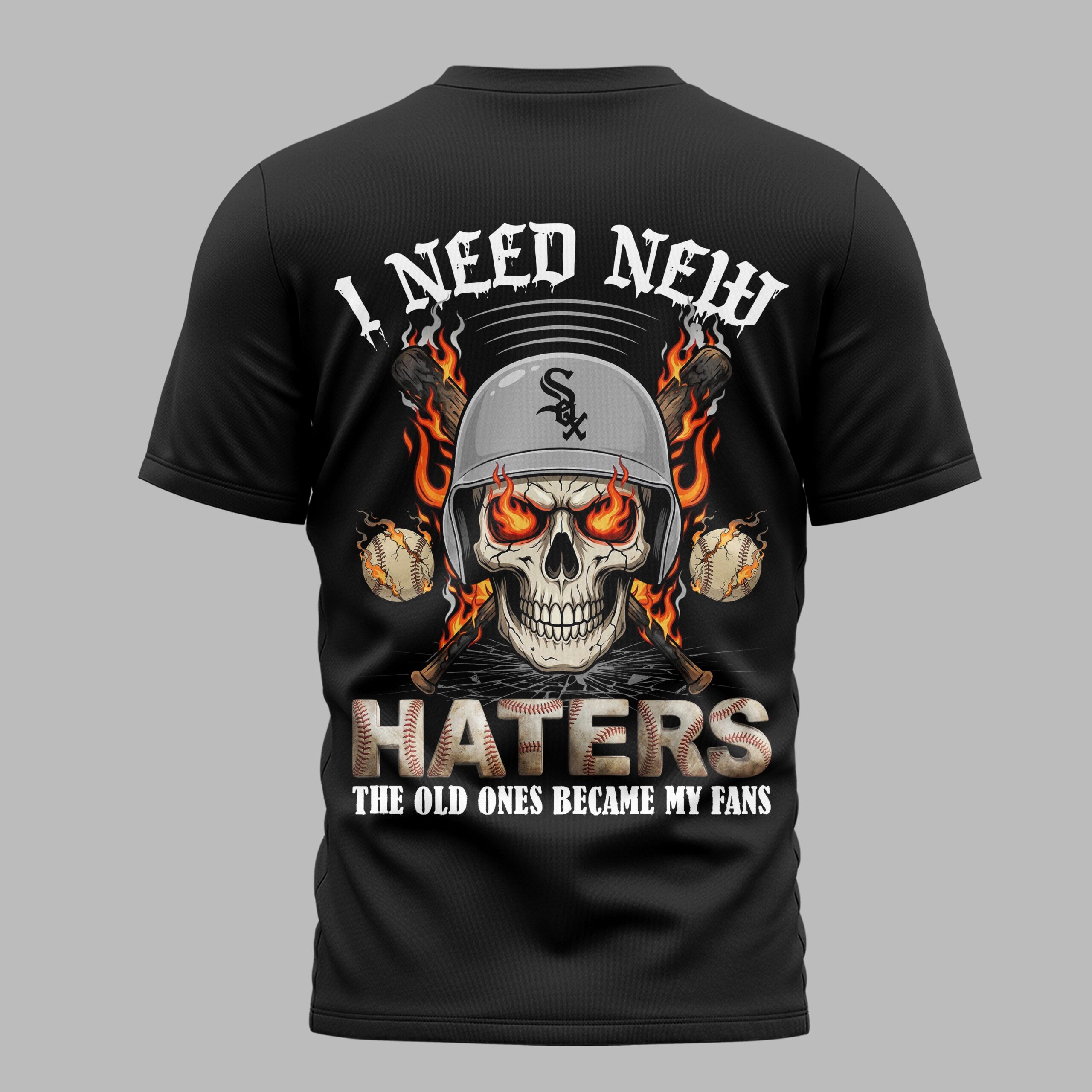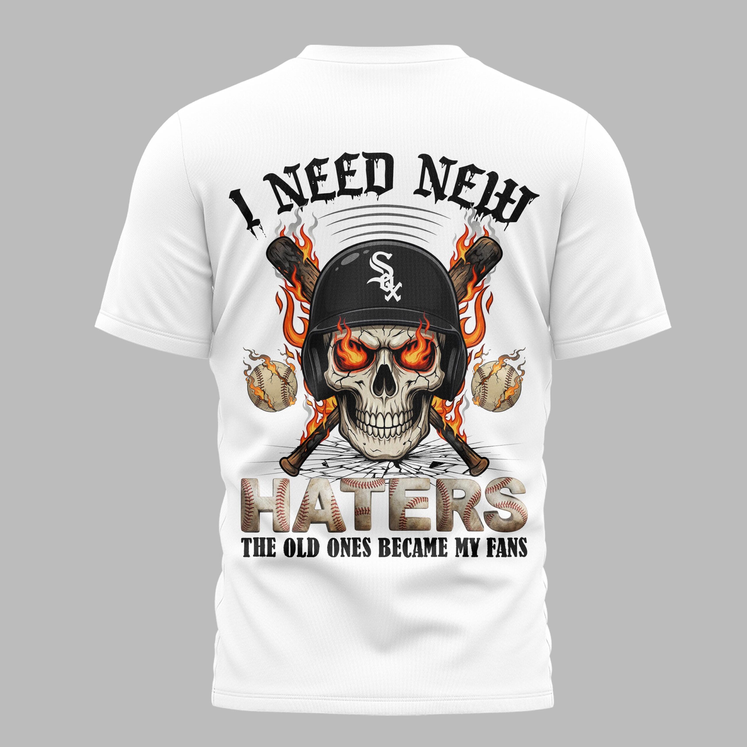 Ignite your passion for the White Sox with this bold fan tee! Designed for the ultimate supporter, it blends fierce team loyalty with a confident attitude. This shirt powerfully declares your Chicago baseball spirit, making a statement. The front proudly displays WHITE SOX in a distinctive, distressed font, framed by baseball stitching and the classic Sox logo. The back explodes with a fiery graphic: a skull in a White Sox helmet, surrounded by flaming bats and blazing baseballs. Below, the defiant slogan I NEED NEW HATERS THE OLD ONES BECAME MY FANS delivers an unforgettable message. Wear this dynamic tee to rally at Guaranteed Rate Field, dominate your next watch party, or simply showcase formidable team spirit daily. It’s essential gear for any White Sox supporter ready to celebrate victories and stand strong.
