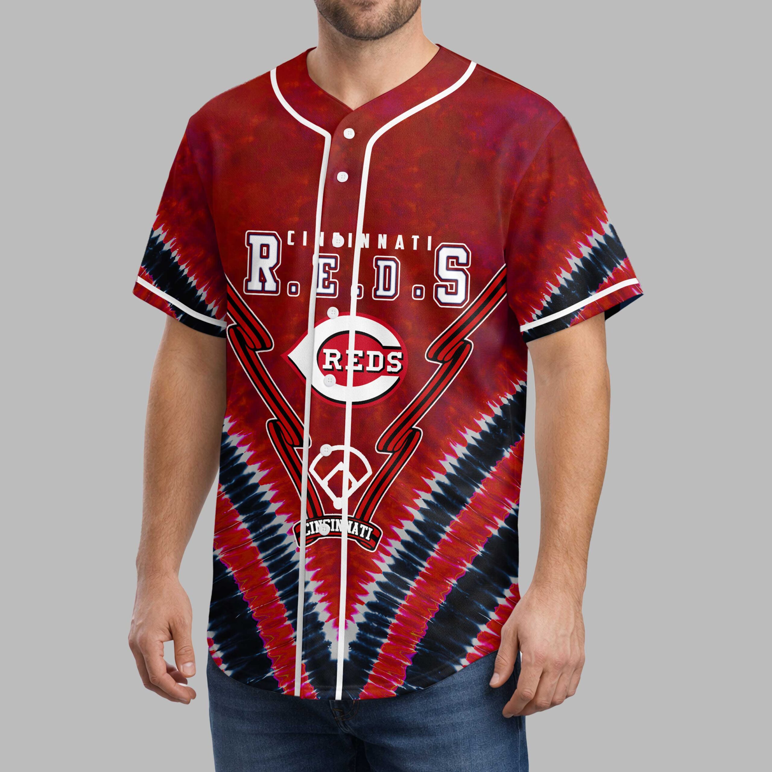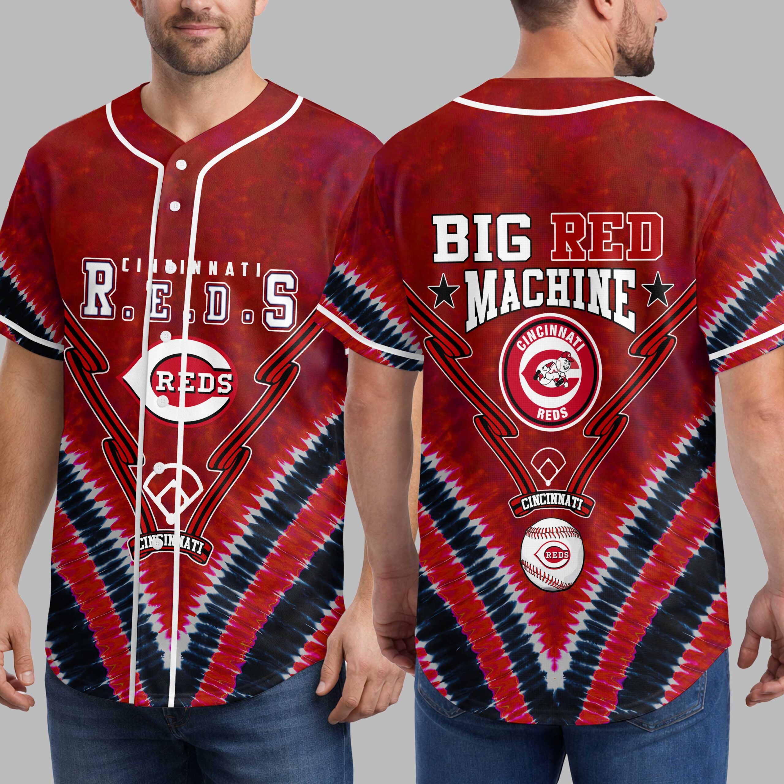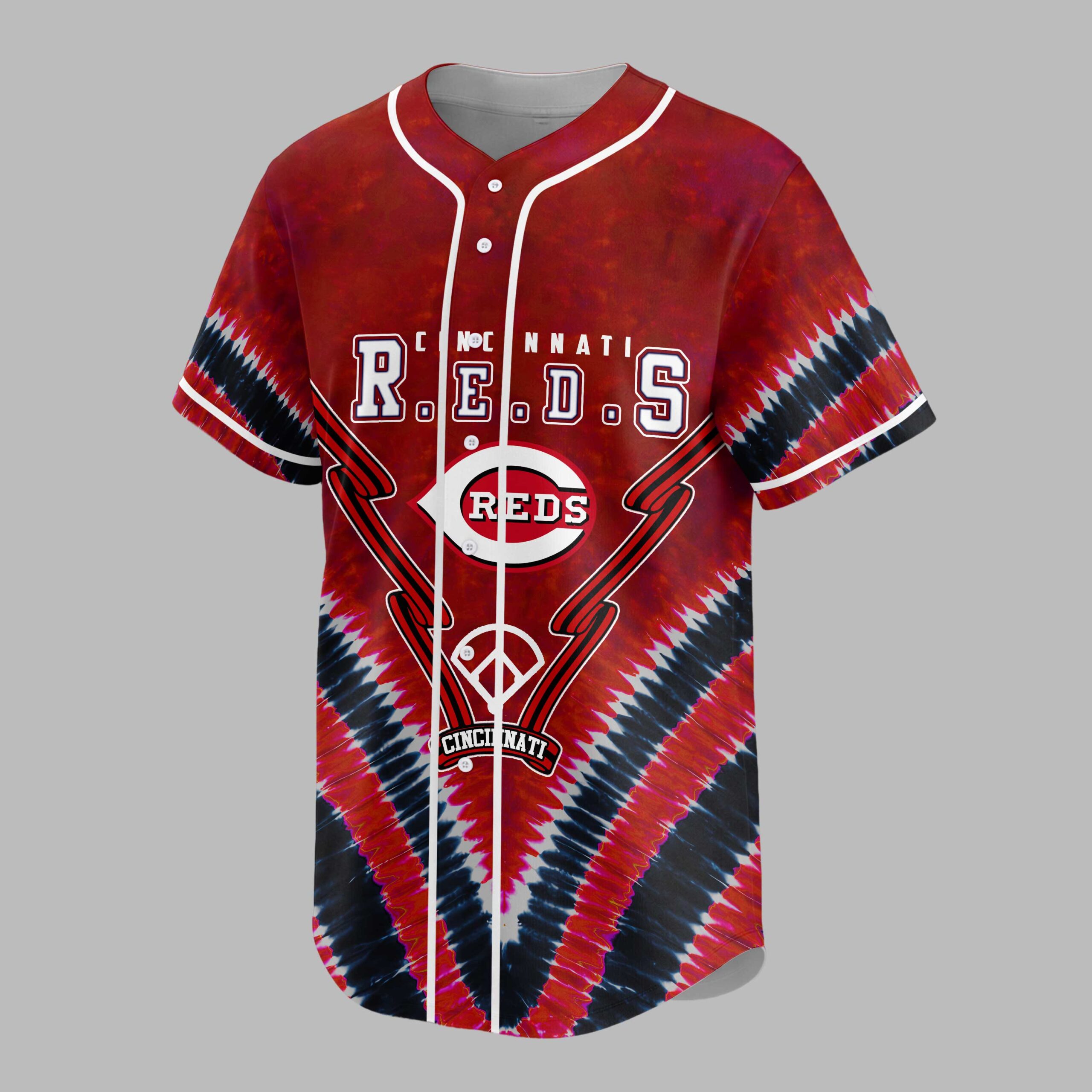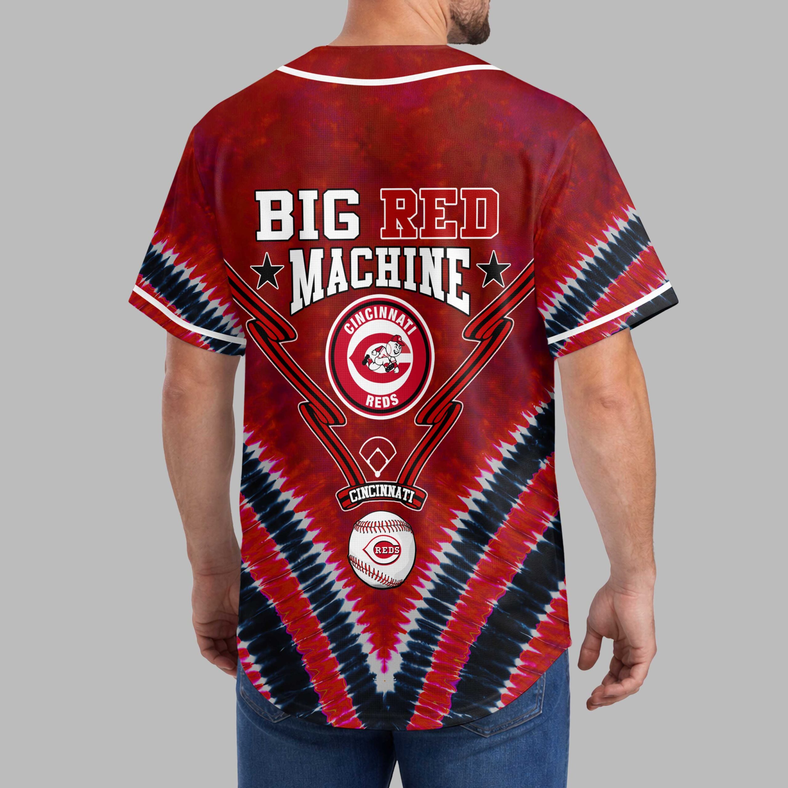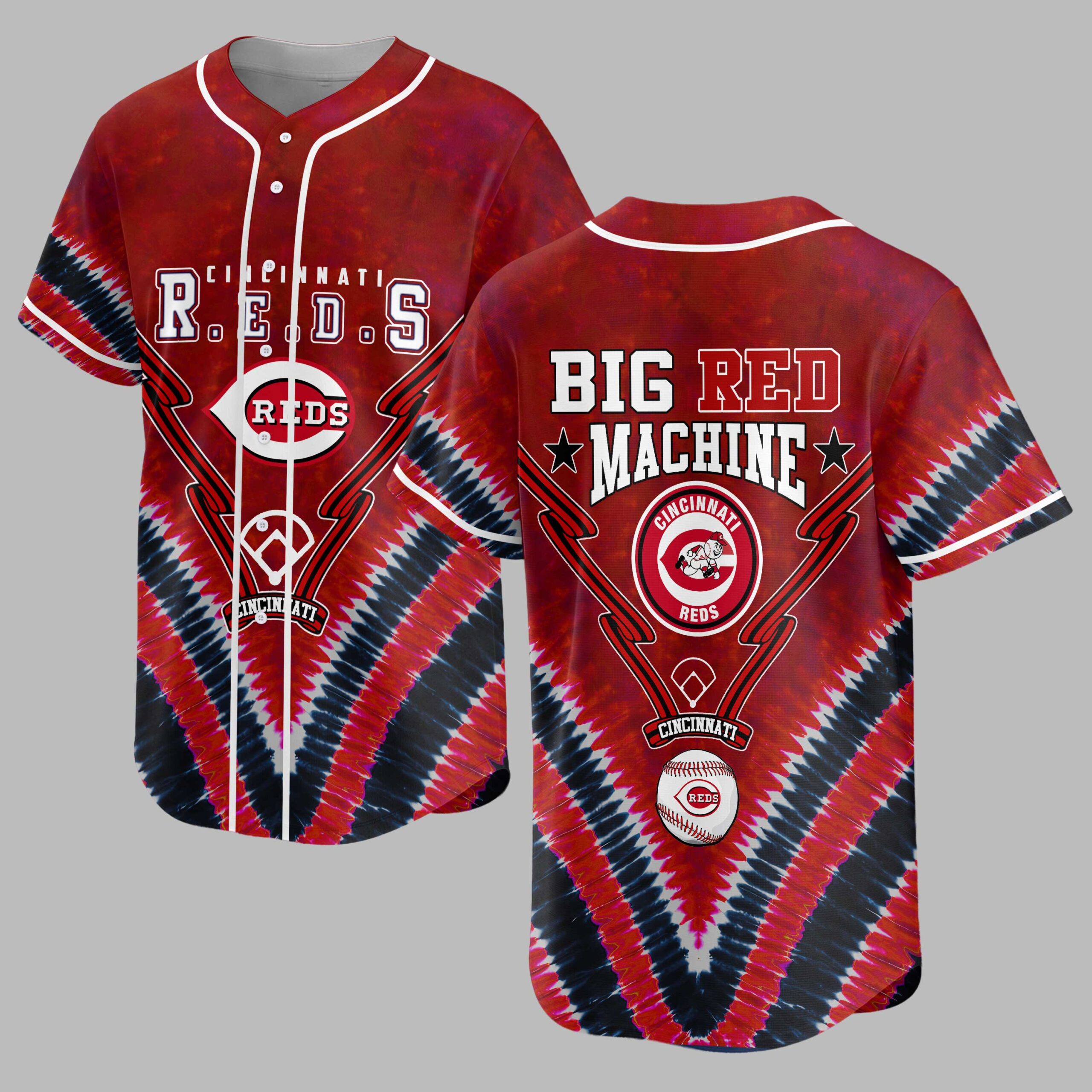 Hit a style home run with this vibrant Cincinnati Reds baseball jersey, an essential for any devoted fan. Show unwavering support for the Big Red Machine with a unique design that truly stands out. This jersey celebrates the enduring spirit and rich history of Cincinnati’s beloved team. The front proudly displays CINCINNATI R.E.D.S above the iconic REDS logo, set against a dynamic red, black, and white tie-dye backdrop. The back boldly features BIG RED MACHINE with stars, accented by a baseball diamond, crossed bats, and a detailed baseball with the Reds logo, crafting a spirited look. Perfect for cheering at Great American Ball Park, hosting watch parties, or simply showcasing your Cincinnati pride. This jersey is ideal for game days, casual outings, or any occasion to celebrate your favorite team with a fun, retro-inspired feel.