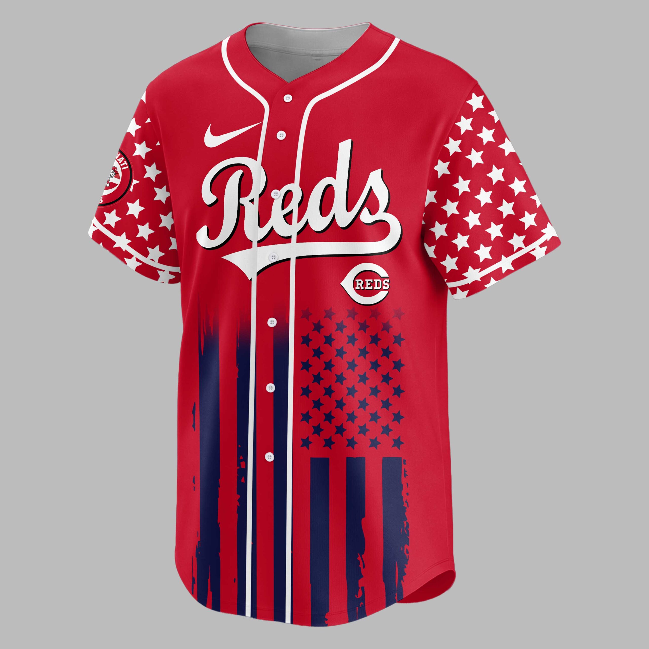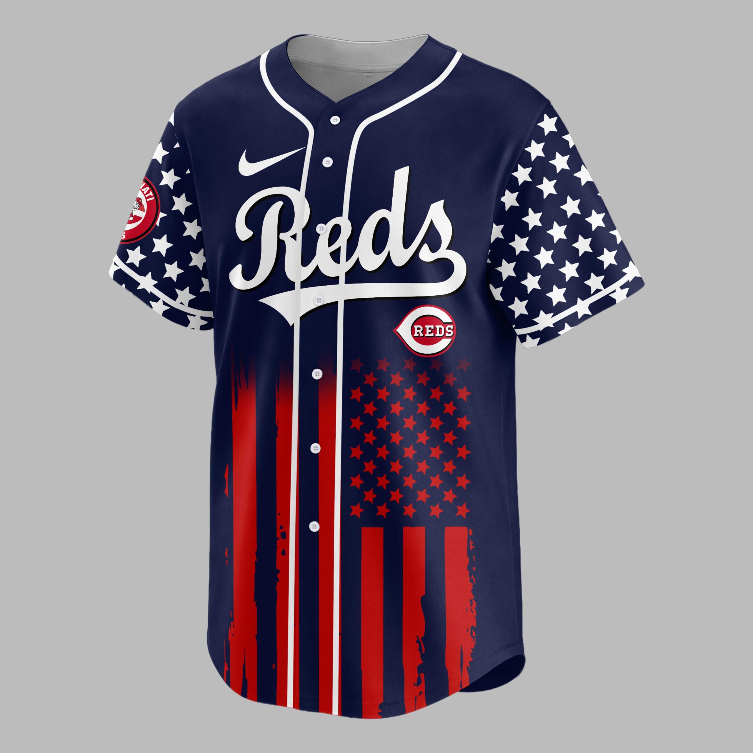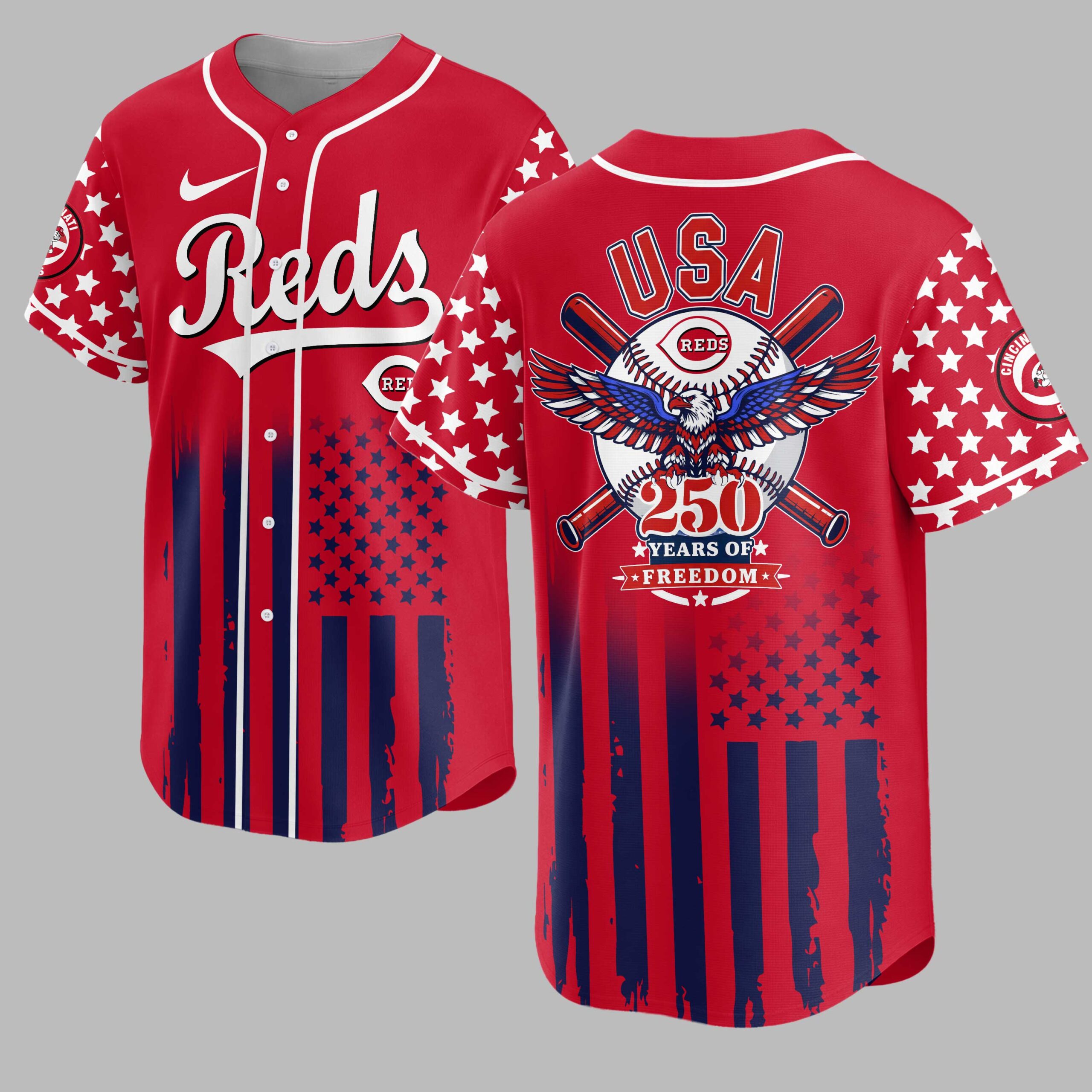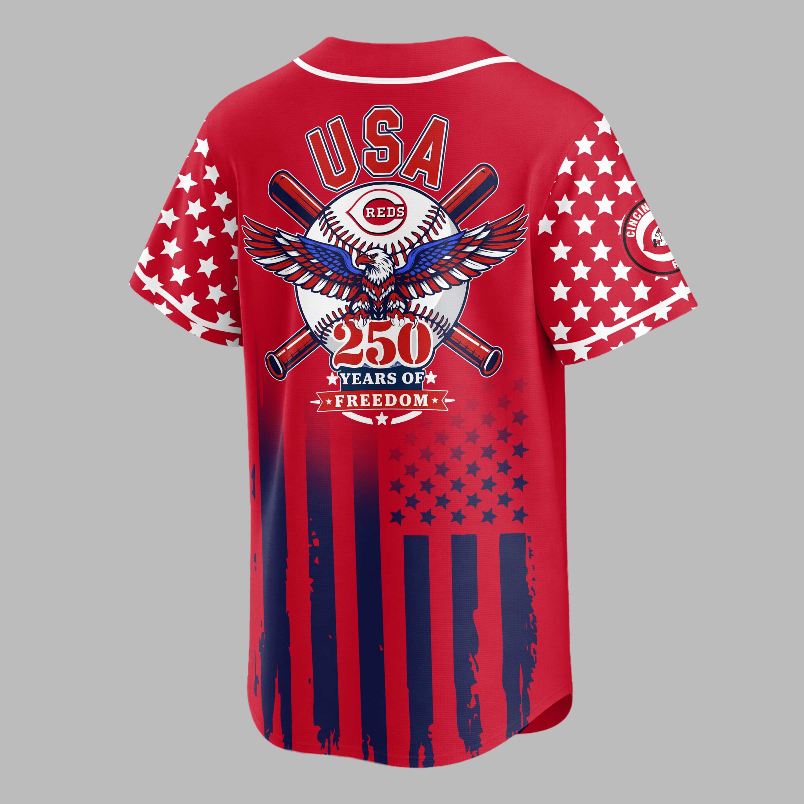 Show your unwavering support for the Cincinnati Reds and your American pride with this dynamic patriotic baseball jersey! This eye-catching design celebrates both your favorite team and 250 years of cherished freedom, making it a powerful statement for fans of baseball and country. The front features the iconic Reds script in bold white, set against a navy blue backdrop with striking white stars across the sleeves. Below, a distressed American flag design with vibrant red stripes commands attention. The back proudly displays USA above a detailed graphic of a baseball, crossed bats, and a majestic red, white, and blue eagle, all underlined by 250 YEARS OF FREEDOM. Perfect for game days, Fourth of July celebrations, Memorial Day gatherings, or any occasion to display your spirit. This jersey is ideal for showing your loyalty to the Reds and honoring the enduring legacy of American liberty.