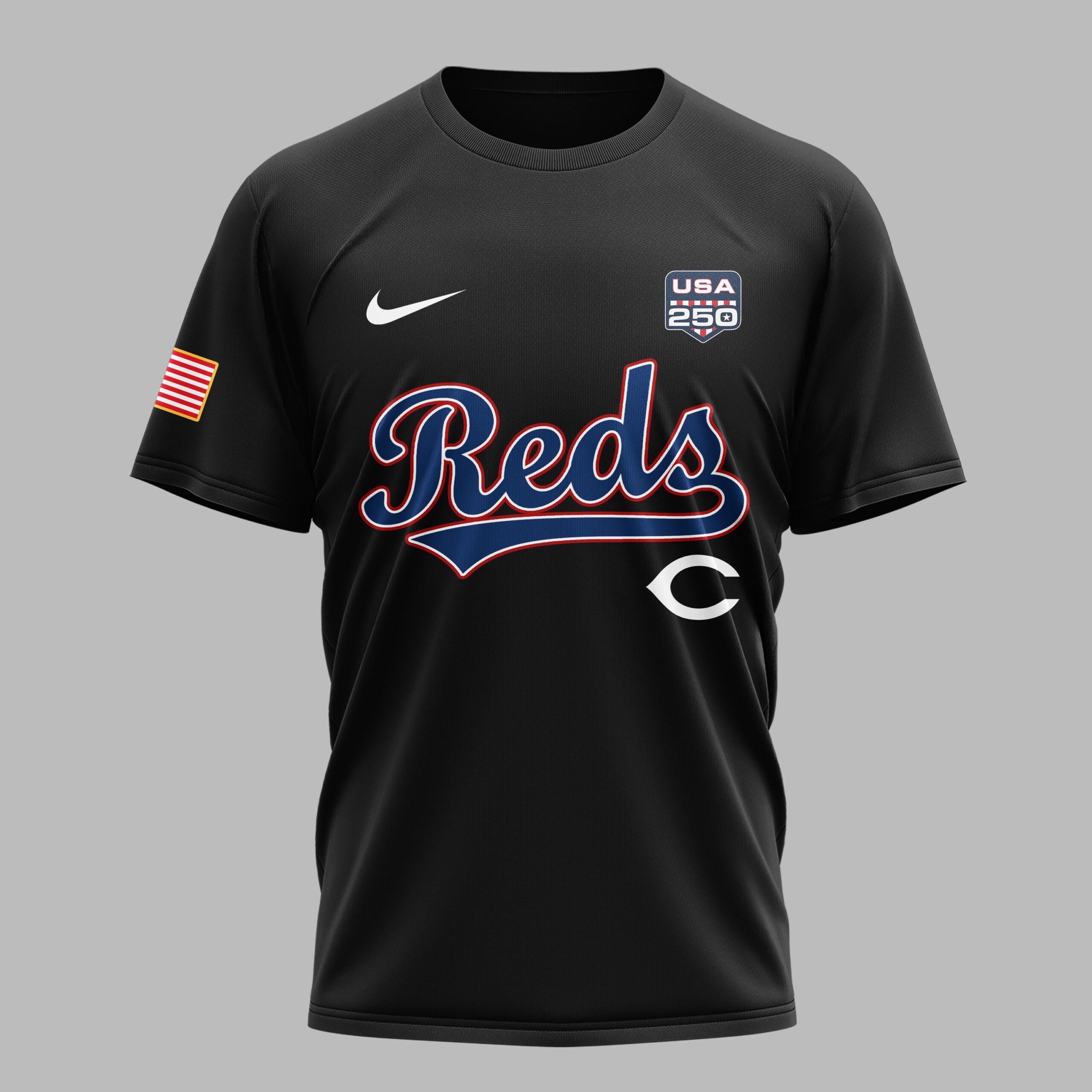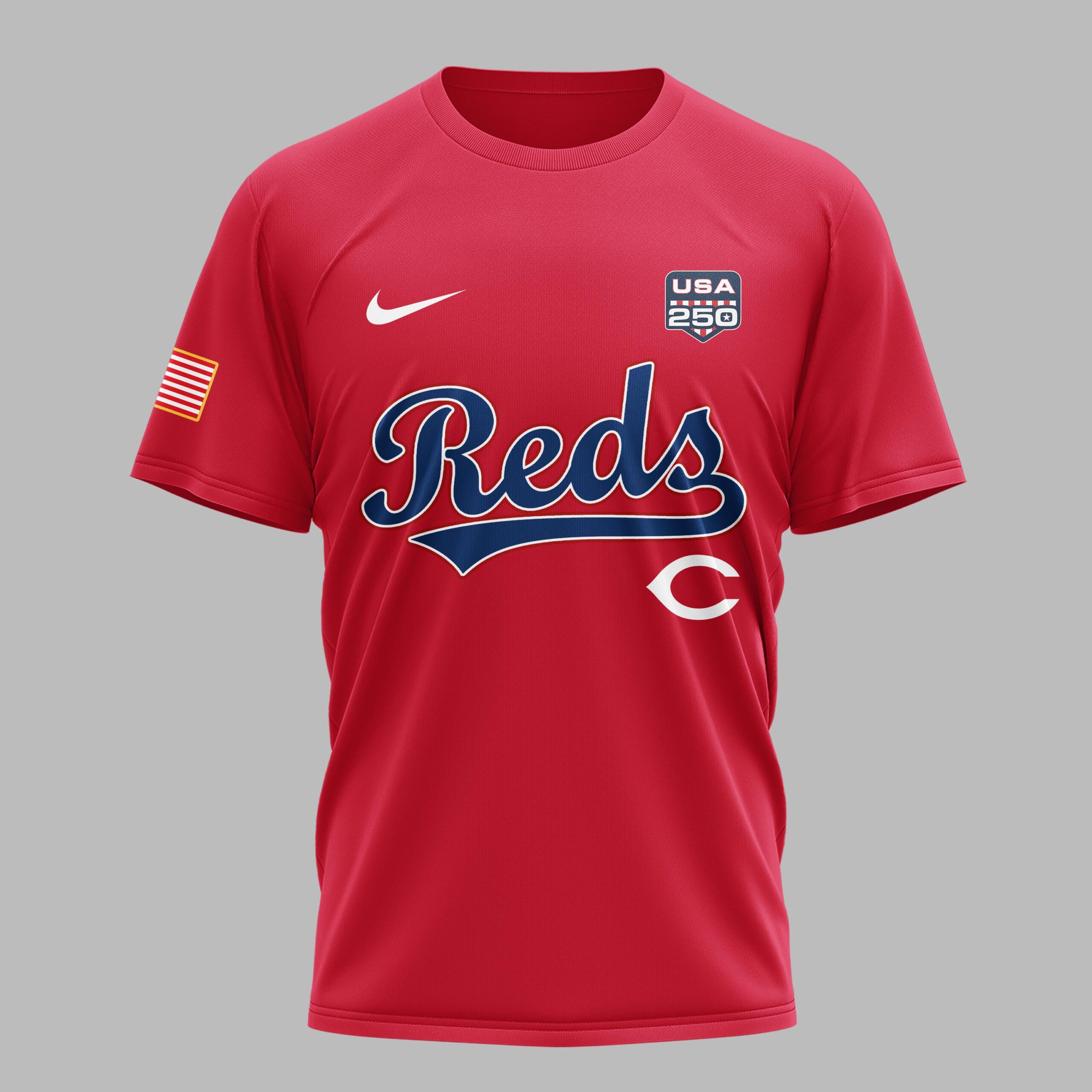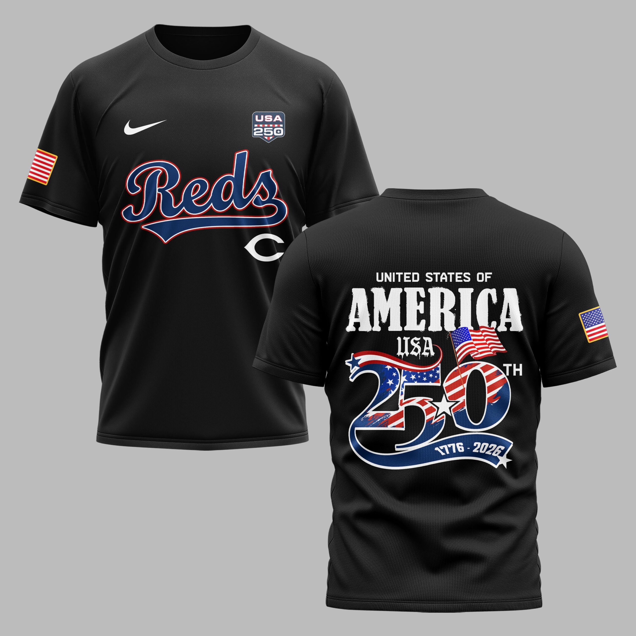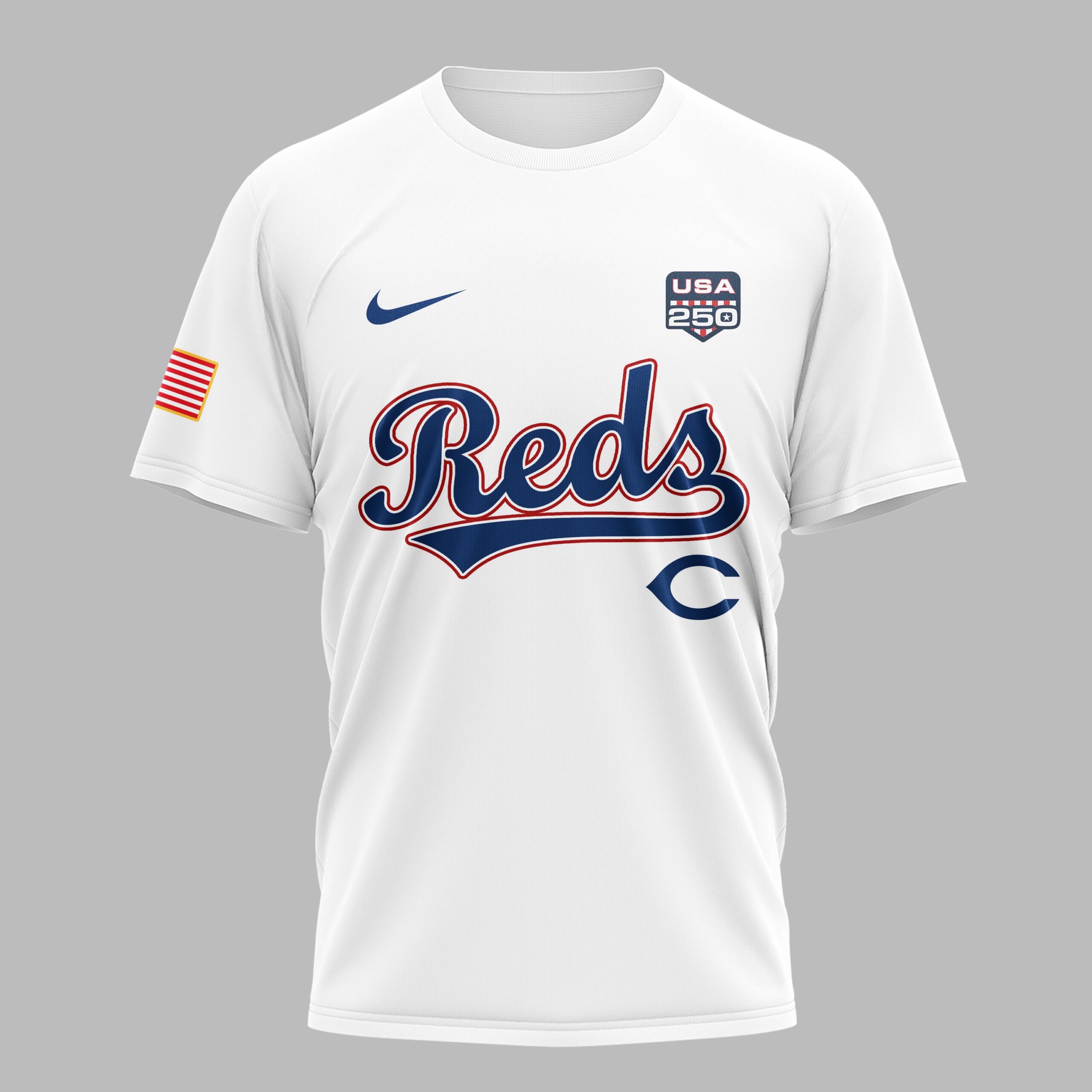 Celebrate two and a half centuries of American freedom while cheering on your favorite team. This t-shirt is the ultimate way for Cincinnati fans to showcase their national pride alongside their deep-rooted baseball loyalty. The front features the iconic Reds script and classic C logo, complemented by a special USA 250th commemorative badge. The back displays a bold United States of America graphic with a star-spangled 250 and the historic 1776-2026 dates. American flag patches on both sleeves add a final patriotic touch to the vibrant red design. Wear it to the ballpark for a summer series, at Independence Day celebrations, or as everyday fan gear. It’s a standout piece for any supporter looking to honor the nation’s milestone anniversary with big-league style.