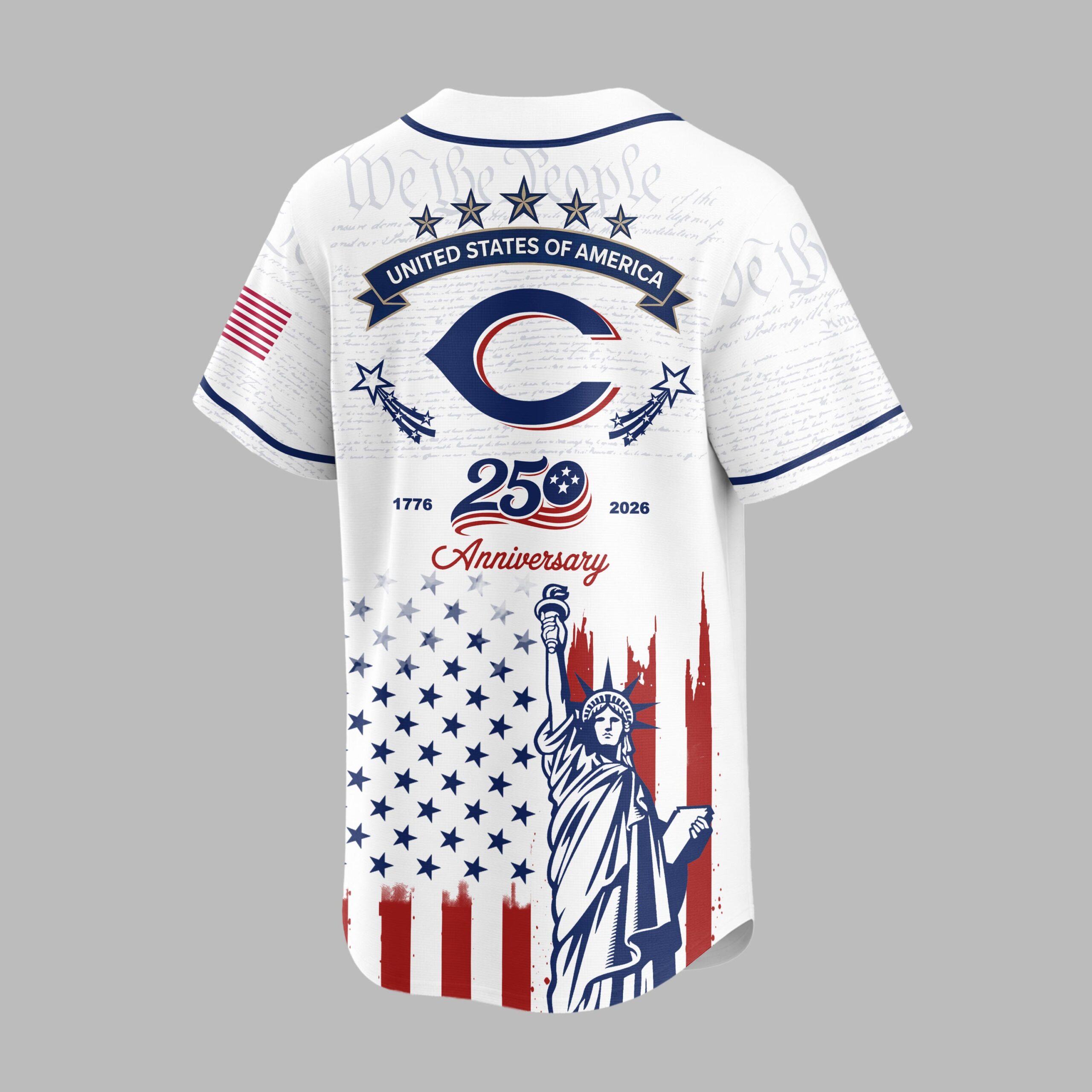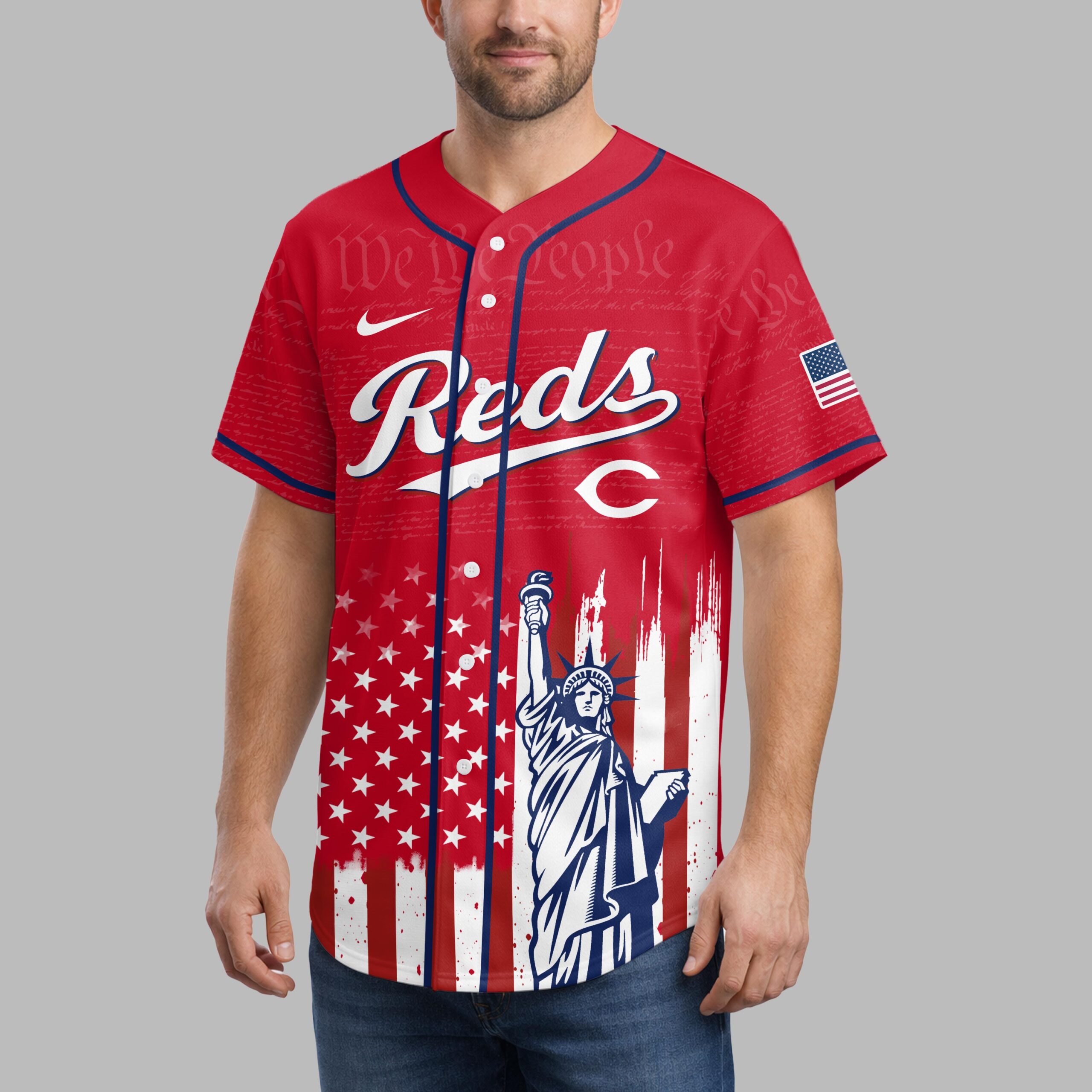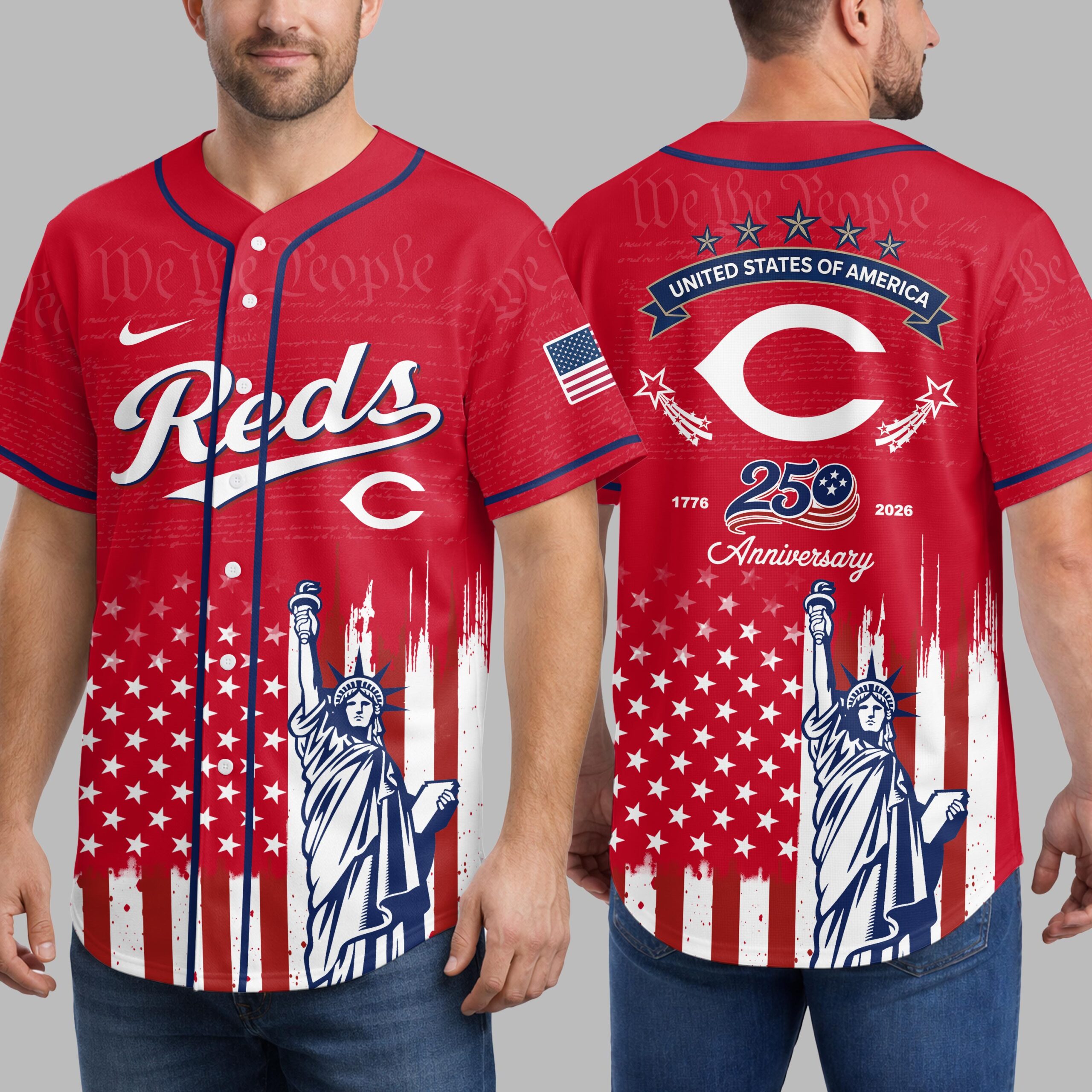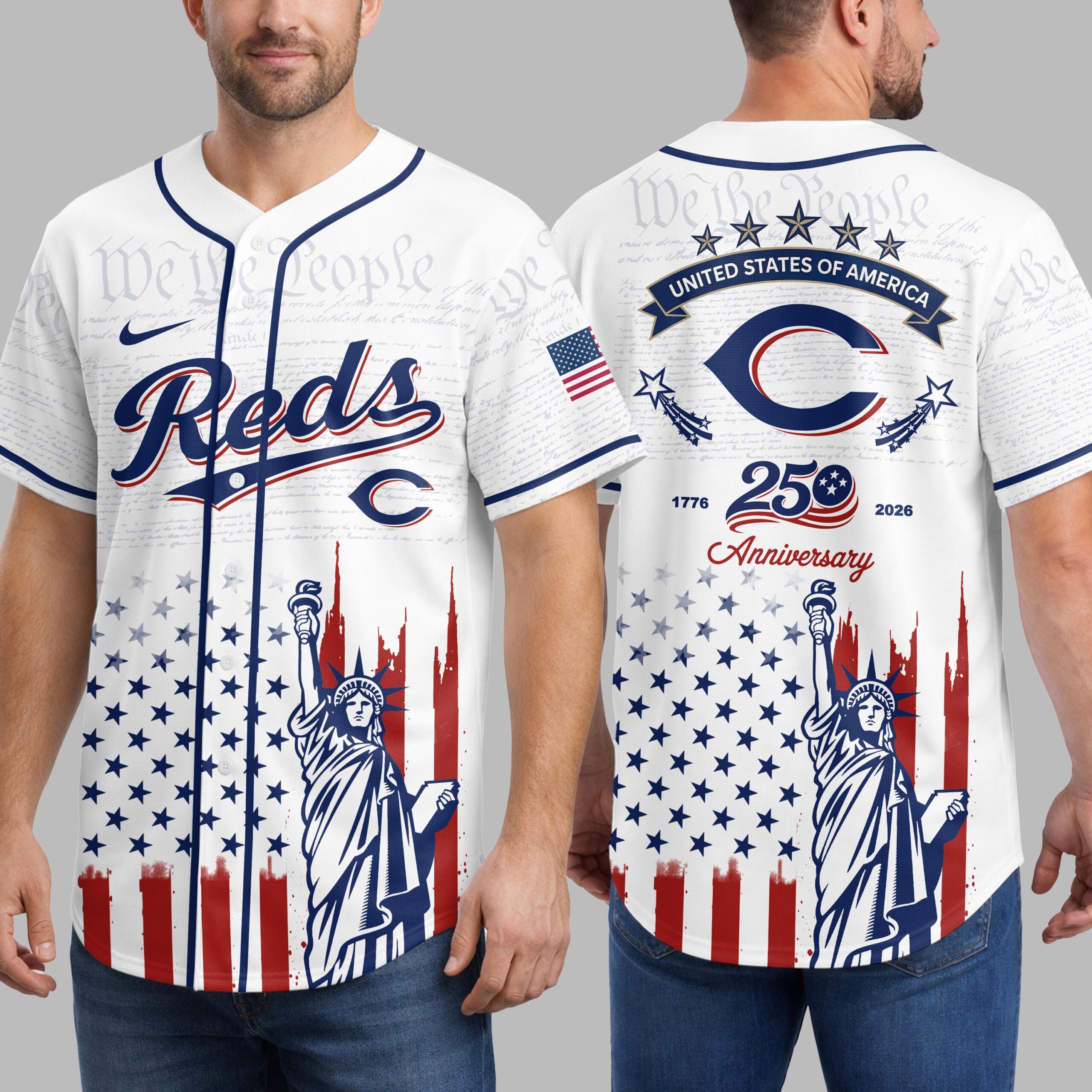 Celebrate both your Cincinnati Reds loyalty and America’s enduring spirit with this commemorative 250th Anniversary baseball jersey. It’s the perfect blend of national heritage and team pride, a bold patriotic statement for any fan. The front proudly showcases the classic Reds script and C logo, subtly set against We the People text. Below, the Statue of Liberty rises from a distressed flag design of stars and bold red stripes. The back features an American flag, STATES OF AMERICA banner, the C logo, and a 250 Anniversary inscription for 1776-2026. Ideal for spirited game days, festive Fourth of July celebrations, or any patriotic gathering. This jersey lets you proudly display your dual devotion, whether at the ballpark or special events. Wear it to salute your team and country in unmatched style.
