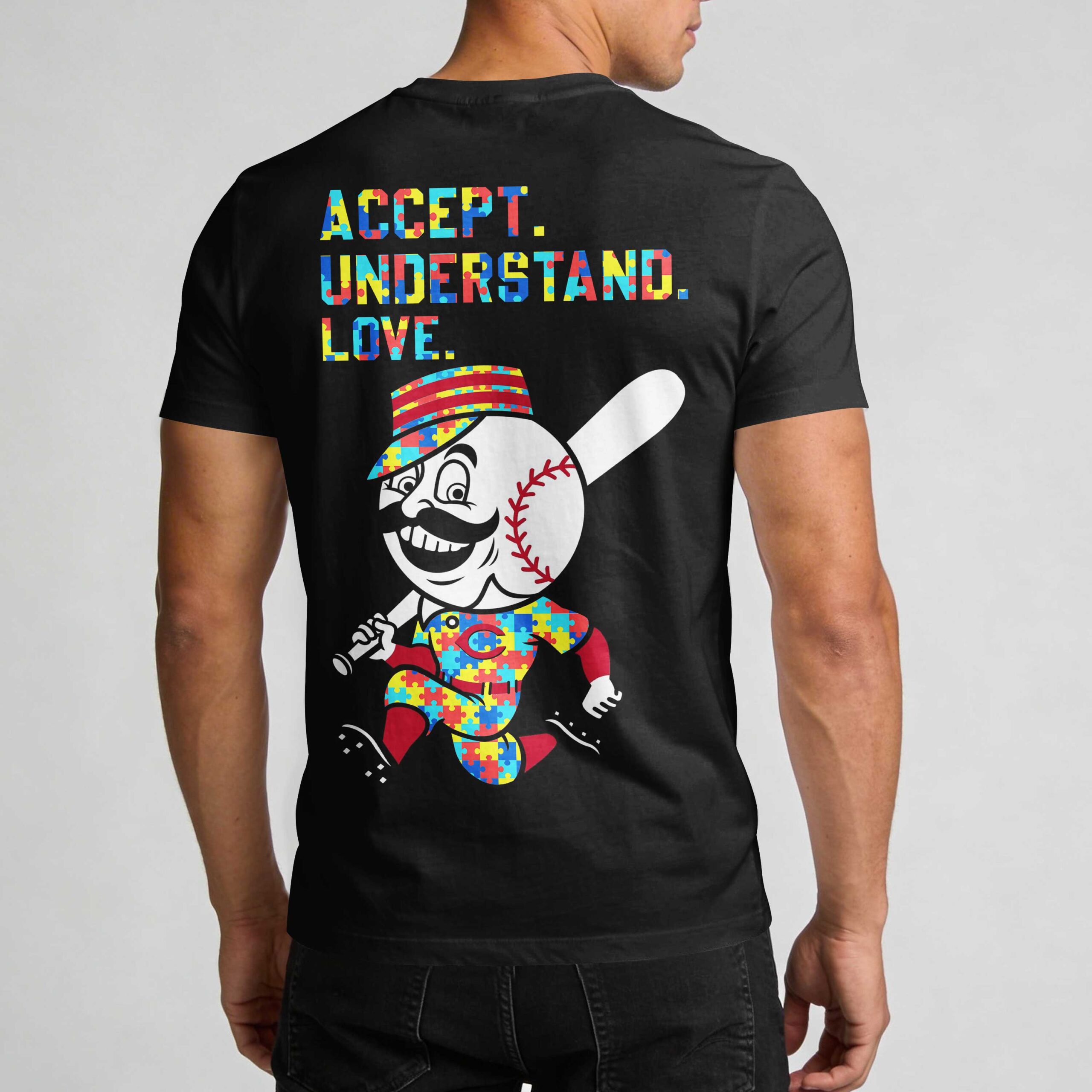 Display your Cincinnati Reds pride with this vibrant fan t-shirt, celebrating your team and a powerful message of acceptance. This unique design lets you support the Reds while promoting unity, making it a meaningful addition to any fan’s collection. The front features CINCINNATI REDS and the classic C logo, all in a colorful puzzle piece pattern. A matching Nike swoosh and an infinity symbol complete the look. The back showcases the beloved Mr. Redlegs mascot, also in the vibrant puzzle design, alongside the impactful words: ACCEPT. UNDERSTAND. LOVE. Perfect for game days, ballpark visits, or daily wear, this shirt proudly displays your Reds loyalty and support for an inclusive community. It’s a powerful statement of passion for every Cincinnati Reds enthusiast.