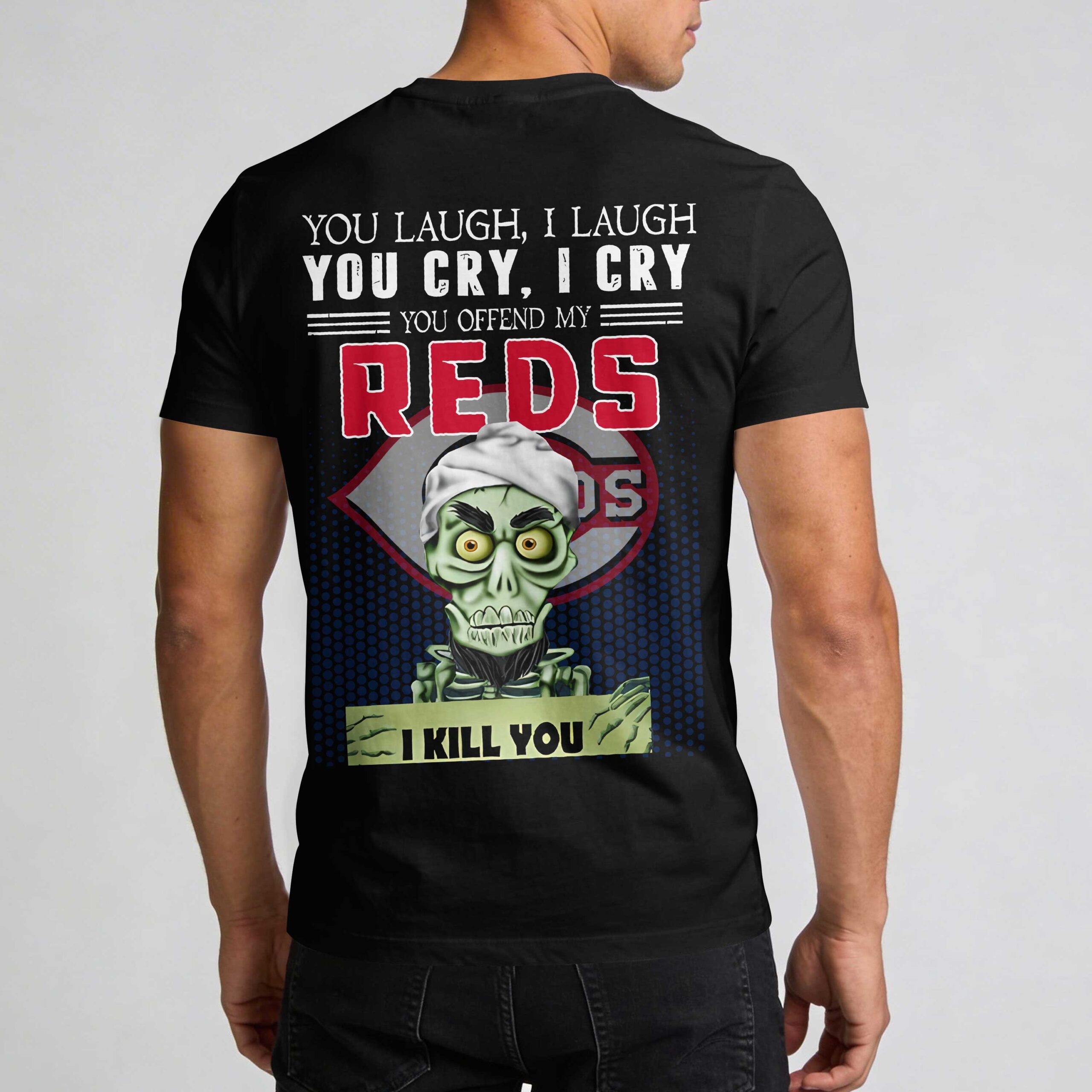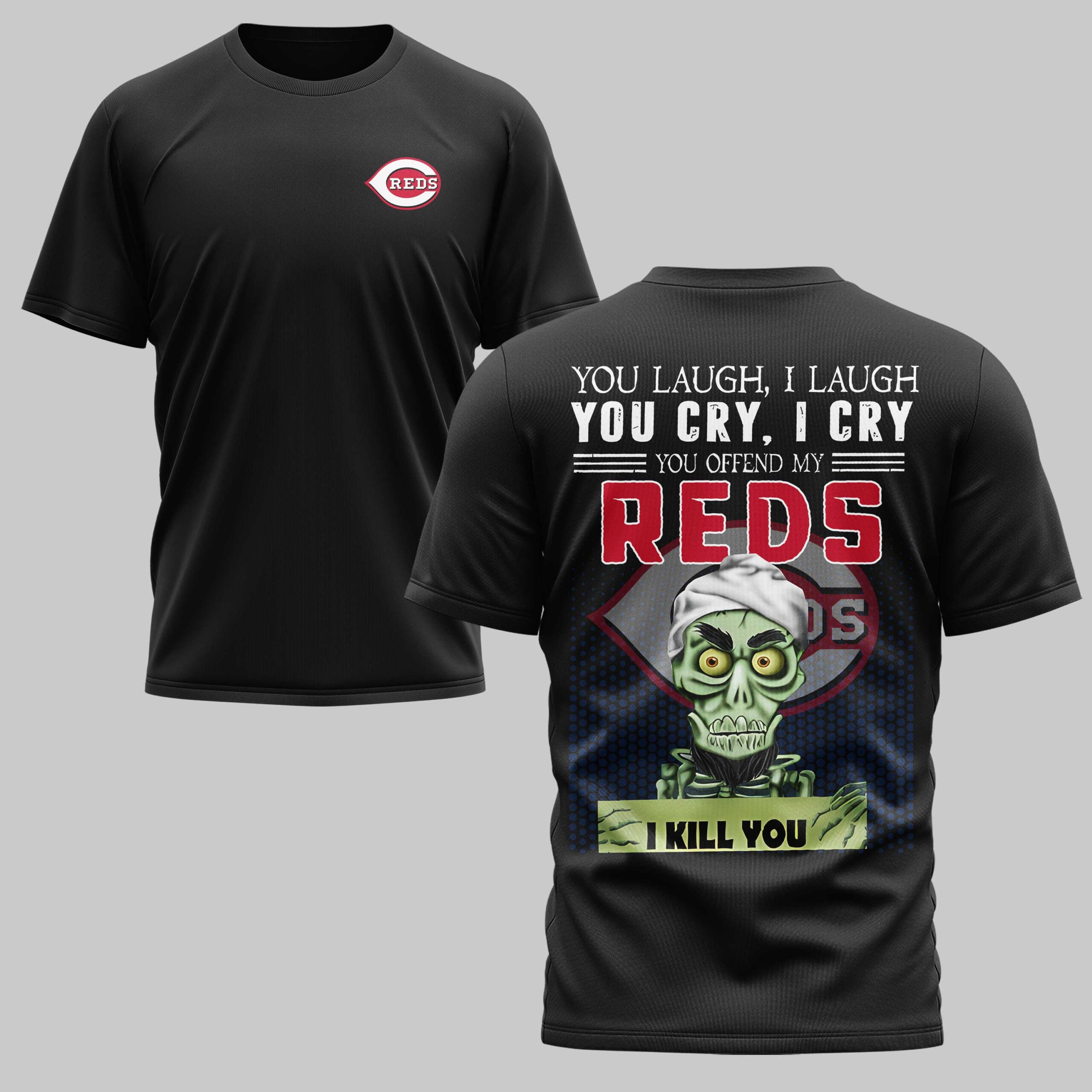 Unleash your ultimate fan passion with this bold Cincinnati Reds You Offend My Reds, I Kill You T-shirt! Perfect for the supporter who lives and breathes Reds baseball, this shirt declares your unwavering loyalty in an unforgettable way. It’s more than just apparel; it’s a statement of fierce devotion to your favorite team. The front features the classic Cincinnati Reds logo, subtly showcasing your team allegiance. The back, however, is where the real statement comes to life: a vibrant, menacing zombie character is prominently displayed with the powerful declaration, YOU LAUGH, I LAUGH / YOU CRY, I CRY / YOU OFFEND MY REDS / I KILL YOU. This eye-catching design, set against a dynamic background, ensures your message is loud and clear. Whether you’re at Great American Ball Park, a lively watch party, or just out and about, this shirt is ideal for game days, tailgates, or any occasion where you want to proudly represent the Reds. Make a bold impression and let everyone know exactly where your baseball loyalties lie.