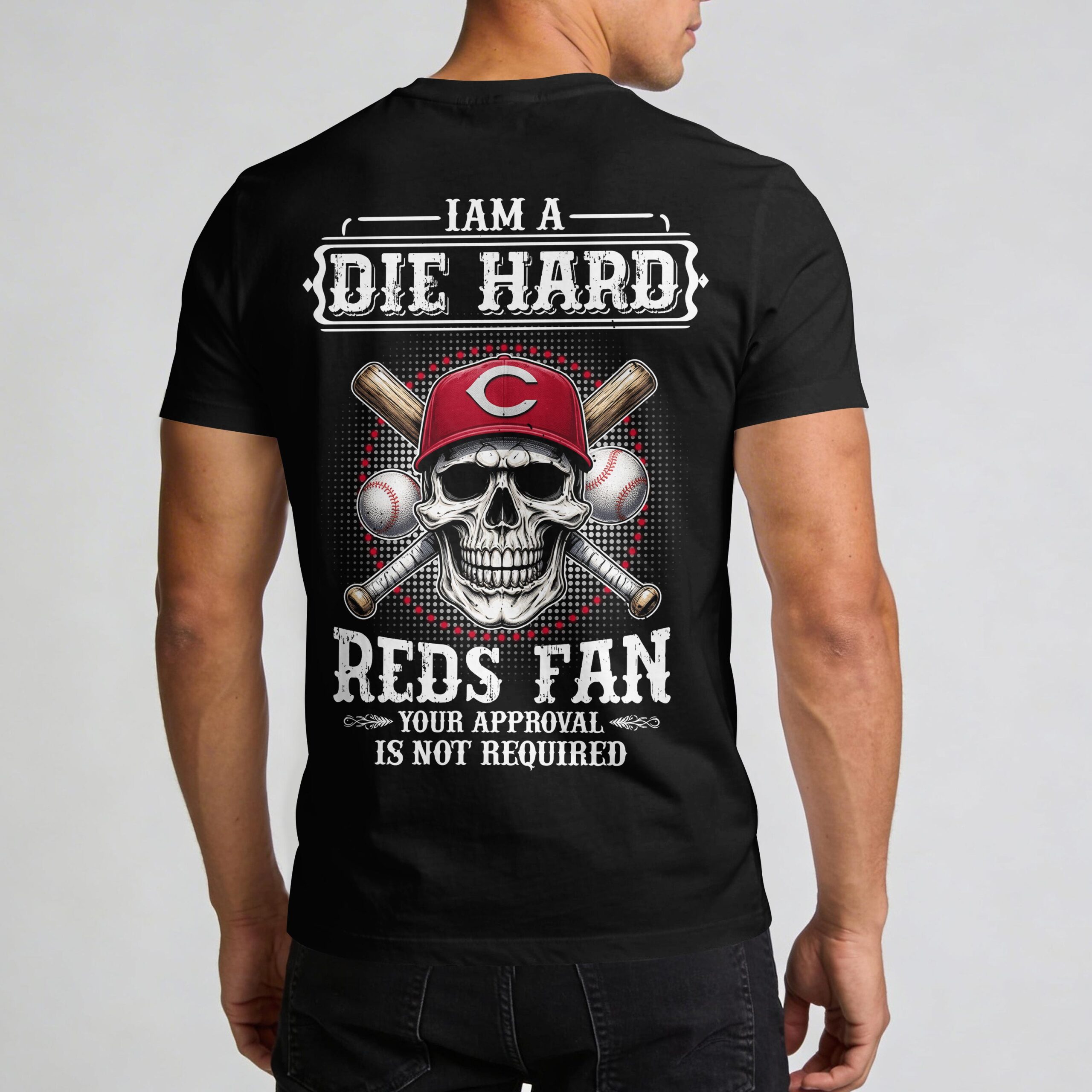 Show your unwavering loyalty to the Queen City with this bold Cincinnati Reds fan tee. Designed for those who live and breathe baseball, this shirt captures the gritty spirit of the most dedicated supporters. It’s the perfect way to combine your deep-rooted team pride with a powerful, patriotic statement during this historic season of American celebration. The front features a sharp skull graphic wearing the iconic C cap, framed by crossed bats and baseballs. The back makes a fearless statement with a larger version of the skull design and high-impact typography. Featuring the defiant phrase I Am A Die Hard Reds Fan, Your Approval Is Not Required, this graphic ensures your allegiance is never questioned. Wear this standout piece to the ballpark, Fourth of July festivities, or any game day event. It’s the ultimate gear for fans who want to represent Cincinnati with a tough, energetic edge.