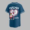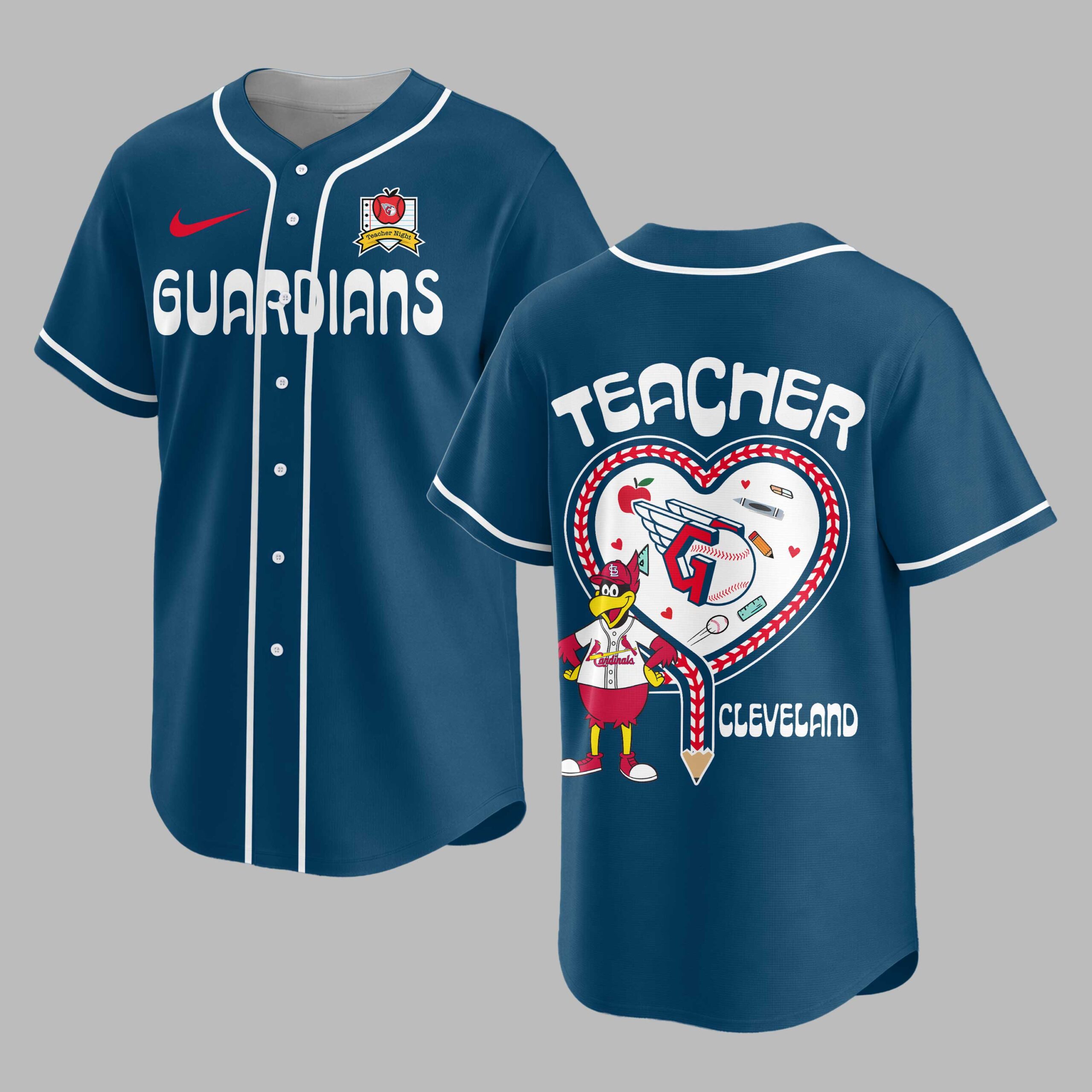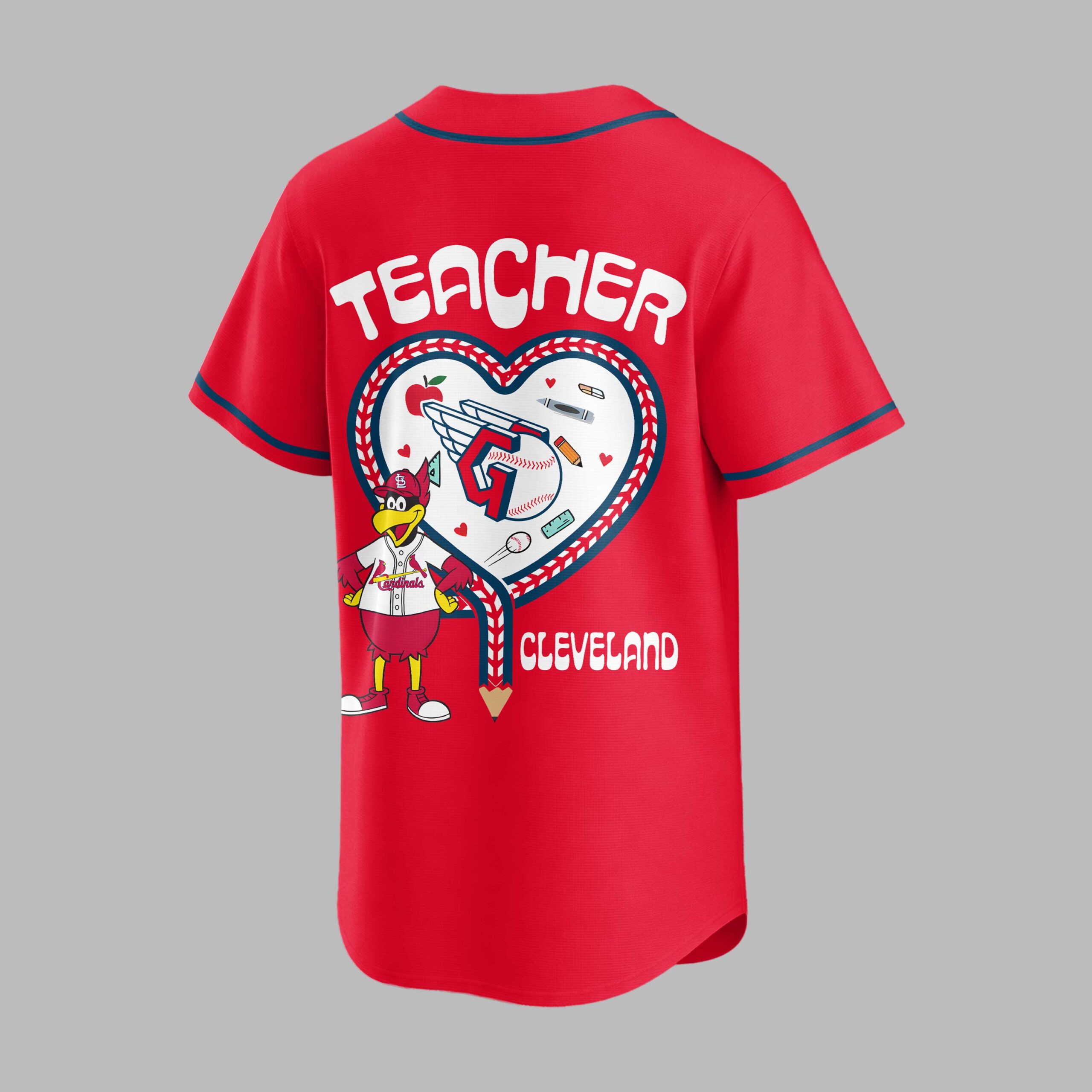 Celebrate your love for the Cleveland Guardians and the incredible work of educators with this unique baseball jersey! Perfect for any devoted fan who also champions the spirit of teaching, this shirt beautifully blends game-day excitement with heartfelt appreciation for our teachers. Show your dual pride and support for both the team and the classroom heroes who make a difference every day. The front proudly displays GUARDIANS in bold red lettering, complemented by a special Teacher Night logo featuring an apple, baseball, and notebook. Flip it around to showcase a vibrant design on the back, with TEACHER prominently featured above a heart outline made of baseball stitching. Inside, a playful array of school essentials like pencils, crayons, and a book surrounds a friendly bird mascot, all anchored by CLEVELAND at the bottom. This jersey is ideal for cheering on the Guardians at the ballpark, attending special Teacher Night events, or simply wearing to school on casual Fridays. It’s a fantastic way to honor the educators in your life or declare your own passion for both baseball and teaching, making it a standout addition to any fan’s wardrobe.