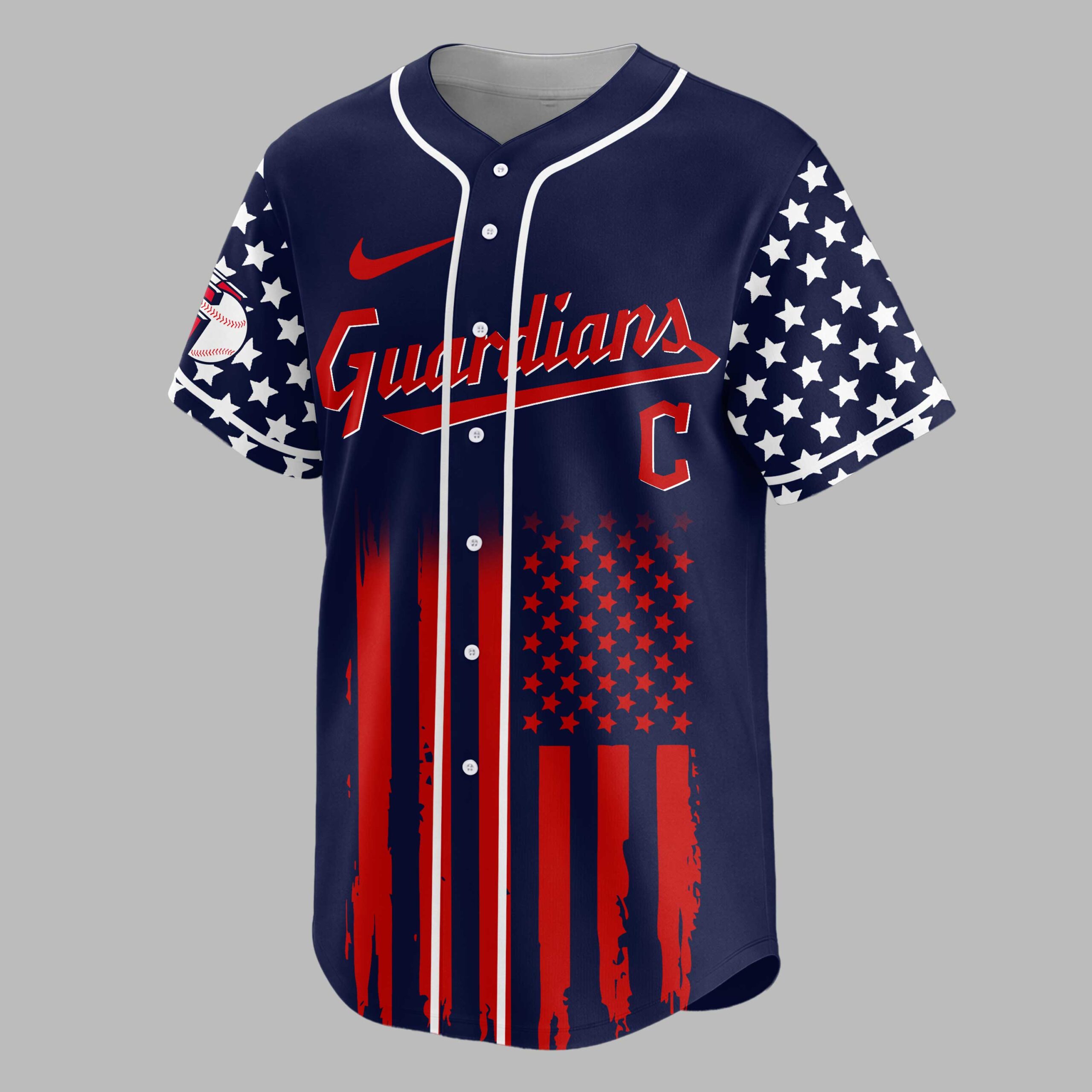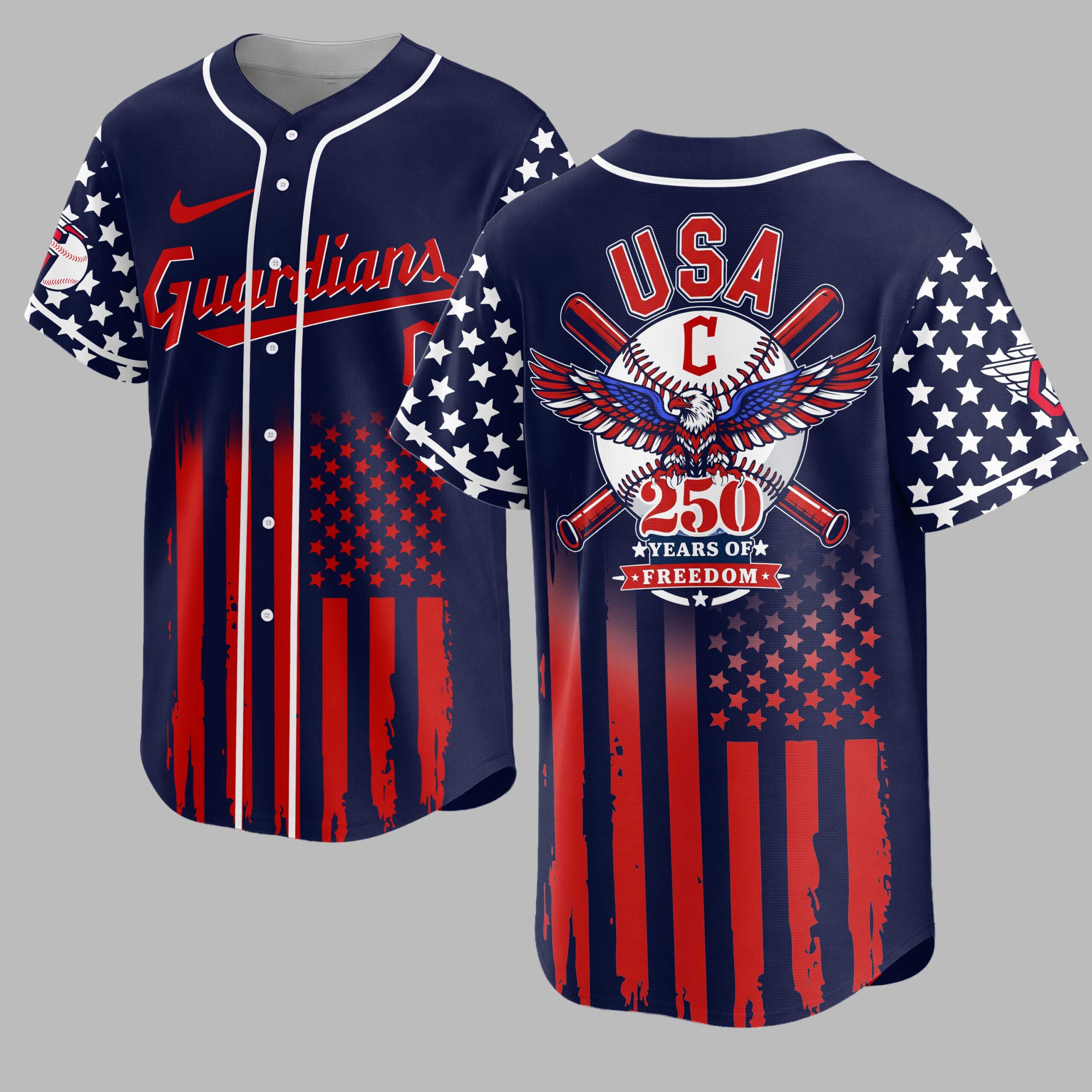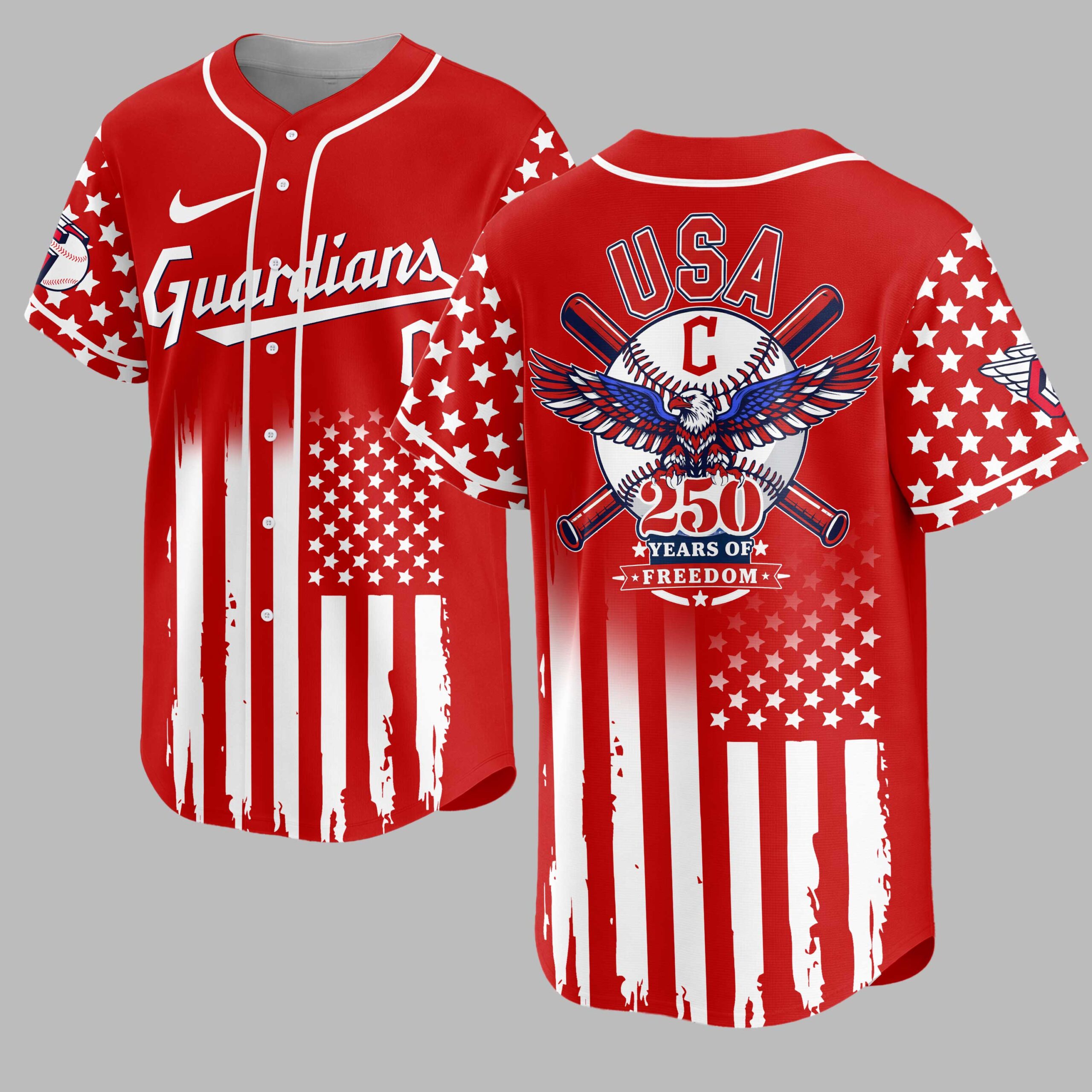 Hit a grand slam for patriotism and baseball with this spirited Guardians USA Baseball Jersey. Celebrating 250 years of American freedom, it perfectly blends national pride with your love for the game. Show your unwavering spirit and make a bold statement wherever you go. The front proudly displays ‘Guardians’ in a classic script. The back features a majestic American eagle with patriotic wings above crossed baseball bats and a baseball, emblazoned with ‘USA C’ and ‘250 YEARS OF FREEDOM.’ A distressed American flag motif, with stars on shoulders and stripes flowing down, completes this compelling design. Perfect for game days, national holidays, or any event to proudly display your American and baseball spirit. Wear it to the ballpark, Fourth of July celebrations, or as a bold patriotic statement. It’s for fans who proudly wear their love for country and game.