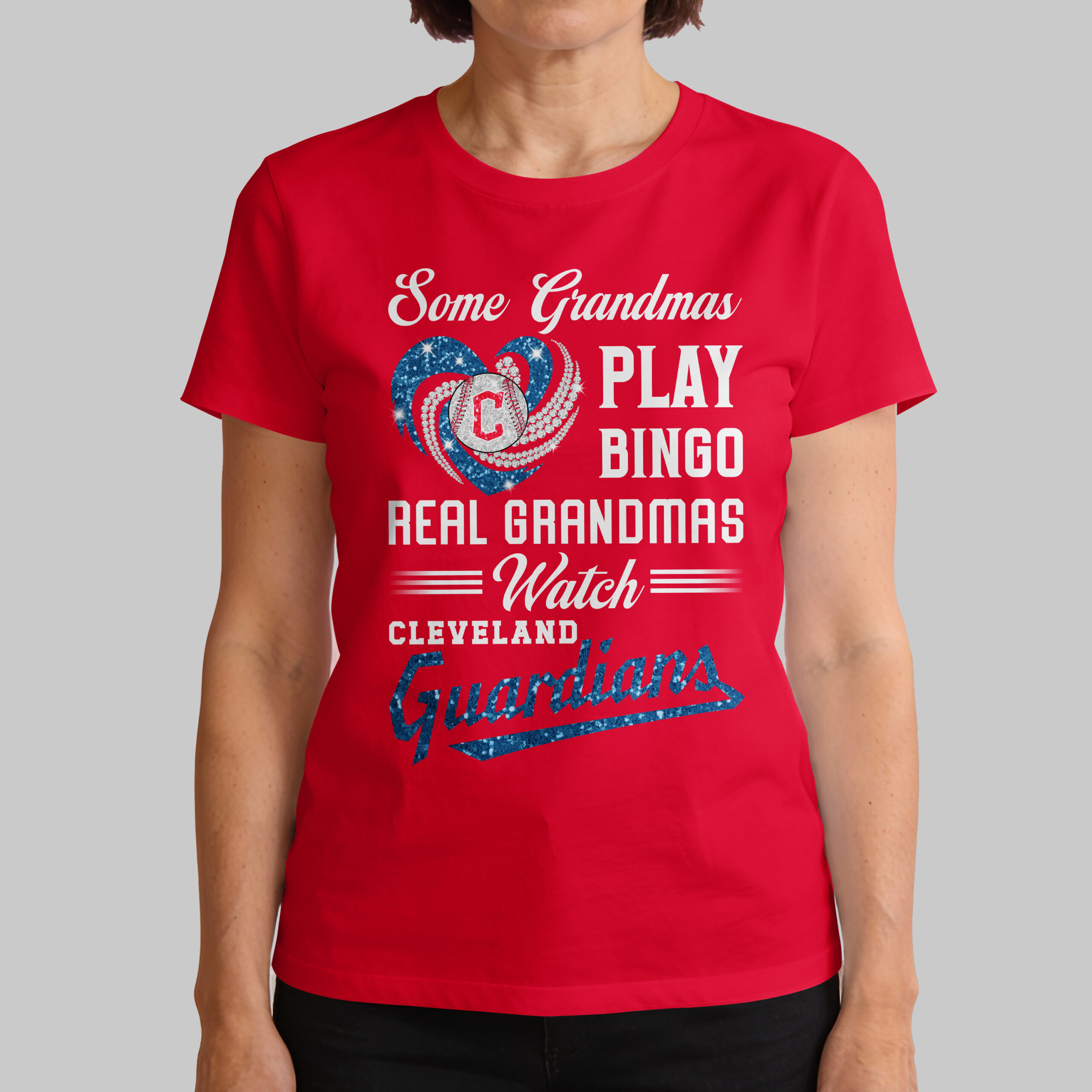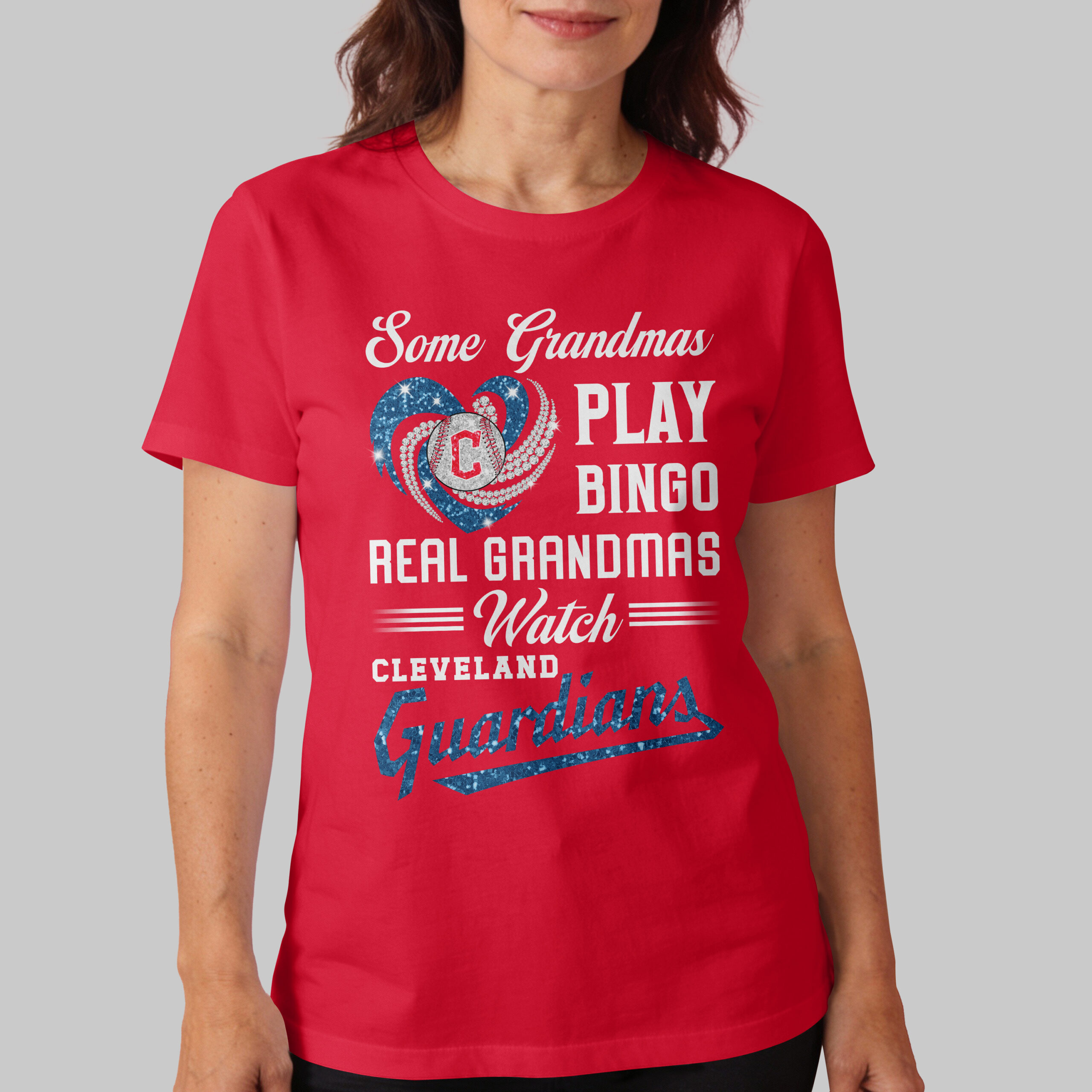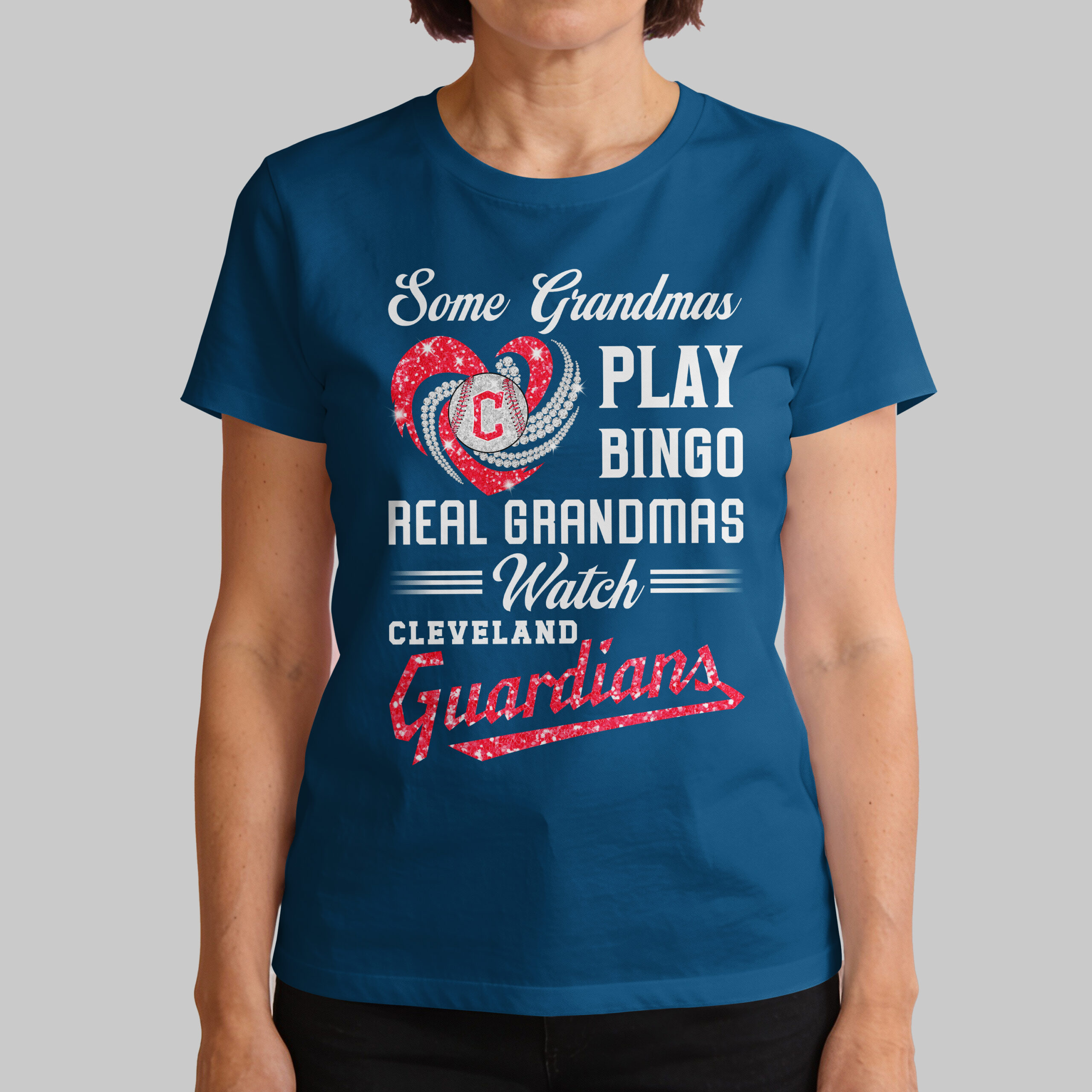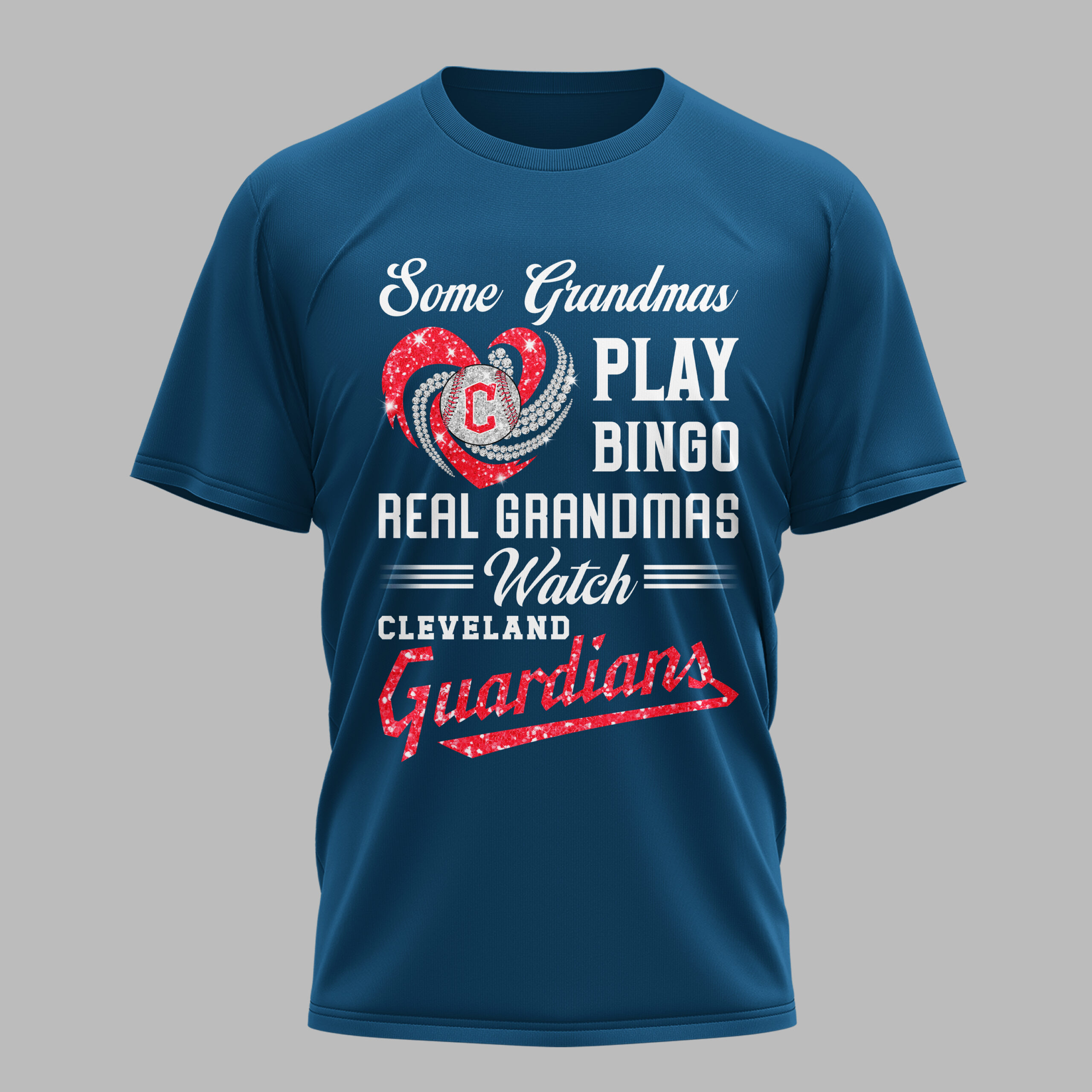 Show off your Cleveland Guardians pride with this spirited tee, perfect for the real grandmas who know where the action is! This fun and engaging shirt celebrates the dedicated grandmothers who trade bingo nights for baseball thrills, always ready to cheer on their favorite team. The vibrant design on the front features the witty declaration Some Grandmas PLAY BINGO REAL Grandmas ===Watch=== CLEVELAND Guardians. A dazzling blue heart, sparkling with a patriotic flair, proudly cradles a baseball adorned with the iconic C logo, surrounded by radiating shimmering accents. The word Guardians at the bottom shines in a complementary sparkly blue, making your team spirit unmistakable. This tee is an absolute must-have for game days, family gatherings, or any occasion where you want to proudly display your love for the Cleveland Guardians. It’s the ideal way for any baseball-loving grandma to make a playful statement and connect with fellow fans, whether at the stadium or watching from home.