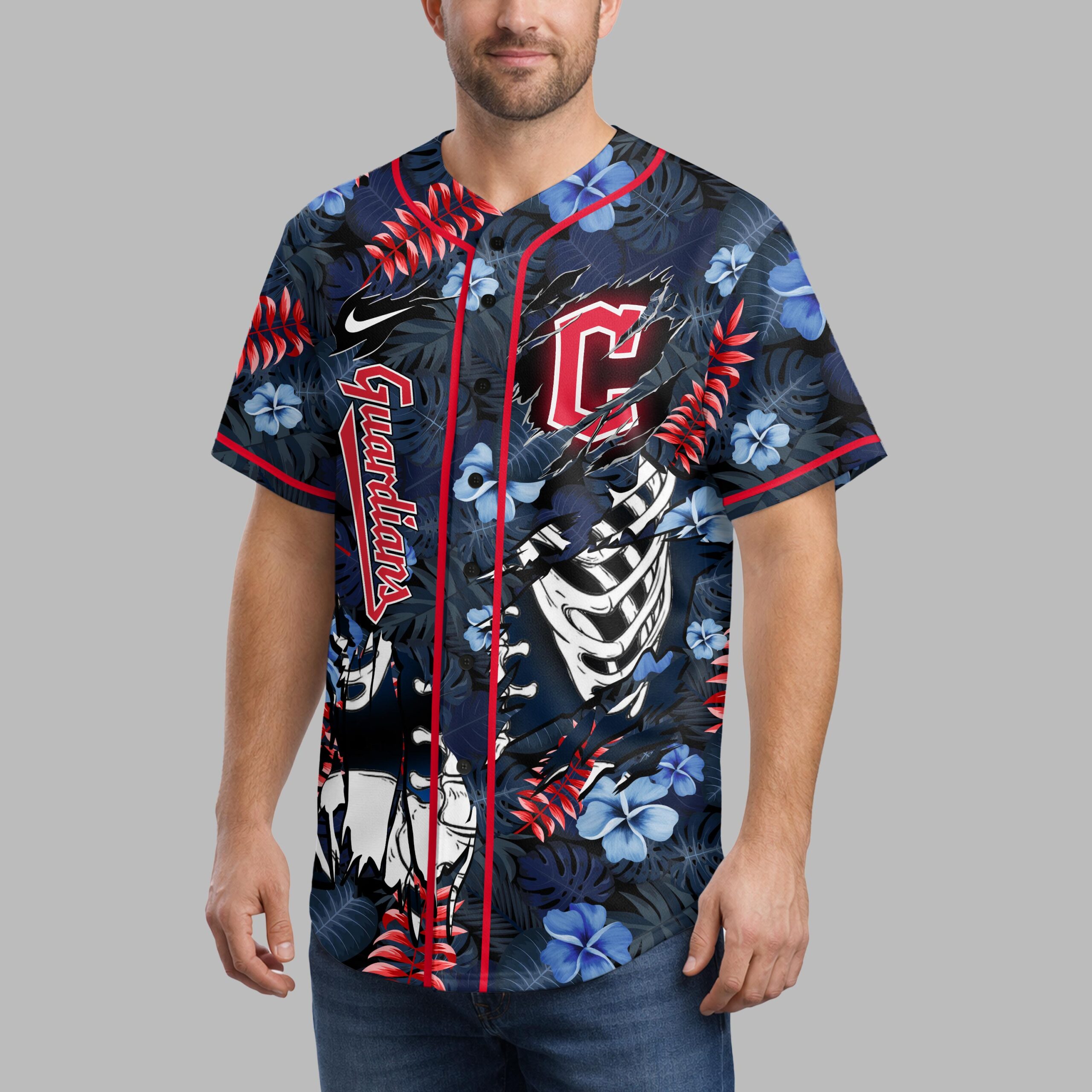 Show your unwavering support for the Guardians with a unique twist! This eye-catching baseball jersey blends classic fan apparel with an adventurous tropical and edgy design, perfect for making a bold statement and showcasing your fierce loyalty. The deep navy background features lush blue and dark green tropical leaves, accented by vibrant red and blue hibiscus flowers. The front boldly displays the ‘Guardians’ name vertically and a prominent ‘C’ logo, both strikingly integrated with a skeletal rib cage design. This daring motif continues on the back with the ‘Guardians’ name and a detailed skeletal spine, making your unique fandom visible. This spirited jersey is your go-to for gamedays, tailgates, or any casual outing where you want to stand out. Perfect for the ballpark, watch parties, or simply sunny days, it’s the ultimate way to celebrate your team with daring style.