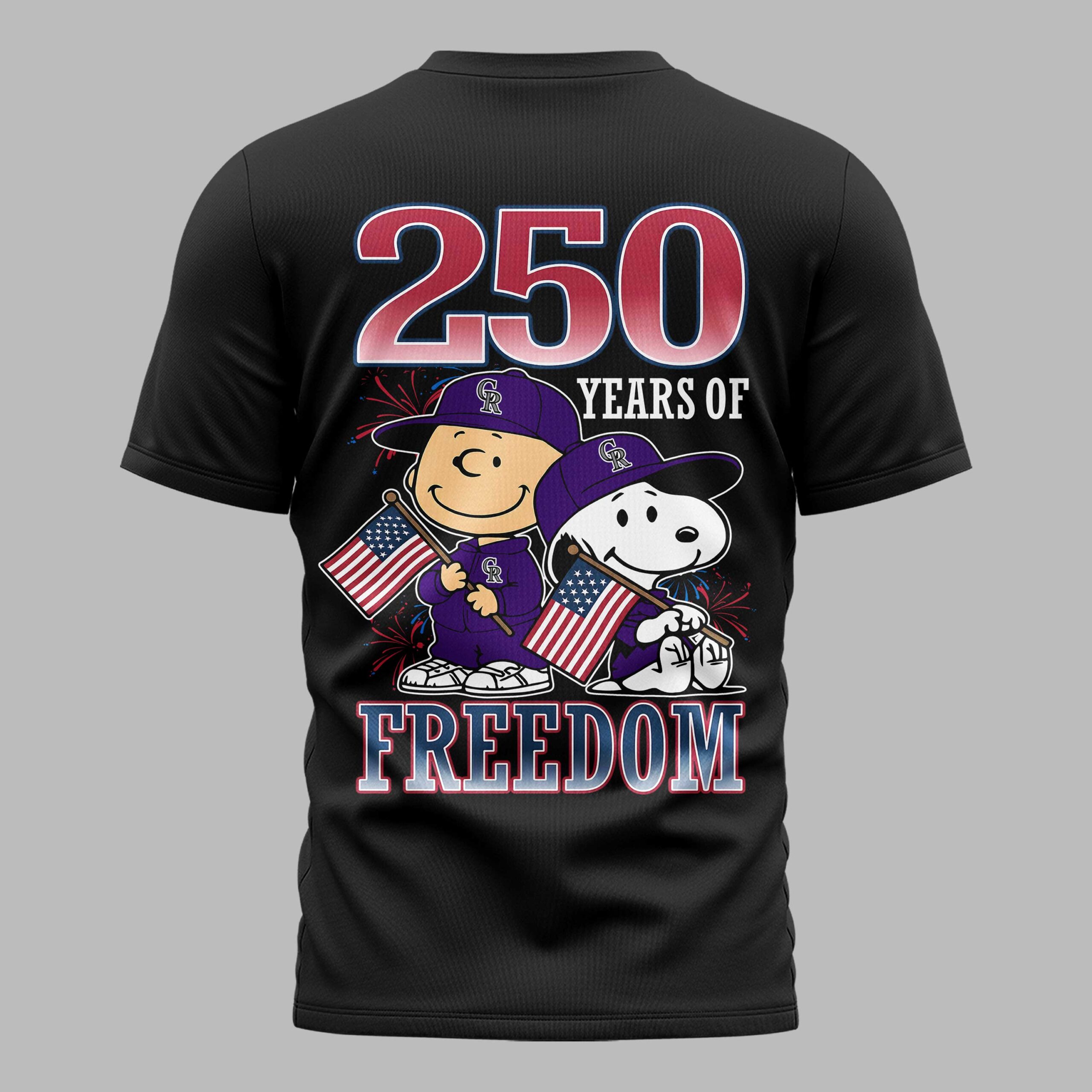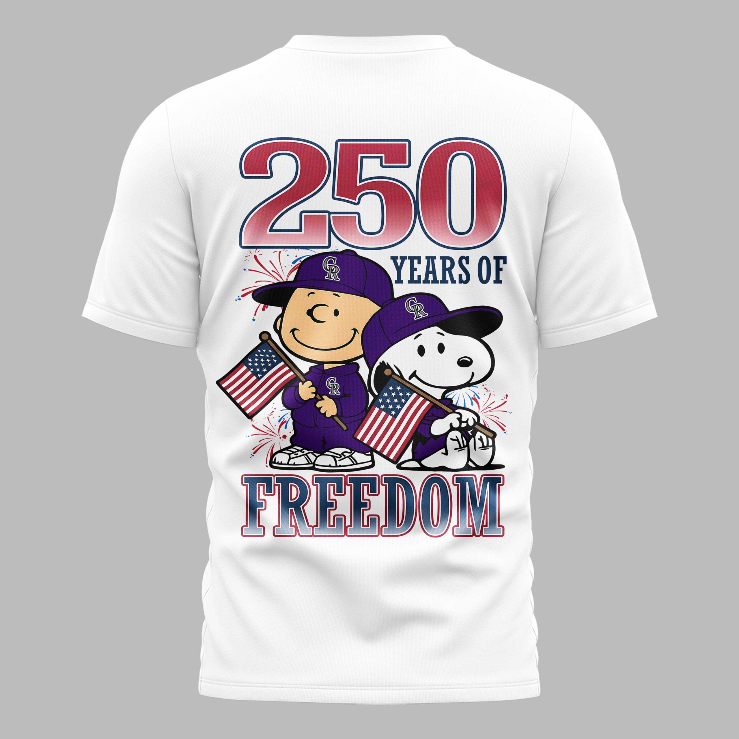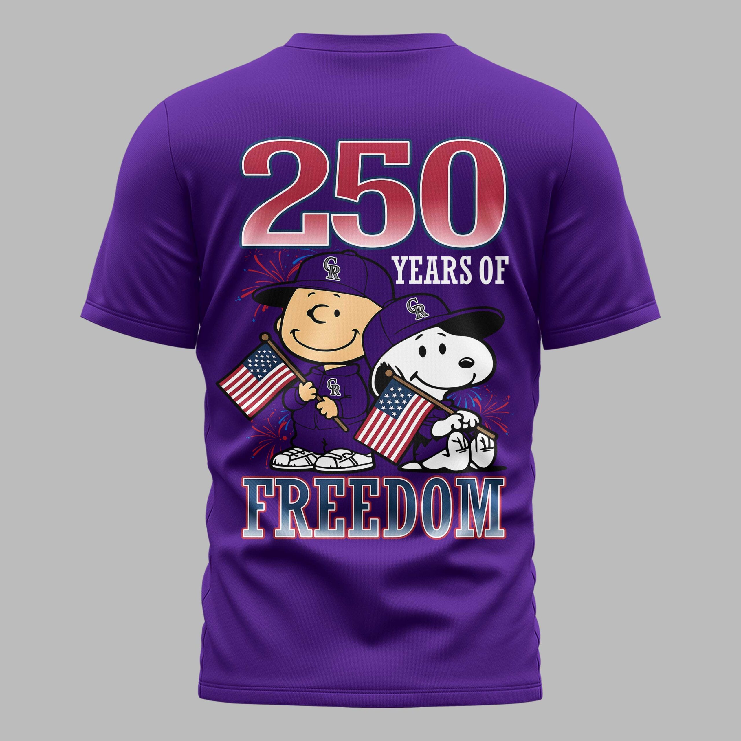 Celebrate your Colorado Rockies pride and American heritage with this special edition patriotic tee! This engaging shirt perfectly blends your love for baseball with a significant national milestone, featuring iconic Peanuts characters for an extra touch of nostalgic charm. The front boldly showcases ROCKIES in a vibrant red, white, and blue stars and stripes pattern, accented by the classic CR team logo and festive fireworks. The back brings joy with a delightful illustration of Charlie Brown and Snoopy, both sporting their purple Rockies hats and shirts while proudly waving American flags. Above them, the declaration 250 YEARS OF FREEDOM stands out in a patriotic gradient, all framed by dazzling fireworks. This unique t-shirt is perfect for game days, especially around the Fourth of July, Memorial Day, or any occasion to display your dual allegiance. Wear it to Coors Field, family barbecues, patriotic parades, or any gathering where you want to show off your Colorado Rockies spirit and celebrate American freedom in style.