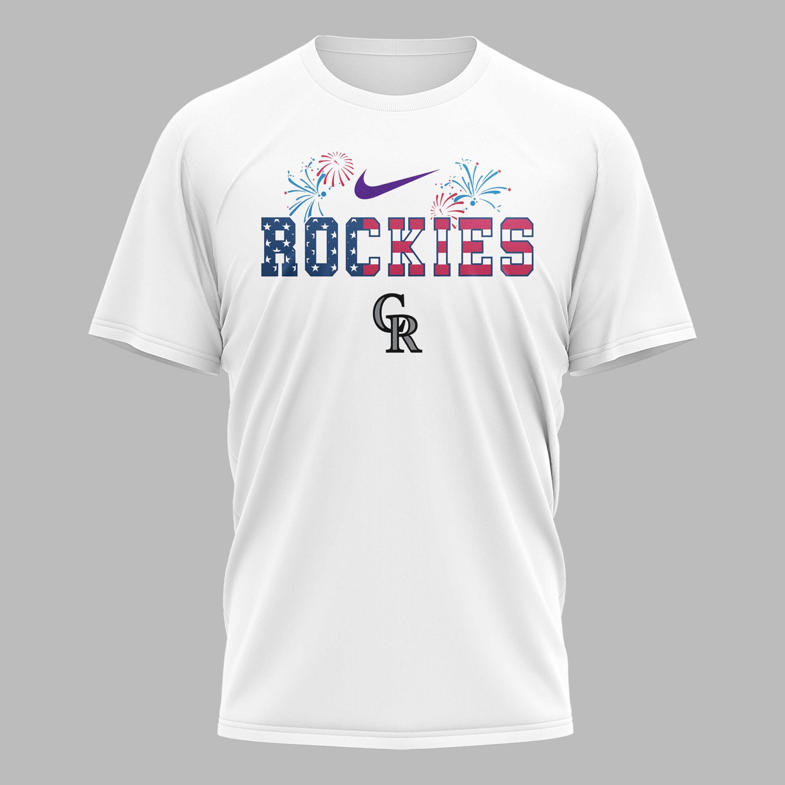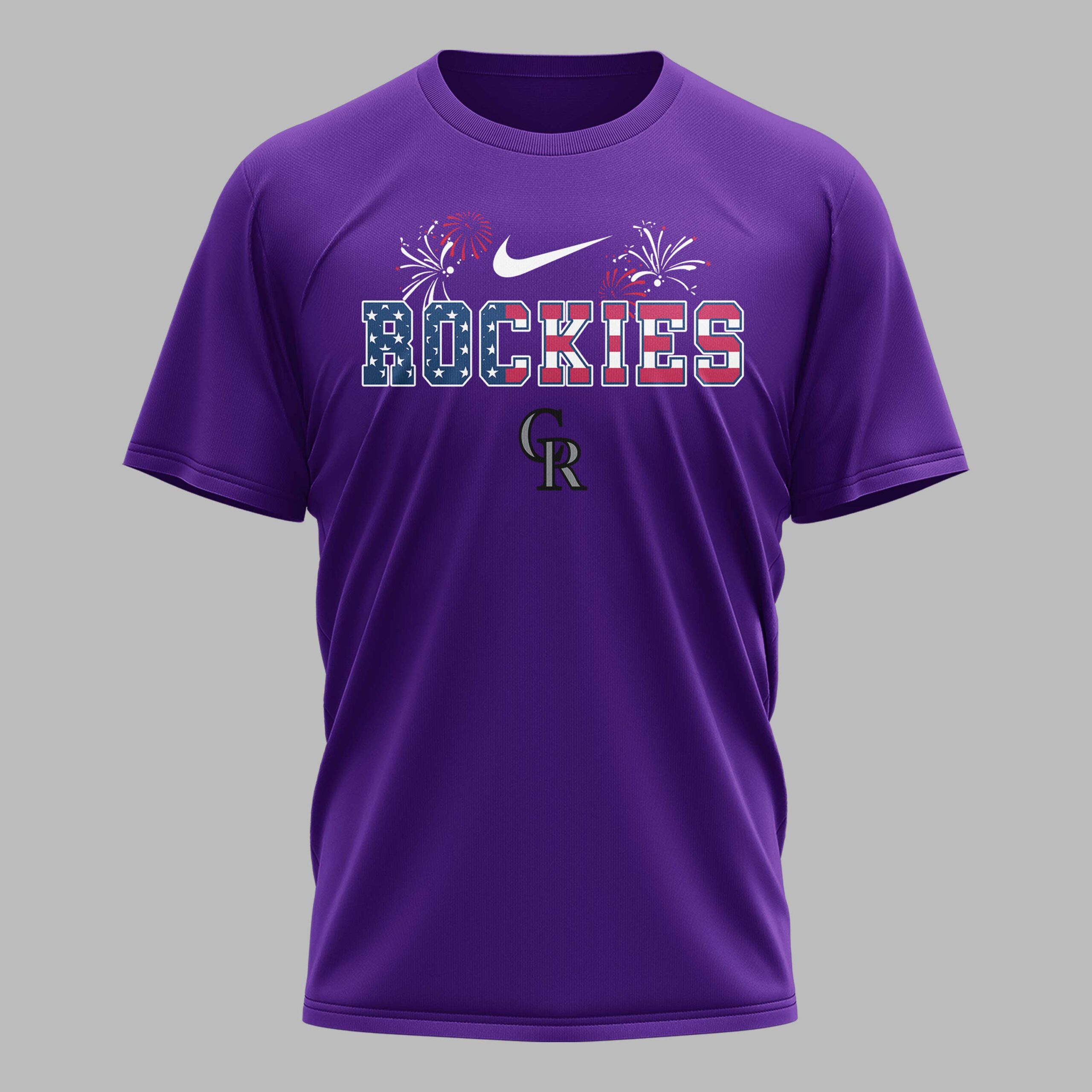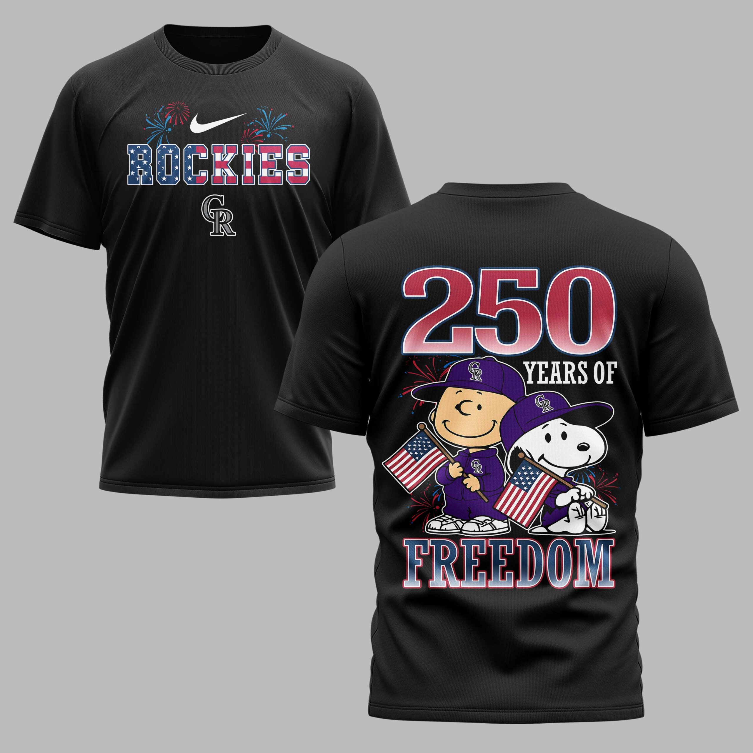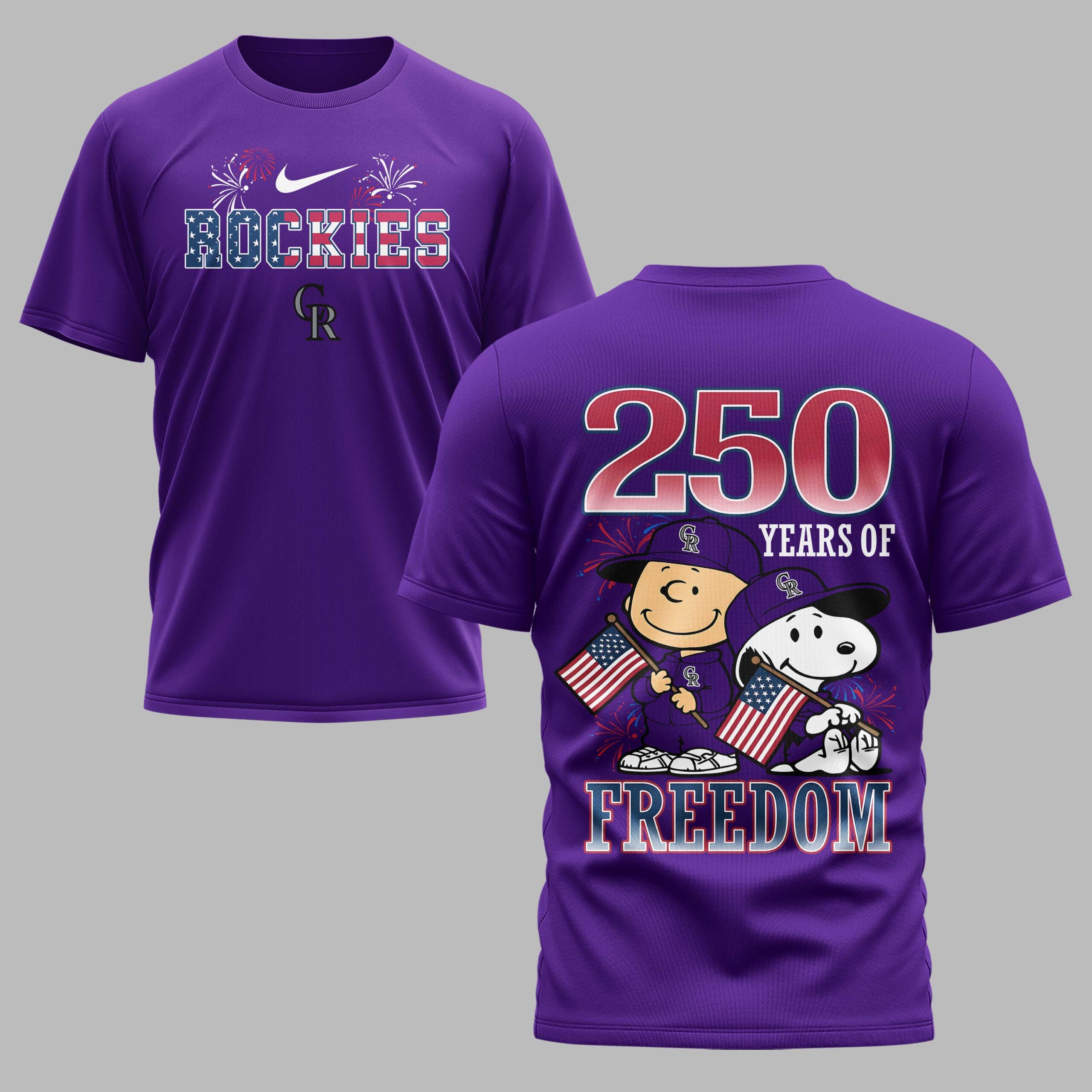 Celebrate your Colorado Rockies pride and American heritage with this special edition patriotic tee! This engaging shirt perfectly blends your love for baseball with a significant national milestone, featuring iconic Peanuts characters for an extra touch of nostalgic charm. The front boldly showcases ROCKIES in a vibrant red, white, and blue stars and stripes pattern, accented by the classic CR team logo and festive fireworks. The back brings joy with a delightful illustration of Charlie Brown and Snoopy, both sporting their purple Rockies hats and shirts while proudly waving American flags. Above them, the declaration 250 YEARS OF FREEDOM stands out in a patriotic gradient, all framed by dazzling fireworks. This unique t-shirt is perfect for game days, especially around the Fourth of July, Memorial Day, or any occasion to display your dual allegiance. Wear it to Coors Field, family barbecues, patriotic parades, or any gathering where you want to show off your Colorado Rockies spirit and celebrate American freedom in style.