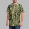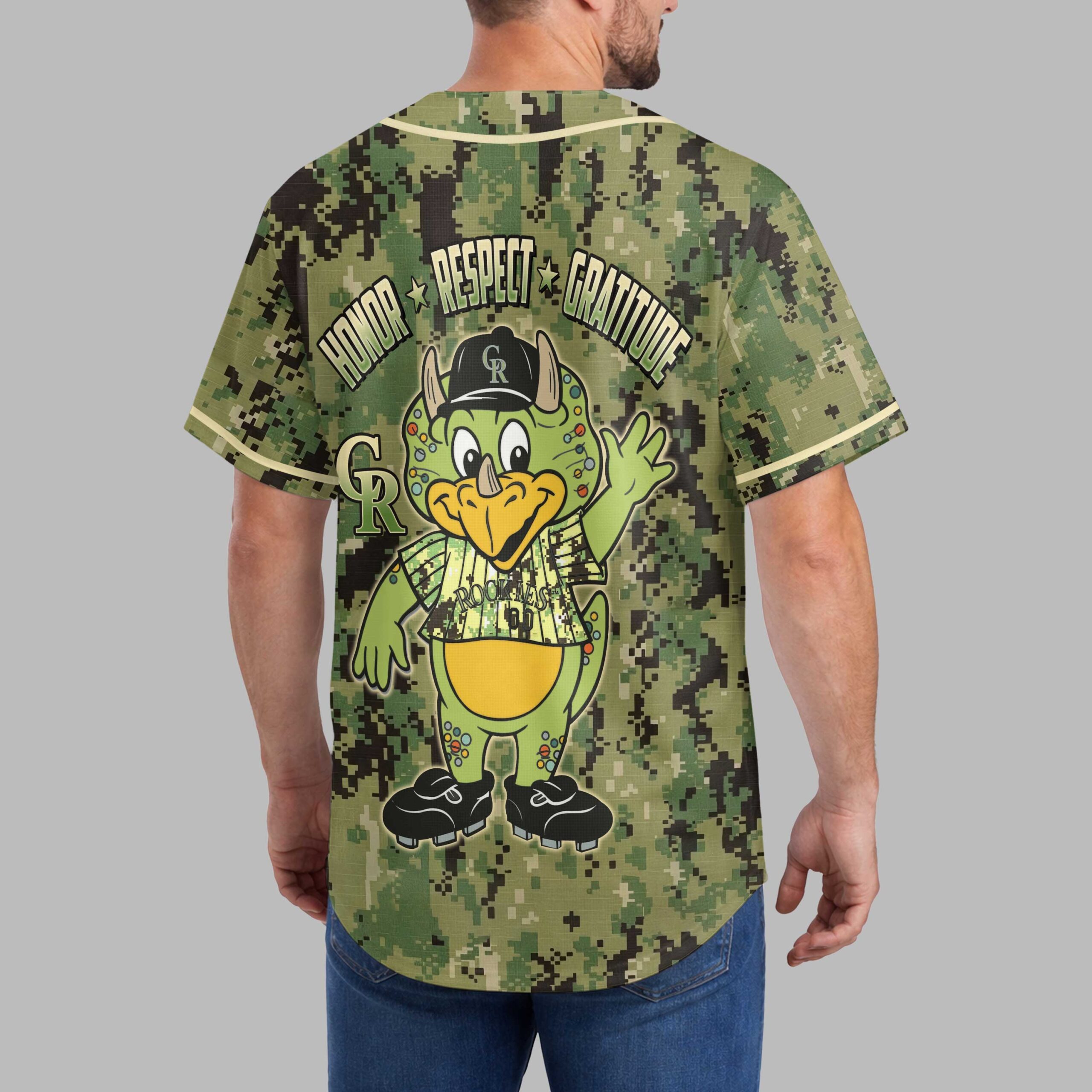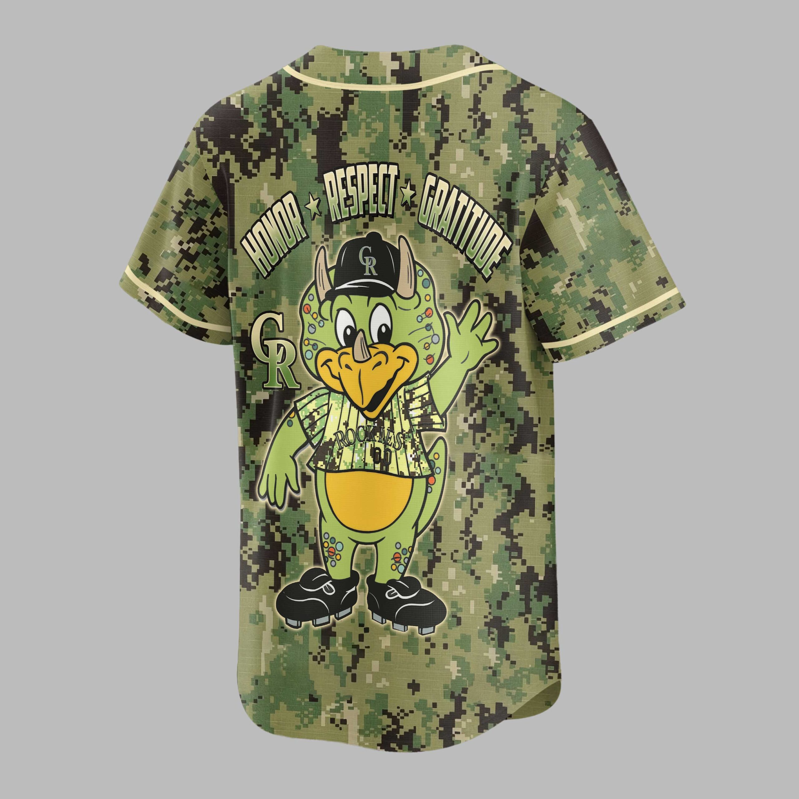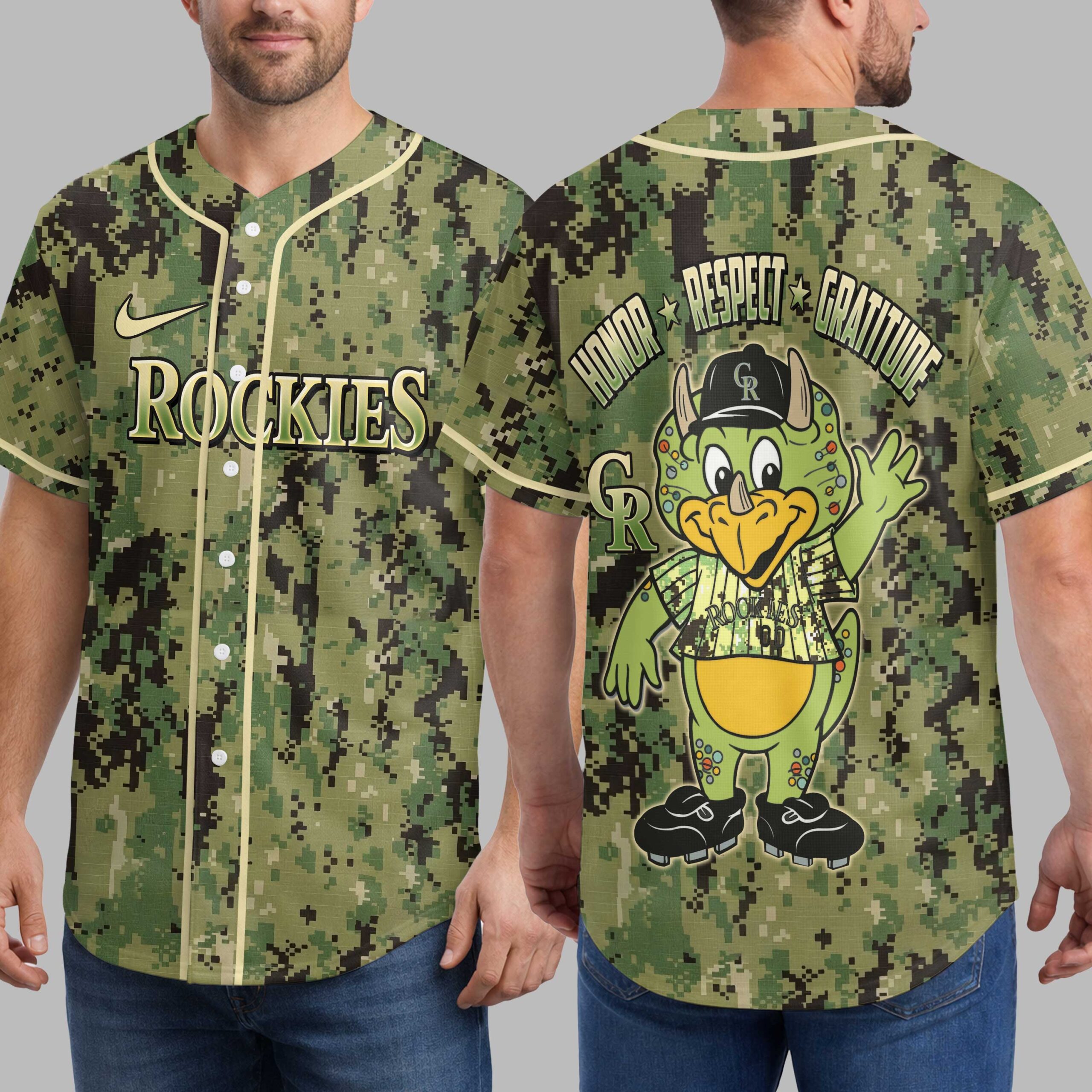 Show your Colorado Rockies pride and honor our heroes with this unique military appreciation jersey. Blending vibrant team spirit with a powerful message of gratitude, it’s perfect for fans who want to proudly represent their team and country. This top is a bold statement of loyalty and respect. The front features a bold digital camouflage pattern, proudly displaying ROCKIES in green and yellow outline, with the iconic Nike swoosh. The back showcases a vibrant graphic of the beloved Rockies mascot, Dinger, dressed in his team uniform. Above him, HONOR, RESPECT, and GRATITUDE are emblazoned in an arc, each accented with a star, underscoring national pride. Perfect for game days at Coors Field, military appreciation events, or casual outings. This jersey lets you display Rockies fandom and patriotic spirit with pride, combining baseball enthusiasm with heartfelt gratitude.