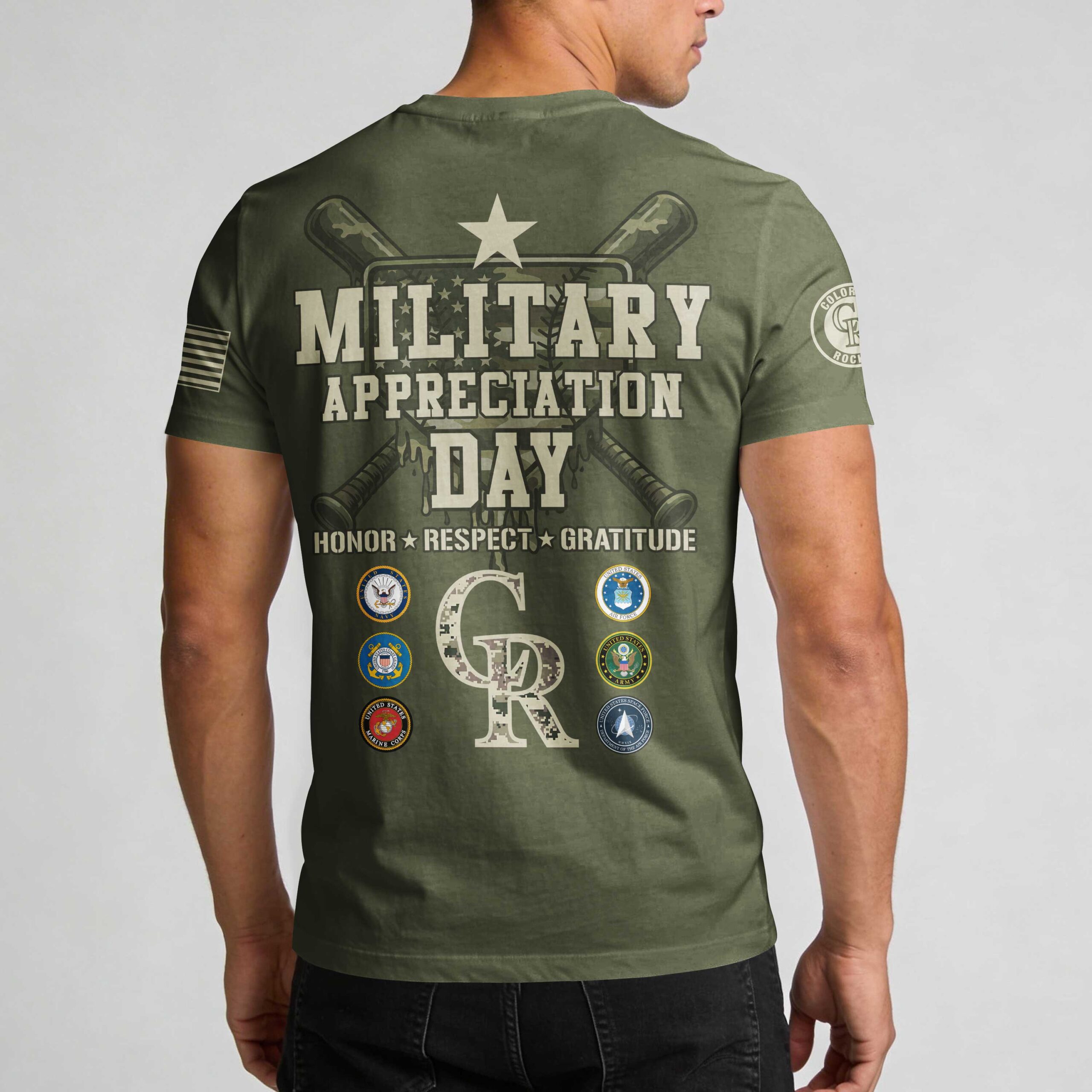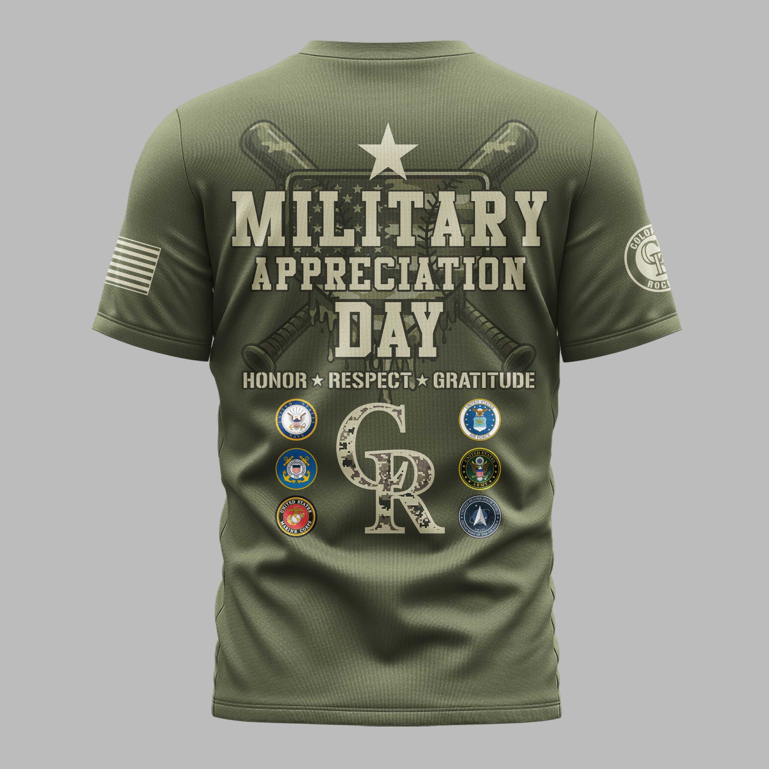 Show your unwavering support for the Colorado Rockies and honor our brave service members with this special Military Appreciation Day tee. It’s more than just a shirt; it’s a proud declaration of team spirit and gratitude for those who protect our freedom, making it perfect for any fan who values both the game and our nation’s heroes. The front proudly displays COLORADO ROCKIES with the team name in a striking camouflage pattern, complemented by a bold American flag patch on the sleeve. Turn around to reveal the powerful back design featuring MILITARY APPRECIATION DAY alongside a star, crossed bats, and the inspiring message HONOR * RESPECT * GRATITUDE. Six distinct military branch emblems encircle a large camouflage CR logo, creating a truly impactful tribute. Whether you’re cheering loudly from the stands at Coors Field, attending a patriotic event, or simply want to display your pride every day, this shirt is designed for you. Wear it to game days, national holidays, or community gatherings to visibly support your team and express profound respect for the U.S. Armed Forces.