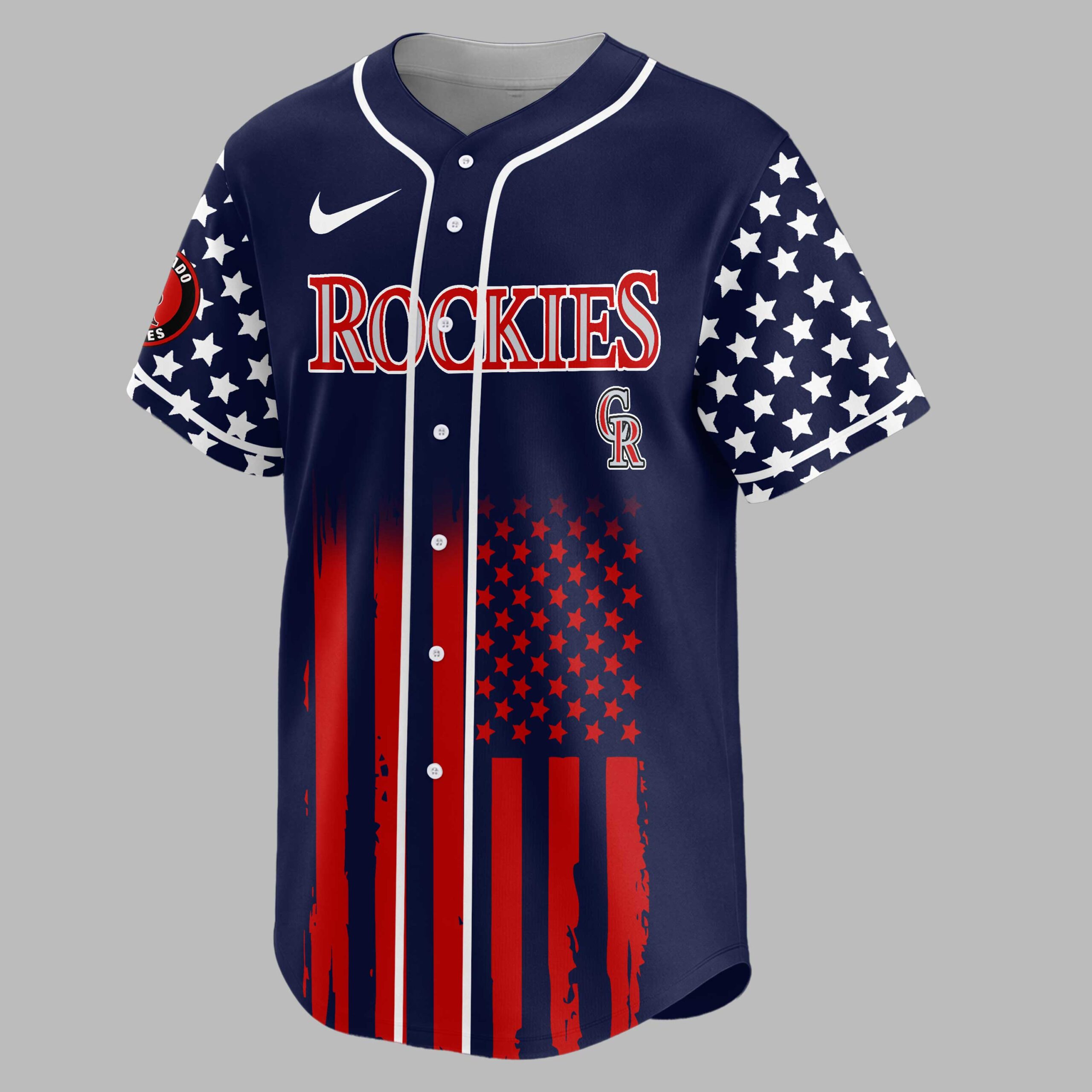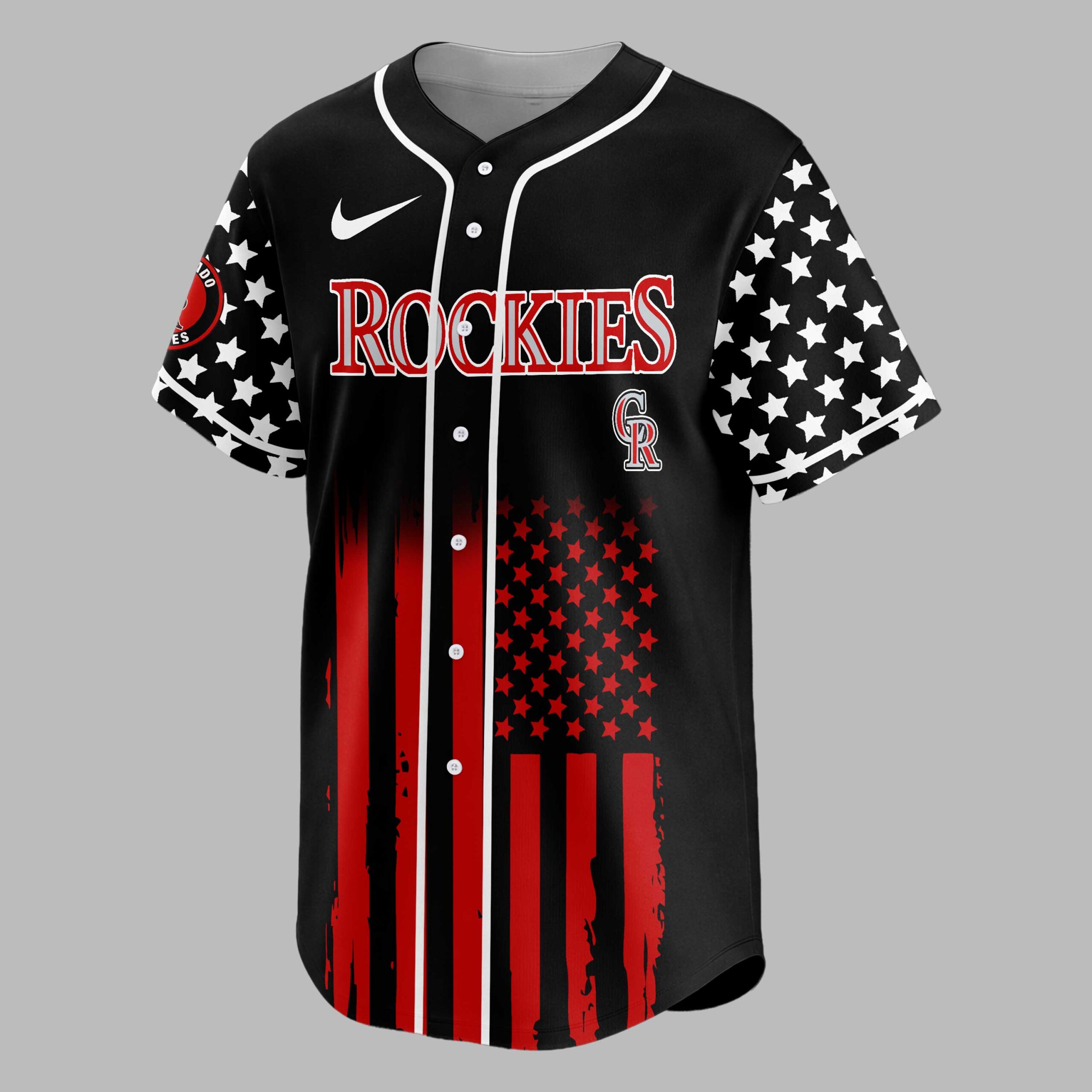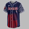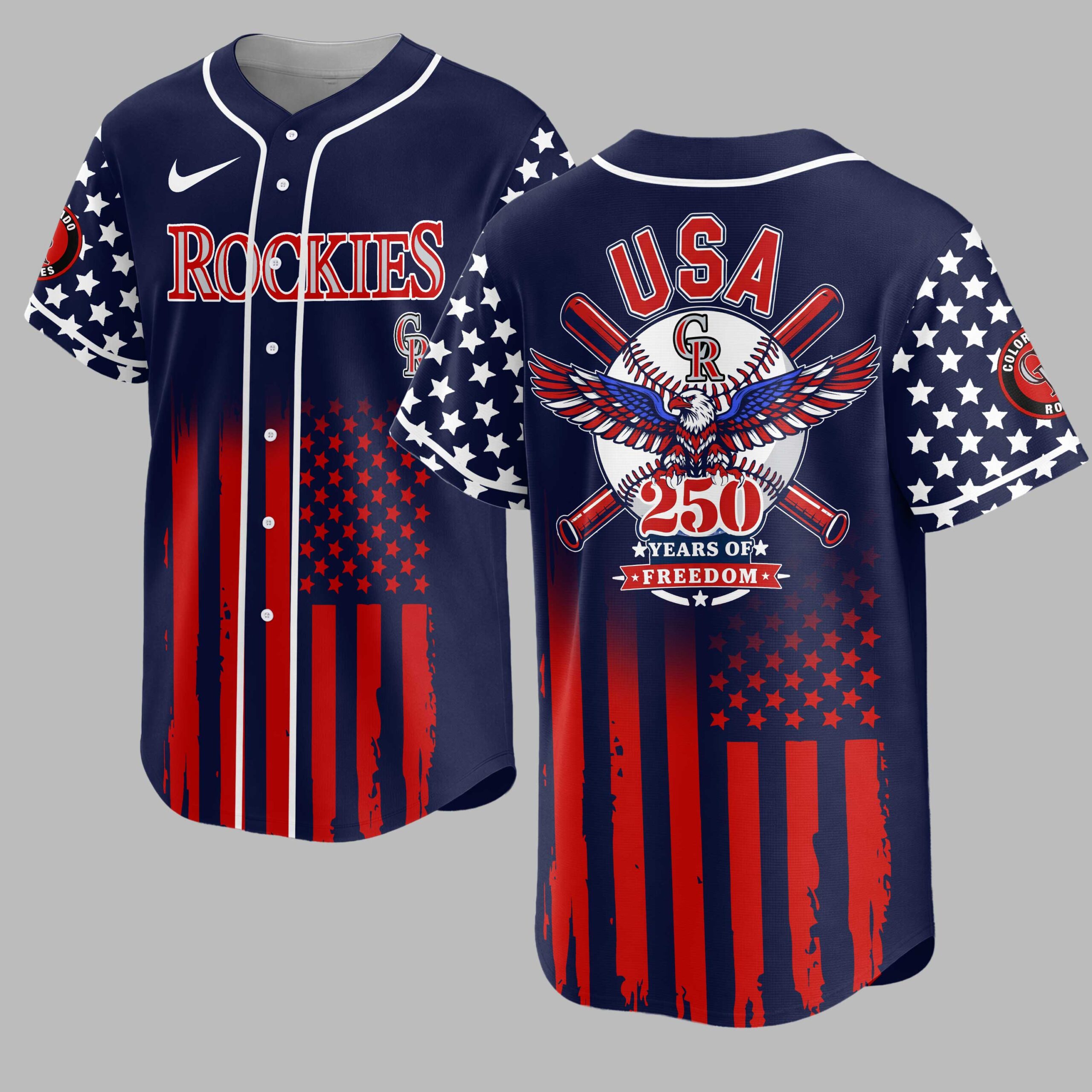 Celebrate your love for baseball and country with this unique Colorado Rockies Patriotic USA jersey! Perfect for fans who live and breathe the game, this shirt proudly blends team spirit with a powerful tribute to American liberty, commemorating 250 Years of Freedom. It’s more than just game-day wear; it’s a statement of pride in both your team and your nation. The front showcases the iconic ROCKIES lettering in bold red and white, set against a backdrop featuring a distressed American flag design with striking red stripes and star-filled sleeves. Turn around, and the back truly shines with a prominent USA graphic, an eagle spreading its patriotic wings over a baseball, crossed bats, and the commemorative 250 YEARS OF FREEDOM message. The sleeves continue the stellar theme, complementing the red-striped flag design that flows across the bottom. Whether you’re cheering from the stands at Coors Field, celebrating the Fourth of July, Memorial Day, or simply enjoying a casual outing, this jersey is designed to make a statement. Show off your Colorado Rockies devotion and unwavering American pride wherever your adventures take you.