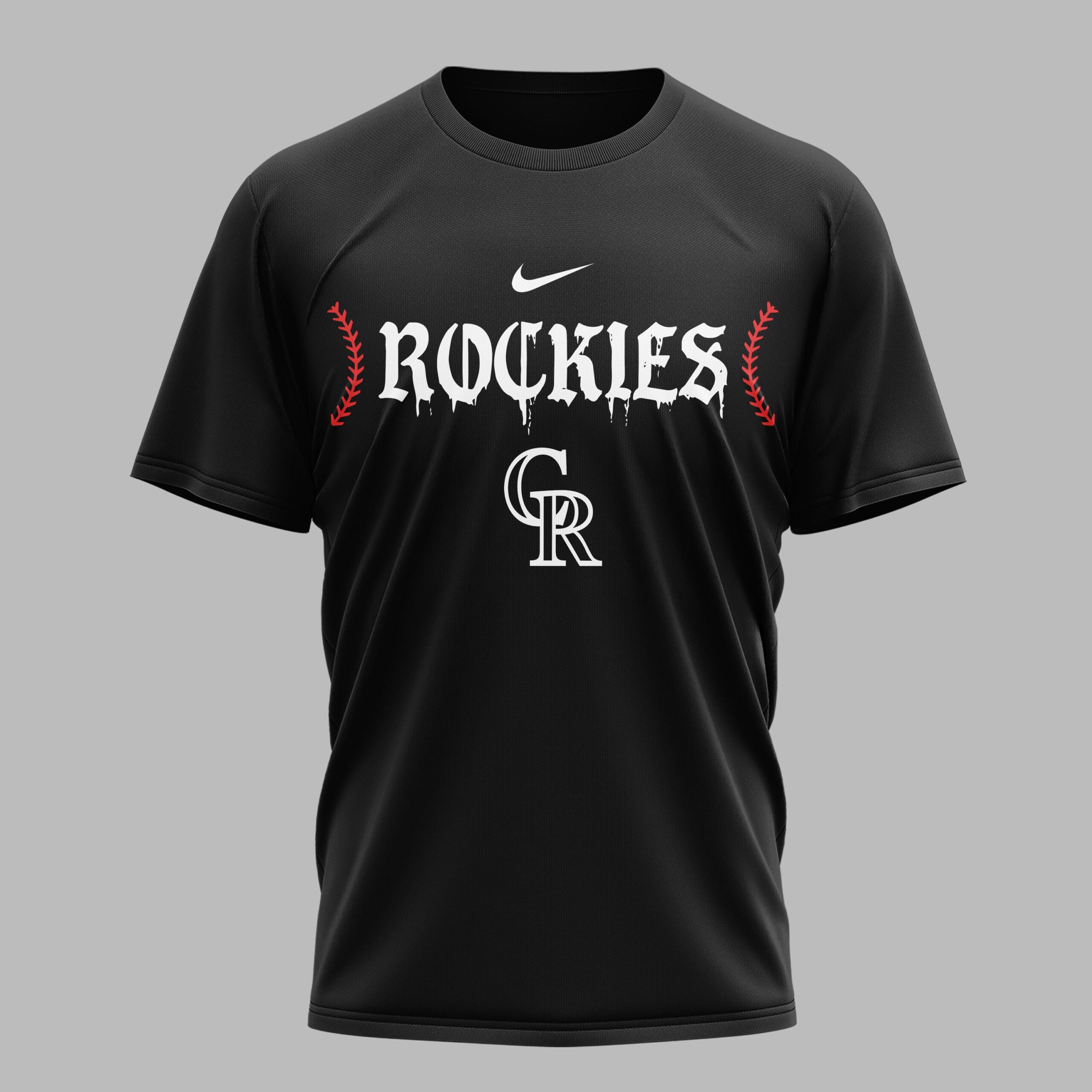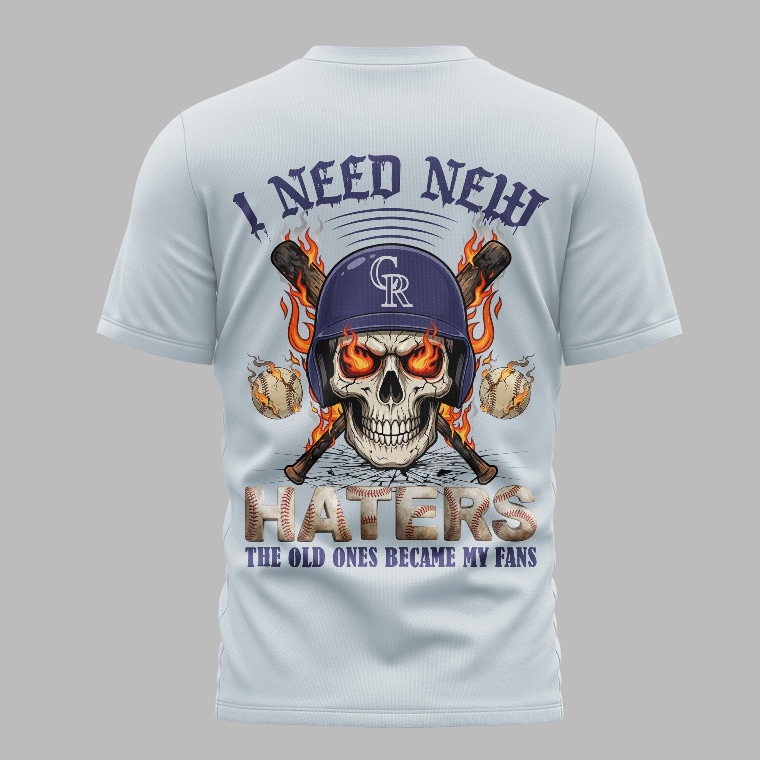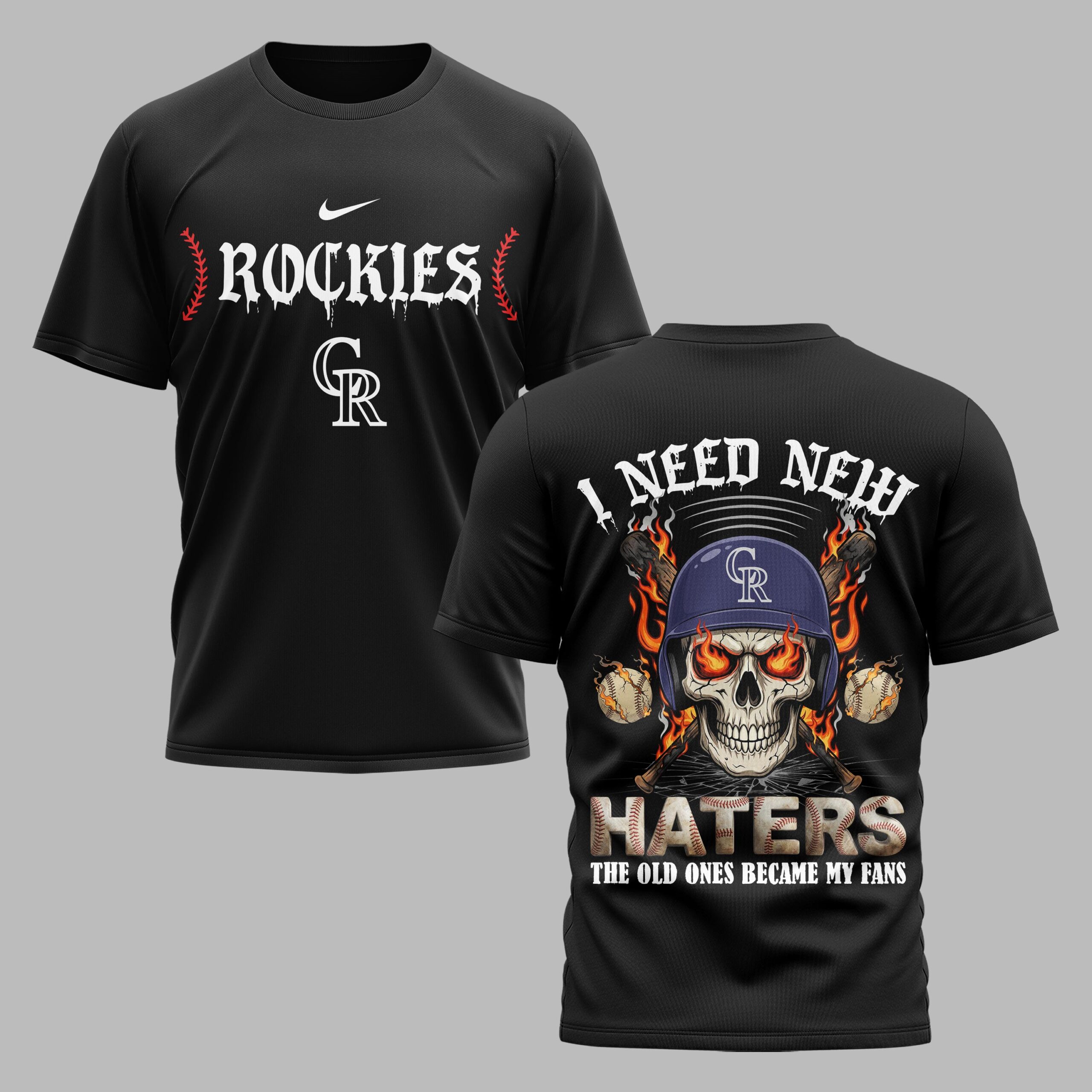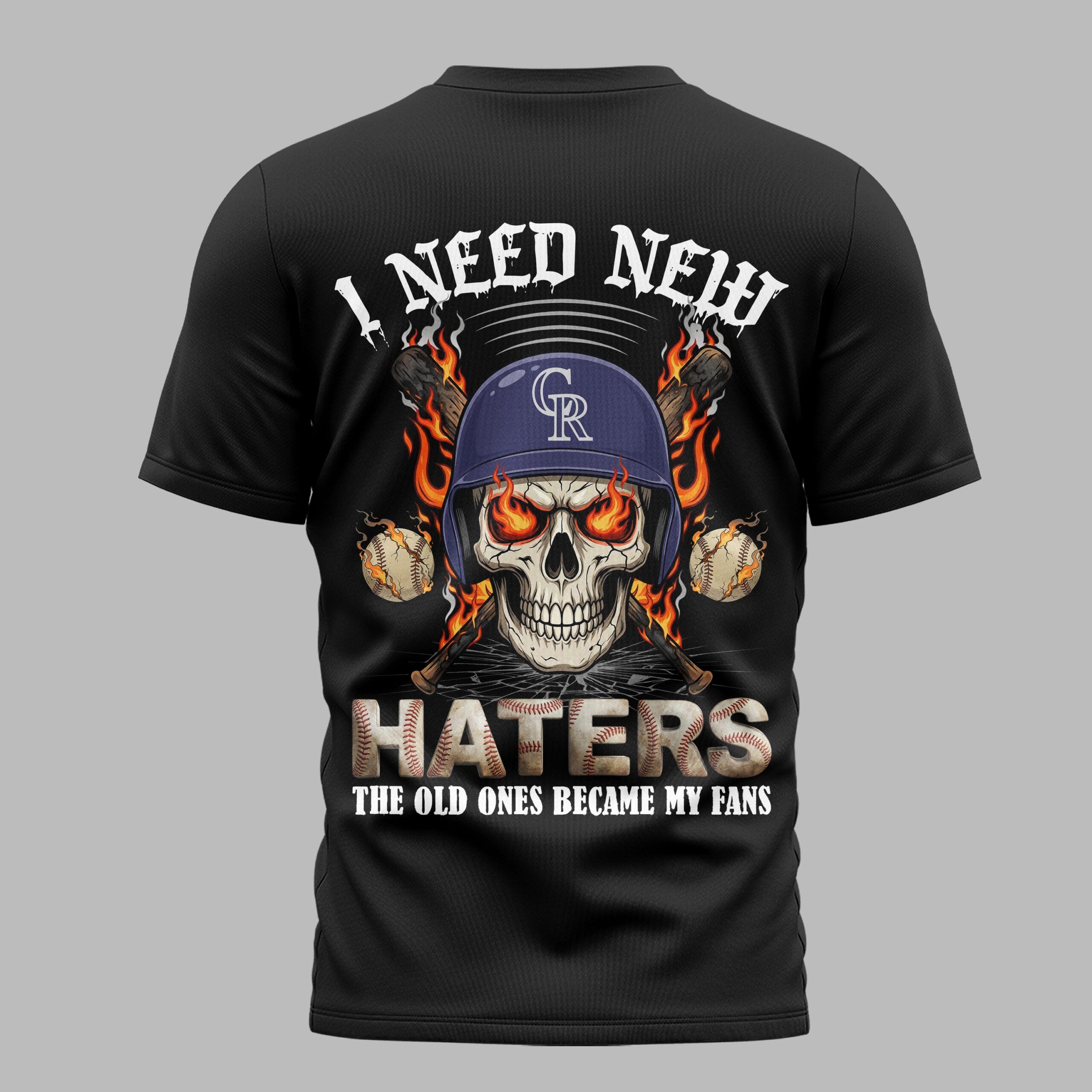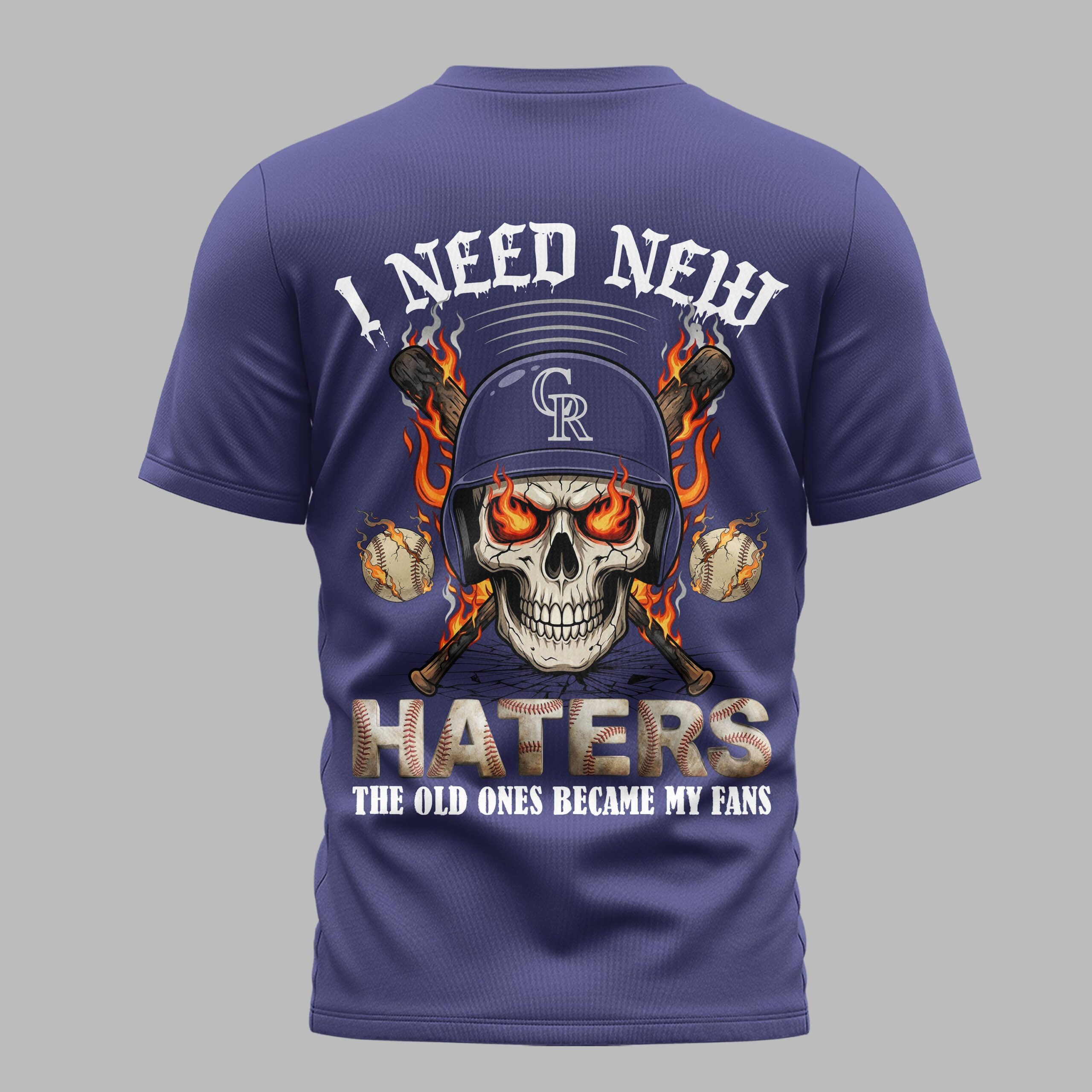 Show your Colorado Rockies pride and a defiant sense of humor with this striking fan shirt. Perfect for true baseball enthusiasts, it’s a powerful way to express your unwavering team spirit and challenge any doubters. The front proudly displays ROCKIES with baseball stitching accents and the iconic CR team logo. The back features an aggressive skull in a CR baseball helmet, flanked by flaming baseballs and crossed bats. The bold declaration I NEED NEW HATERS. THE OLD ONES BECAME MY FANS completes this unique design. This tee is ideal for game days at the ballpark, watch parties, or simply making a statement wherever you go. Wear it to spark conversations, share camaraderie with fellow fans, and showcase your passion for the team.