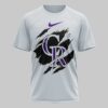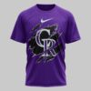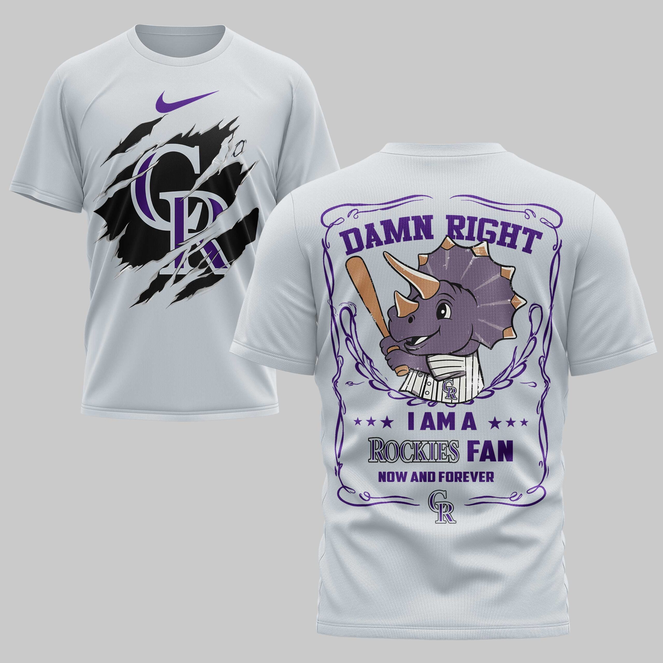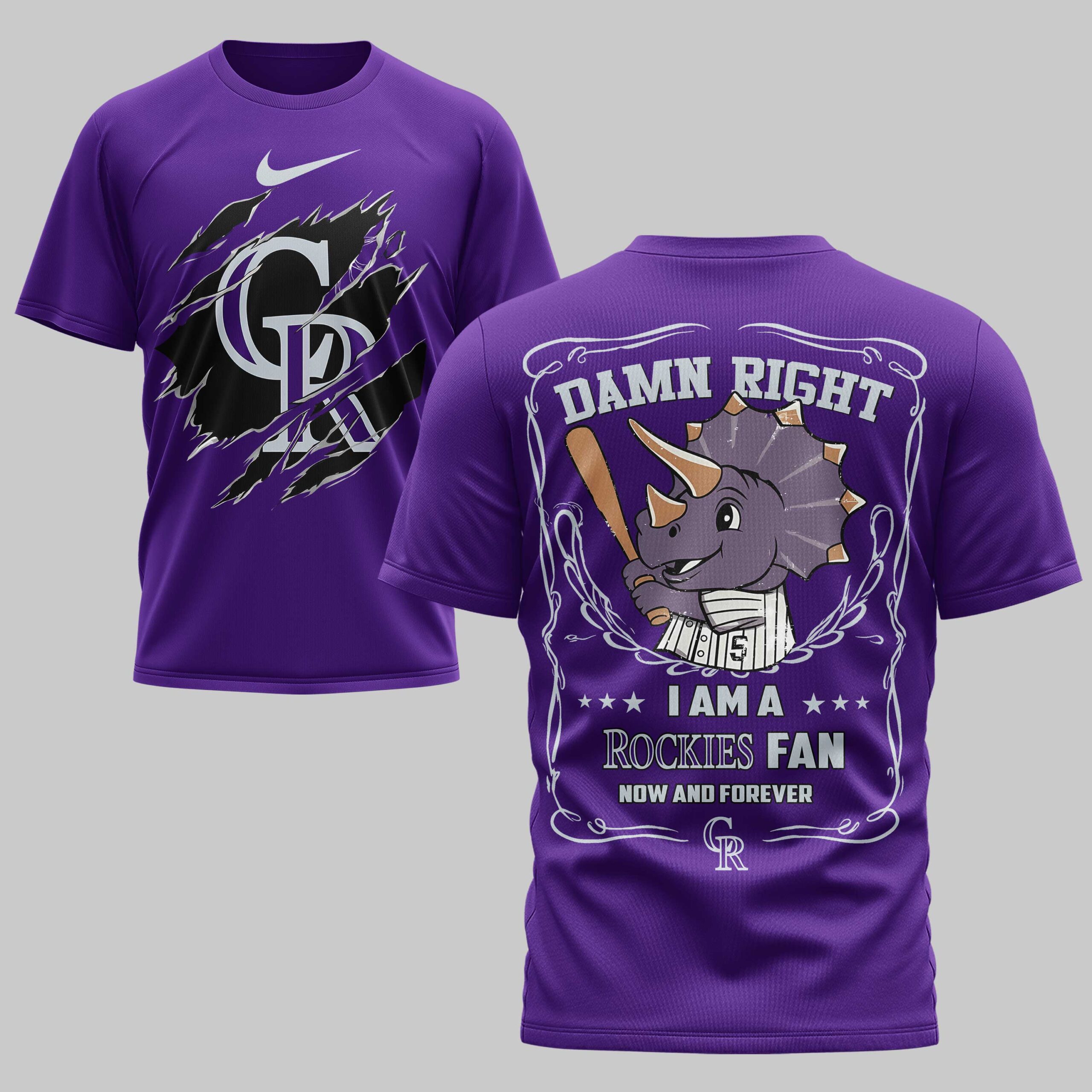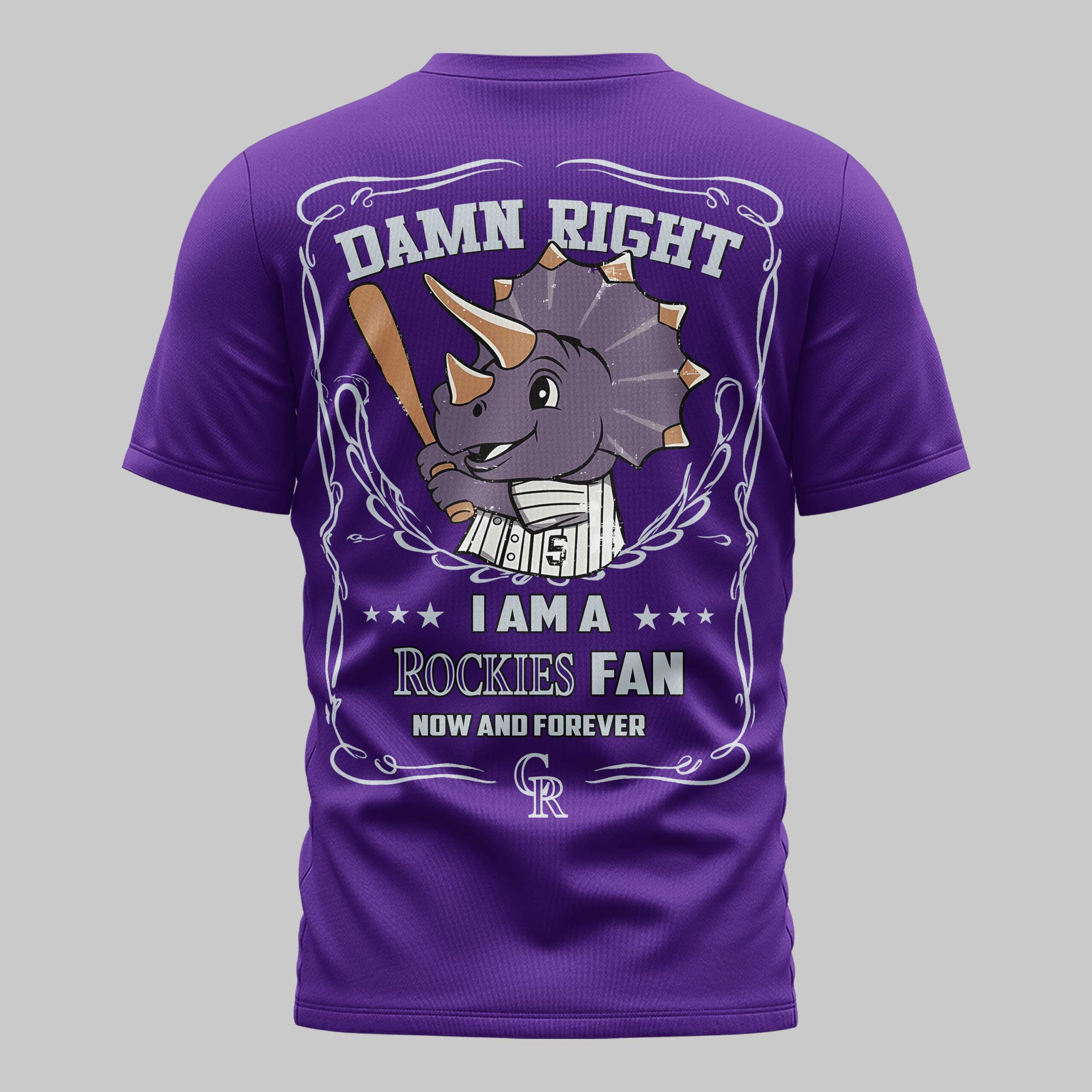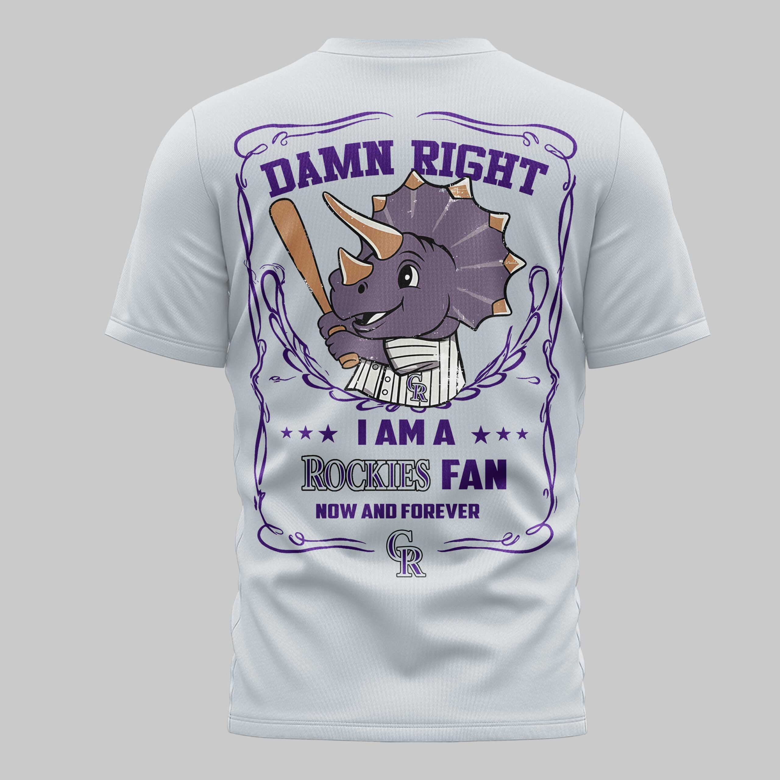 Declare your unwavering loyalty to the Colorado Rockies with this bold fan shirt! Perfect for every devoted supporter, this tee lets you showcase your team spirit with undeniable confidence. It’s an essential piece for game days or any time you want to represent your Rockies pride, now and forever. The front proudly displays a fierce, ripped graphic revealing the iconic CR Rockies logo in white. On the back, an energetic cartoon Triceratops, bat in hand and uniform on, takes center stage. Above it, the confident DAMN RIGHT is featured, followed by I AM A *** ROCKIES FAN *** NOW AND FOREVER, all framed by a distinctive, ornate border. This shirt is ideal for cheering at Coors Field, gathering with friends for a watch party, or simply everyday wear to celebrate your beloved Colorado Rockies.