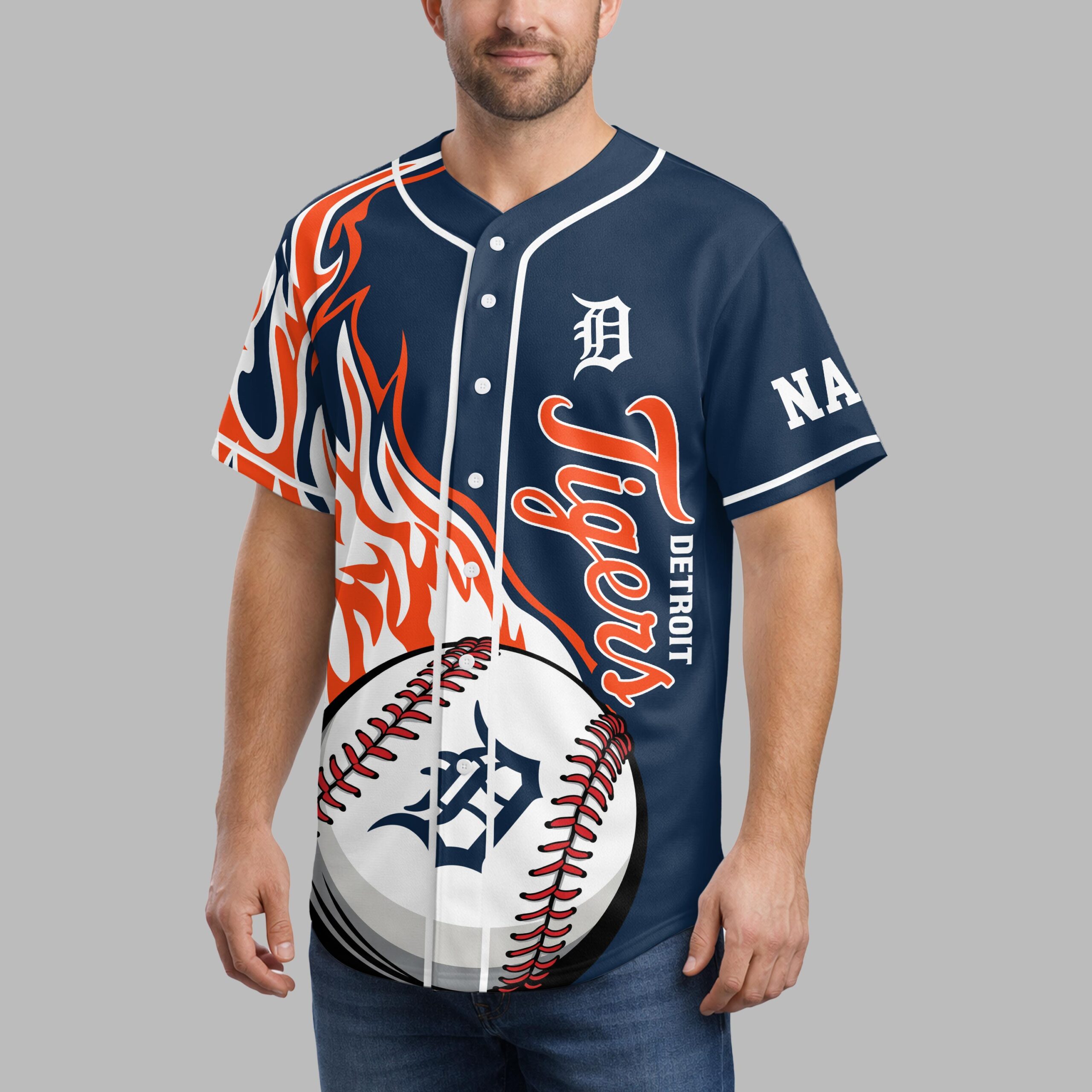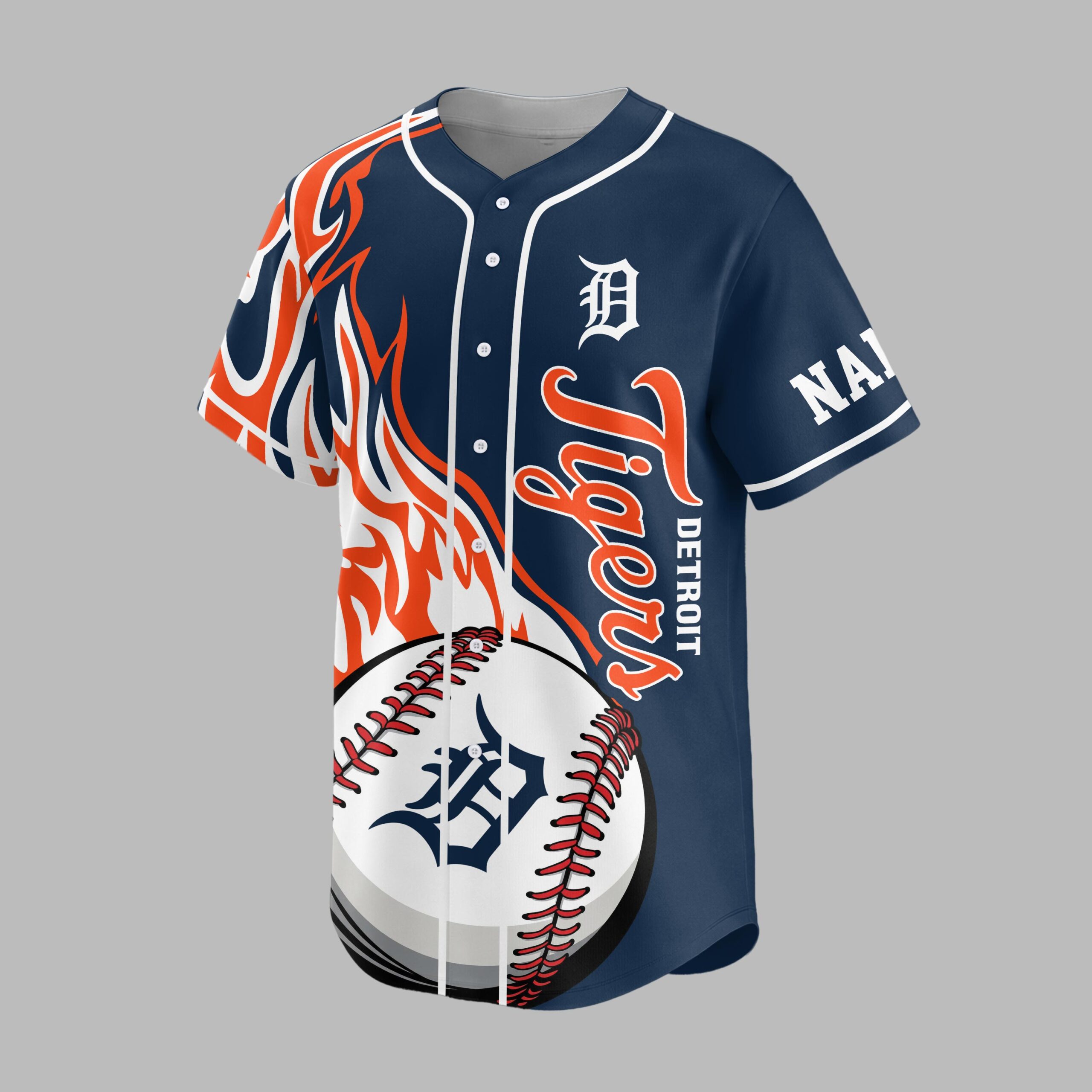 Ignite your passion for baseball and stand out in the crowd with this dynamic Detroit Tigers fan jersey! Perfect for dedicated fans, this jersey lets you wear your team pride boldly. Get ready to cheer on the Tigers with a look that’s as fiery as your spirit. The front features the iconic Detroit D logo on the chest, complemented by the Tigers DETROIT script and a vibrant baseball graphic. Flames in spirited orange and white streak across the shoulders and sides, adding an extra burst of energy. On the back, a playful cartoon tiger in a full baseball uniform swings a bat, encircled by the team city, alongside the spirited question, WHO’S YOUR TIGER?. You can even customize it with your own name above the design, making it uniquely yours. Whether you’re catching a game at the stadium, hosting a watch party, or simply showing off your team loyalty around town, this jersey is your ultimate game-day essential. It’s ideal for any occasion where you want to celebrate your favorite team and connect with fellow Tigers enthusiasts.