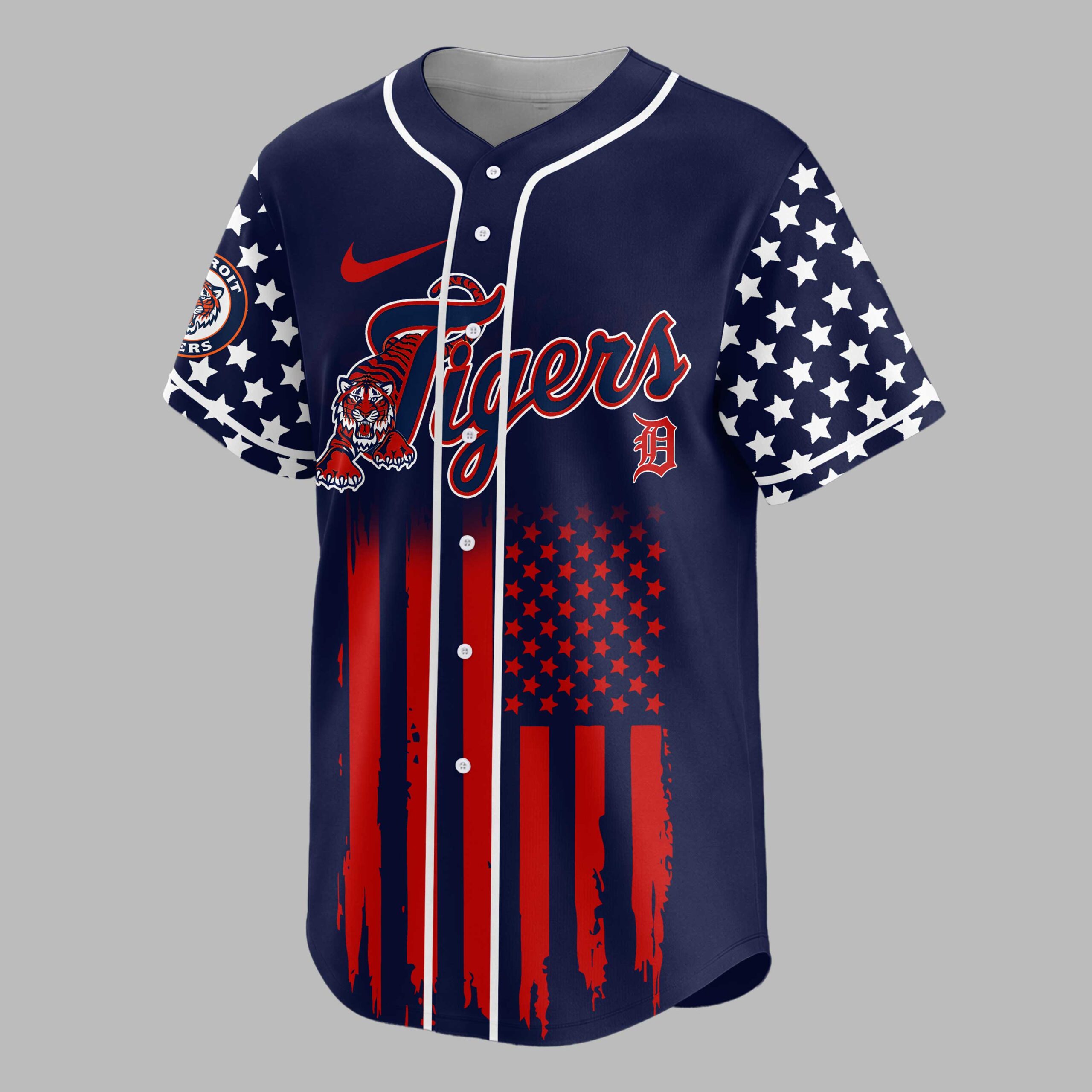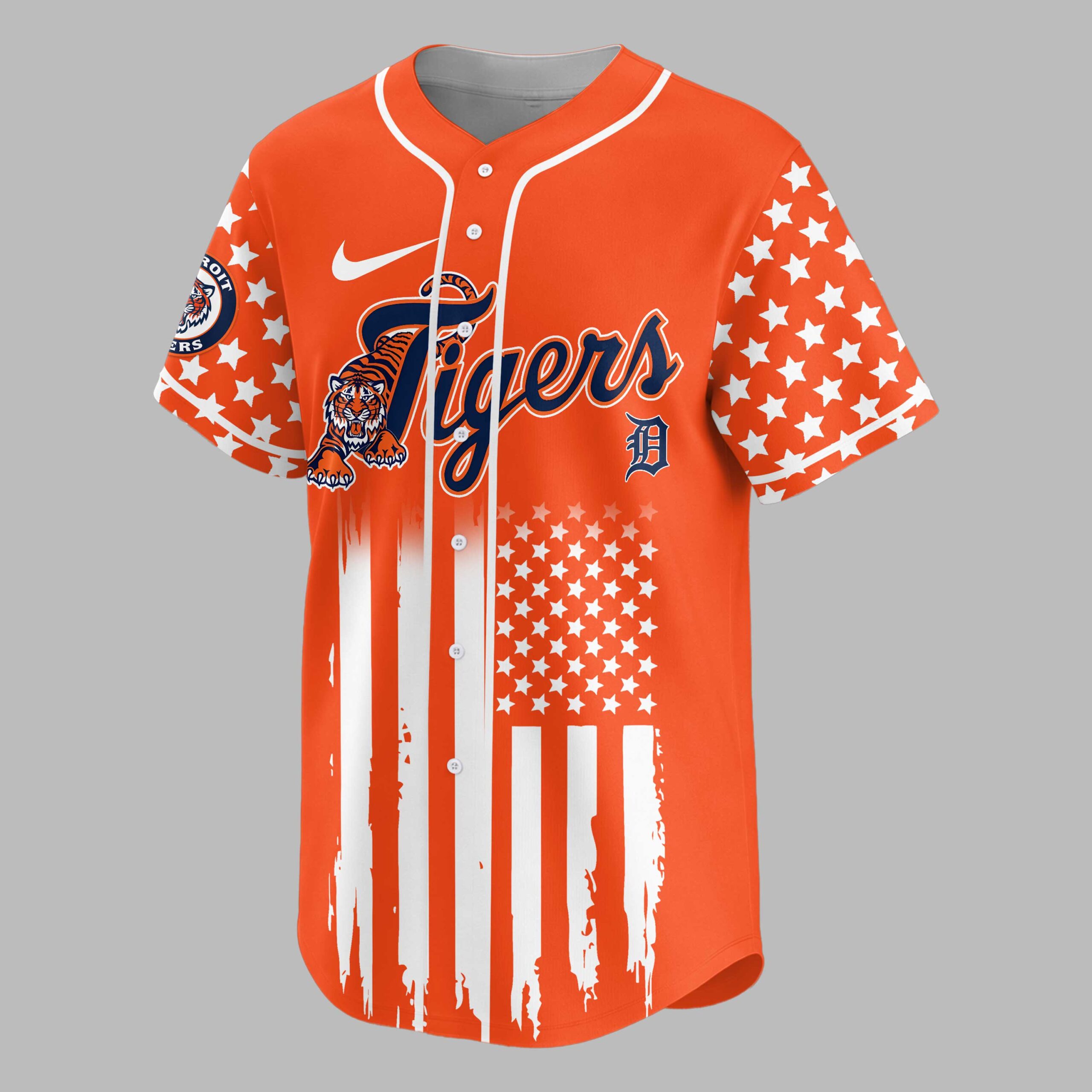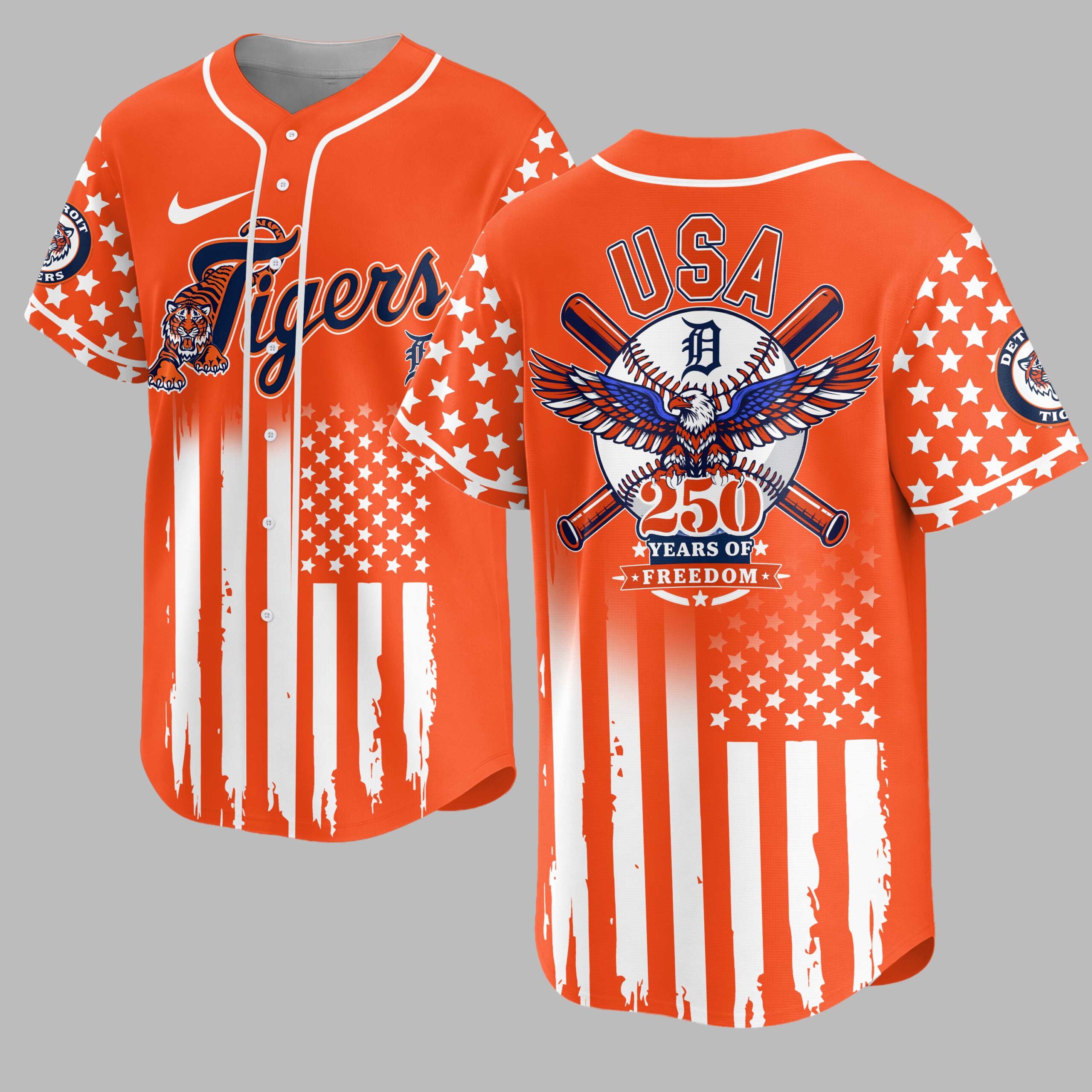Celebrate your passion for baseball and patriotism with this dynamic Detroit Tigers jersey! Fusing your love for the Motor City’s team with a powerful tribute to American liberty, this shirt is perfect for fans who want to show their dual pride for country and club. It’s an energetic statement piece that captures the spirit of freedom and the thrill of the game, honoring a significant milestone. The front proudly displays the iconic ‘Tigers’ script in navy and white, accompanied by a fierce pouncing tiger, all set against a bold distressed American flag design. The sleeves feature a field of white stars on an orange background, with the Detroit Tigers circular logo adding authentic team spirit. On the back, a majestic red, white, and blue eagle with outstretched wings soars above a baseball, emblazoned with ‘USA’ and ‘250 YEARS OF FREEDOM’, making a powerful patriotic statement. Whether you’re cheering from the stands at Comerica Park, gathering for a Fourth of July barbecue, or simply showcasing your American and Tigers pride, this jersey is designed for those special occasions. It’s an ideal choice for game days, national holidays, or any event where you want to boldly represent your team and nation.