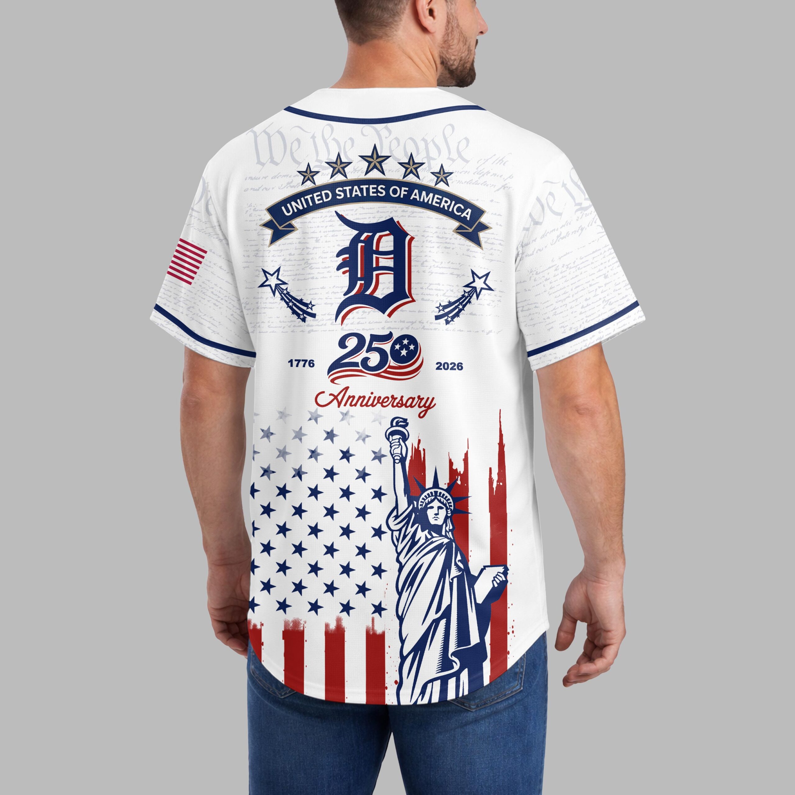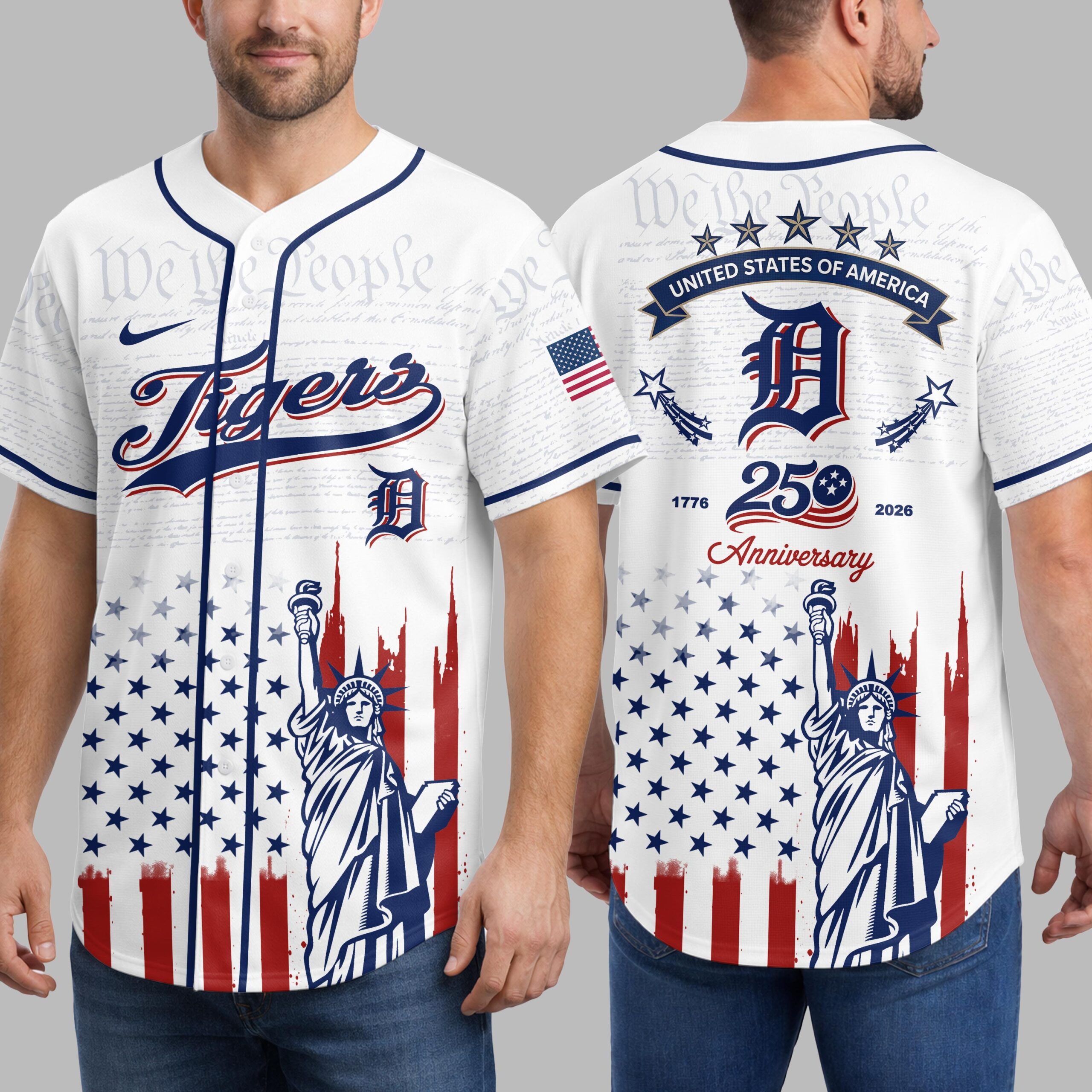 Celebrate your unwavering Detroit Tigers pride and American spirit with this striking patriotic baseball jersey! Perfect for fans who live and breathe baseball and cherish the nation’s rich history, this unique shirt boldly blends team loyalty with a powerful tribute to freedom. It’s more than just game day attire; it’s a statement of devotion to your team and country. The jersey showcases the iconic We the People text from the Constitution subtly across a deep navy background. The front proudly displays Tigers in classic script, alongside the famed D logo, set against a vibrant, distressed American flag and the majestic Statue of Liberty. The back further amplifies the patriotism with STATES OF AMERICA, the D logo, and a special 1776 250th Anniversary 2026 commemoration, making it a truly unique collector’s item. Whether you’re cheering loudly from the stands at Comerica Park, gathering for a Fourth of July celebration, or simply showing off your dual passions, this jersey is designed to stand out. Wear it to Memorial Day picnics, historical events, or any occasion where you want to display your love for the Detroit Tigers and the United States of America.