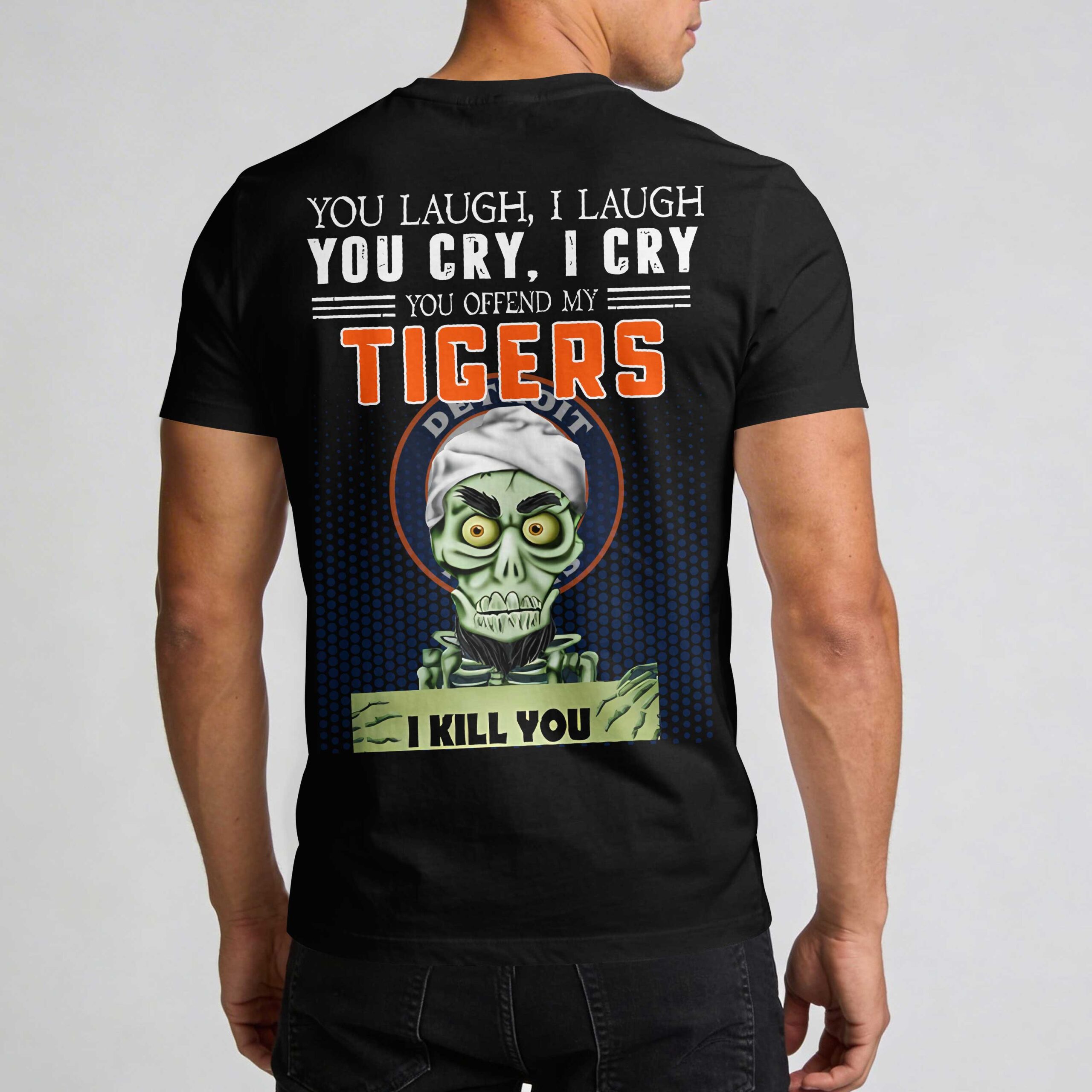 Show off your unwavering Motor City pride with this bold Detroit Tigers fan tee. Designed for those who live and breathe baseball, this shirt combines fierce loyalty with a spirited, energetic feel for any dedicated supporter. It’s more than apparel; it’s a statement of your deep-rooted dedication to the Tigers and the spirit of the game. The front features the iconic Detroit D logo with a prowling tiger on the left chest. Turn around to reveal a high-impact graphic featuring a humorous skeleton character and the bold warning, “You offend my Tigers, I kill you.” The back design uses vibrant orange lettering and sharp graphics to command attention from every angle. Wear it to the ballpark, Independence Day celebrations, or any casual outing where you want your team spirit to shine. It’s the perfect way to represent Detroit and show you’re a die-hard fan who stands by their team.