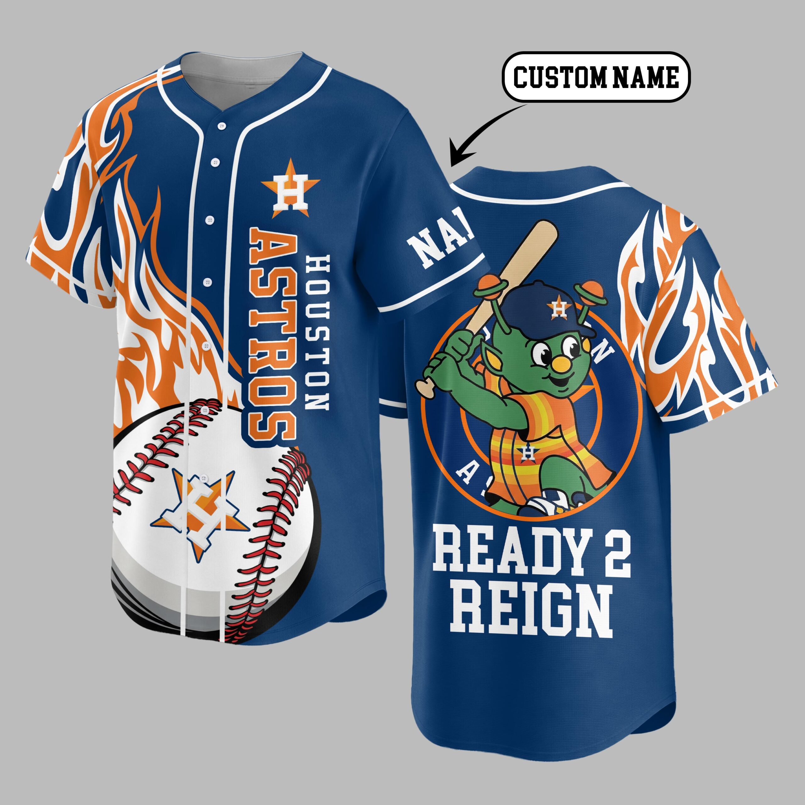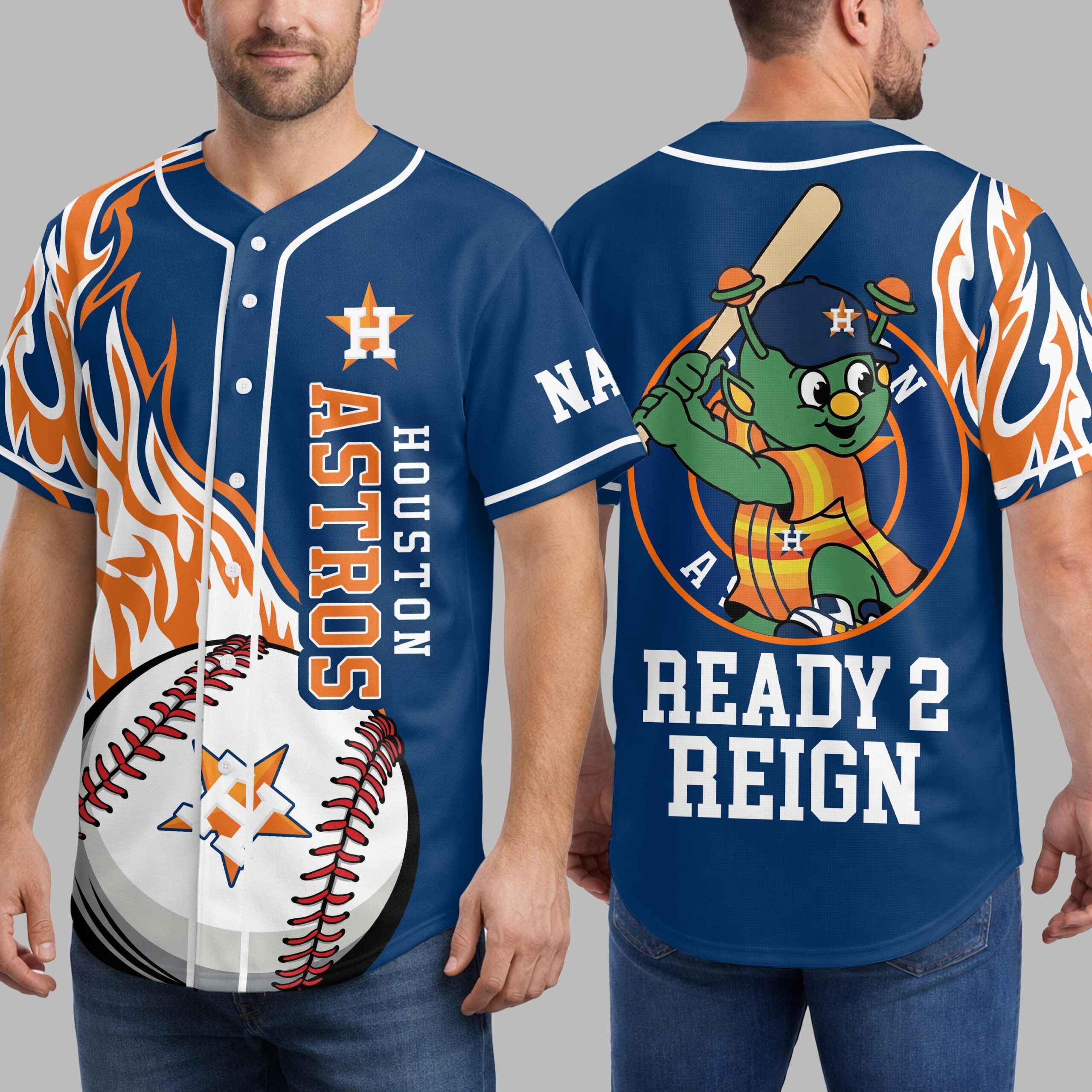 Ignite your game day spirit with this dynamic Houston Astros baseball jersey! Designed for the ultimate fan, this jersey embodies the fiery passion and unyielding determination of the Astros, making it the perfect way to show your unwavering support as they prepare to dominate the field. The front features bold HOUSTON ASTROS text running vertically alongside the classic button-up design, complemented by the iconic H logo. Vibrant orange and white flame graphics blaze across the shoulders and sides, creating an electrifying visual. Turn around to reveal a powerful graphic of the beloved Orbit mascot, ready to bat, with the bold declaration READY 2 REIGN beneath. Whether you’re cheering from the stands at Minute Maid Park, hosting a game day party, or simply out and about, this jersey is your statement of loyalty. It’s ideal for baseball season, casual wear, or any occasion where you want to proudly display your Astros pride. Get ready to rally your team to victory in style!