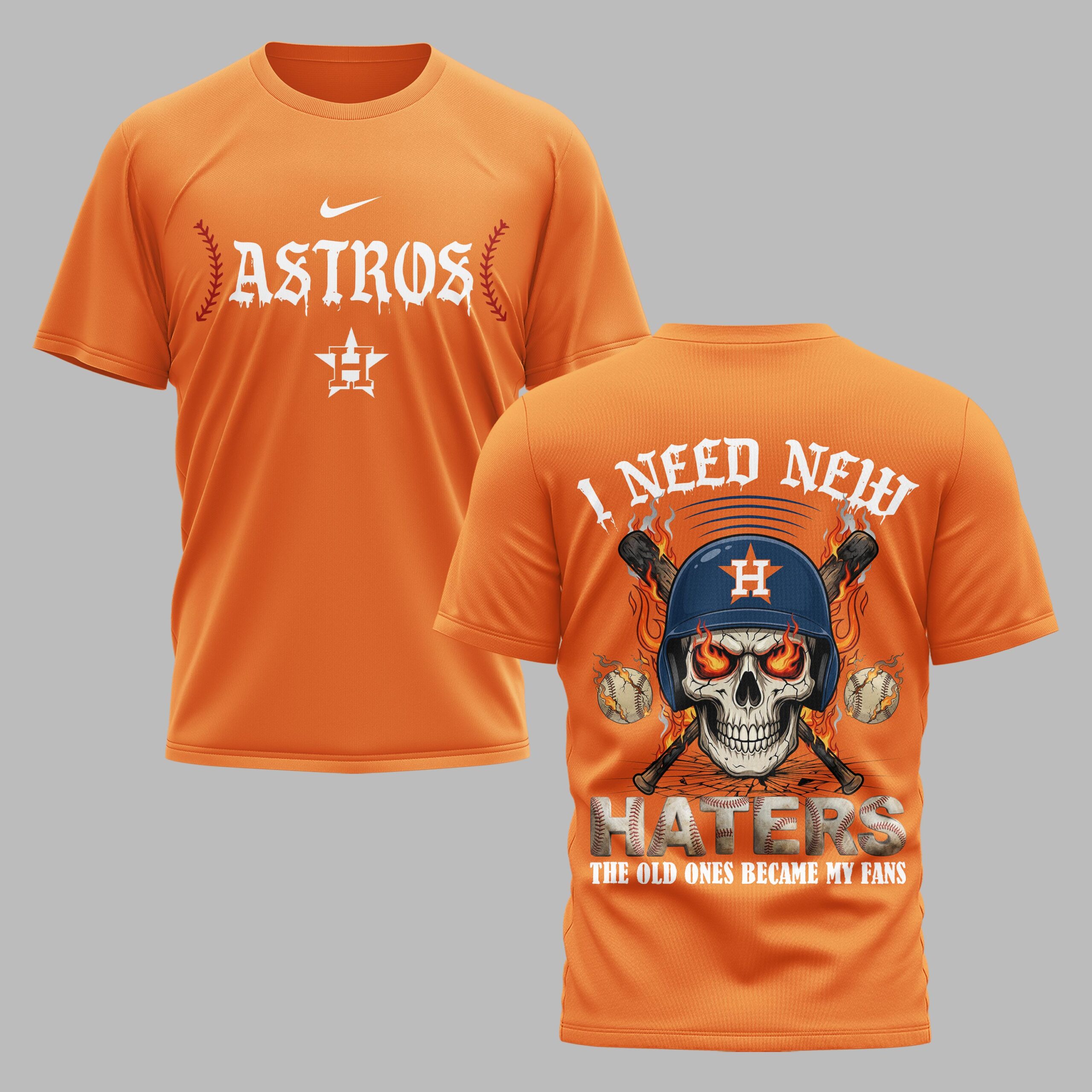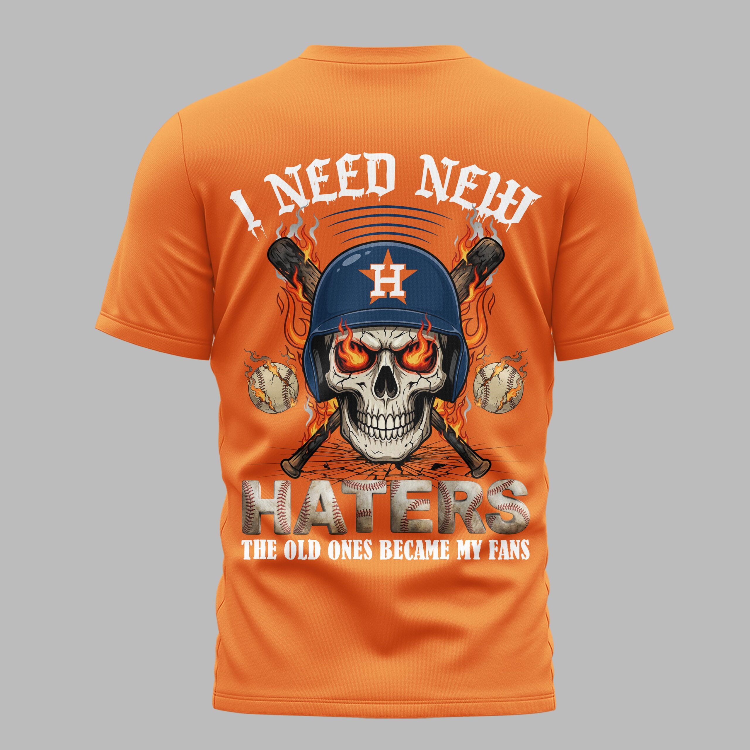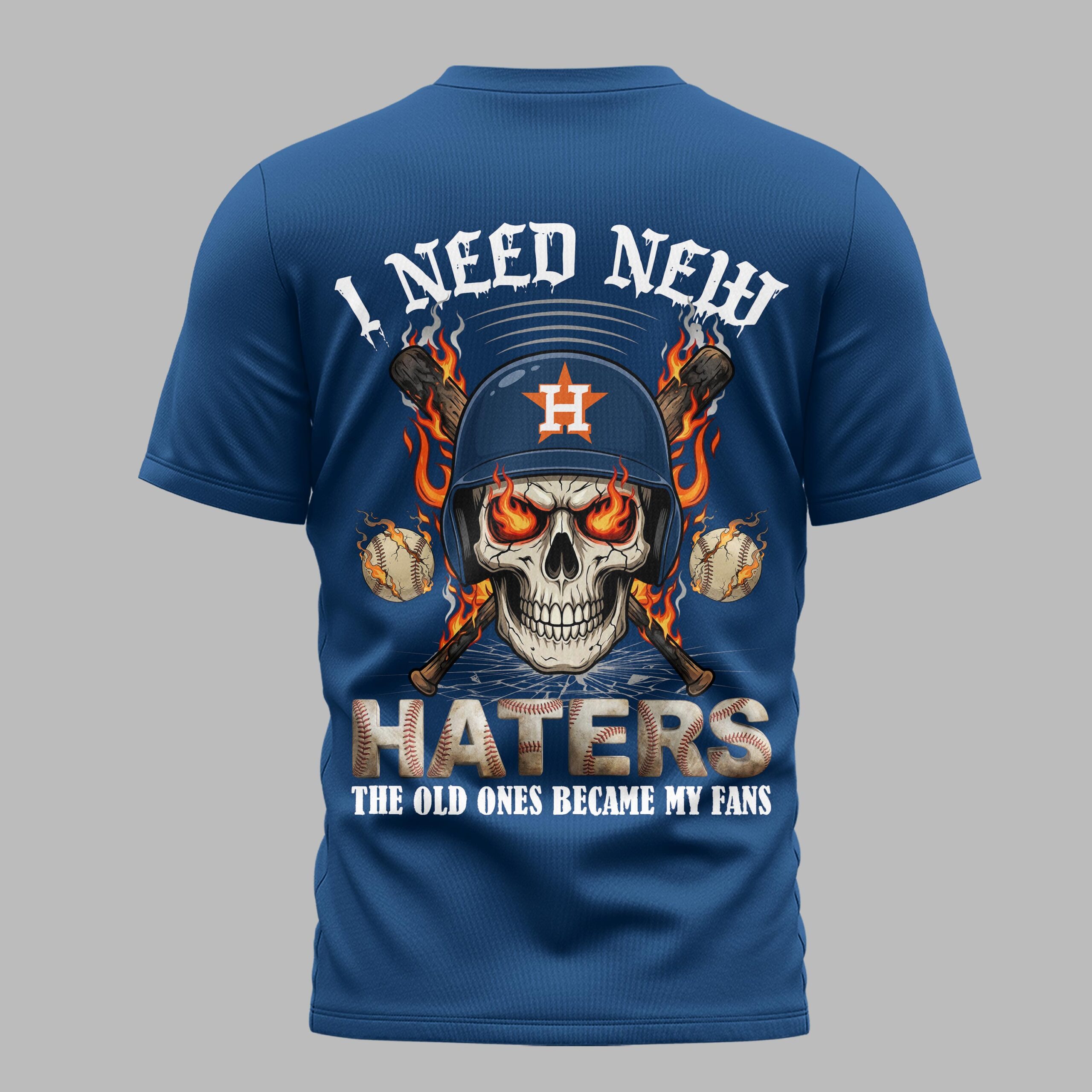 Show off your unwavering loyalty to H-Town with this bold Houston Astros tee. Designed for the fan who stands tall through every inning, this shirt combines a fierce competitive spirit with a celebratory nod to the team’s dominance. Whether you’re cheering from the stands at Minute Maid Park or representing in the streets, it’s a powerful way to display your team pride with an edge that sets you apart from the crowd. The front features the ASTROS name in a striking distressed white font, flanked by vibrant red baseball stitching and the signature star logo. The back makes a loud statement with a high-impact graphic: a skull in an Astros batting helmet with flaming eyes, crossed bats, and the defiant slogan, I Need New Haters, The Old Ones Became My Fans. This is the ultimate gear for intense game days, summer ballpark visits, or Independence Day celebrations. It’s a standout piece for everyday wear that captures the fire and grit of the Houston faithful.