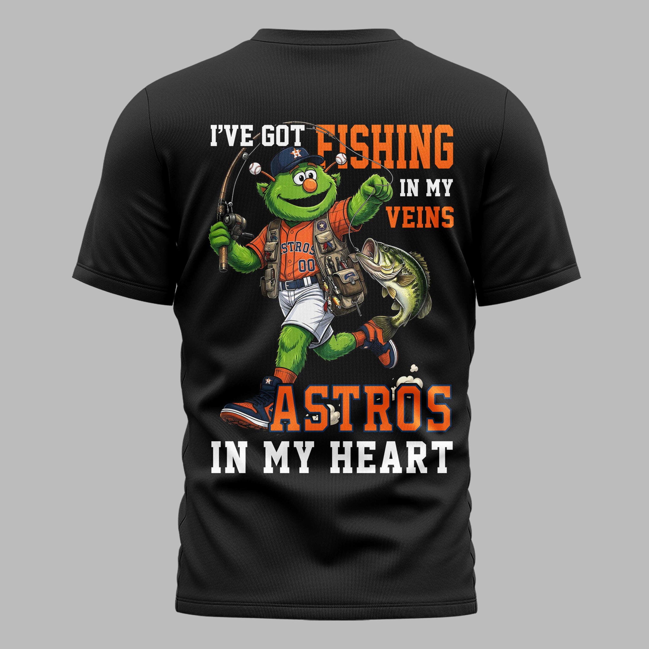 Combine your love for the Houston Astros and fishing with this unique fan T-shirt! Perfect for those who live for both game day and the open water, this shirt vividly expresses your dual passions. Show your team pride and outdoor enthusiasm in one spirited design. The front showcases the classic Astros logo, artfully entwined with baseball stitching and a fishing hook. On the back, a vibrant green character in Astros gear triumphantly holds a fishing rod with a prized bass. Text boldly states, I’VE GOT FISHING IN MY VEINS and ASTROS IN MY HEART, making your loyalties undeniable. Ideal for cheering at the ballpark, casting a line, or casual wear. This shirt is perfect for watch parties, fishing trips, or simply celebrating your unique blend of Astros fandom and angling spirit.